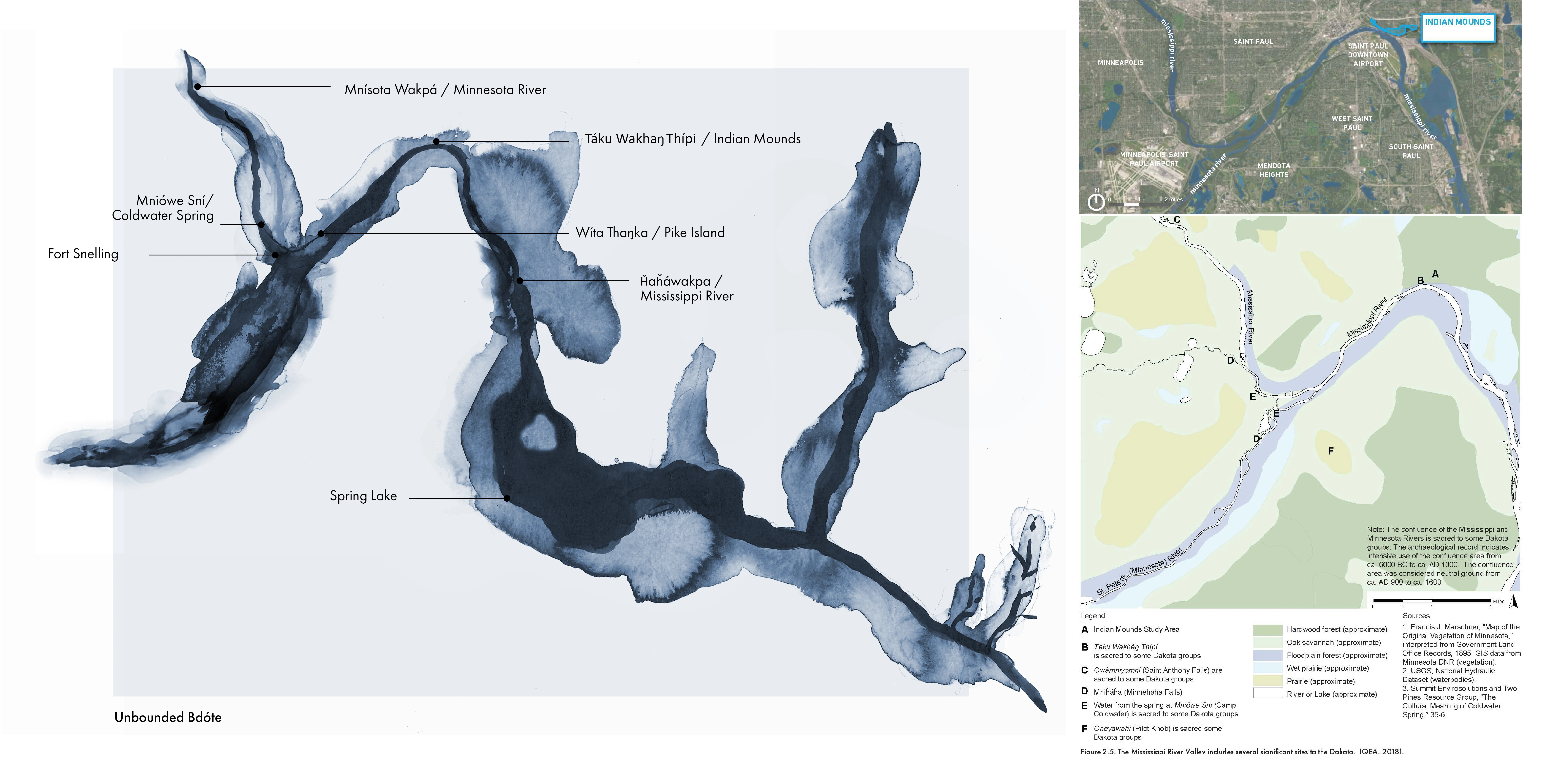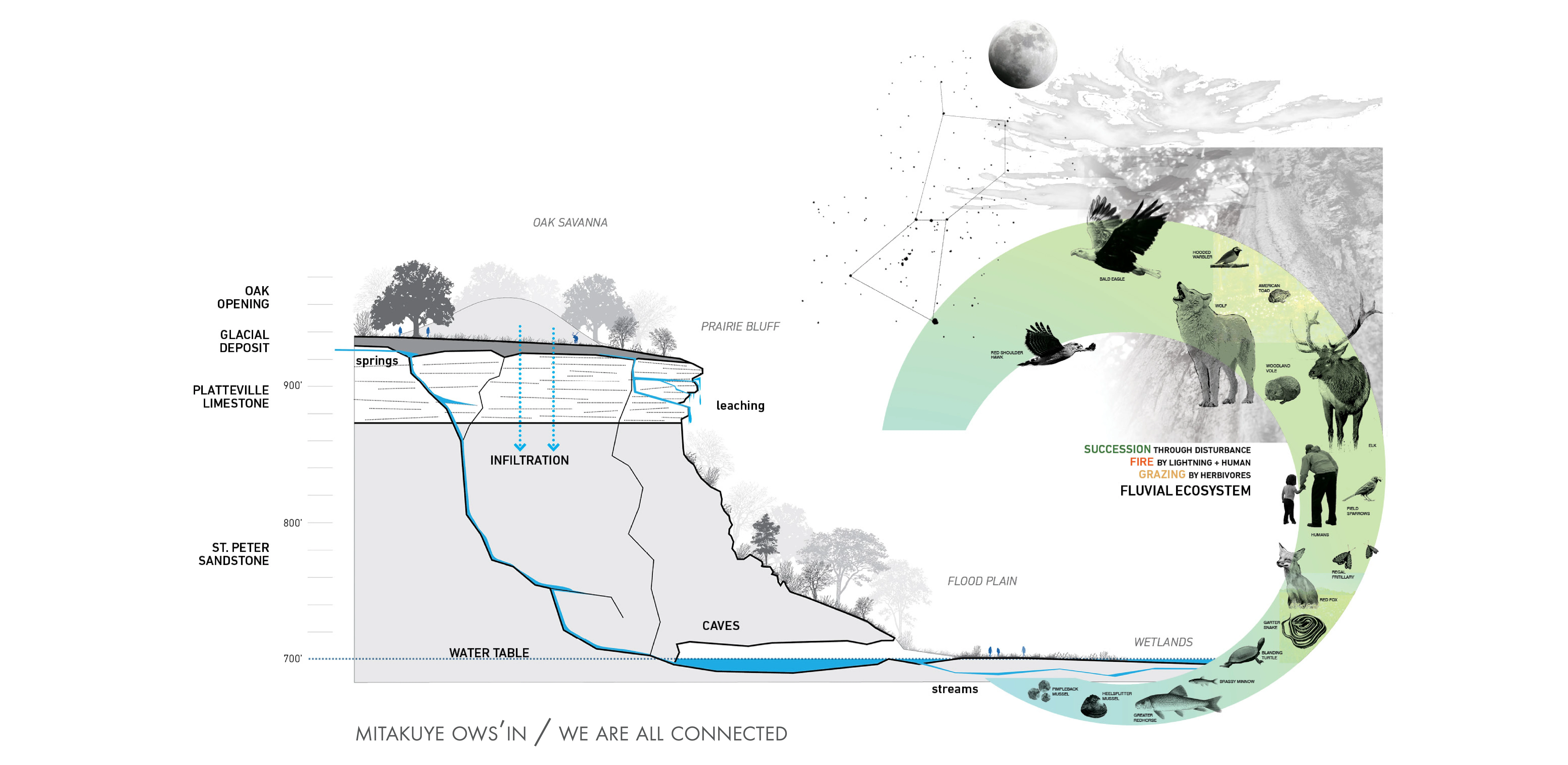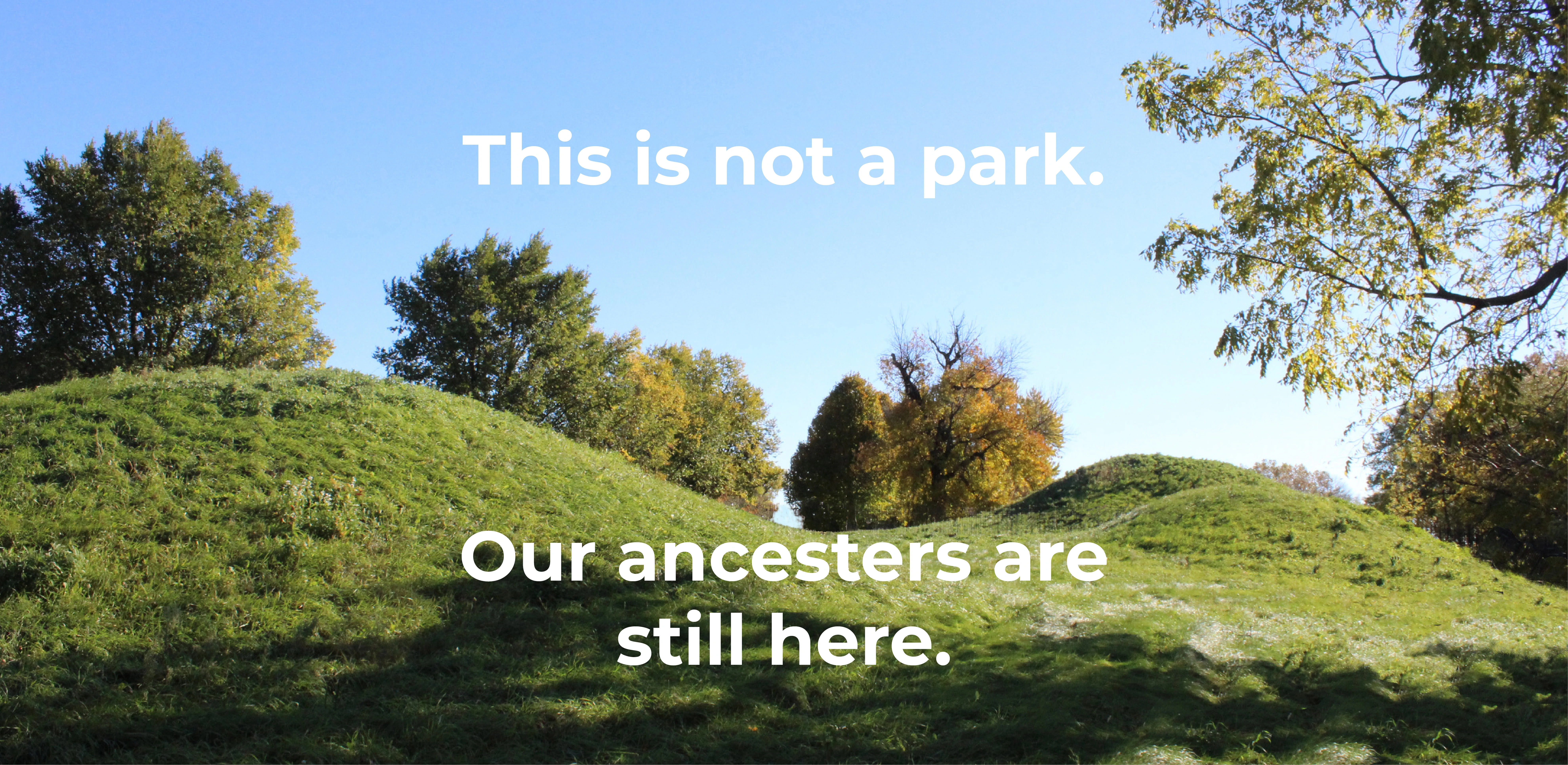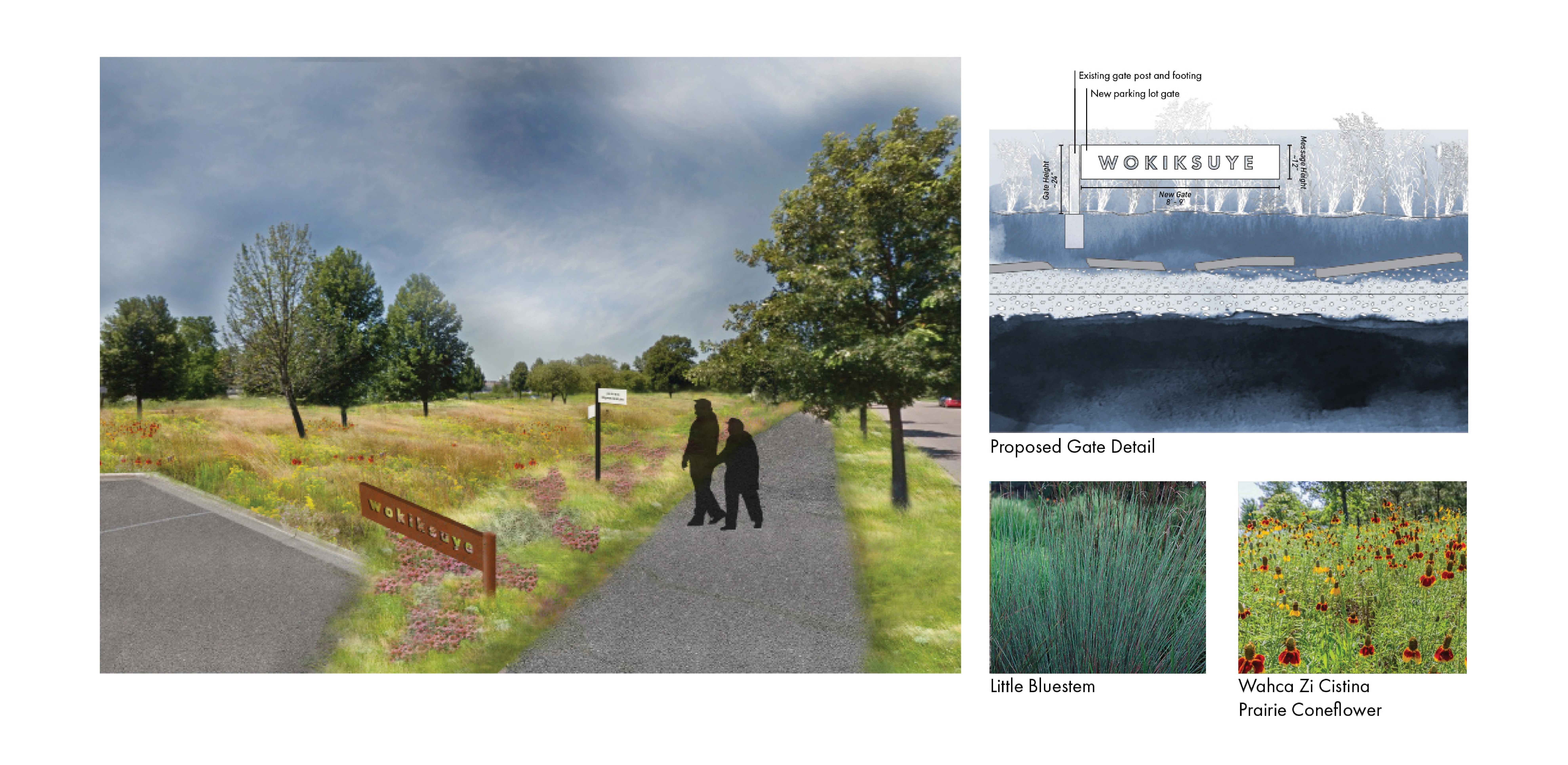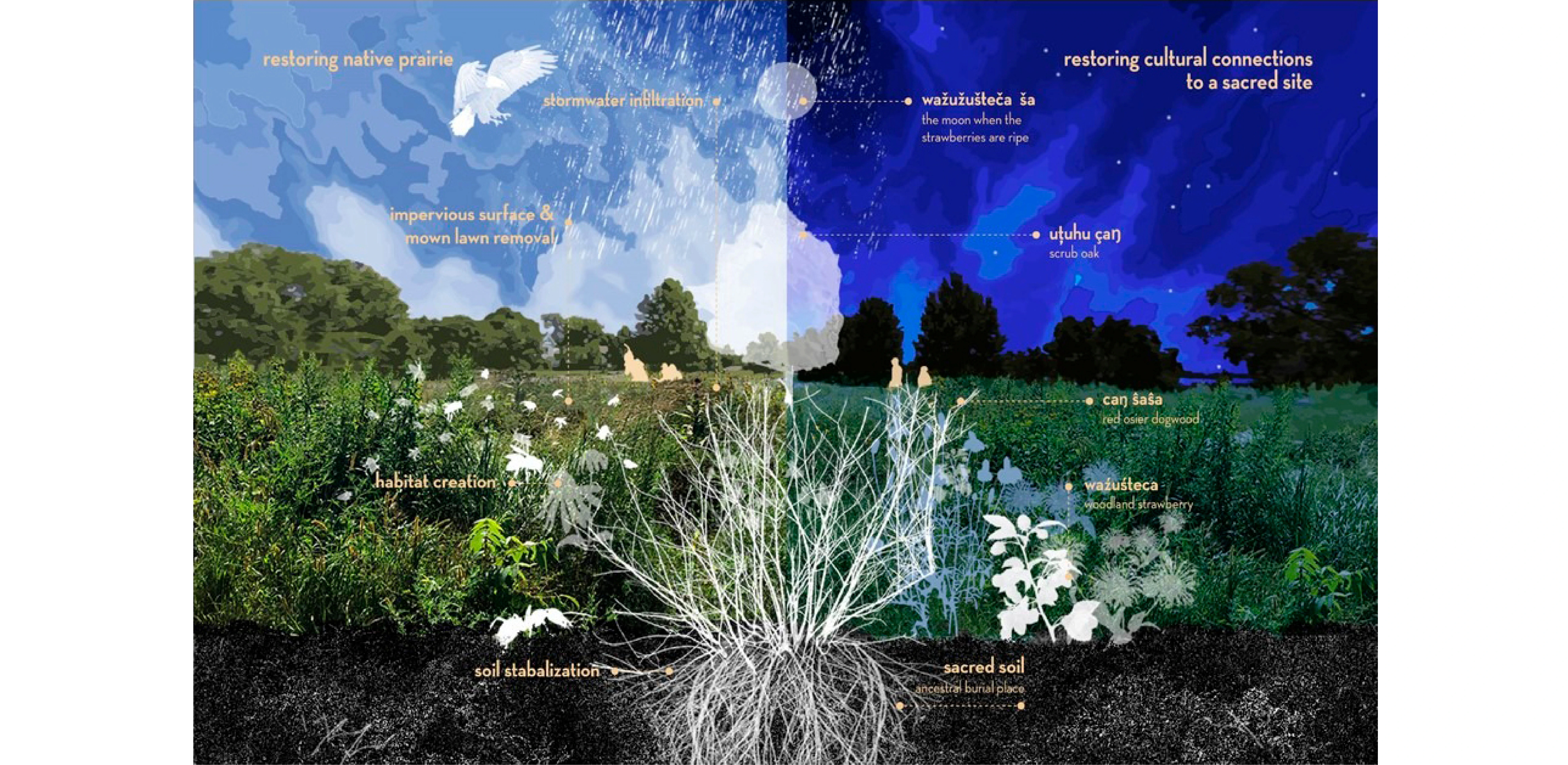 INTRODUCTION The Cultural Landscape Study and Messaging Plan presents an inspirational and holistic guide to gradually replace recreational features and activities with preservation of the burial ground, expansion of native plants, messaging acknowledging the sacred site, and removal of impacting elements. The transformed landscape will support use for contemplation, prayer, and connections, for people to whom it is sacred. Landscape interventions and messaging strategies were created through an iterative and collaborative process with the Tribal Historic Preservation Officers (THPOs), the Project Advisory Team (PAT), the community, and the City of St. Paul Parks and Recreation Department. Direct engagement and consultation with the THPOs from the Upper Sioux Community, Lower Sioux Community, Shakopee Mdewakanton Sioux, Prairie Island Indian Community, and The Ho-Chunk Nation of Wisconsin, the Iowa Tribe of Kansas and Nebraska, and the Sisseton-Wahpeton Oyate—was essential to the process. The project 1. Establishes a platform for inclusion of Indigenous communities in decision-making about sites that are significant to them. 2. Documents the historic development and use of the landscape and conducted thorough site analysis and assessment of historic significance and integrity. 3. Recommends long-term condition of the landscape informed by guidance from associated Indigenous communities. 4. Presents messaging strategies to acknowledge and help people understand this is a sacred place of burial. THIS PLACE IS NOT A PARK The Indigenous burial ground that is currently called “Indian Mounds Regional Park” has been a sacred burial ground for over a thousand years. It is significant to living Indigenous Peoples as a cemetery where their ancestors are buried. It is a place of reverence, remembrance, respect, and prayer. When the City of Saint Paul established a park in this location in 1892 with the purpose of protecting the historical setting and spectacular views, connections of contemporaneous Indigenous Peoples to the sacred site were not understood, considered, or valued. Over the last century the condition, name, and use of the landscape as a park have become beloved to the surrounding community. Yet many non-Indigenous people have wondered about this powerful landscape without understanding its importance to tribes. Through public gatherings with generous sharing by tribal representatives and members of the public, we learned that the power of this place affects the people who interact with it, and there is a strong desire to protect it as a sacred site. CULTURAL LANDSCAPE APPROACH The Landscape Architects applied a cultural landscape approach to the study. This began by facilitating a collaborative process including diverse stakeholders to develop a vision and goals for the project. We paid careful attention to building a strong relationship between the people culturally connected to the landscape and the city who maintains it. We listened to the people whose passionate connections to this place provide the basis of its significance; and to the landscape itself that exudes a spiritual sense of place. The sacredness of this place is communicated through a variety of changes to the landscape and sharing of messages that aim to build respect and restore dignity. Historical research utilized primary and secondary sources to develop a rich account of physical change in the landscape beginning with its geological formation through its current condition. The report includes a detailed chapter recounting the history of the site, with diagrams illustrating landscape conditions at key time periods. The tradition of mound building in Minnesota was initiated during a time when people became less mobile and larger communities came together to live in semi-permanent camps. People continued hunting and gathering and supplemented this with harvesting wild rice and gardening more intensively. Burial mounds were often located on elevated bluffs near major bodies of water, while villages were often located to provide access to wild rice. The Mississippi River valley was a regional center where people came together for ceremonies and events to reinforce communal ties and forge alliances. Interviews and collaboration with descendant American Indians contributed a broad understanding of the meaning of the landscape to their communities today. Representatives of the associated communities were included throughout the project process to ensure their cultural perspectives informed recommendations. A thorough analysis of integrity was conducted based on federal guidelines for cultural landscapes. The site is part of Mni Sota Makoce, Dakota homeland, and Bdote, the area surrounding the confluence of the Mississippi and Minnesota Rivers that is significant to many Dakota people as a place of origination, where the Dakota emerged. Dakota individuals come to the site to pray. The VISION for acknowledgement, care, and use of the site, is informed by, and respectful of, it as a sacred place. The VISION is guided by Mitákuye Ows’in, reflecting the interconnectedness of people, land, water, sky, animals, and plants, to provide a place for reverence, remembrance, and healing in a way that protects, honors, and acknowledges the sacred place of burial. Goals focus on protection of the sacred site; identification and preservation or restoration of important characteristics; guidance toward the desired condition of the mounds; increased understanding and respect of the sacred burial ground, relatives, and ancestors who are here; identification of appropriate experiences; and establishment of a partnership between the city and tribes to guide use and care of the site. TREATMENT + MESSAGING The treatment identifies strategies addressing partnership, experience, messaging, and condition, to ensure that the Vision is consistently applied across the site. The integration of native and culturally significant plants, physic