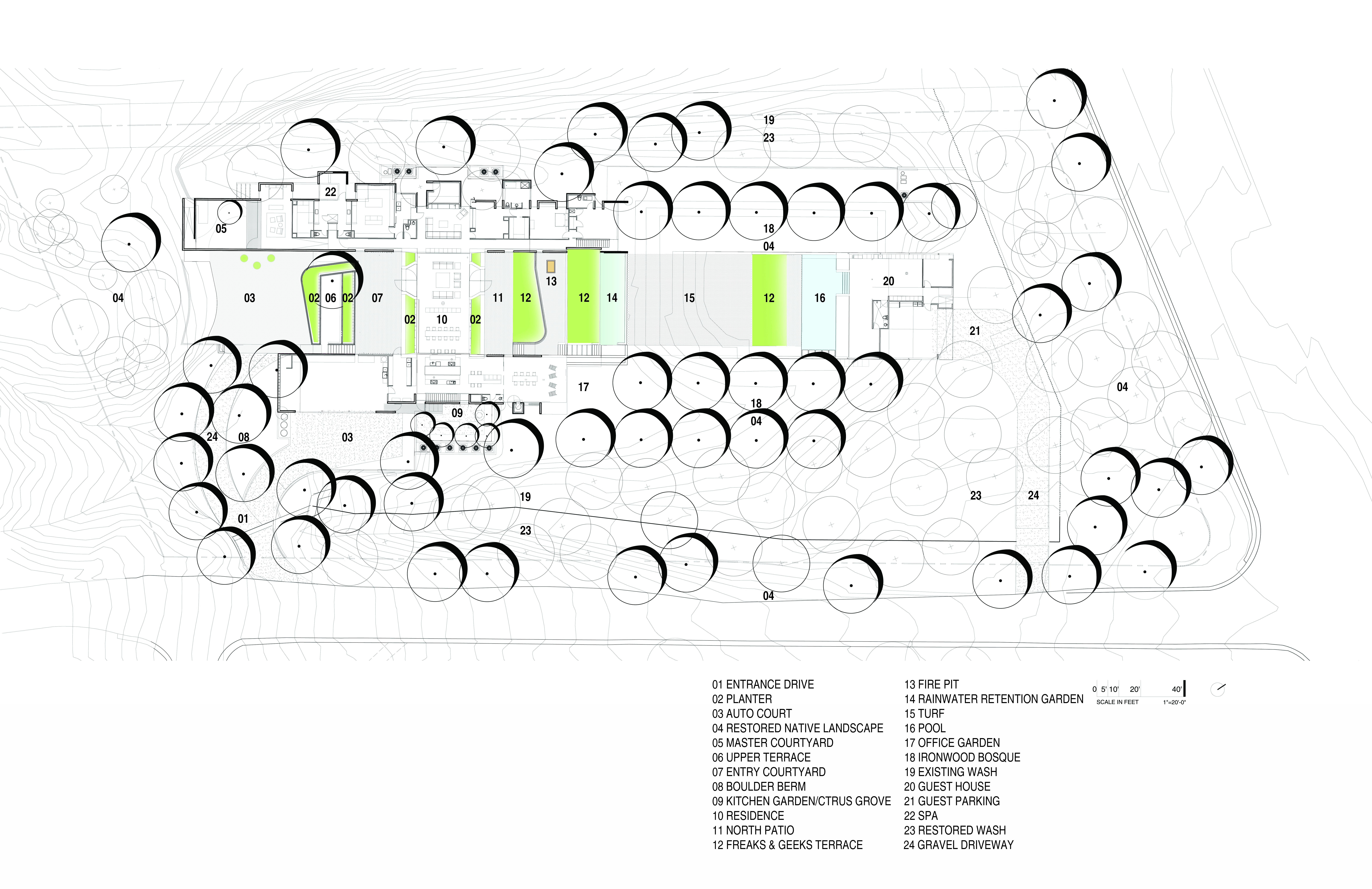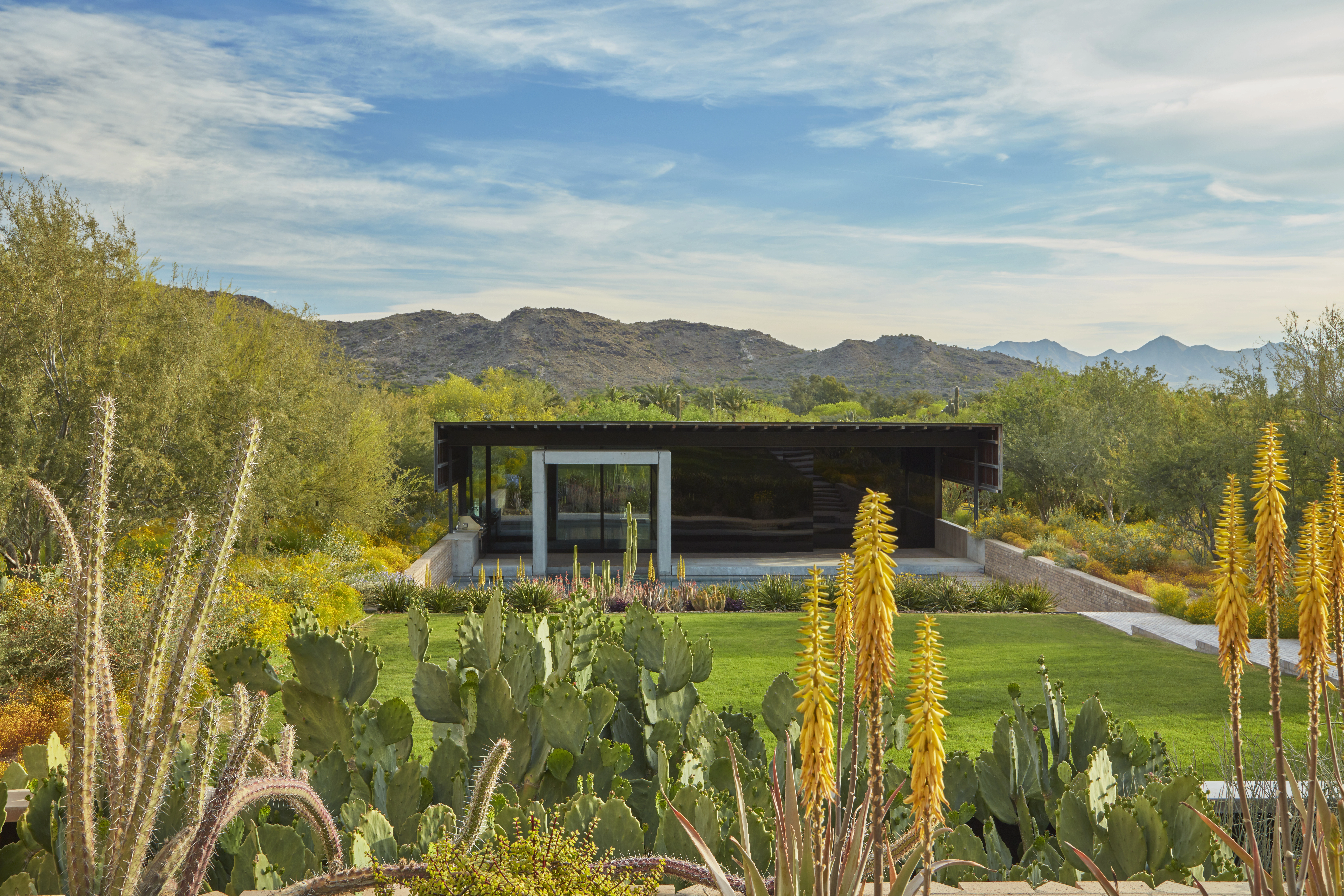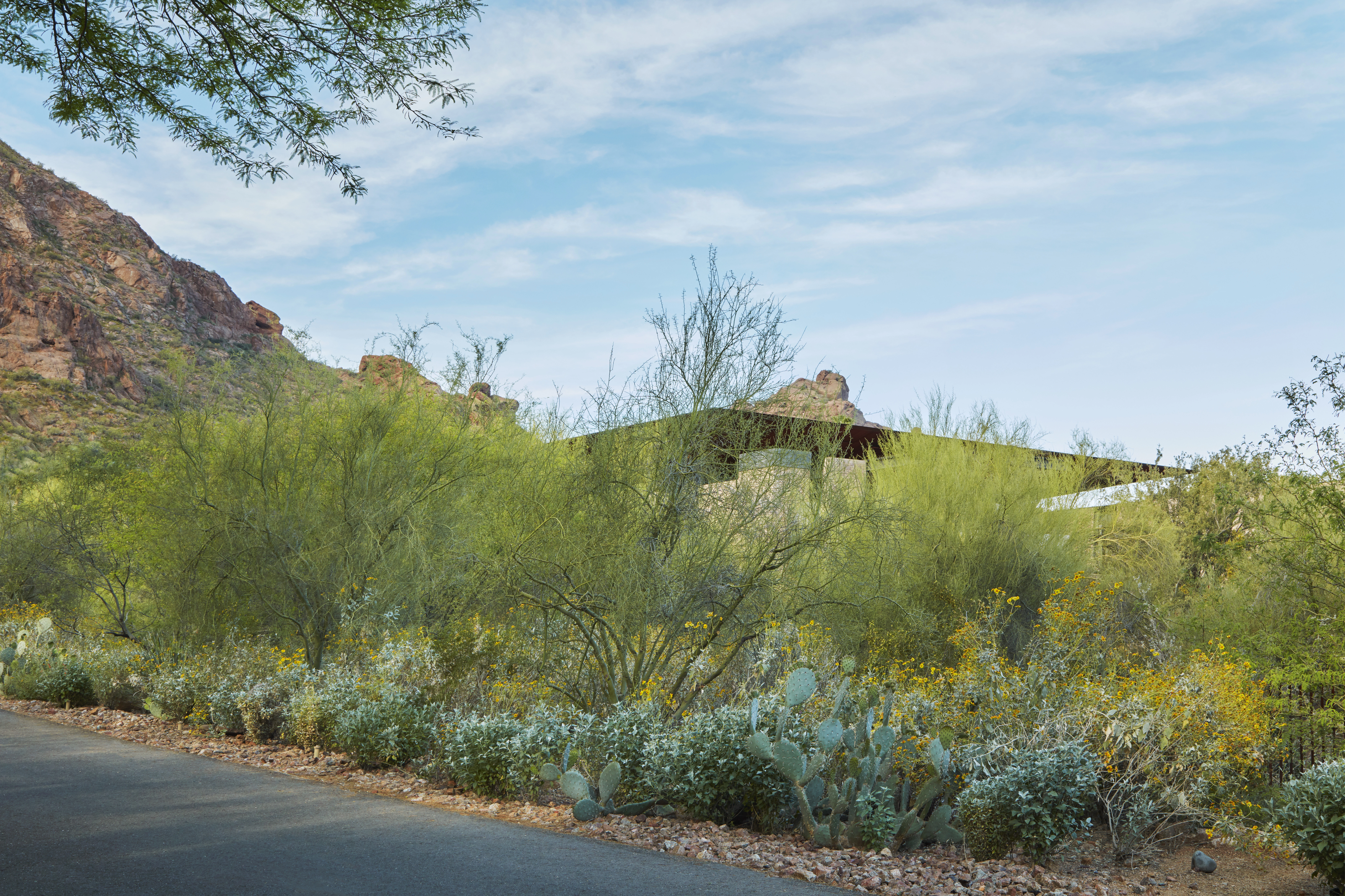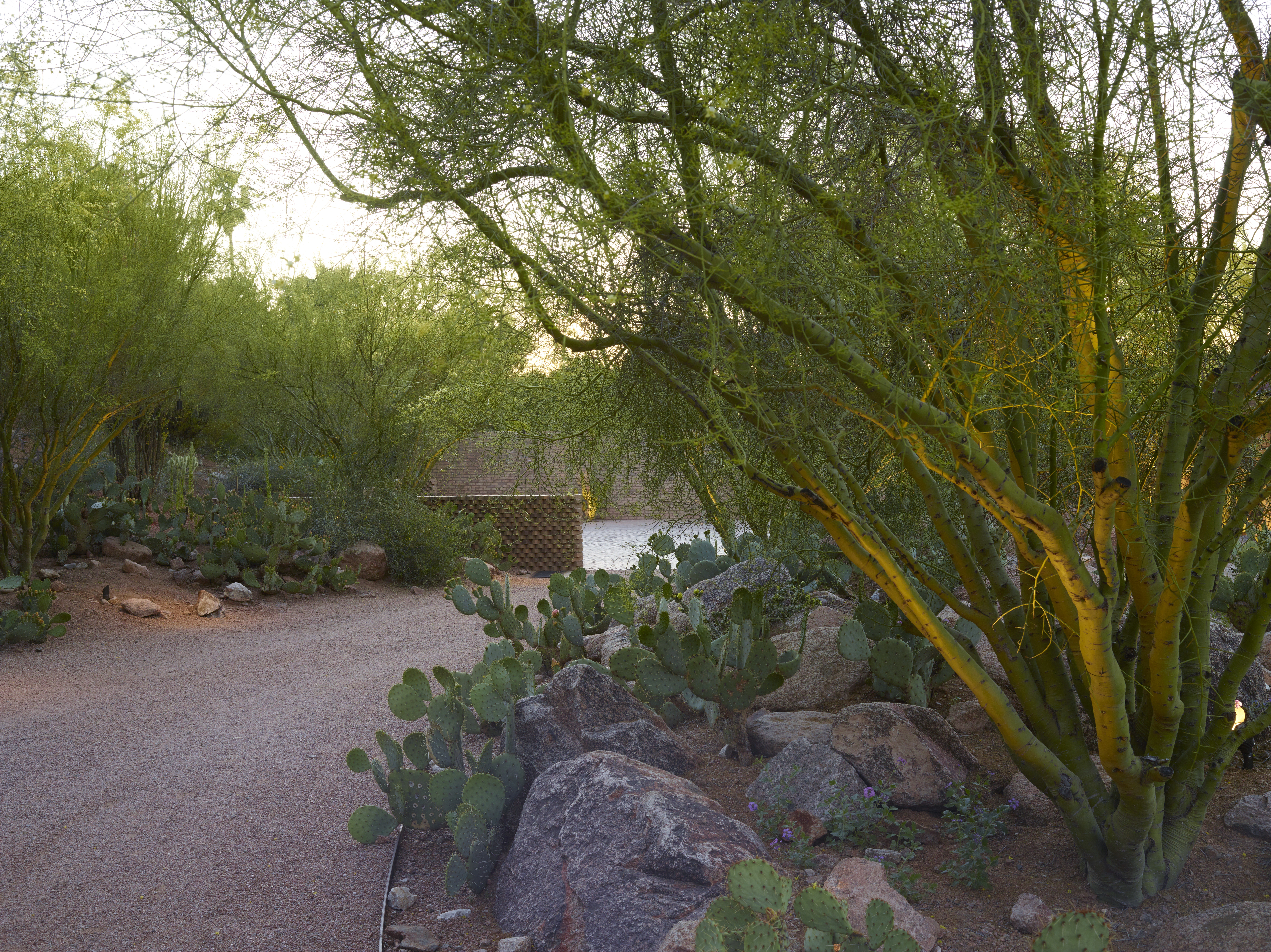 NARRATIVE The residence occupies a 2.5-acre parcel at the foot Camelback Mountain, a prominent landmark linking Arizona cities Phoenix, Paradise Valley and Scottsdale. The mountain, resembling the hump and head of a camel is composed of a geologic unconformity between two separate rock formations of granite and red sedimentary sandstone. The lot has a cross slope of 37’ in the south-north direction and is set within the desert scrub plant community. Residential landscapes in this desirable neighborhood of Paradise Valley are typically surrounded by a tall, opaque barriers between the house and the street with thick non-native hedging bounding all sides, and an interior of manicured, water-intensive shrubs and lawns in the Mediterranean style. The client desired a landscape that was reflective of their deep appreciation for desert plant life and advocacy for conservation and sustainability. The firm's experiential approach to design, procurement and placement culminated in a judicious balance of intervention and restoration, of reshaped space, redirected views and ultimately an abundant interplay between flora, light and shadow. As a result, the site was transformed into a spectacular celebration of awe-inspiring desert plant life. Each garden gallery emanates a distinct landscape essence; every window looking out presents a new focal point - a sculptural Queen of the Night, the twisted form of an Ironwood tree, a field of colorful shades of blue and aqua succulents and white glowing cactus or the rich texture of house walls contrasted with sculptural cacti. Individually, the diverse gardens encase a rich interplay of like or complimentary plant species from arid regions around the world; collectively, the gardens provide a year-round show of marvel cascading through the landscape. The entry sequence from Dragoon Lane begins through a rusted steel gate and screen wall, down a decomposed granite drive through a Palo Verde bosque. Salvaged from the site, a boulder outcropping sprinkled with prickly pear form a berm retaining soils at the driveway and screen the house. At the entry auto court permeable brick pavers allow for water infiltration. A large brick sculpted planter wall draped with Octopus Cacti Stenocereus alamosensis separates the entry courtyard and auto court. Floor to ceiling glass windows generously bring the garden views into the house and make indistinct the line between indoor and outdoor. A majority of specimens can thrive on rainwater alone after establishment, require no fertilizer, little to no pruning, and conversely provide a rich and lively habitat for a multitude of wildlife. The small citrus grove, one of Arizona’s five ‘Cs’ (Cotton, Citrus, Copper, Cattle, Climate) boasts different cultivars of citrus trees, each providing sensory enjoyment when in bloom; their bountiful fruit is donated to local homeless shelters. GHOST WASH The Sonoran Desert is the wettest desert on Earth. It is characterized by this due to the large amount of rains it receives during the monsoons and winter months. The desert receives under eight (8) inches of rain annually. Due to the lack of water in Arizona it is important to capture all rainwater as a source of supplemental irrigation. The center core (Ghost Wash), flanked by two tumbled brick building bars of the residence, is an infrastructure amenity, utilizing all the storm water captured by the massive floating roof. Cascading terraces of alternating patio and garden planters create the ‘Ghost Wash’, the third wash running through the site. The last terrace is a steel vessel/cistern holding all the roof water and storing the runoff. Passively releasing the rainwater through small openings in the face of the vessel irrigating the small warm-season grass area and surrounding native landscape. The client initially did not desire grass and felt it was irresponsible in the desert, though they had a young child and wanted her to be active outside during the hotter months, which was a relief during the pandemic. The grass area is watered with an underground watering system and seasonal supplemental water from the monsoon storms. This small turf area plays an important role in the desert landscape, reducing water runoff and carbon dioxide emissions, as well as mitigate the heat. In this central zone, the client desired a low water use eclectic plant palette of unique sculptural cacti & succulents such as rare Boojum trees Fouquieria columnaris, Cereus Peruvianus ‘monstrosis’ var. major 4, and Octopus Cacti Stenocereus alamosensis. These cacti gallery gardens have become great conversation pieces complementing the sculptural quality of the house. The axial amenity spine (Ghost Wash) terminates at the guest house and pool near the base of the slope. The perimeter of the property was restored, re-vegetated and enhanced to seamlessly blend into the surrounding flora of Camelback Mountain and is largely populated by species native to the Sonoran Desert creating a resilient landscape that can withstand overtime on little to no water. Between the two restored perimeter washes, opposite the open space, the landscape takes it cue from the native washes where the wildflowers bloom with the extra water harvested from the site. Granite paths with rock salvaged from the site wind between the sculptural Bosque of Ironwood trees and an understory of masses of desert wildflowers and cacti providing an additional buffer from the street thus, anchoring the site. The project demonstrates landscape architecture's remarkable power to unite the ecological, sensory, and spatial characteristics of a site with its region and create a lasting place of integrity and meaning. The cactus gardens and native landscapes showcase and celebrate desert morphology and the astoundingly beautiful genus that thrive in our harsh, arid environment. It was expressly the landscape architects hope to set a new paradigm concerning the prevailing landscape customs arid r