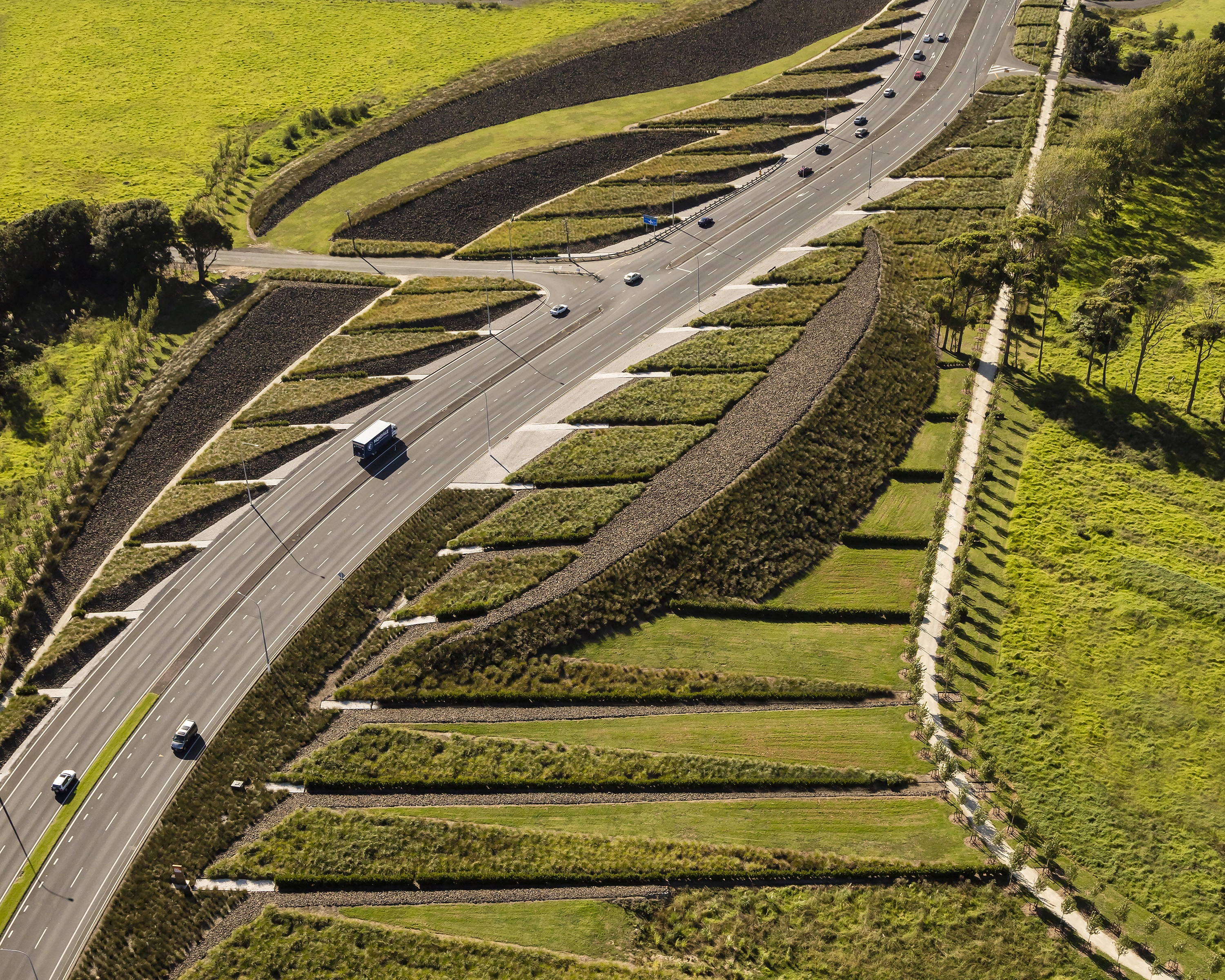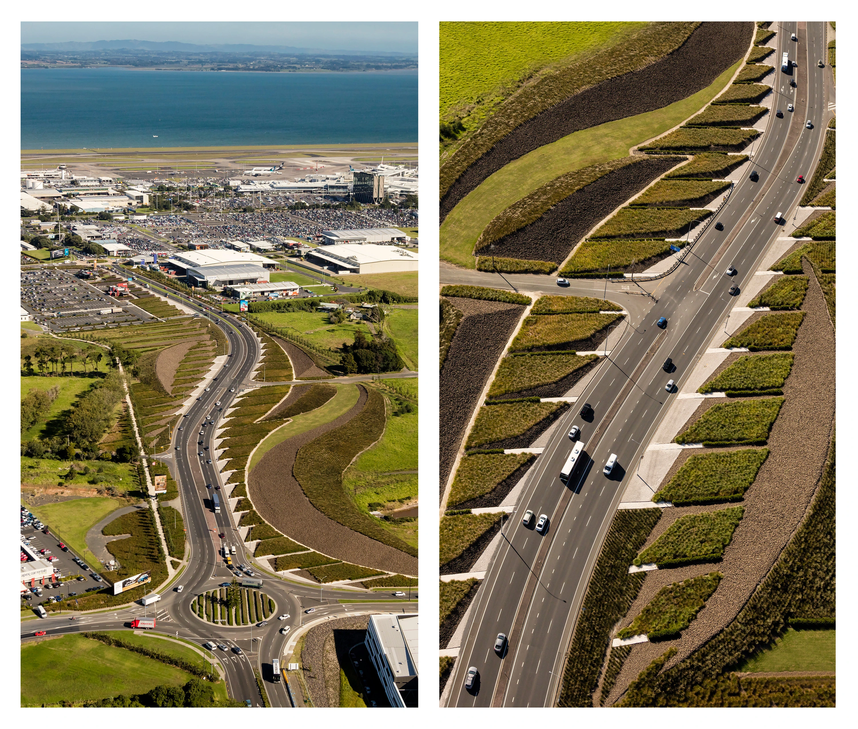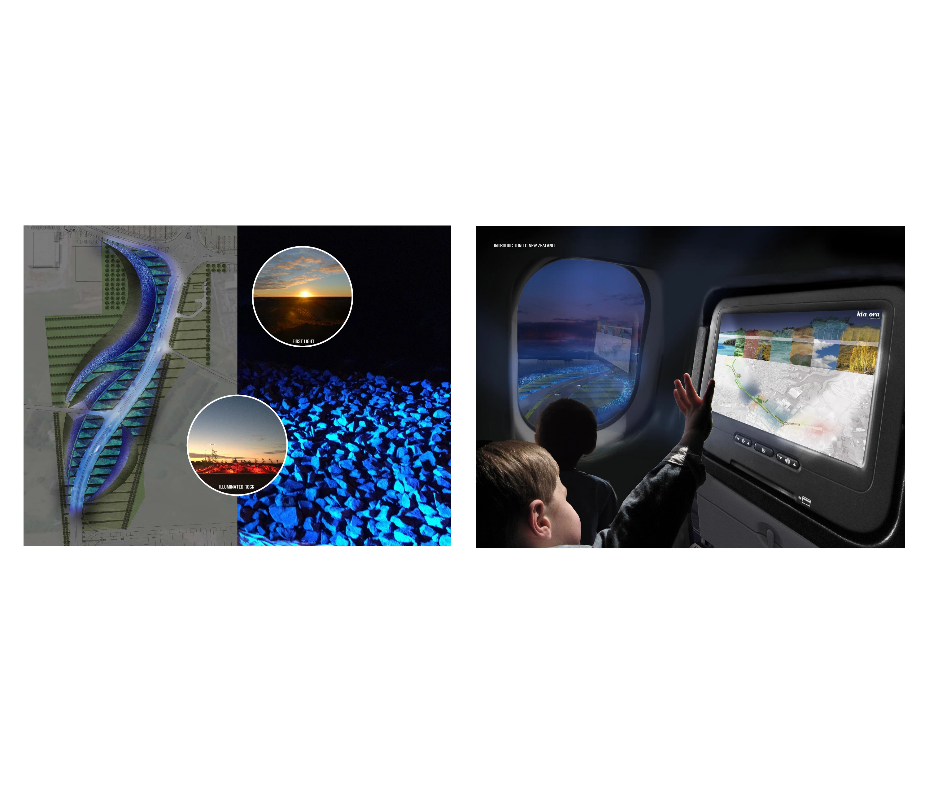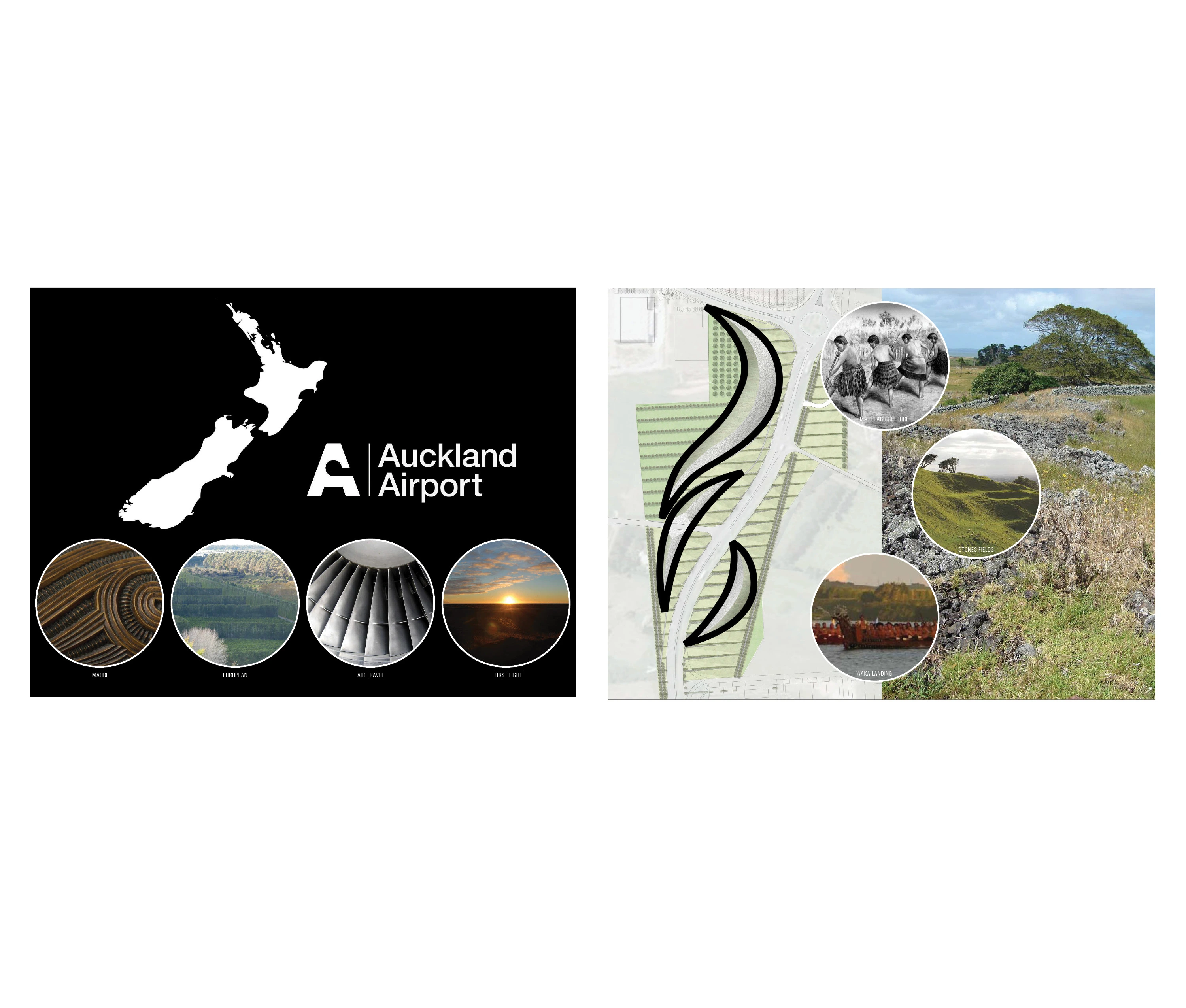 Auckland International Airport is strategically located on the eastern edge of an isthmus of the North Island of New Zealand, where the topography unfolds into the rugged coastline. This is the region where the Maori first arrived in waka canoes from Polynesia, transforming the landscape through the cultivation of tropical plants in stone-lined excavations that became a sacred typology. Centuries later, European immigrants further modified the landscape with the cultivation of orchards and timber trees. They, too, protected the crops from the harsh climate with layered plantings of strict hedgerows. Both the Maori and European settlers dramatically shaped the Auckland and broader New Zealand landscape. The airport landscape is an expression of this engagement of people and land, and it celebrates the multiple histories of New Zealand’s vernacular landscapes. Stone mounds that reference Maori stonesfields rise from the ground; a datum of hedgerows overlays these mounds, creating a simplified groundplane from which the greater Auckland landscape—both urban and volcanic—can be read with a newfound clarity. The earthforms serve a dual purpose as they address on-site soils remediation and stormwater treatment, part of a larger ecological mission of the airport. Smaller, stone ‘blades’ reference the motion of a jet engine, and emphasize the excitement of arrival, travel, and cinematic choreography—of planes, cars, bicycles—through the airport landscape. Native New Zealand grasses soften the blades and connect them to the regional landscape. International travelers to and from Auckland generally arrive in the dark. Leveraging the importance of light as part of the airport travel experience in Auckland, the airport celebrates the New Zealand landscape in light. A spectrum of colors are pulled from the dramatic New Zealand landscape, from Hukafalls to the volcanoes in Auckland, and projected on the stone blades—welcoming travelers to the landscape of the country as they arrive.