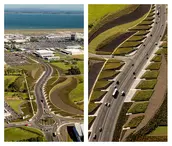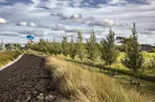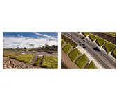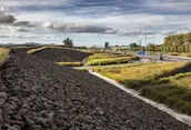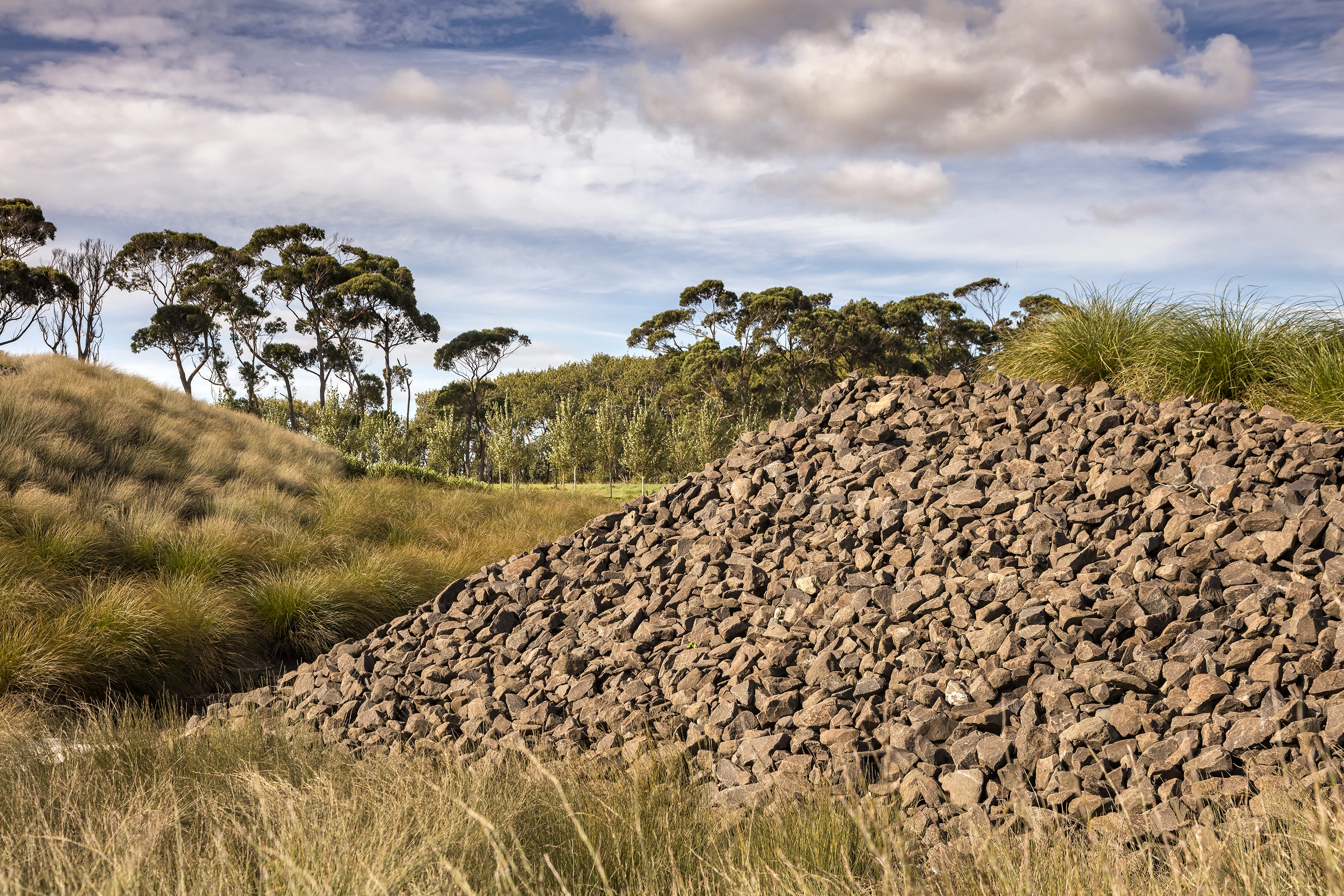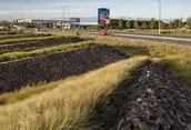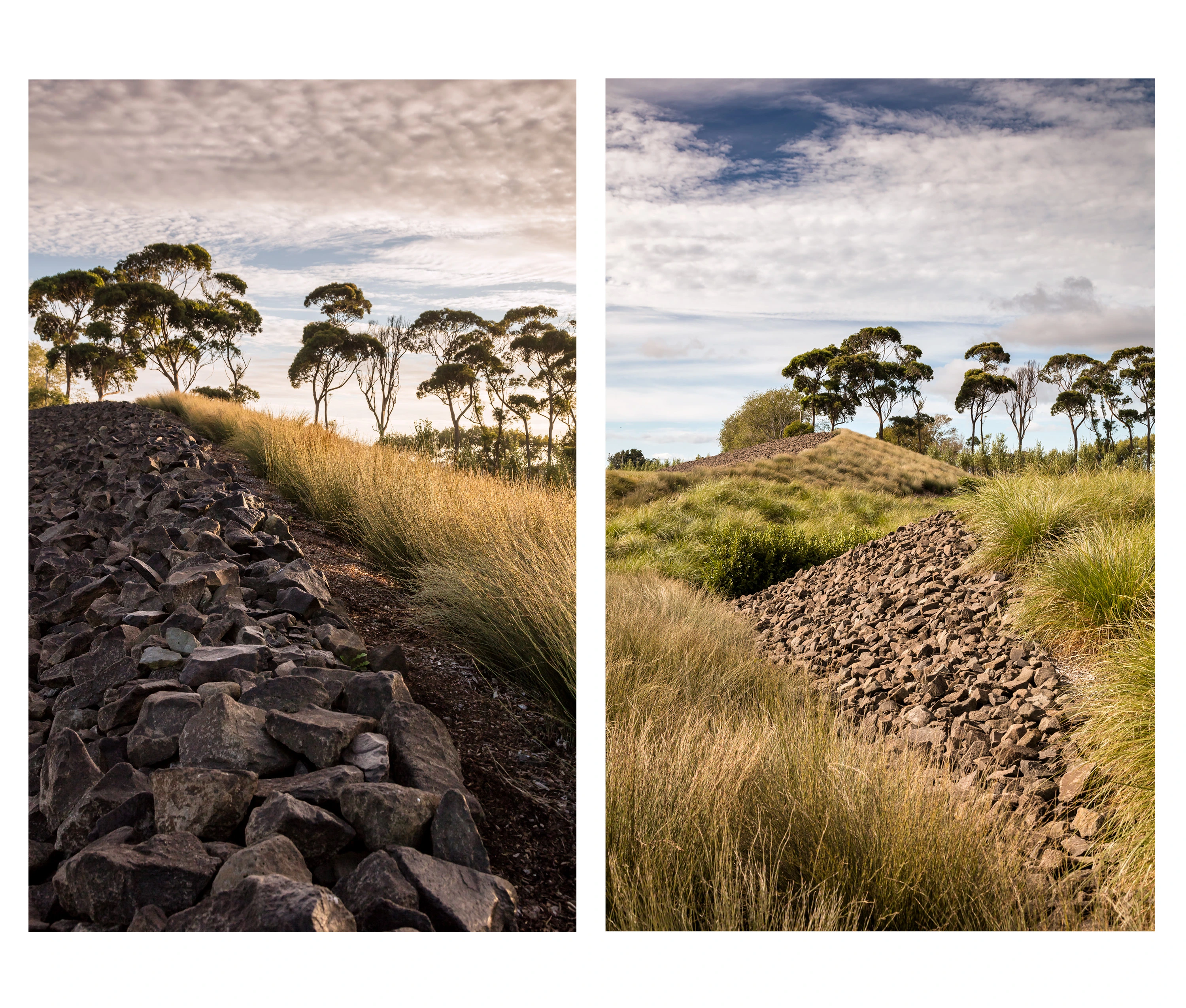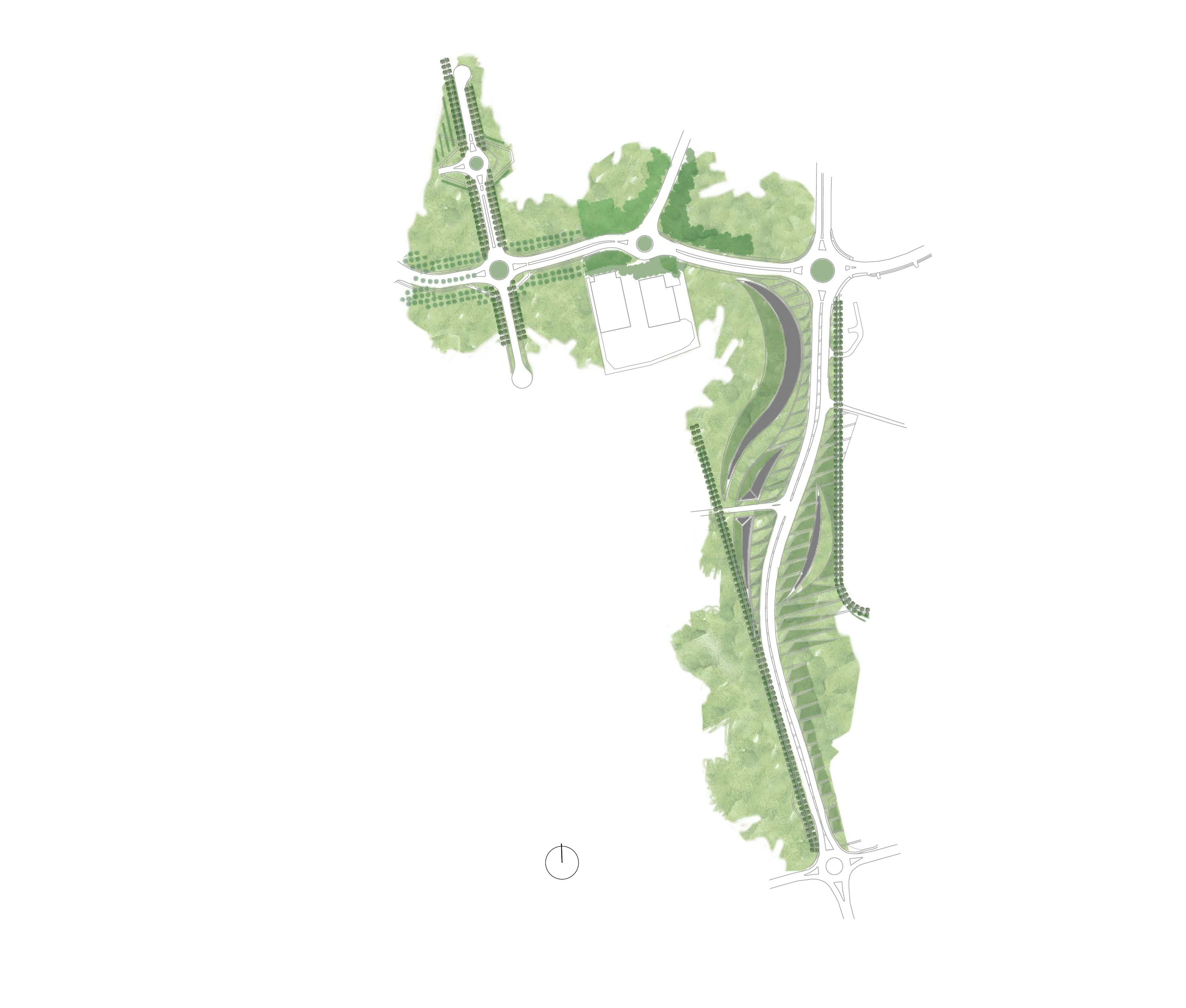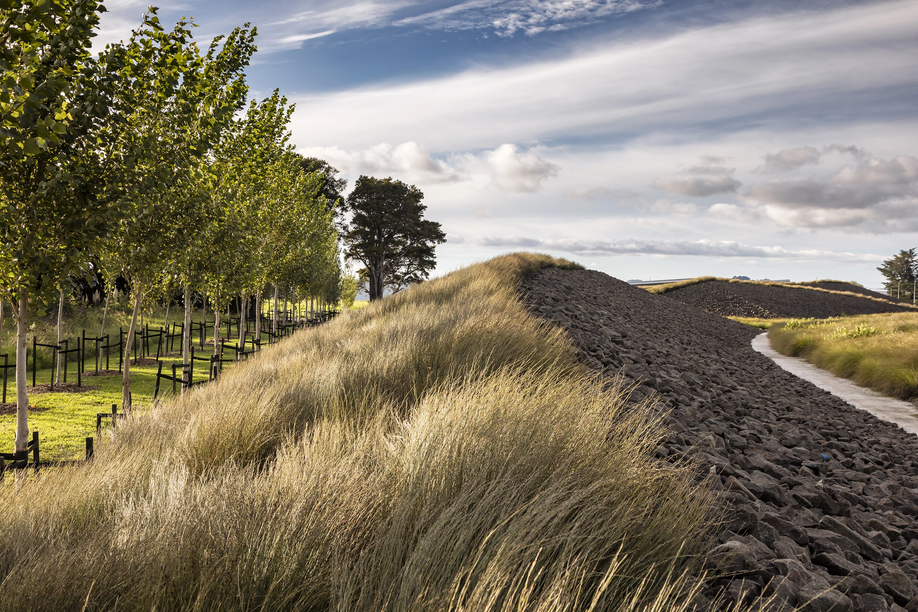 Auckland International Airport is strategically located on the eastern edge of an isthmus of the North Island of New Zealand, where the topography unfolds into the rugged coastline. This is the region where the Maori first arrived in waka canoes from Polynesia, transforming the landscape through the cultivation of tropical plants in stone-lined excavations that became a sacred typology. Centuries later, European immigrants further modified the landscape with the cultivation of orchards and timber trees. They, too, protected the crops from the harsh climate with layered plantings of strict hedgerows. Both the Maori and European settlers dramatically shaped the Auckland and broader New Zealand landscape. The airport landscape is an expression of this engagement of people and land, and it celebrates the multiple histories of New Zealand’s vernacular landscapes. Stone mounds that reference Maori stonesfields rise from the ground; a datum of hedgerows overlays these mounds, creating a simplified groundplane from which the greater Auckland landscape—both urban and volcanic—can be read with a newfound clarity. The earthforms serve a dual purpose as they address on-site soils remediation and stormwater treatment, part of a larger ecological mission of the airport. Smaller, stone ‘blades’ reference the motion of a jet engine, and emphasize the excitement of arrival, travel, and cinematic choreography—of planes, cars, bicycles—through the airport landscape. Native New Zealand grasses soften the blades and connect them to the regional landscape. International travelers to and from Auckland generally arrive in the dark. Leveraging the importance of light as part of the airport travel experience in Auckland, the airport celebrates the New Zealand landscape in light. A spectrum of colors are pulled from the dramatic New Zealand landscape, from Hukafalls to the volcanoes in Auckland, and projected on the stone blades—welcoming travelers to the landscape of the country as they arrive.