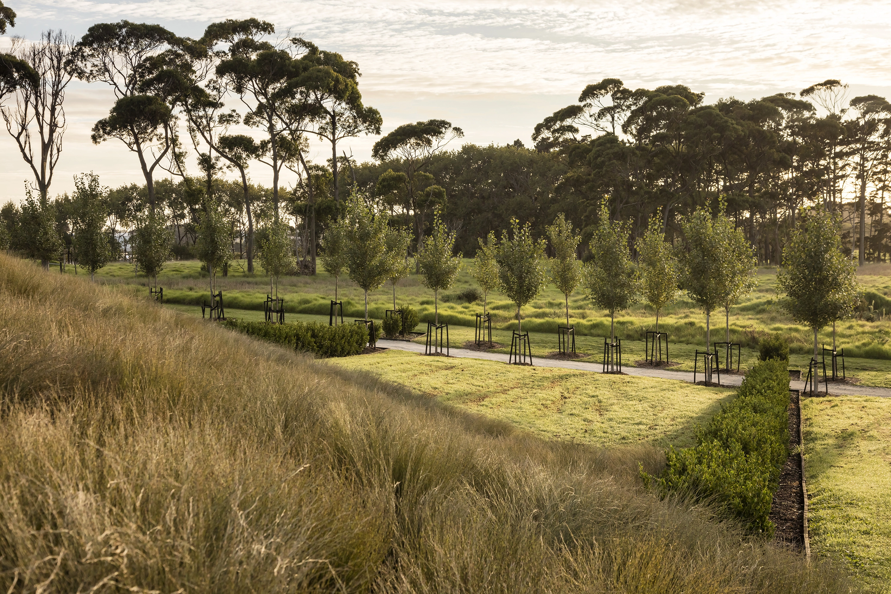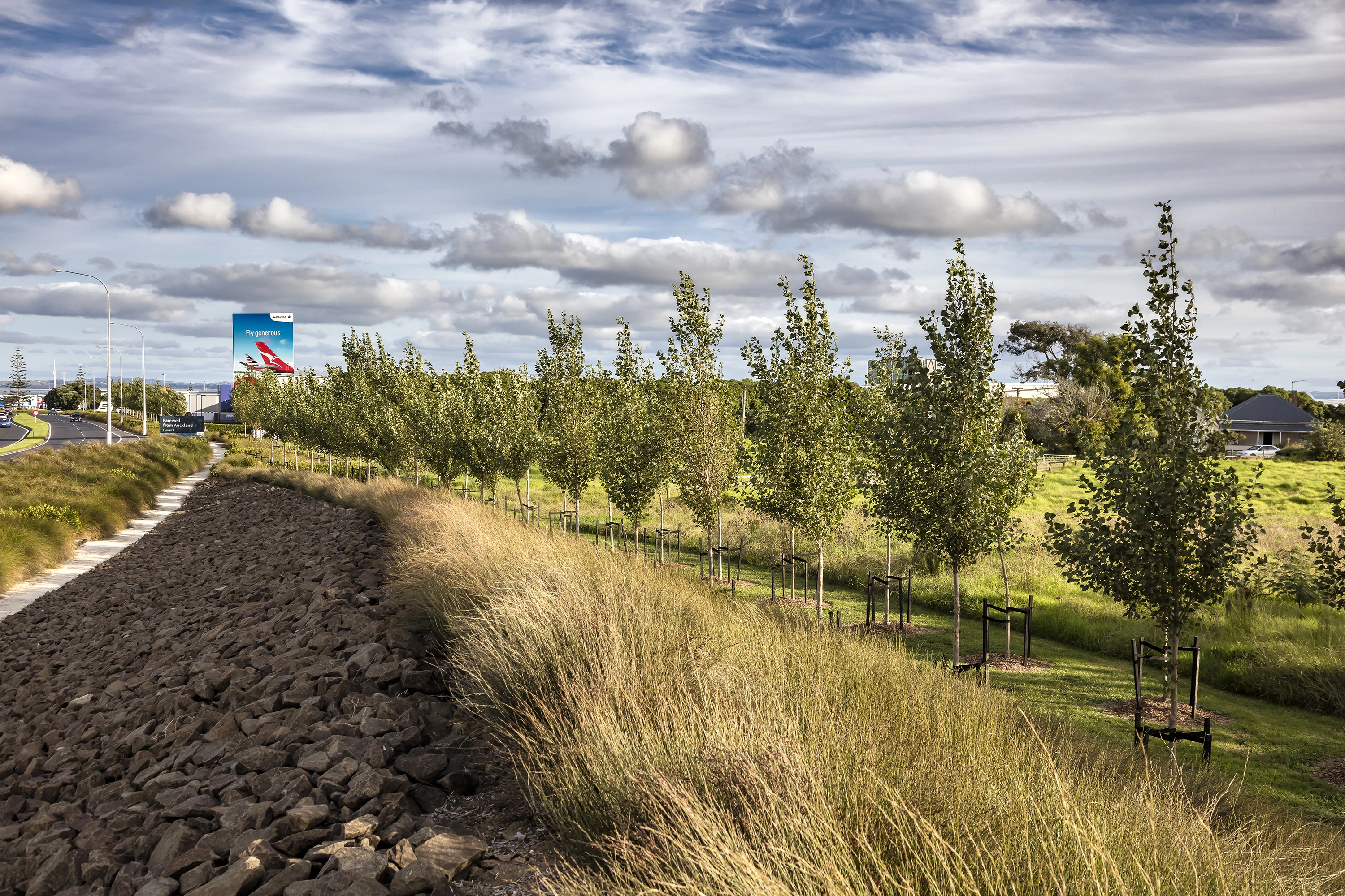 The Auckland International Airport has a dramatic geographical context, sited on an isthmus of the northern island of New Zealand. The seasons change in dramatic shifts— the east coast of New Zealand receives the first light of day in terms of global time. 70% of visitors to New Zealand arrive through the portal of the Auckland Airport, which has, over time, lost a unique national identity. The Auckland Airport landscape is a welcome to visitors, a recognition of the site’s location on the globe, and a celebration of how man has engaged with the uniquely dramatic New Zealand landscape.