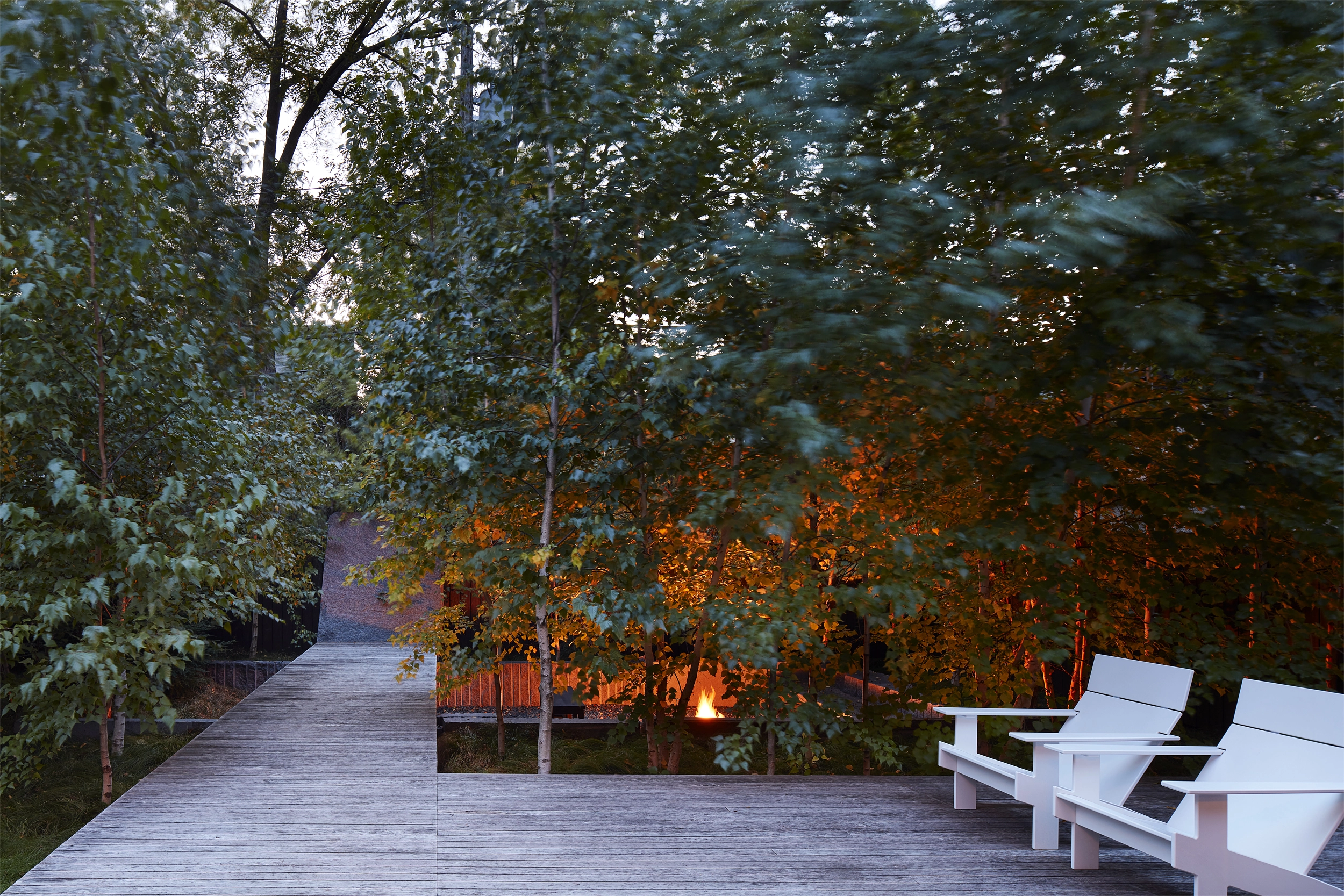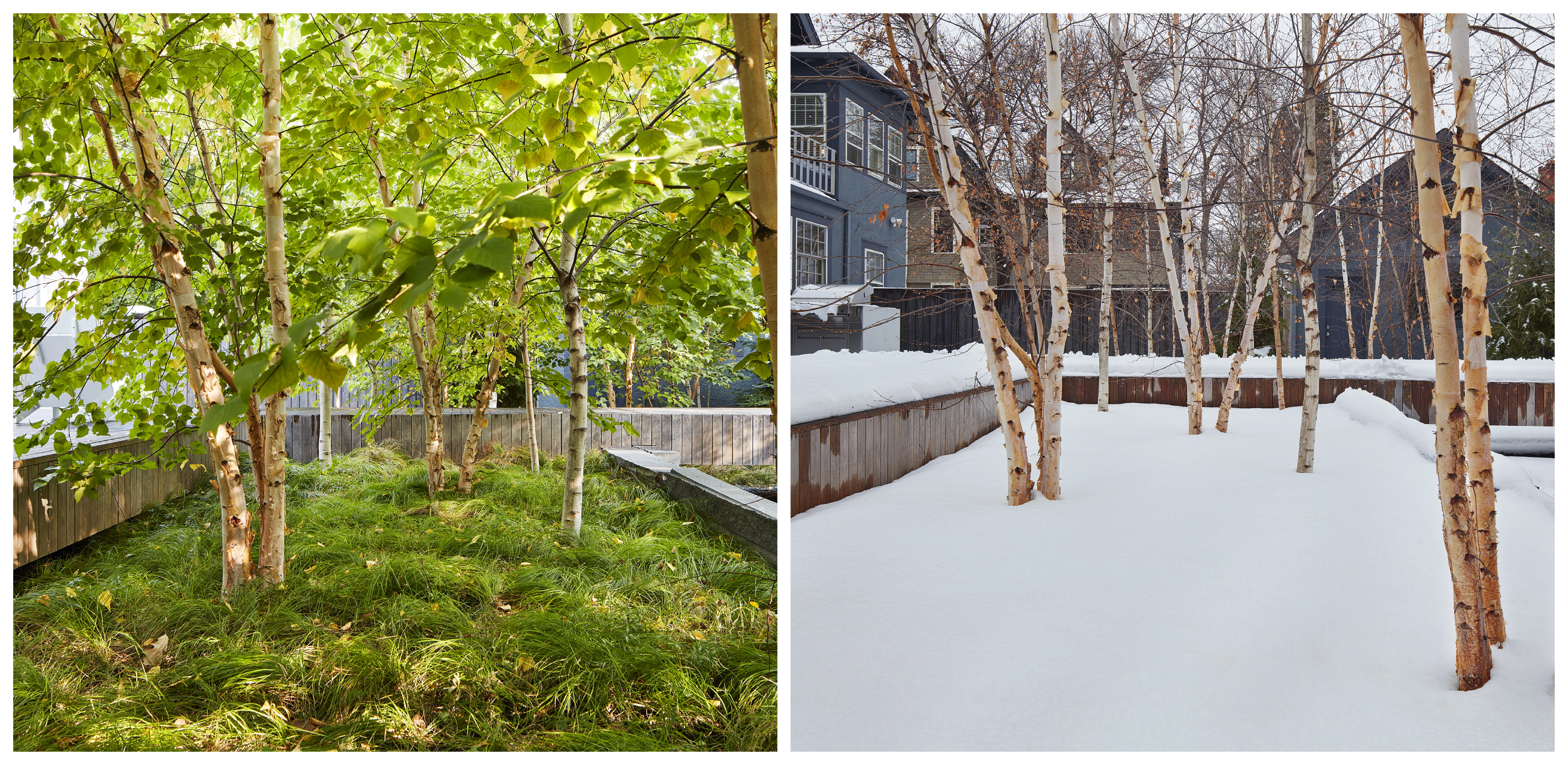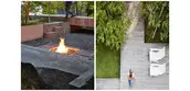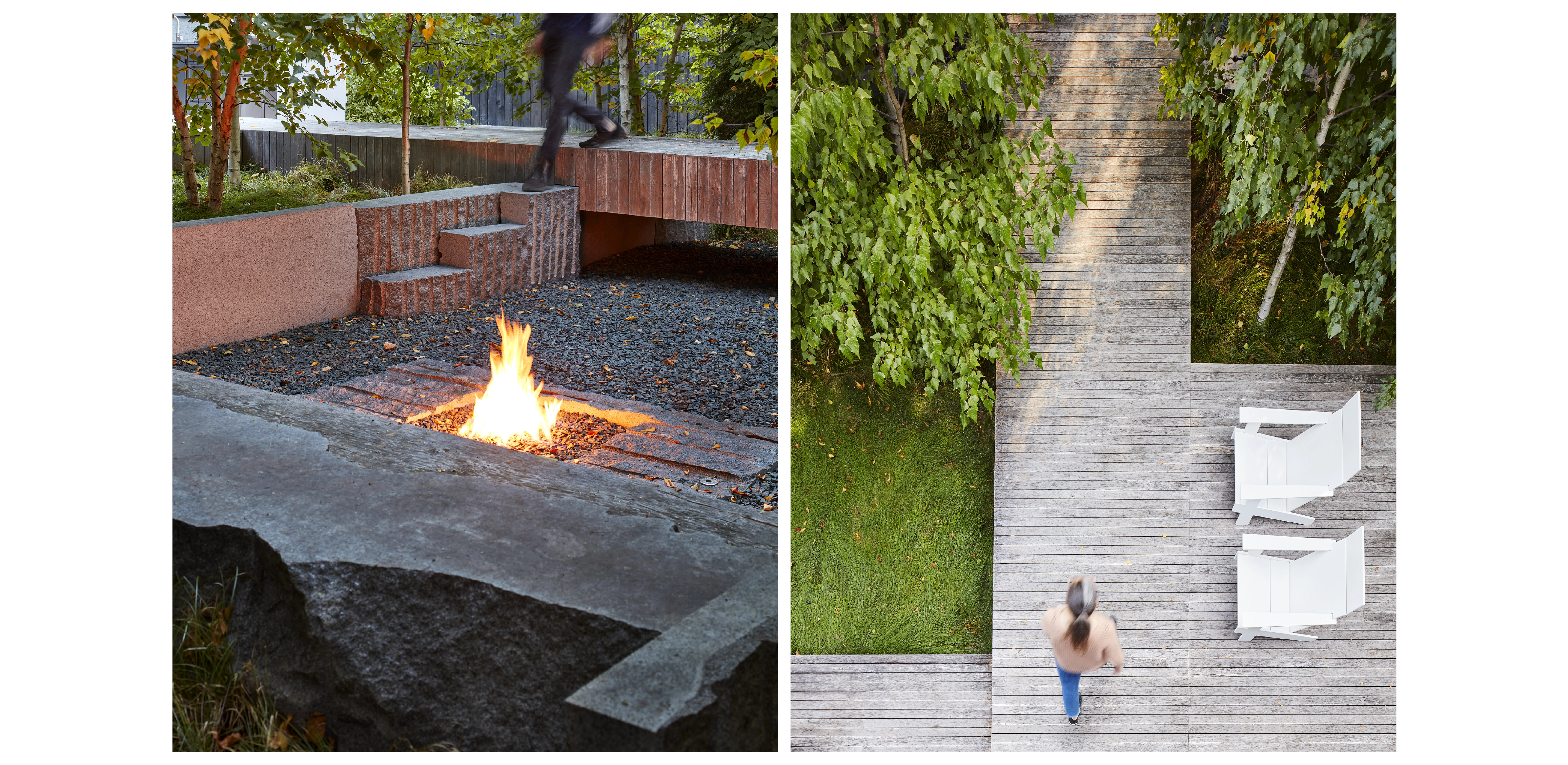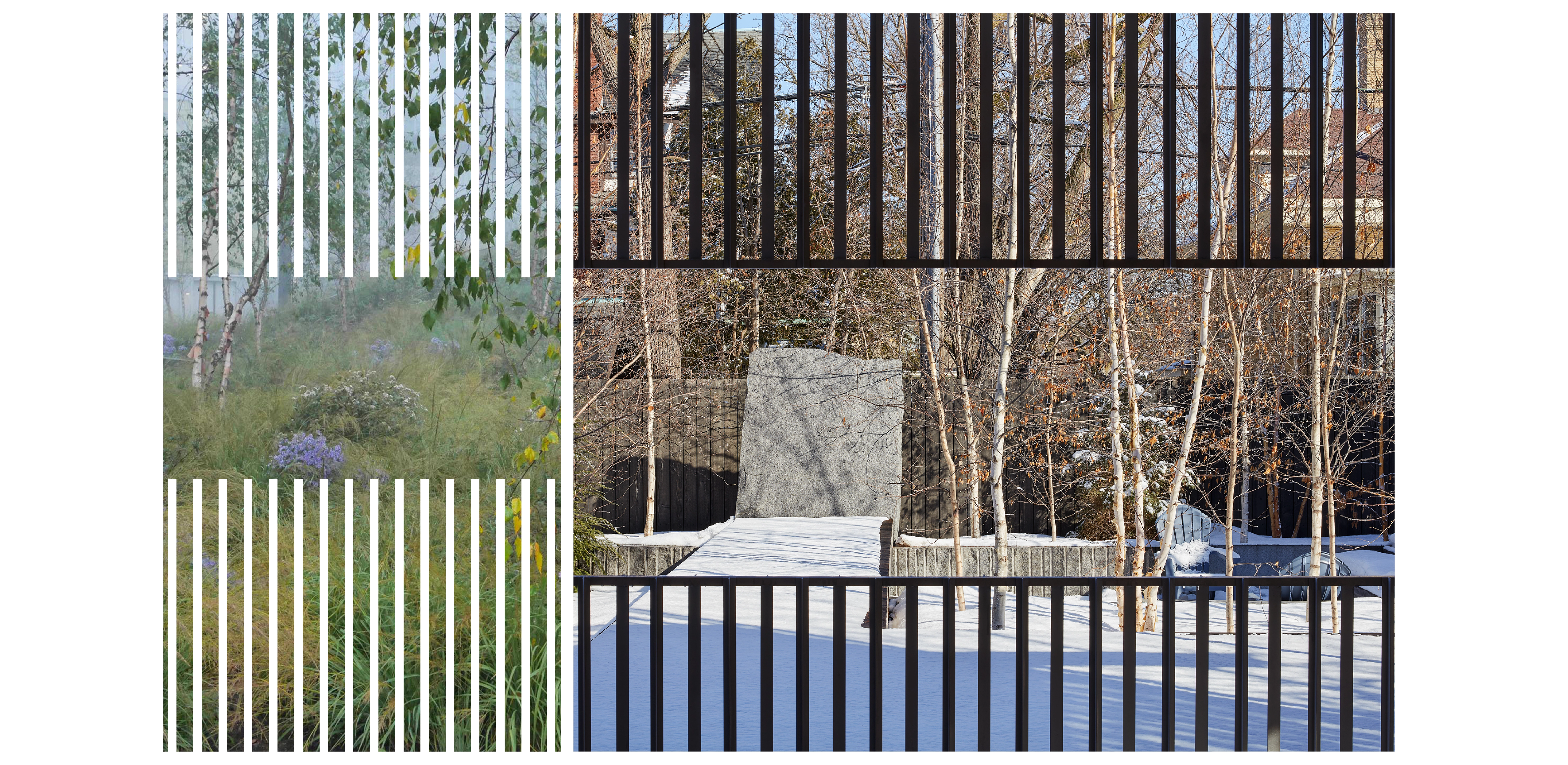 CONTEXT The .21-acre yard sits in an urban neighborhood, just southwest of downtown Minneapolis. The backyard started as a typical residential lot with a patchy lawn, two large maple trees in significant decline, and a swing set left over from the previous owners. The first floor of the house is 3’ above the exterior grade, which created an awkward transition between the back porch and the yard, disconnecting the interior and exterior spaces. DESIGN PROCESS The landscape architect was asked to transform the underutilized shady back yard lawn into a Zen-like oasis. Wild respite, material richness and modern simplicity are the foundation for the garden. Abstract concept collages celebrating Minnesota’s geological and ecological context catalyzed the design direction, exploring how a wild landscape can be structured and experienced through a series of shifting planes, frames, and thresholds (both architectural and vegetal). The garden is organized as a continuation of the existing sequence of living rooms on the first floor of the house, transitioning from domestic to wild. The collages also tested ideas of mass and void within the garden, situating elevated wood plinths alongside granite-framed voids. A key element of the design was the self-imposed limitation to draw from unwanted charcoal grey granite “graveyard” at the Coldspring Quarry near St. Cloud, MN to construct the sunken quarry space. Inspired by the challenge to recycle materials that had already been extracted from the ground, the landscape architect carefully inventoried and designed the sunken quarry using a range of discarded unique granite pieces. The result is a richly tactile landscape that is carefully pieced together and that honors the unique characteristics and authentic raw beauty of the stone. The client loved the stone in the garden so much that they designed their living room fireplace using a large granite roughback slab. WILD GARDEN ROOMS Five distinct outdoor rooms make up the Quarry Garden: the sunken quarry, the floating deck, the porch, the outdoor kitchen, and the green alley. The rooms are carefully designed to extend the experience of “living” from inside to outside, through the porch, onto the deck, and ultimately into the birch grove and down into the quarry. In addition to the garden rooms, the project includes the addition of a second-floor outdoor deck off the master bedroom above the porch. The deck and porch volume are wrapped in an architectural veil made of vertical aluminum slats that selectively frame and screen views from the inside out. THE SUNKEN QUARRY A variety of granite pieces ranging in size from 3’ wide by 5-10’ long slabs were used to create the walls of the quarry and a massive 4’ wide by 8’ tall stone wedge was used as a sculptural element to anchor and book-end the floating bridge. The sunken quarry steps down two feet into the earth, where a carpet of crushed granite aggregate hosts a custom gas fire slab and grounds the room. A 2’ wide live edge oak board bench was custom designed to nest into the stone walls, creating a signature seating element adjacent to the fire pit. Inspired by the ecological context of Minnesota, the clients were committed to transforming the expansive underutilized lawn areas into an ecologically productive and sustainable garden using native plants. Forty whitespire birch and hemlock trees shade a native woodland groundcover of Pennsylvania sedge and sweet woodruff. Surrounded by tactile natural materials, ambient sound, and dappled light, the sunken quarry is an immersive place for respite, relaxation, and intimate conversations. THE FLOATING DECK AND PORCH The floating deck extends the first floor of the house through the porch, onto the deck and across the floating bridge into the garden, stitching the indoor and outdoor rooms together. The large sliding screen doors and architectural veil wrapping the porch are operable, closing to create intimacy or opening to pull the garden into the house. The picnic tables on the porch can easily be moved out to the deck, while the movable furniture can migrate between the sunken quarry and the deck. The flexibility of these spaces to transform and the playfulness of “outdoor” rooms, veils or screens, thresholds, hallways, bridges, steps, and terraces blurs the notion of having discrete interior or exterior spaces. The floating deck and bridge are crafted from sustainably harvested black locust decking. The wood slats wrap the edges of the deck to create the appearance of a thickened plinth that hovers above the garden. THE GREEN ALLEY Alongside the house, the woodland garden with serviceberry, whitespire birch, swiss stone pine and columnar white pine trees is interrupted by a granite slab path that defines a meandering experience through the “green alley”. Strategically placed trees are intended to both screen views from inside the house to the neighboring house and to bring vibrant seasonal colors into the living spaces. The fences wrapping the garden were stained black, allowing the edges of the property to disappear into the background. The aluminum veil that wraps the porch and upper terrace is operable to enclose or expose the porch. When the veil is open, it slides into the green alley space - framing views into the long narrow garden. AN URBAN RESPITE The landscape architect was asked to create a space that allows the family to relax, blur inside and outside, increase privacy, and find respite within their own yard. Each wild garden room is distinct, yet carefully integrated to create dynamic experiences throughout the day and across seasons. Thoughtful and carefully crafted details that honor the authenticity of raw natural material are used across the garden. Not a single intersection of materials or transition between spaces is left unconsidered. Descending into the 25’x50’ sunken quarry, surrounded by a forest of birch and hemlock trees, the city disappears. The tre
