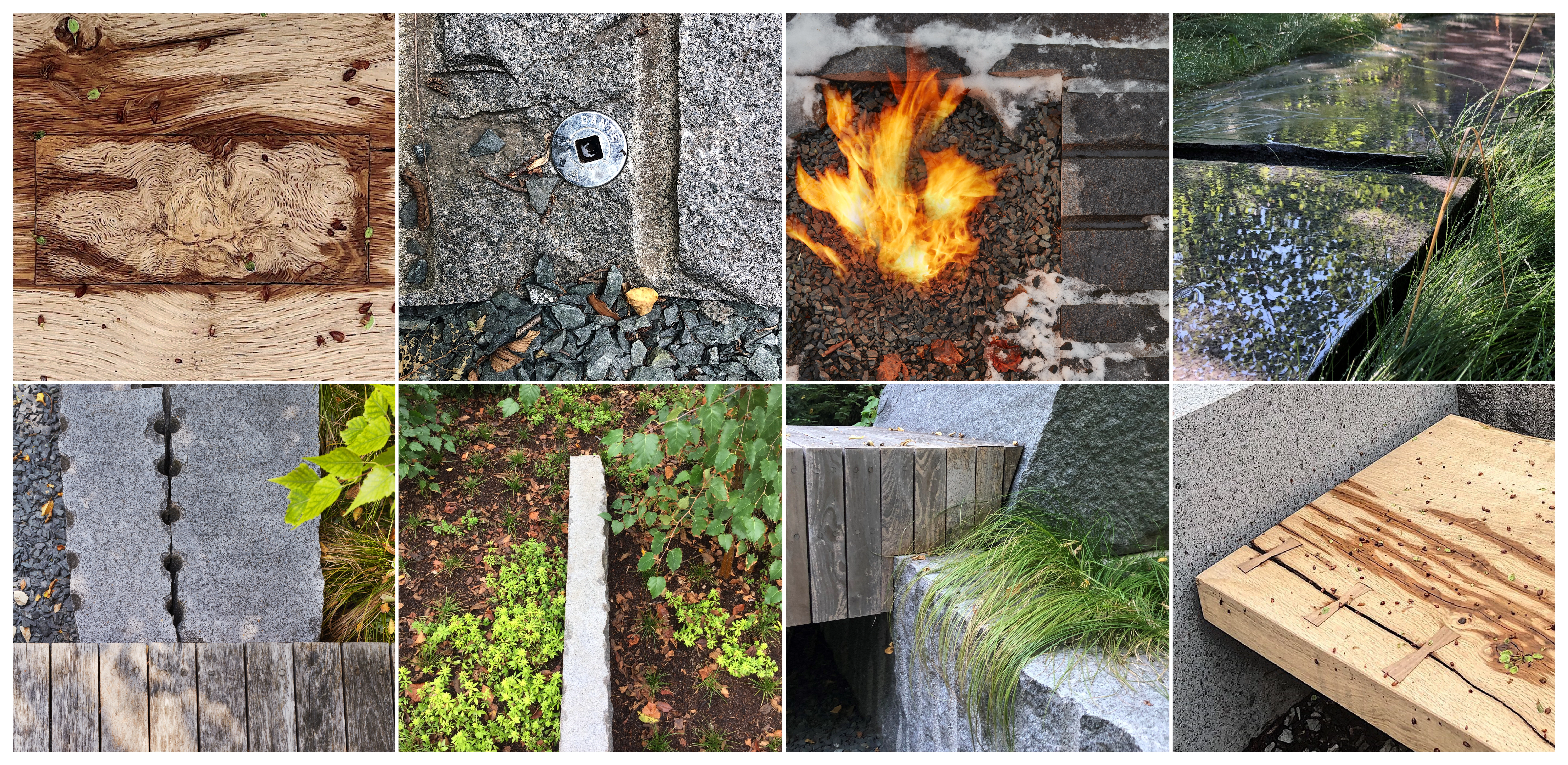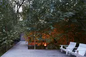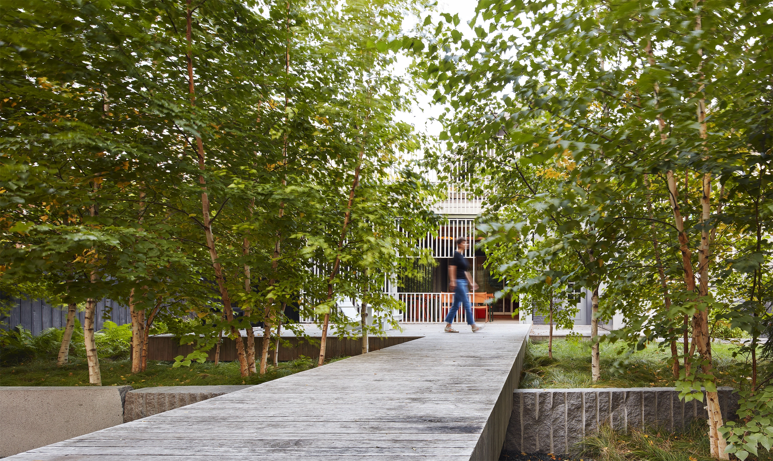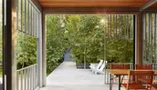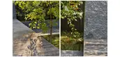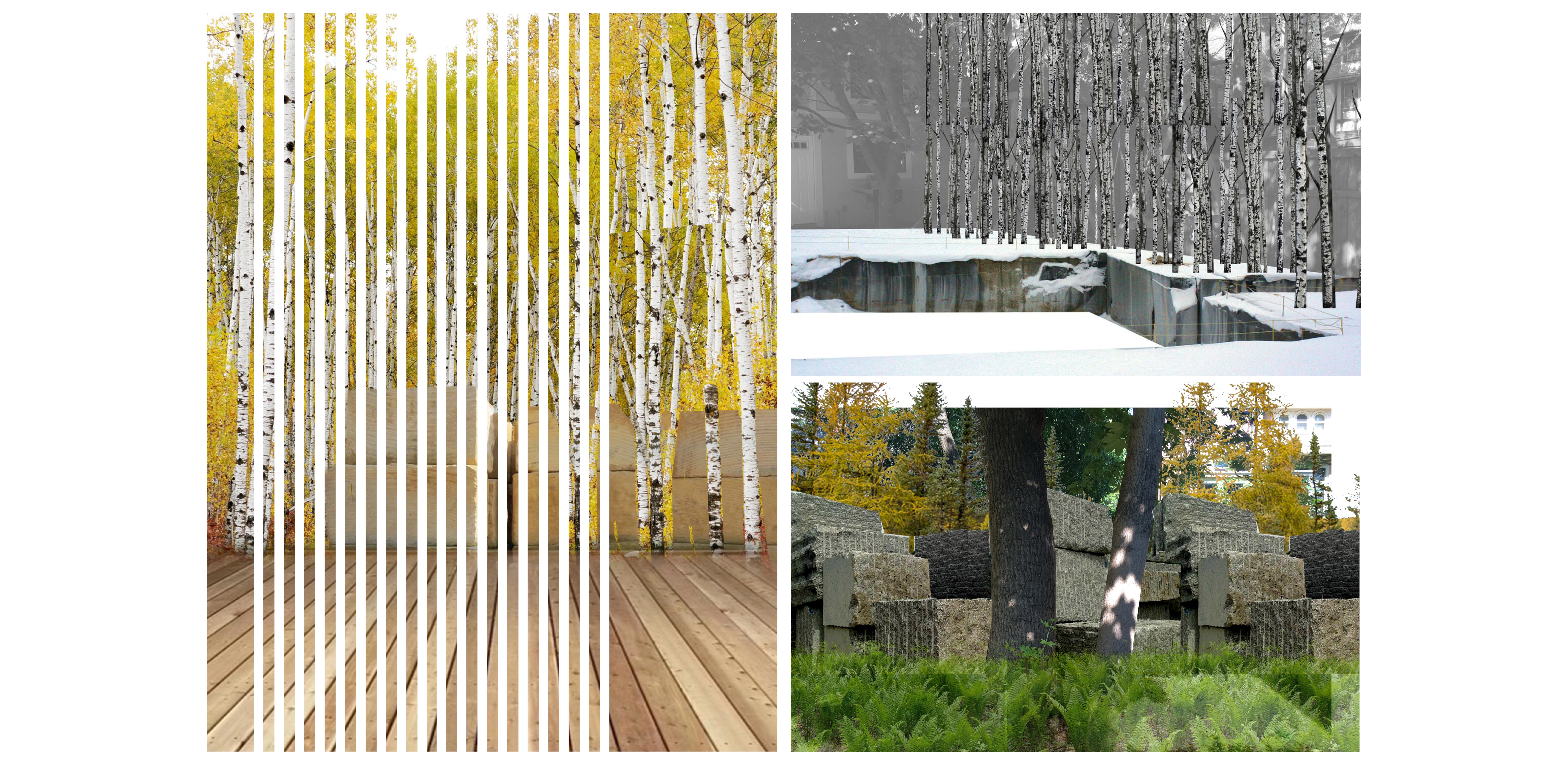 CONTEXT The .21-acre yard sits in an urban neighborhood, just southwest of downtown Minneapolis. The backyard started as a typical residential lot with a patchy lawn, two large maple trees in significant decline, and a swing set left over from the previous owners. The first floor of the house is 3’ above the exterior grade, which created an awkward transition between the back porch and the yard, disconnecting the interior and exterior spaces. DESIGN PROCESS The landscape architect was asked to transform the underutilized shady back yard lawn into a Zen-like oasis. Wild respite, material richness and modern simplicity are the foundation for the garden. Abstract concept collages celebrating Minnesota’s geological and ecological context catalyzed the design direction, exploring how a wild landscape can be structured and experienced through a series of shifting planes, frames, and thresholds (both architectural and vegetal). The garden is organized as a continuation of the existing sequence of living rooms on the first floor of the house, transitioning from domestic to wild. The collages also tested ideas of mass and void within the garden, situating elevated wood plinths alongside granite-framed voids. A key element of the design was the self-imposed limitation to draw from unwanted charcoal grey granite “graveyard” at the Coldspring Quarry near St. Cloud, MN to construct the sunken quarry space. Inspired by the challenge to recycle materials that had already been extracted from the ground, the landscape architect carefully inventoried and designed the sunken quarry using a range of discarded unique granite pieces. The result is a richly tactile landscape that is carefully pieced together and that honors the unique characteristics and authentic raw beauty of the stone. The client loved the stone in the garden so much that they designed their living room fireplace using a large granite roughback slab. WILD GARDEN ROOMS Five distinct outdoor rooms make up the Quarry Garden: the sunken quarry, the floating deck, the porch, the outdoor kitchen, and the green alley. The rooms are carefully designed to extend the experience of “living” from inside to outside, through the porch, onto the deck, and ultimately into the birch grove and down into the quarry. In addition to the garden rooms, the project includes the addition of a second-floor outdoor deck off the master bedroom above the porch. The deck and porch volume are wrapped in an architectural veil made of vertical aluminum slats that selectively frame and screen views from the inside out. THE SUNKEN QUARRY A variety of granite pieces ranging in size from 3’ wide by 5-10’ long slabs were used to create the walls of the quarry and a massive 4’ wide by 8’ tall stone wedge was used as a sculptural element to anchor and book-end the floating bridge. The sunken quarry steps down two feet into the earth, where a carpet of crushed granite aggregate hosts a custom gas fire slab and grounds the room. A 2’ wide live edge oak board bench was custom designed to nest into the stone walls, creating a signature seating element adjacent to the fire pit. Inspired by the ecological context of Minnesota, the clients were committed to transforming the expansive underutilized lawn areas into an ecologically productive and sustainable garden using native plants. Forty whitespire birch and hemlock trees shade a native woodland groundcover of Pennsylvania sedge and sweet woodruff. Surrounded by tactile natural materials, ambient sound, and dappled light, the sunken quarry is an immersive place for respite, relaxation, and intimate conversations. THE FLOATING DECK AND PORCH The floating deck extends the first floor of the house through the porch, onto the deck and across the floating bridge into the garden, stitching the indoor and outdoor rooms together. The large sliding screen doors and architectural veil wrapping the porch are operable, closing to create intimacy or opening to pull the garden into the house. The picnic tables on the porch can easily be moved out to the deck, while the movable furniture can migrate between the sunken quarry and the deck. The flexibility of these spaces to transform and the playfulness of “outdoor” rooms, veils or screens, thresholds, hallways, bridges, steps, and terraces blurs the notion of having discrete interior or exterior spaces. The floating deck and bridge are crafted from sustainably harvested black locust decking. The wood slats wrap the edges of the deck to create the appearance of a thickened plinth that hovers above the garden. THE GREEN ALLEY Alongside the house, the woodland garden with serviceberry, whitespire birch, swiss stone pine and columnar white pine trees is interrupted by a granite slab path that defines a meandering experience through the “green alley”. Strategically placed trees are intended to both screen views from inside the house to the neighboring house and to bring vibrant seasonal colors into the living spaces. The fences wrapping the garden were stained black, allowing the edges of the property to disappear into the background. The aluminum veil that wraps the porch and upper terrace is operable to enclose or expose the porch. When the veil is open, it slides into the green alley space - framing views into the long narrow garden. AN URBAN RESPITE The landscape architect was asked to create a space that allows the family to relax, blur inside and outside, increase privacy, and find respite within their own yard. Each wild garden room is distinct, yet carefully integrated to create dynamic experiences throughout the day and across seasons. Thoughtful and carefully crafted details that honor the authenticity of raw natural material are used across the garden. Not a single intersection of materials or transition between spaces is left unconsidered. Descending into the 25’x50’ sunken quarry, surrounded by a forest of birch and hemlock trees, the city disappears. The tre