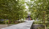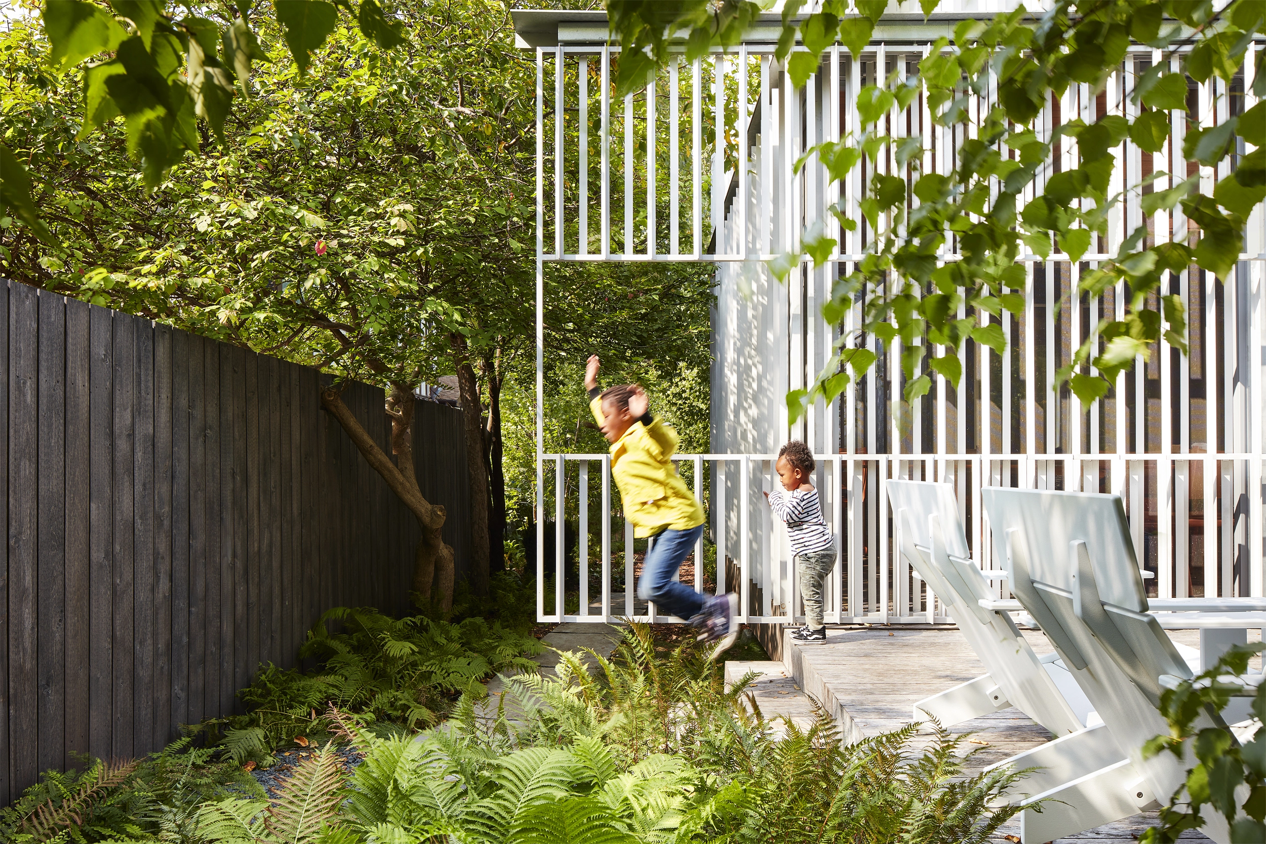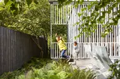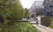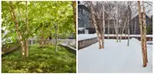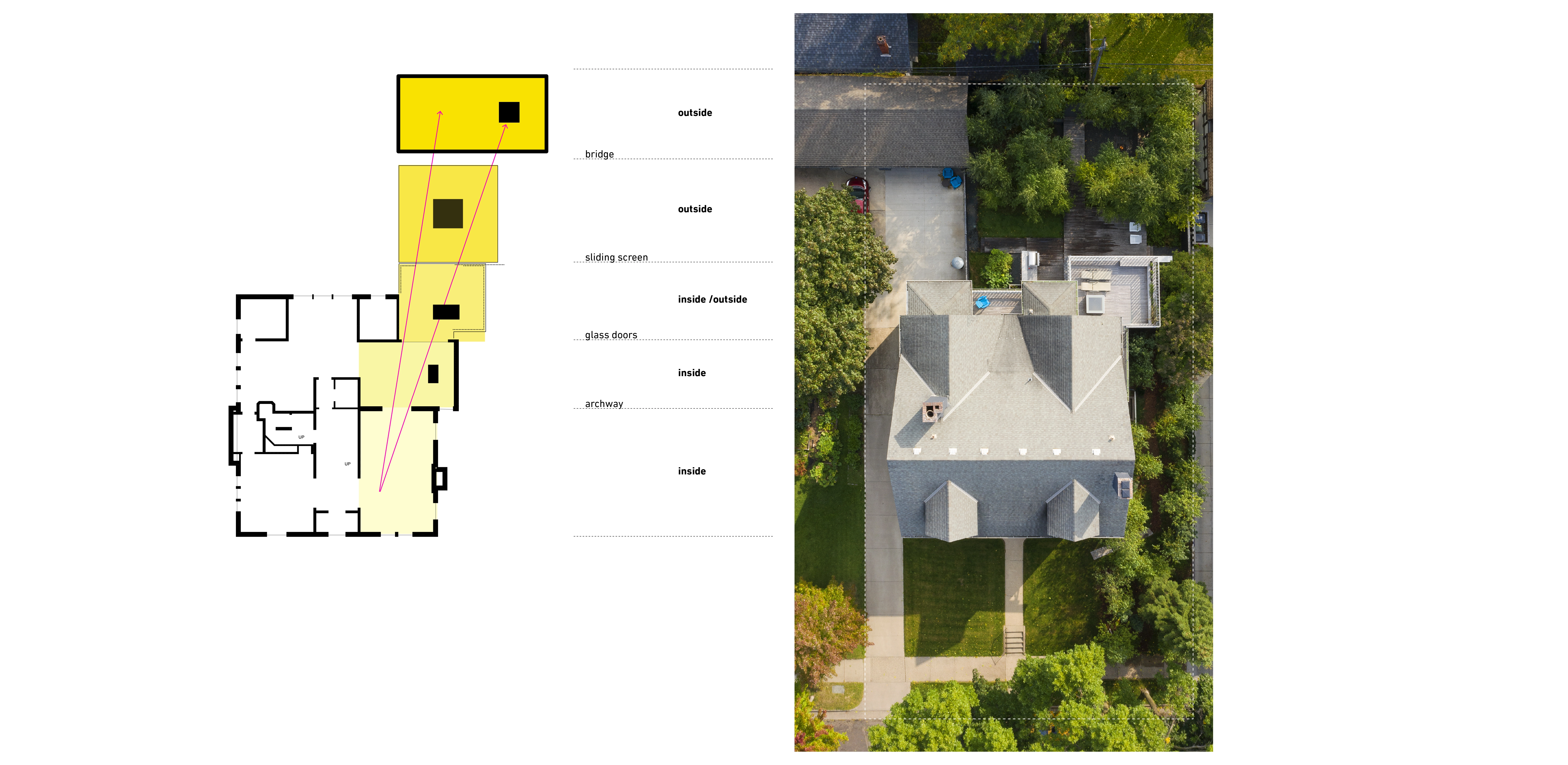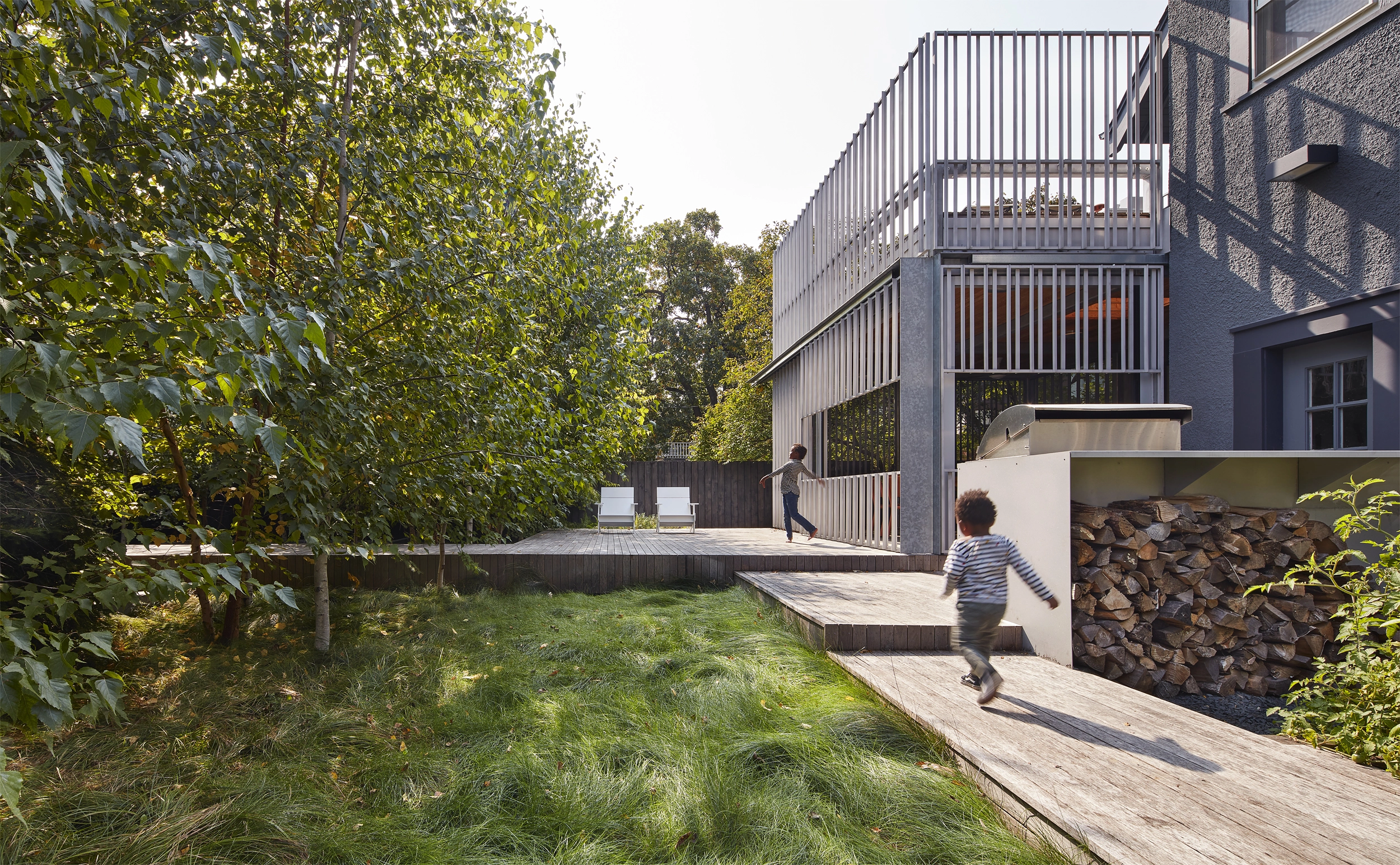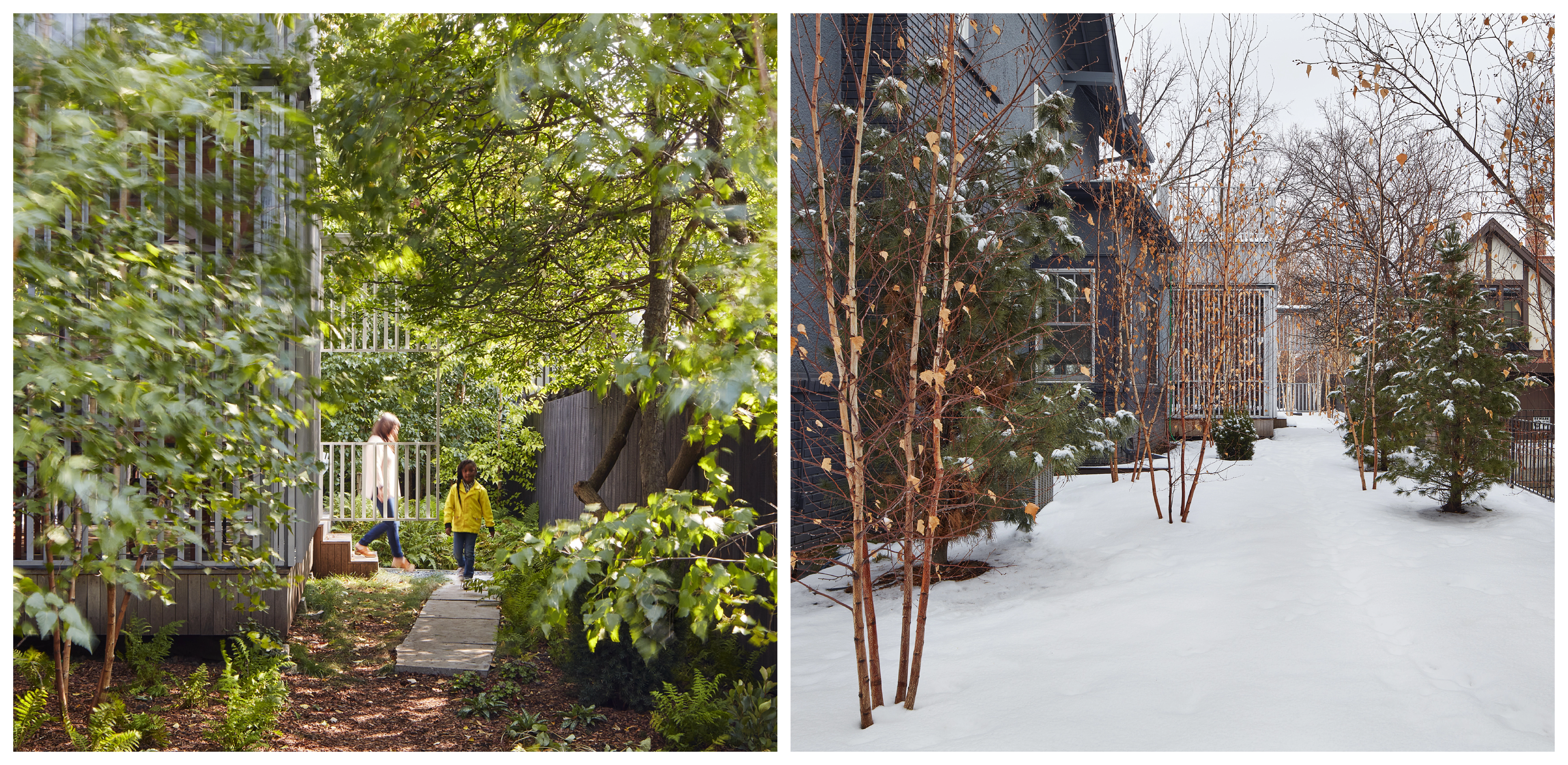 CONTEXT The .21-acre yard sits in an urban neighborhood, just southwest of downtown Minneapolis. The backyard started as a typical residential lot with a patchy lawn, two large maple trees in significant decline, and a swing set left over from the previous owners. The first floor of the house is 3’ above the exterior grade, which created an awkward transition between the back porch and the yard, disconnecting the interior and exterior spaces. DESIGN PROCESS The landscape architect was asked to transform the underutilized shady back yard lawn into a Zen-like oasis. Wild respite, material richness and modern simplicity are the foundation for the garden. Abstract concept collages celebrating Minnesota’s geological and ecological context catalyzed the design direction, exploring how a wild landscape can be structured and experienced through a series of shifting planes, frames, and thresholds (both architectural and vegetal). The garden is organized as a continuation of the existing sequence of living rooms on the first floor of the house, transitioning from domestic to wild. The collages also tested ideas of mass and void within the garden, situating elevated wood plinths alongside granite-framed voids. A key element of the design was the self-imposed limitation to draw from unwanted charcoal grey granite “graveyard” at the Coldspring Quarry near St. Cloud, MN to construct the sunken quarry space. Inspired by the challenge to recycle materials that had already been extracted from the ground, the landscape architect carefully inventoried and designed the sunken quarry using a range of discarded unique granite pieces. The result is a richly tactile landscape that is carefully pieced together and that honors the unique characteristics and authentic raw beauty of the stone. The client loved the stone in the garden so much that they designed their living room fireplace using a large granite roughback slab. WILD GARDEN ROOMS Five distinct outdoor rooms make up the Quarry Garden: the sunken quarry, the floating deck, the porch, the outdoor kitchen, and the green alley. The rooms are carefully designed to extend the experience of “living” from inside to outside, through the porch, onto the deck, and ultimately into the birch grove and down into the quarry. In addition to the garden rooms, the project includes the addition of a second-floor outdoor deck off the master bedroom above the porch. The deck and porch volume are wrapped in an architectural veil made of vertical aluminum slats that selectively frame and screen views from the inside out. THE SUNKEN QUARRY A variety of granite pieces ranging in size from 3’ wide by 5-10’ long slabs were used to create the walls of the quarry and a massive 4’ wide by 8’ tall stone wedge was used as a sculptural element to anchor and book-end the floating bridge. The sunken quarry steps down two feet into the earth, where a carpet of crushed granite aggregate hosts a custom gas fire slab and grounds the room. A 2’ wide live edge oak board bench was custom designed to nest into the stone walls, creating a signature seating element adjacent to the fire pit. Inspired by the ecological context of Minnesota, the clients were committed to transforming the expansive underutilized lawn areas into an ecologically productive and sustainable garden using native plants. Forty whitespire birch and hemlock trees shade a native woodland groundcover of Pennsylvania sedge and sweet woodruff. Surrounded by tactile natural materials, ambient sound, and dappled light, the sunken quarry is an immersive place for respite, relaxation, and intimate conversations. THE FLOATING DECK AND PORCH The floating deck extends the first floor of the house through the porch, onto the deck and across the floating bridge into the garden, stitching the indoor and outdoor rooms together. The large sliding screen doors and architectural veil wrapping the porch are operable, closing to create intimacy or opening to pull the garden into the house. The picnic tables on the porch can easily be moved out to the deck, while the movable furniture can migrate between the sunken quarry and the deck. The flexibility of these spaces to transform and the playfulness of “outdoor” rooms, veils or screens, thresholds, hallways, bridges, steps, and terraces blurs the notion of having discrete interior or exterior spaces. The floating deck and bridge are crafted from sustainably harvested black locust decking. The wood slats wrap the edges of the deck to create the appearance of a thickened plinth that hovers above the garden. THE GREEN ALLEY Alongside the house, the woodland garden with serviceberry, whitespire birch, swiss stone pine and columnar white pine trees is interrupted by a granite slab path that defines a meandering experience through the “green alley”. Strategically placed trees are intended to both screen views from inside the house to the neighboring house and to bring vibrant seasonal colors into the living spaces. The fences wrapping the garden were stained black, allowing the edges of the property to disappear into the background. The aluminum veil that wraps the porch and upper terrace is operable to enclose or expose the porch. When the veil is open, it slides into the green alley space - framing views into the long narrow garden. AN URBAN RESPITE The landscape architect was asked to create a space that allows the family to relax, blur inside and outside, increase privacy, and find respite within their own yard. Each wild garden room is distinct, yet carefully integrated to create dynamic experiences throughout the day and across seasons. Thoughtful and carefully crafted details that honor the authenticity of raw natural material are used across the garden. Not a single intersection of materials or transition between spaces is left unconsidered. Descending into the 25’x50’ sunken quarry, surrounded by a forest of birch and hemlock trees, the city disappears. The tre