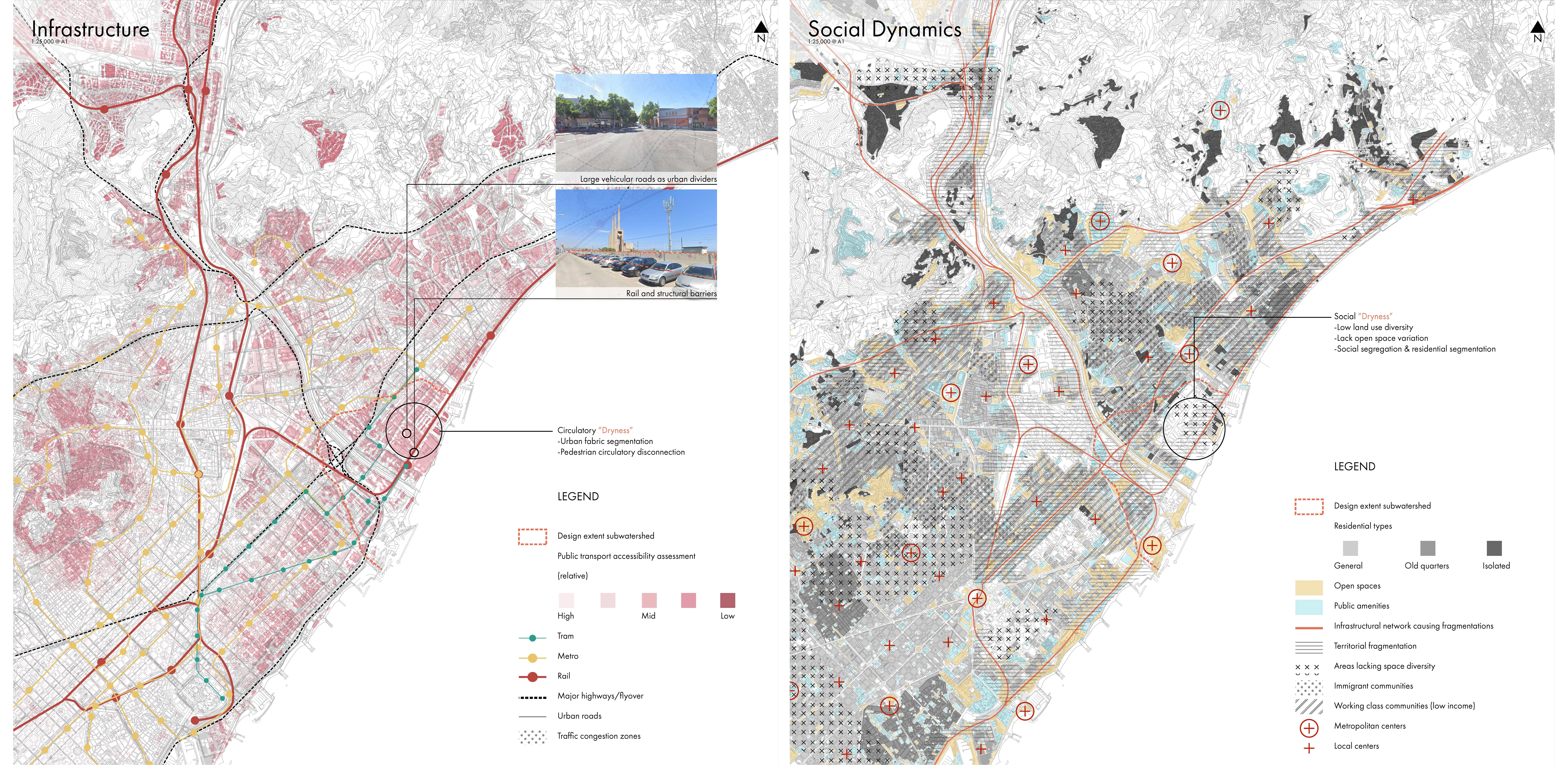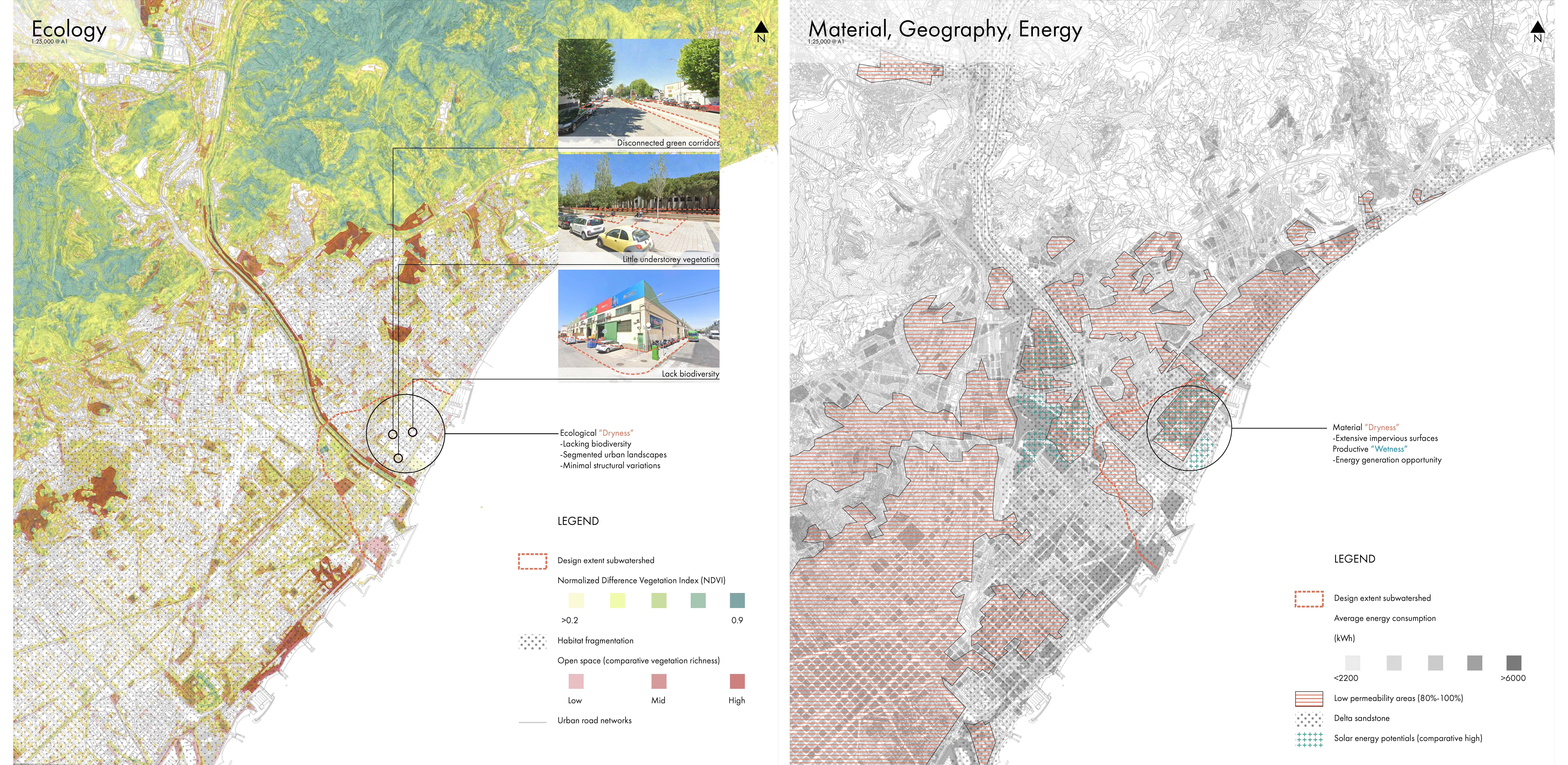 From historic evolution we began to understand how some aspects of dryness came about, with industrial expansion and urban densification, the Besos River once flowing freely bring moisture to the land was controlled and limited. Yet, from the hydrological review, the traces of its past extents remain, simply hidden underground. Through hydrological mapping and investigation, we see areas of high water table levels and recharge that reflects the underground wetness, an opportunity that we can leverage and amplify. As we move on to ecological aspects of the region, it is clear that dryness continues in forms beyond lack of water at the surface, but the lack of biodiversity and vegetation density is also evident as we realized from the annotated photographs. Infrastructure analysis further identified the extent of social dryness in urban disconnections but also correlates to the lack of continuous vegetation networks. Large highways, rail and road networks limit the spread of planting, creates discontinuities for local communities as well as lowering mobility. From the social perspective it is also evident dryness exists in the form of land use homogeneity which leads to low social vitality and vigor as there a little opportunities or incentive for gathering, interactions and events. In terms of materiality, it is clear the large extent of impermeable surfaces also contributes to the overall sense of harshness.