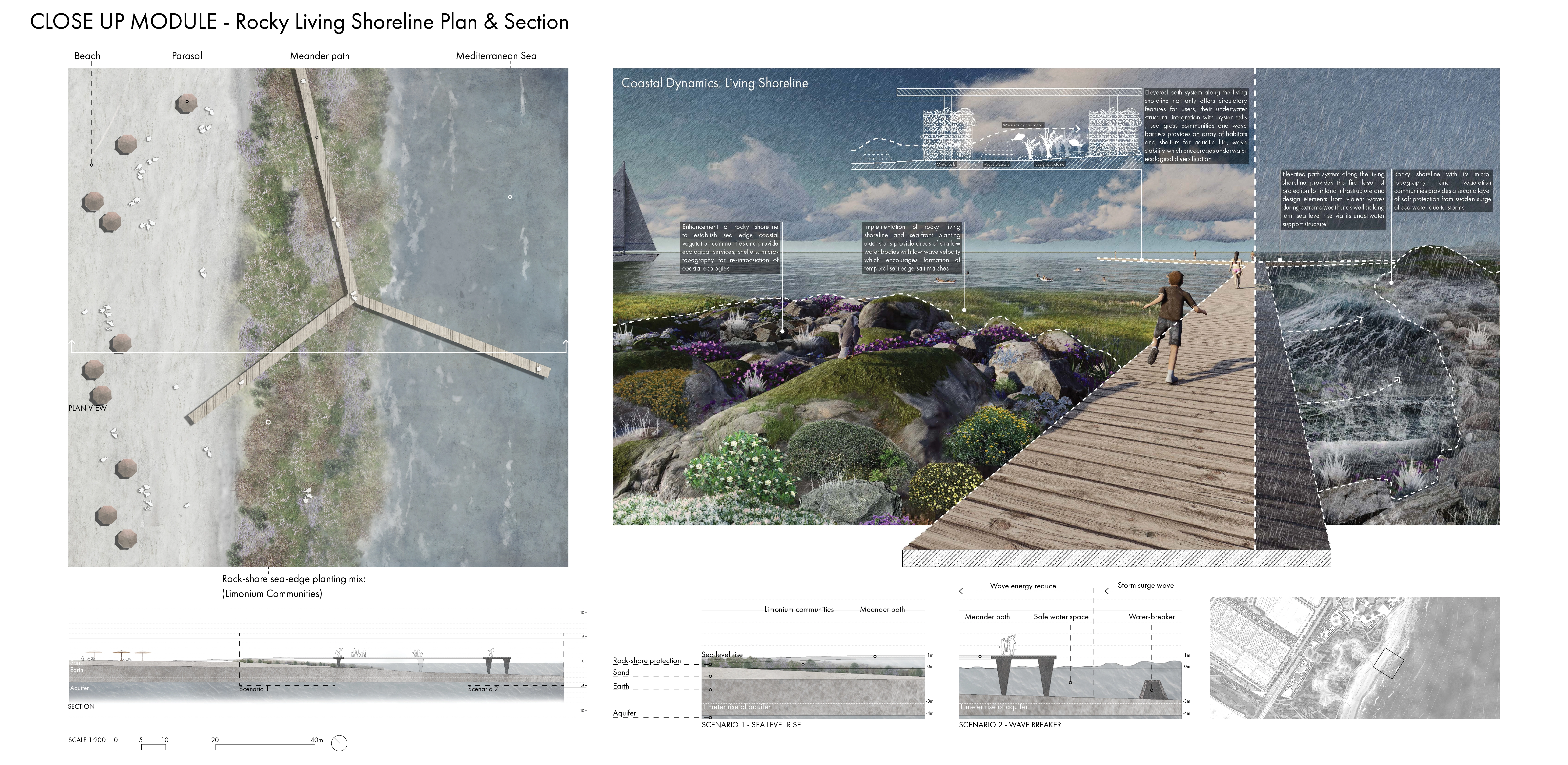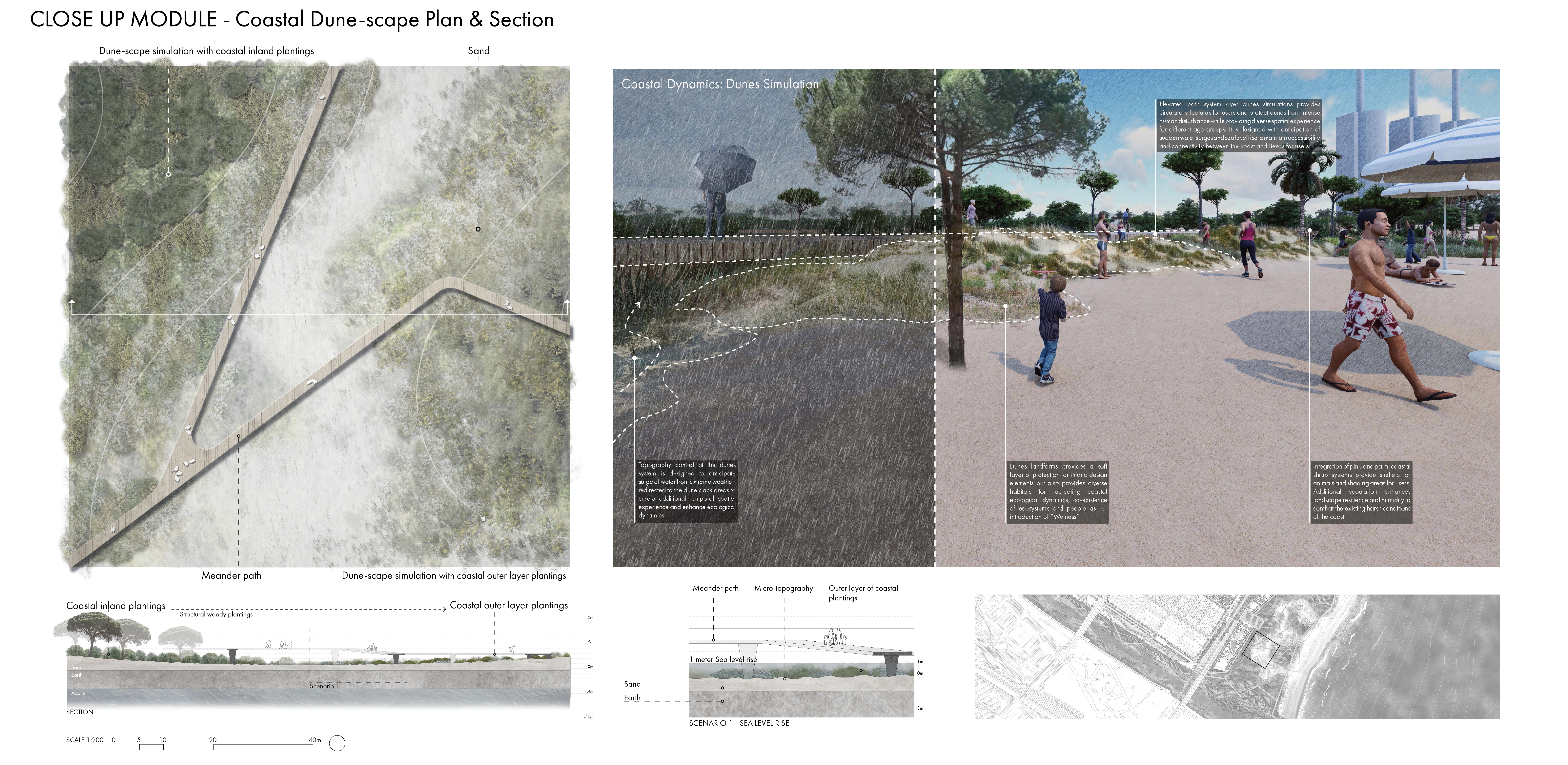 From these typologies there is a level of hierarchy in which some modules are more extensive and instrumental to the overall design of the region such as the dunes simulation, the networks of water tanks and stormwater drainage system that connects the 3 zones, river terracing and sunken plazas that has a diverse set of performative qualities serving as retention ponds but also Mediterranean rain gardens with vegetation. These became the building blocks, the assemblage of the design that begins to build resiliency with anticipation of flooding and sea level rise from climate change but also promote sustainable development that active integrates and enhances local biodiversity while at the same time provide a robust site programming that enables diversity and inclusion.