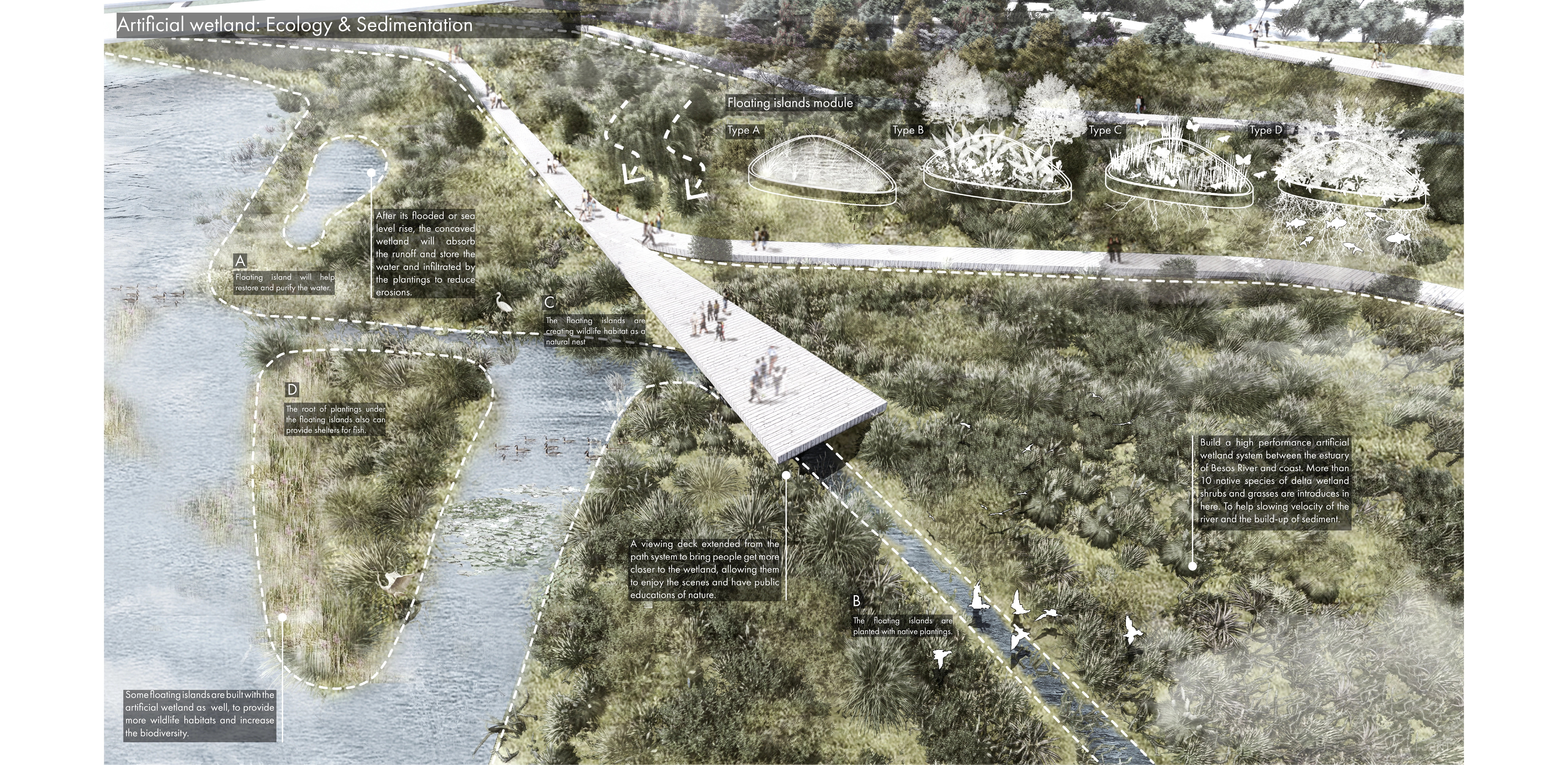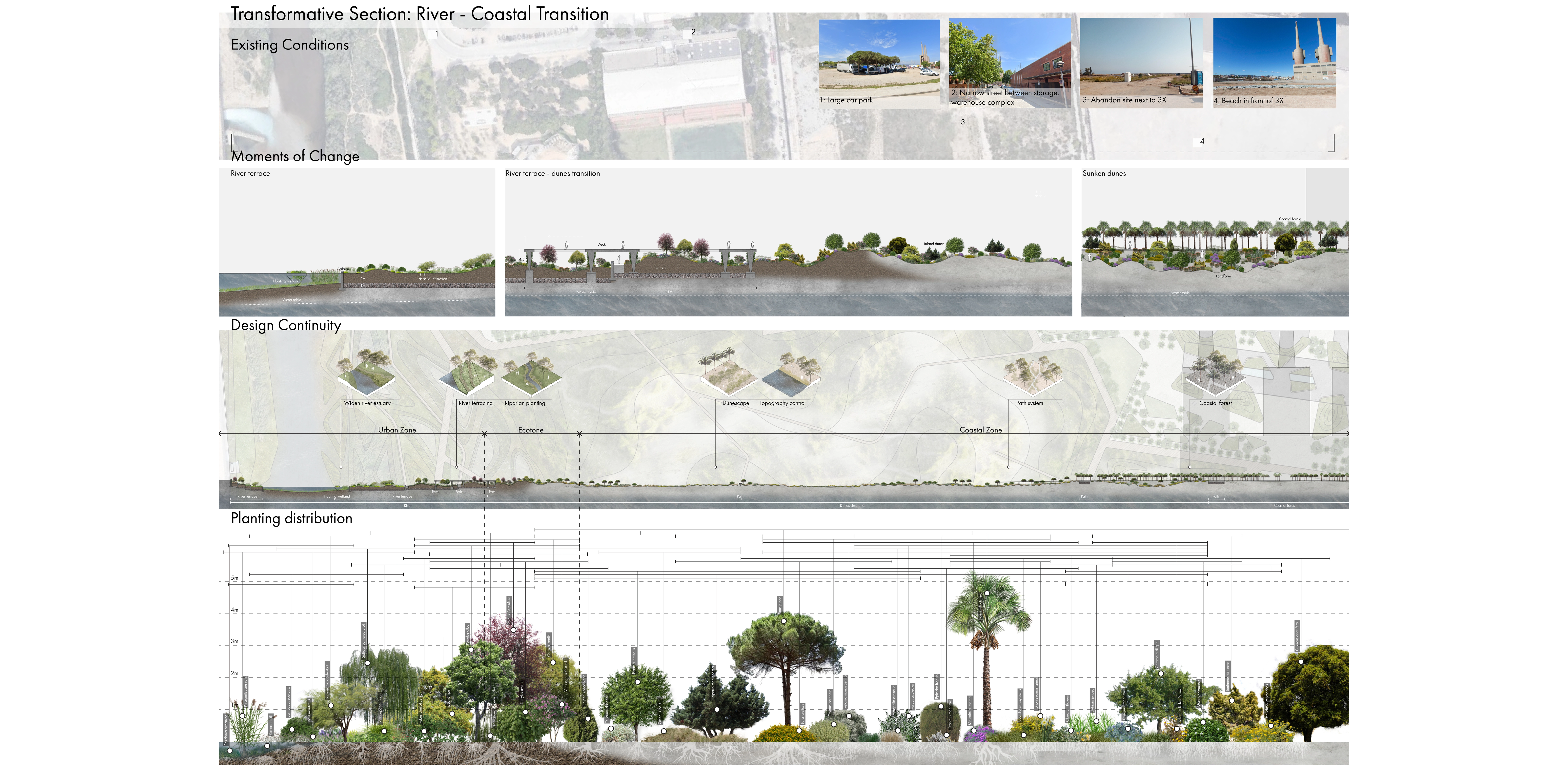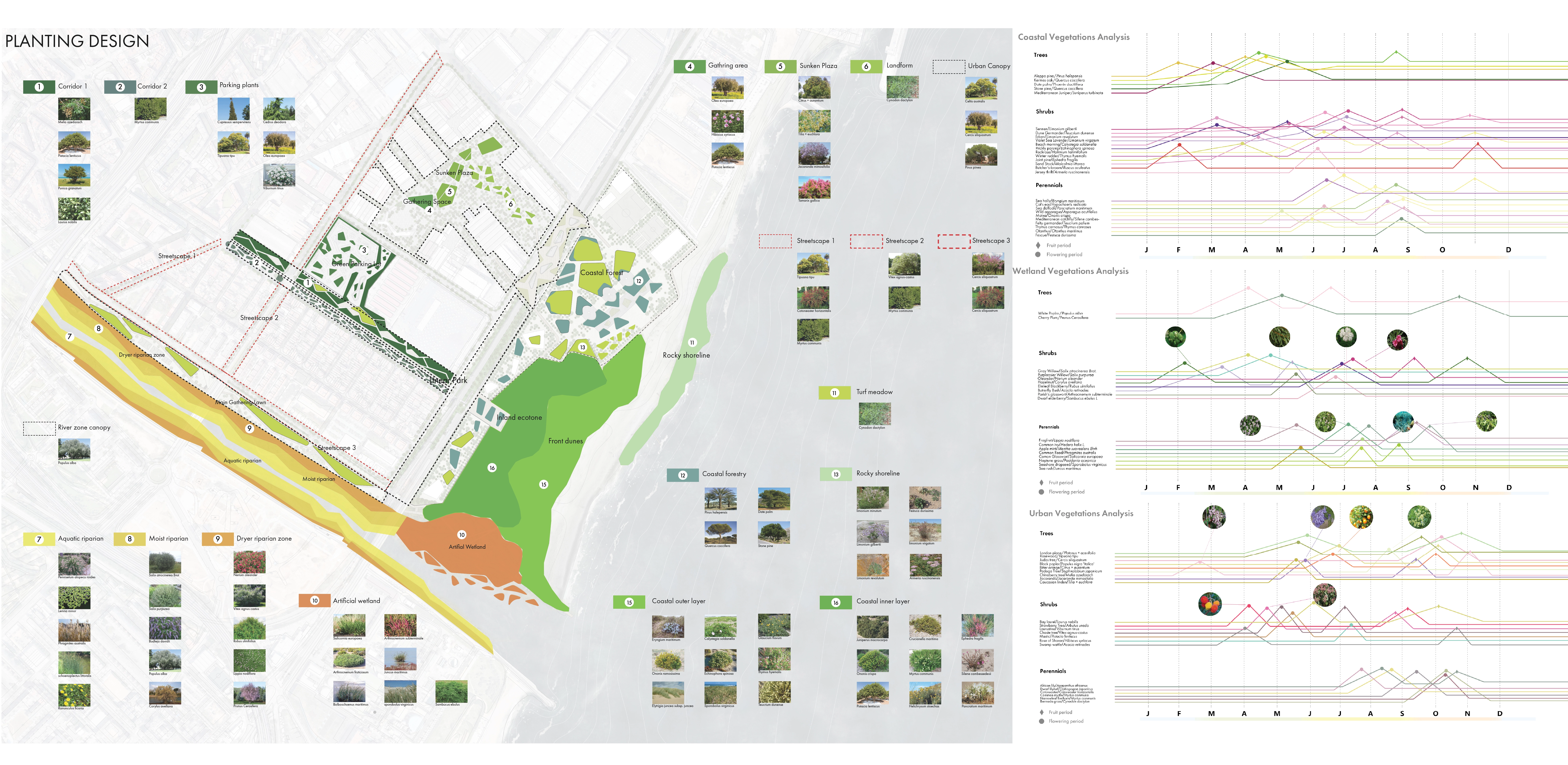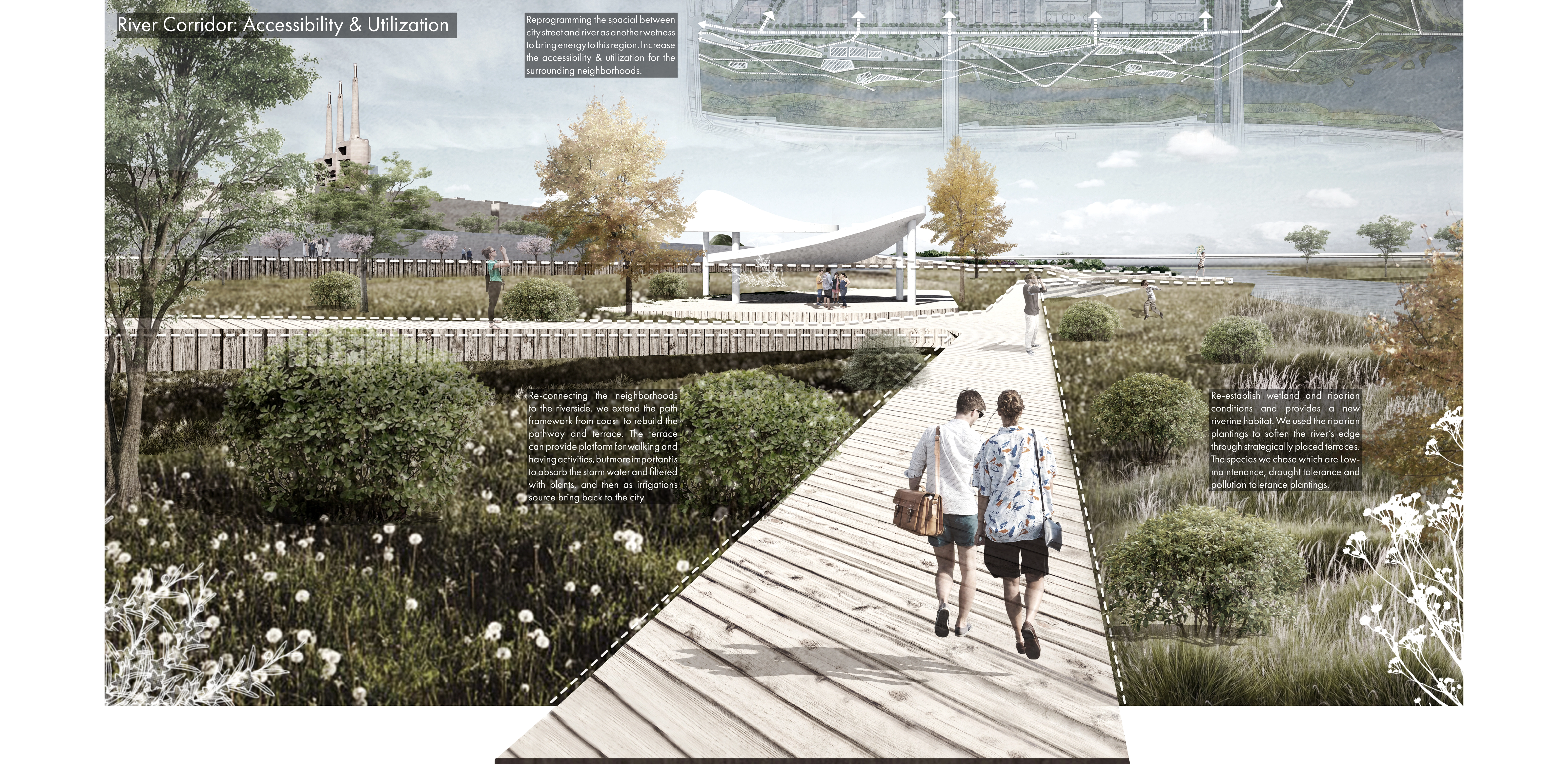 By providing a rich planting palette that relates deeply to the desirable micro-ecosystems of the coast, the river and urban landscapes, “wetness” through diversification of vegetation not only enhances local biodiversity but through the ecological services by which the abundance of native plant communities promote sustainability, they provide a much more dynamic experience that different users can encounter. This is further integrated with programs that allow high level of spatial and social interactions in order to revitalize the regional neighborhoods.