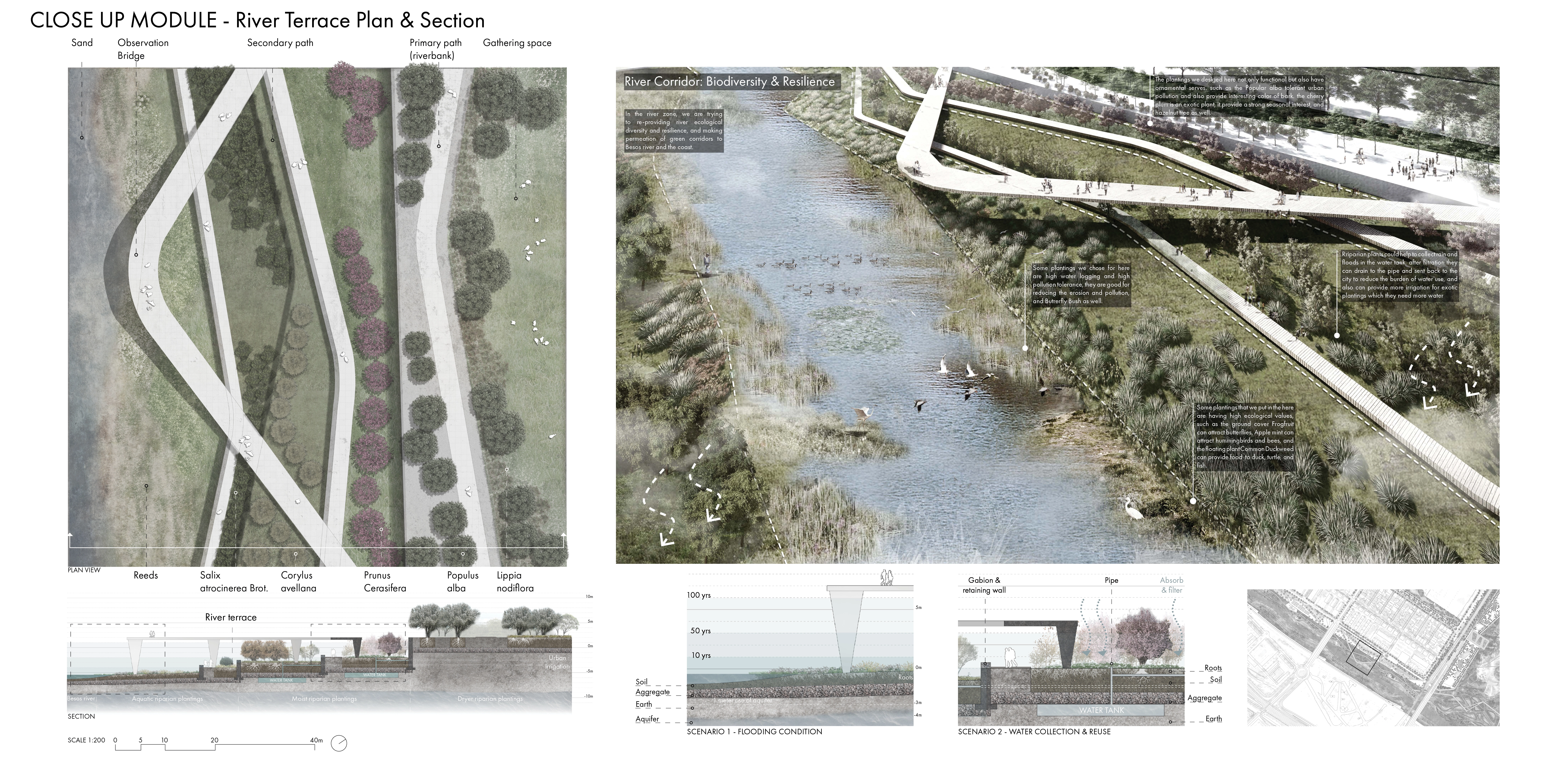 In the river zone the river terrace and artificial wetlands enhance the ecological services of the Besos river but also is designed to anticipate sudden flash floods with water tank systems and stormwater pipe networks connections that can redistribute the stormwater to feed the urban forests.