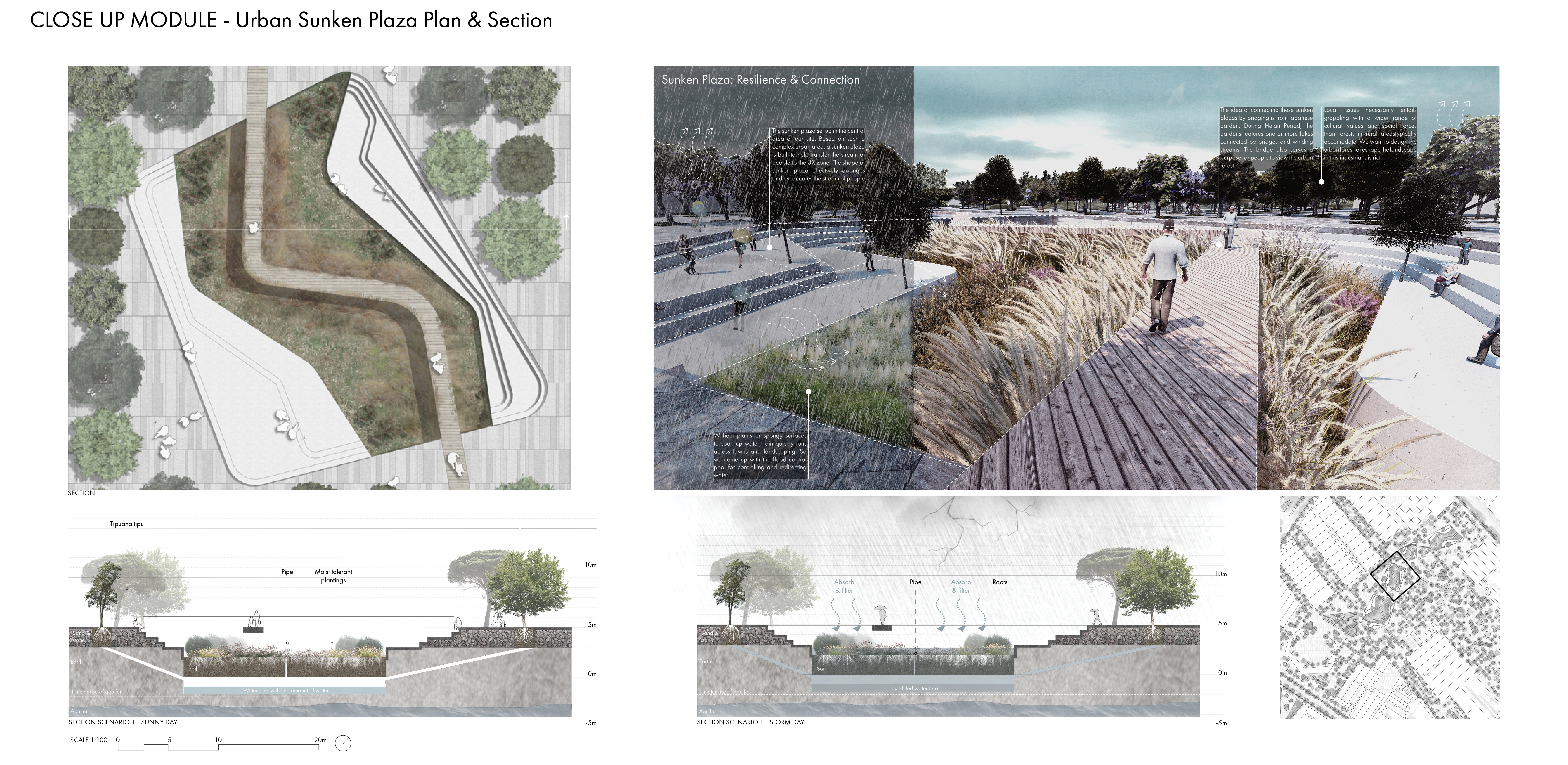 Through rich diagrammatic perspectives, the design’s versatile experiential qualities of “wetness” are visualized with a demonstration of the project’s sensitivity to time. Scenario building and projection illustrates the adaptability and resiliency of the design from floods, extreme weather to sea level rise and how strategies respond to changes as well as the opportunities for diversity and inclusion. They reflect the design’s performative, functional and experiential qualities that are flexible and constantly negotiating with the systems at play.