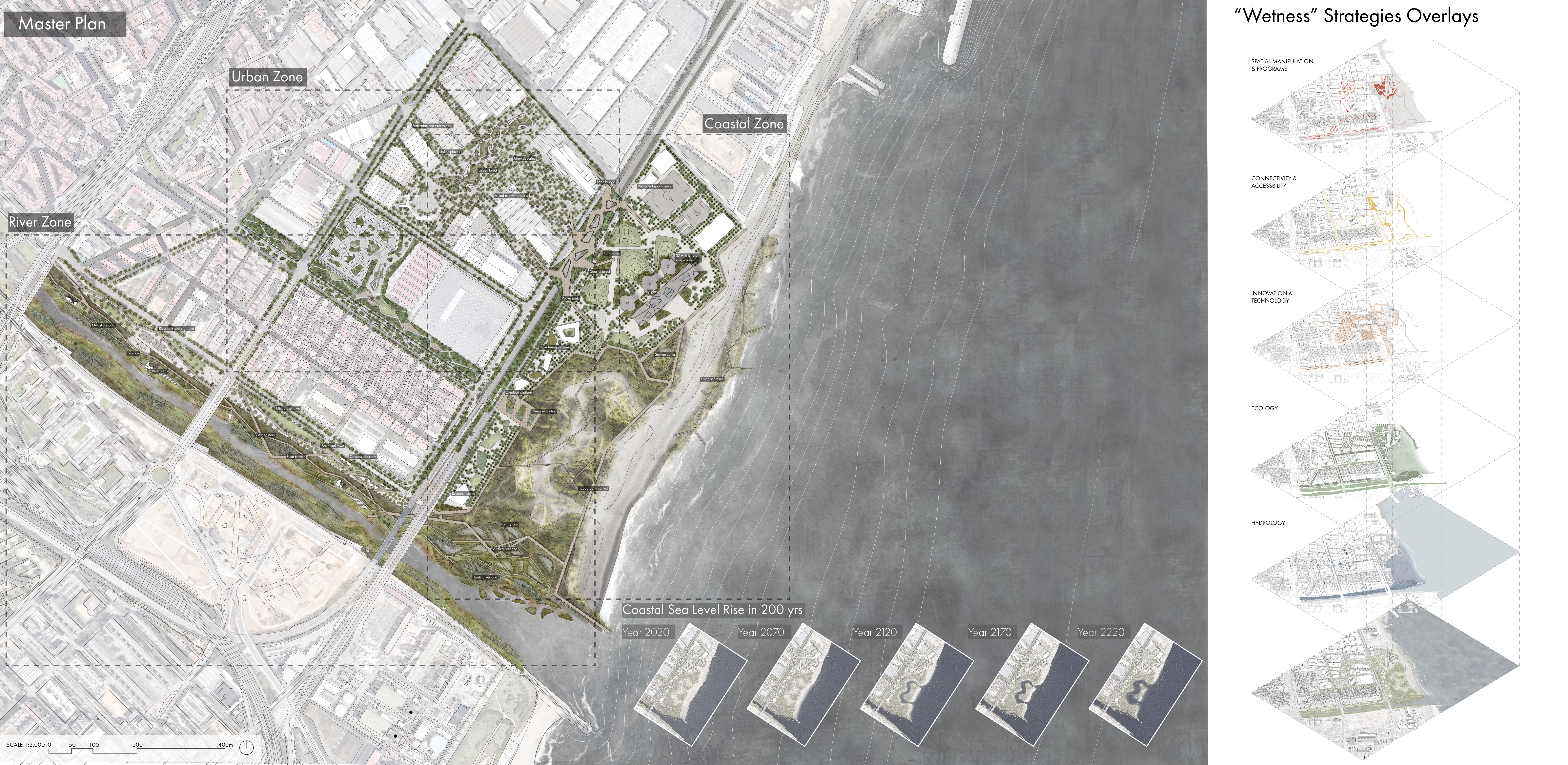 This project in its ambition to tackle complexities in the wicked problem of undesirable “dryness” that persists in Barcelona’s postindustrial waterfronts and urban fringes, aims to leverage the concept of “wetness” in its various interpretations and representations in order for reimagination of a better future by building resiliency, vitality and adaptability. Through rigorous cross-scale analytical processes to unfold the multidimensional existing qualities surrounding the site and its larger regional settings, a robust design inventory and strategy systems through typological investigation as well as articulated spatial manipulation, orientation are distilled to address issues at hand. In its essence, the design uses a diverse yet interconnected set of tools in an attempt to reach a level of comprehensivity that begins to resolve the different “dryness” in social, economic, ecological, geographical and infrastructural terms under a dynamic urban scale inclusive of a waterfront, riverscape and urban center. It is a design by inquiry, through research, realized via investigation, expanded from exploration and projection.