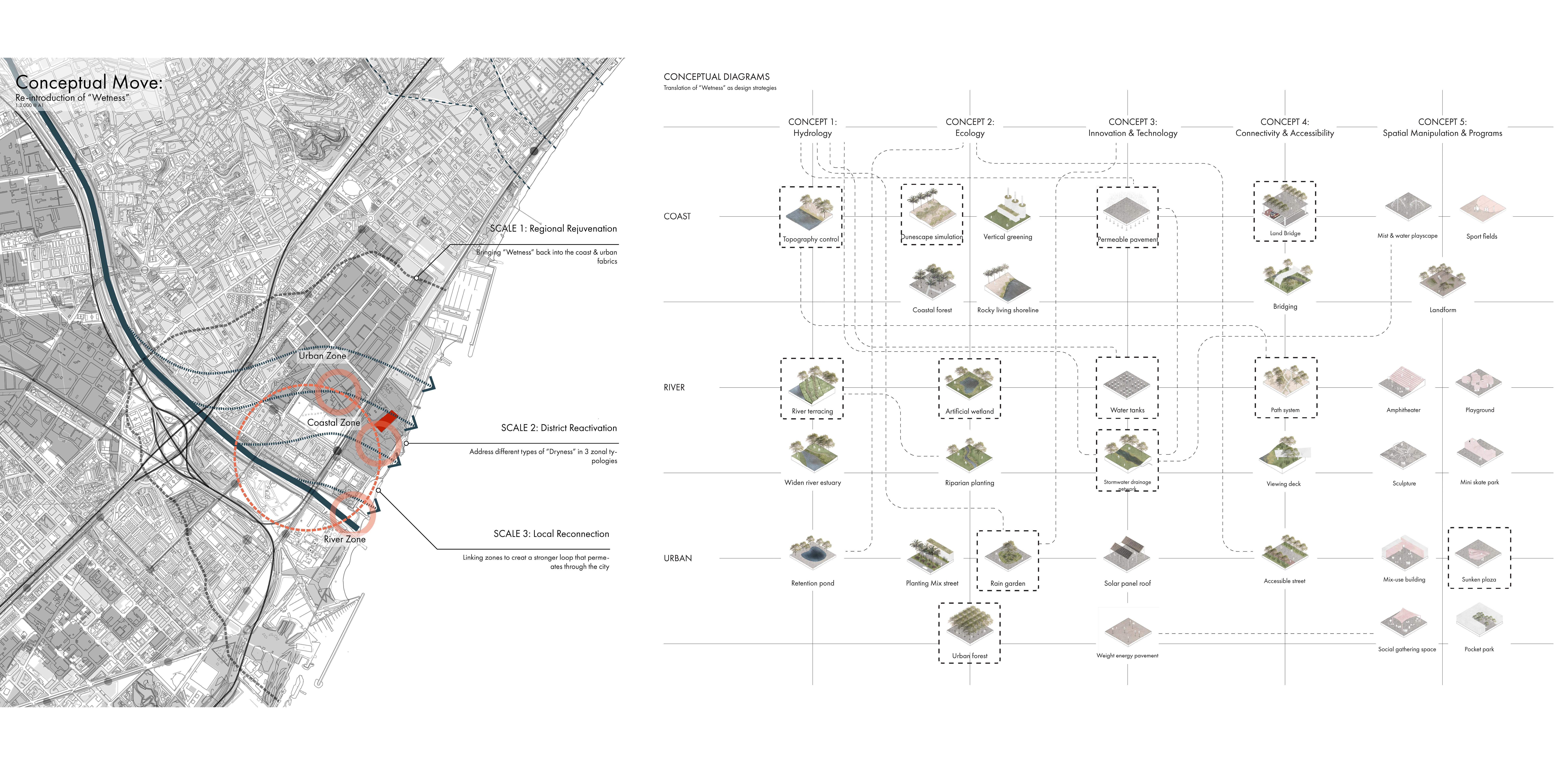 By understanding the complexity of the issue at hand, this wicked problem of “dryness” in its multi form penetrating various dimensions, we began to explore how may design interventions, a corresponding “wetness” begin to address these challenges that stretches far beyond the 3X. By looking at the re-introduction of “wetness” as our primary move across scales, from the regional scale we identified 3 major zonal typologies, the coast, the river and urban fabric to imagine transformations that reconnects these zones to rejuvenate the larger neighborhood. This was further detailed in spatial extent and we started brainstorming some particular interventions to address the different forms of dryness, from urban forests to dunes simulation and river terracing. After these initial design processes, systems of strategies were drawn out that would become our design inventories for a holistic and comprehensive approach to address the different types of “dryness”. 5 strategies of “wetness” are classified with some address literal dryness while others on implicit, metaphorical dryness such as the social dryness.