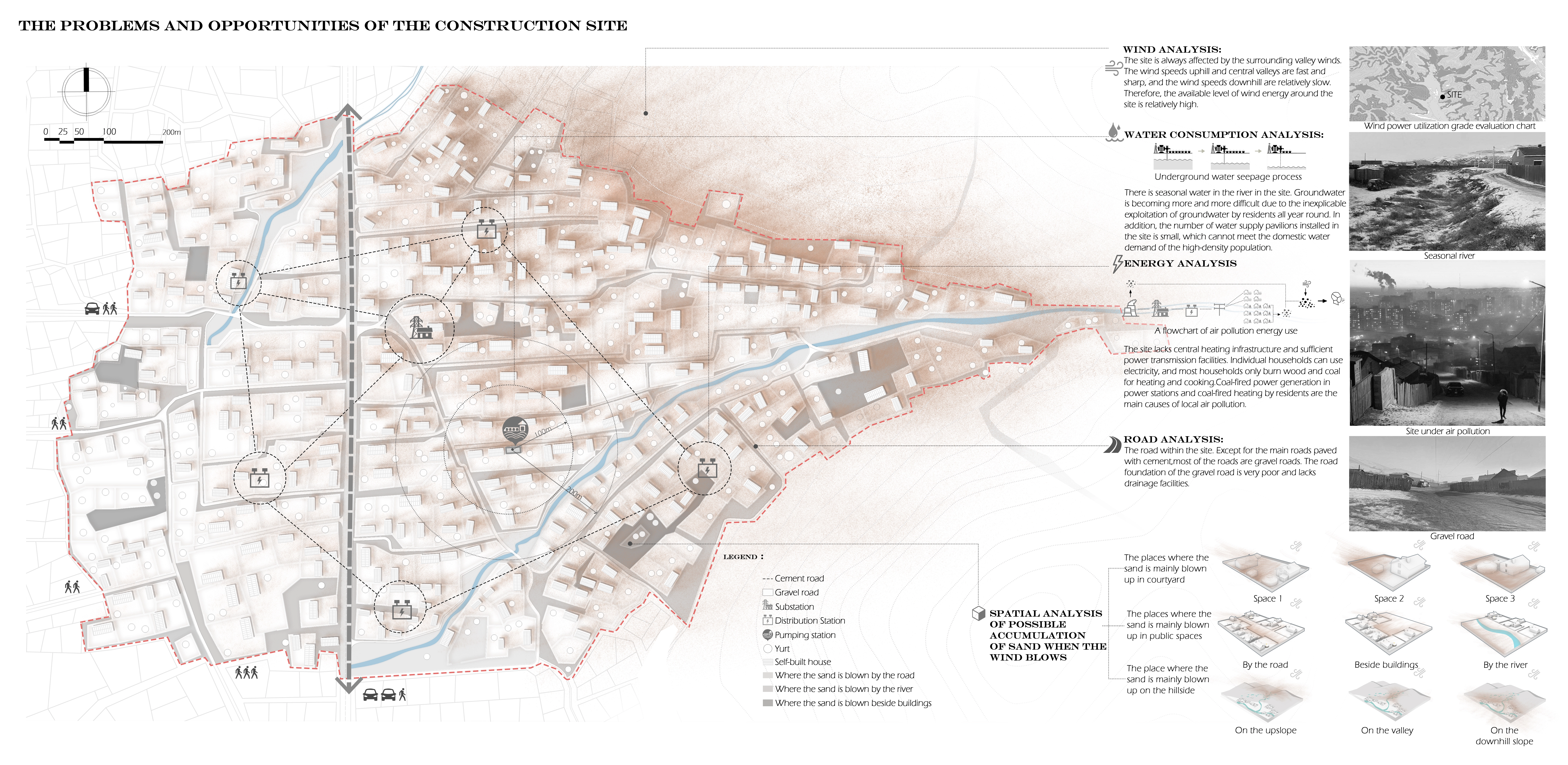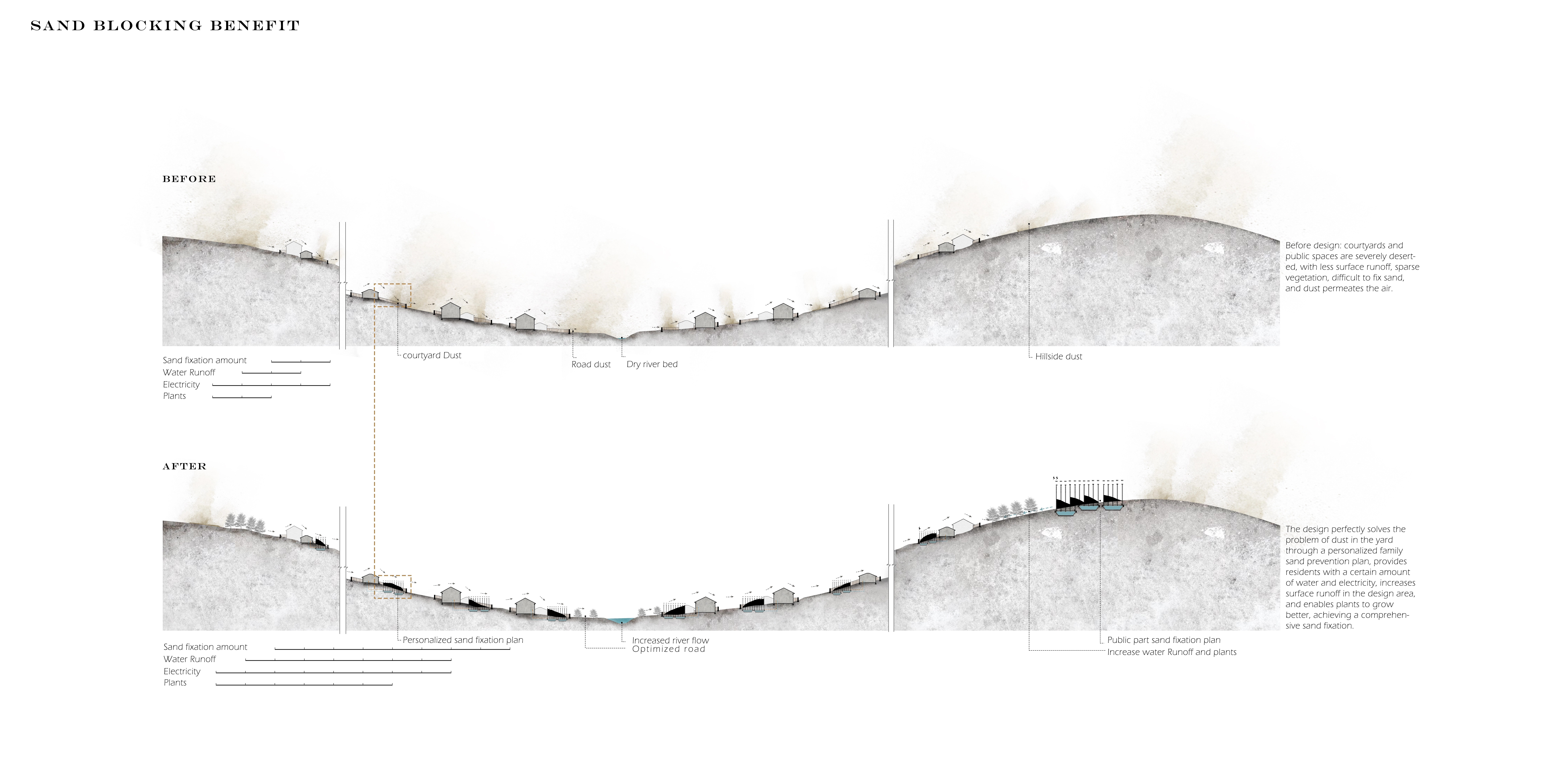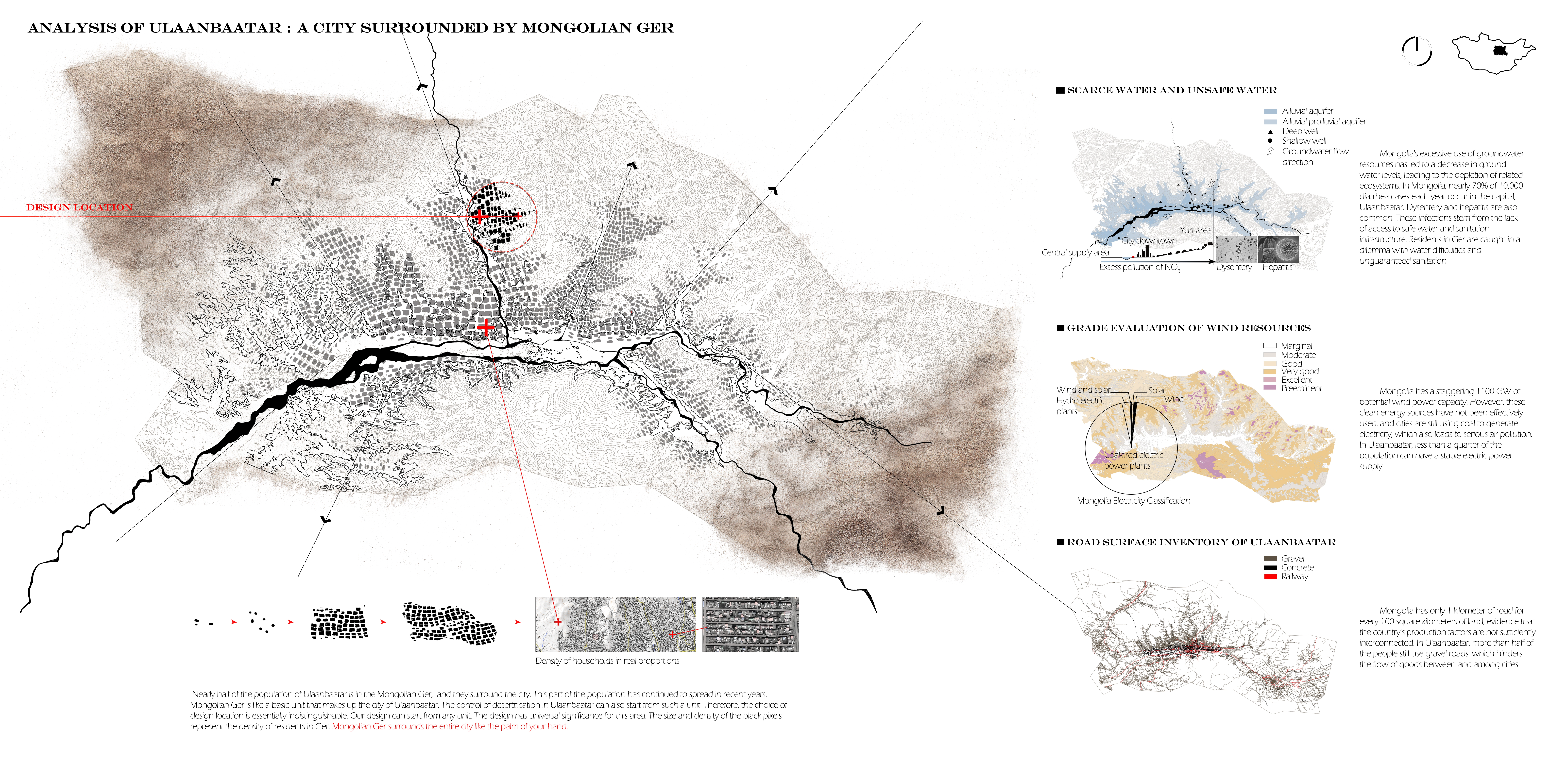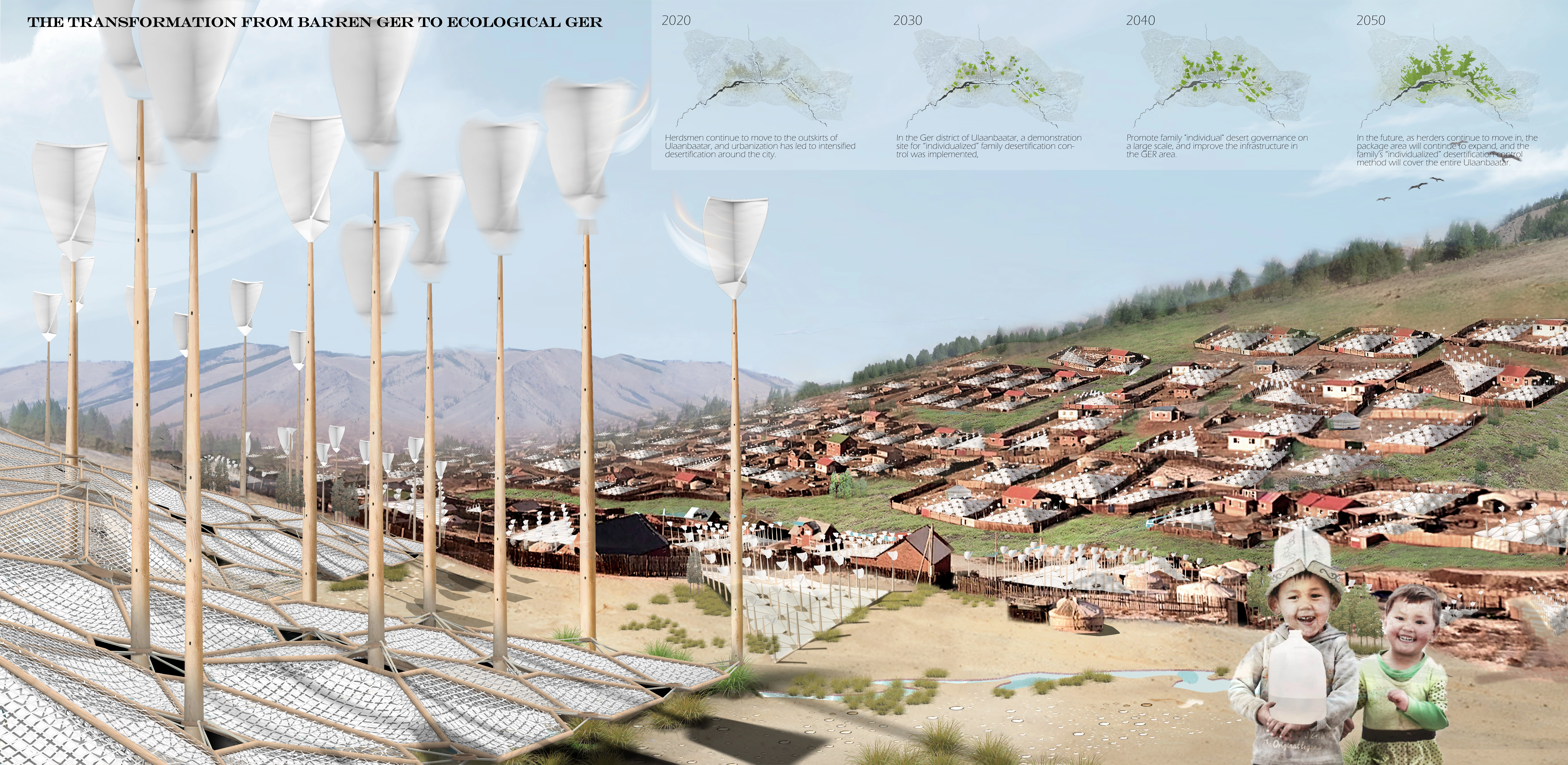 Family Sand Control: The Ger district is an urban settlement with nomadic characteristics. It is not restricted by the terrain. It is a large-scale gathering area composed of fenced courtyards. The infrastructure in this area is very poor. Residents cannot get guaranteed electricity and water. Coal-fired heating has caused serious air pollution. Excessive use of groundwater resources has led to a continuous decline in water levels and aggravated desertification around the city. All these have exacerbated the gap between the rich and the poor in the Ger district and the urban area of Ulaanbaatar. It is imperative to prevent desertification. Under sand control, every family has its own different needs and lifestyles. We are trying to use families in the Ger district as a unit to transform the “government control of sands” into “family control of sands”. Seek a personalized desert control plan. While combating desertification, it also eases social and economic contradictions.