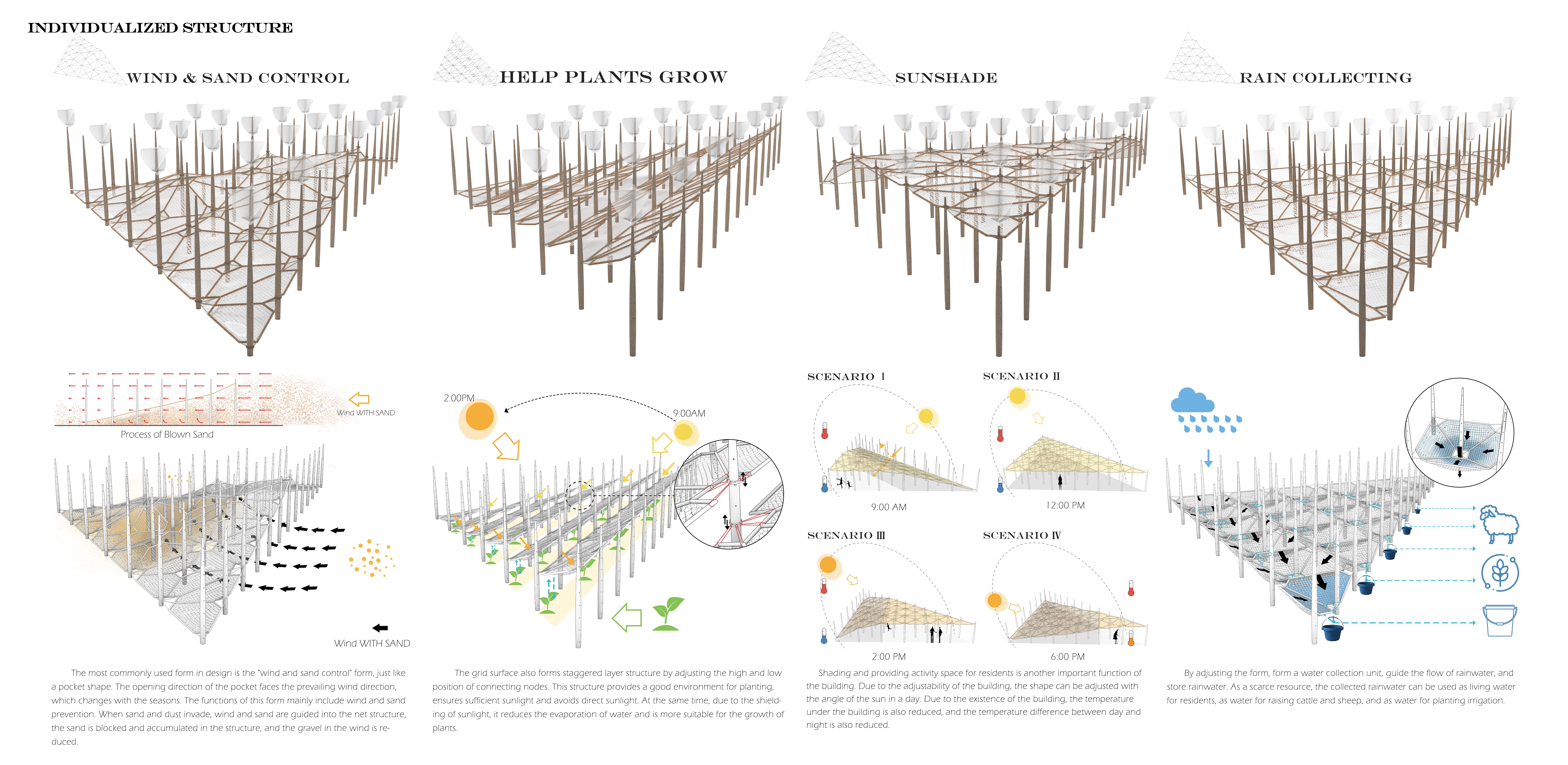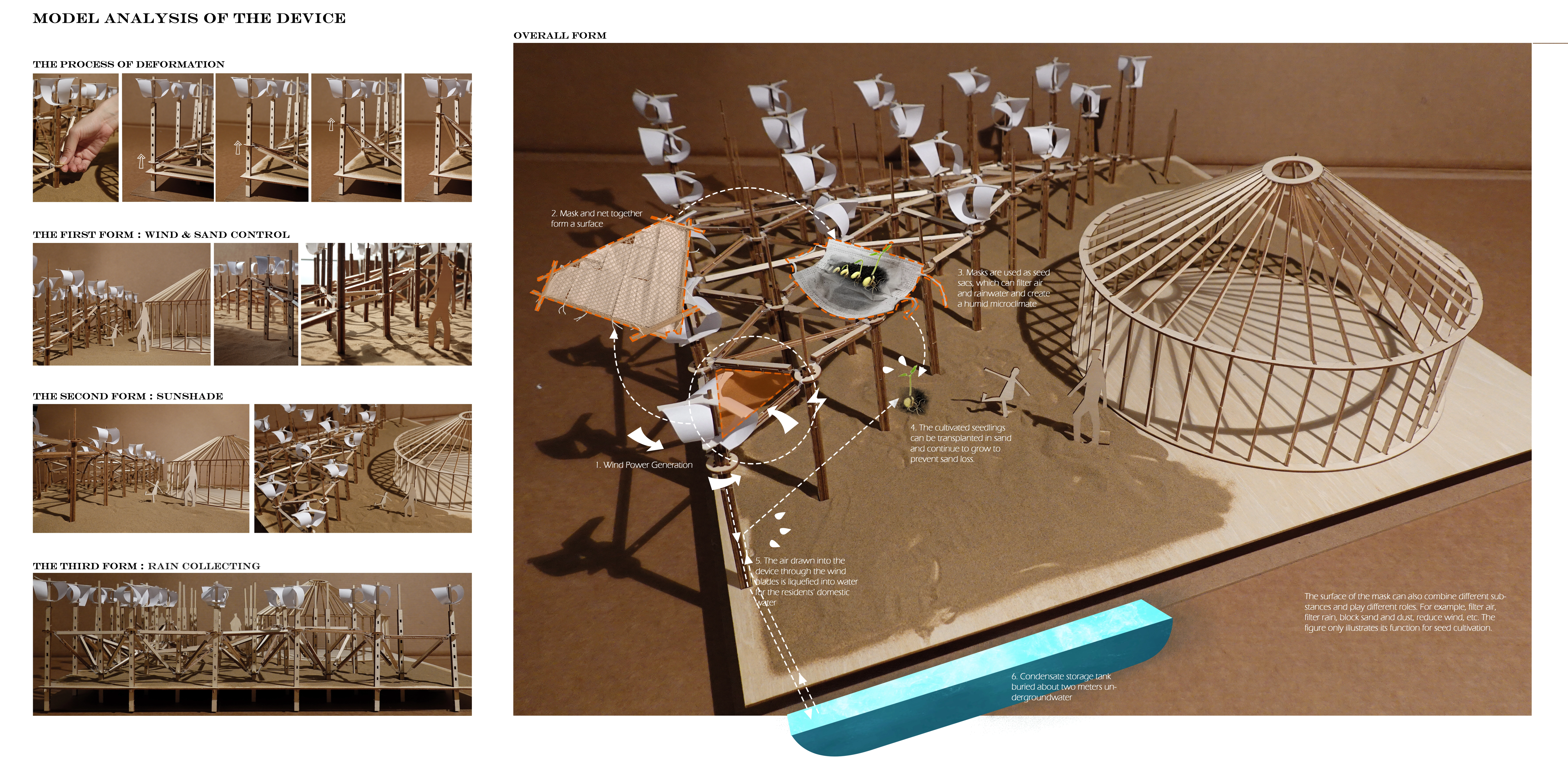 The third type: the personalization of the structure The variable structure provides four basic forms for family sand control. The first form is used to catch sand; the second form is used for shading and provides space for rest; the third form is used to guide sunlight and promote plant growth ; The fourth form is used to collect and filter rainwater. According to the habits of the family, the device can also be created in different forms.