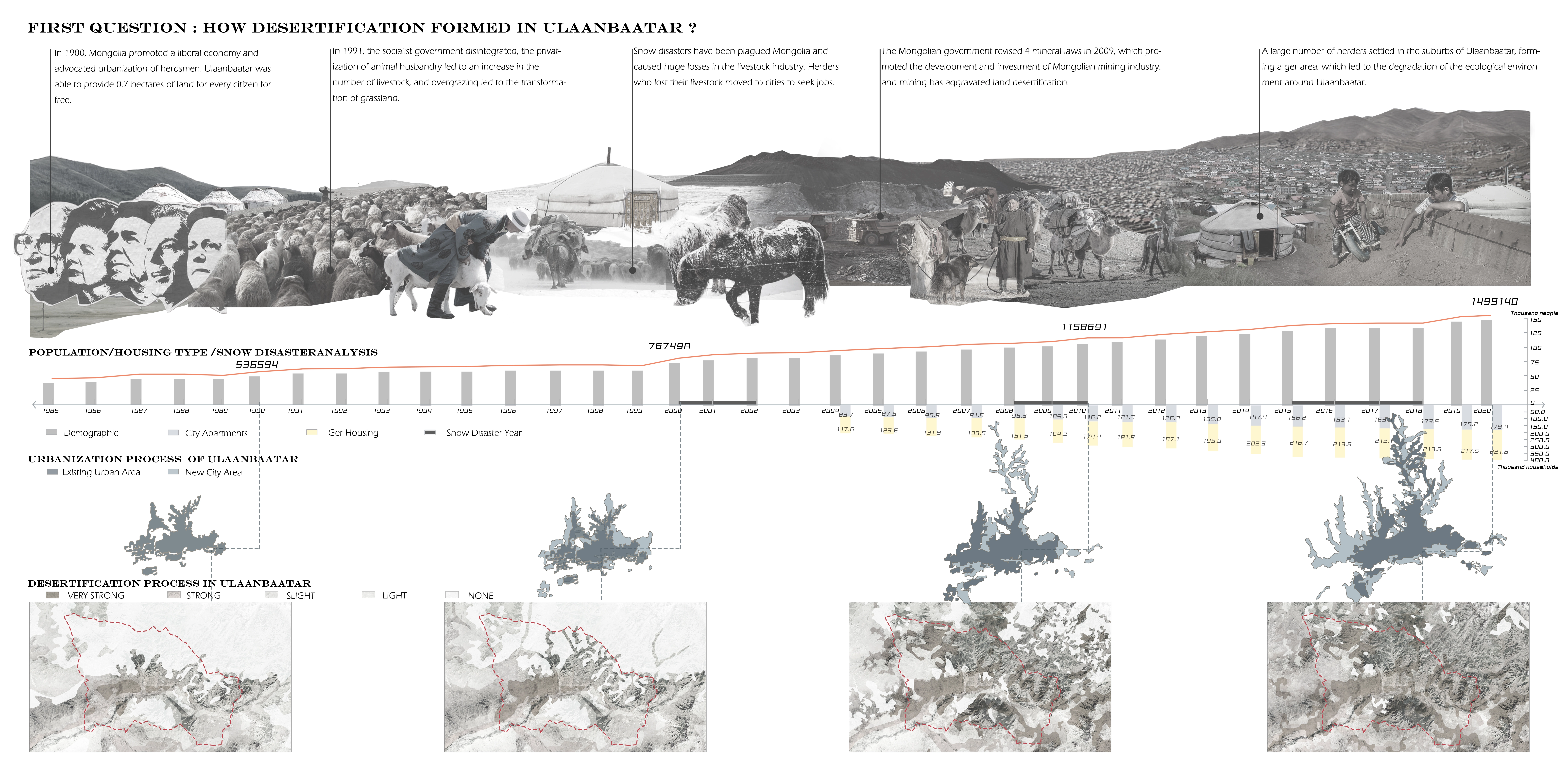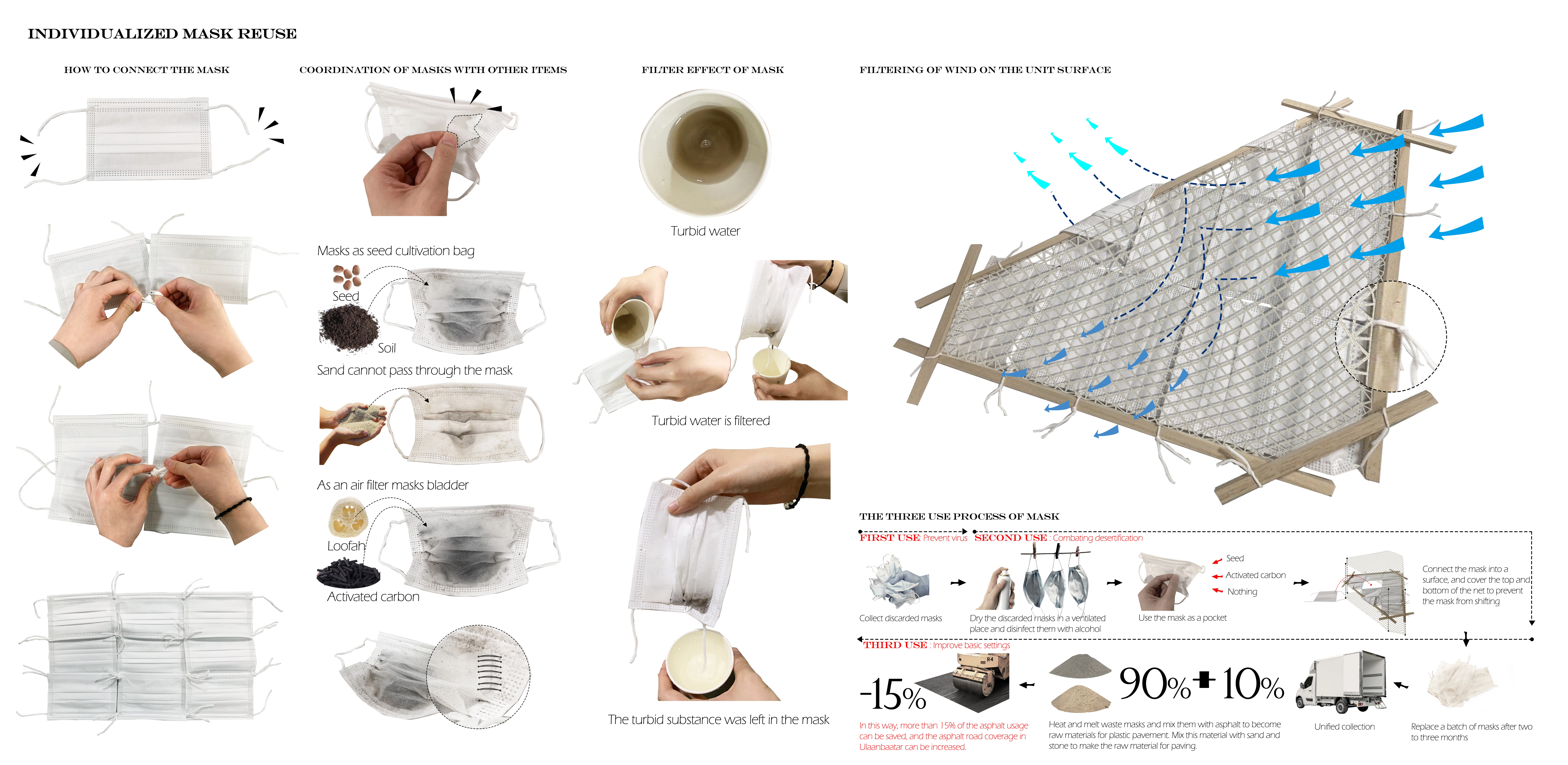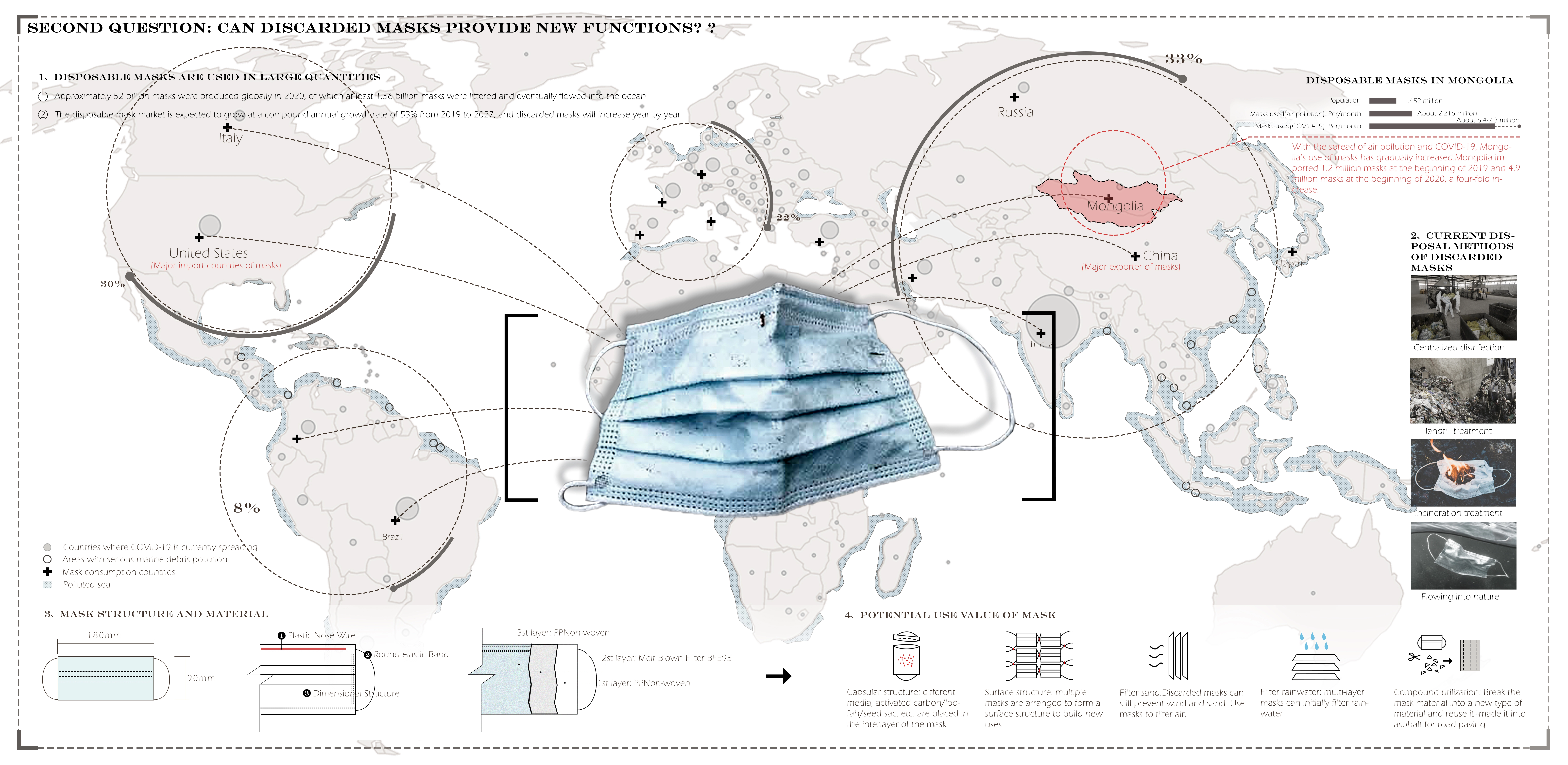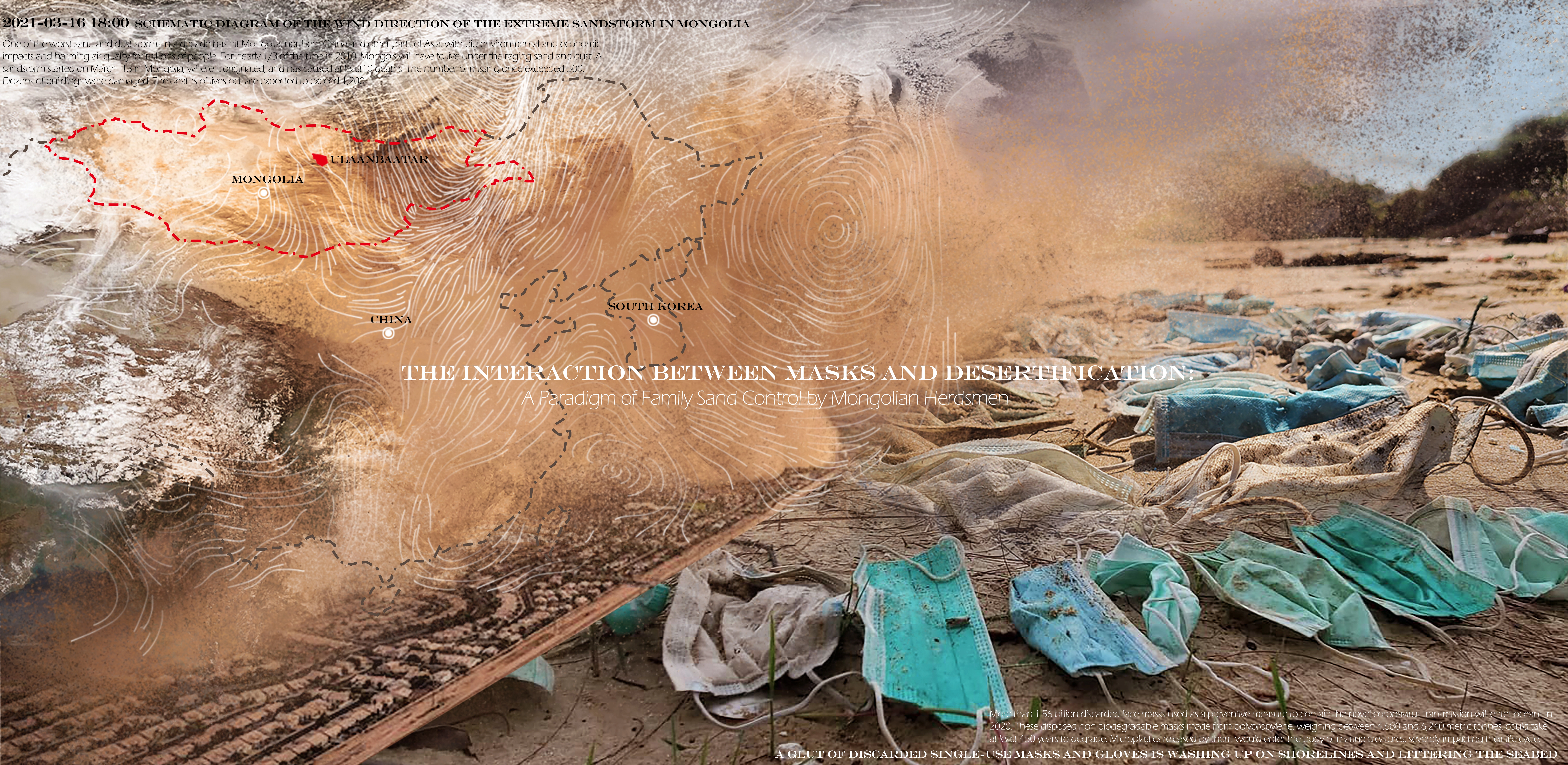 Background and vision: In recent years, extreme dust storms have occurred frequently in Mongolia, causing serious loss of life and property, and having a huge impact on neighboring countries such as China, Japan, South Korea, and North Korea. In 1900, Mongolia promoted a neo-liberal economy and herders could settle freely. Ulaanbaatar provided 0.07 hectares of resettlement land for herdsmen. Subsequently, the socialist collective economy was disintegrated, and the privatization policy promoted the urbanization of herders. The privatization policy of animal husbandry led to overgrazing, and herders’ resistance to natural disasters such as desertification of pastures and snow disasters was reduced. Going to the city to seek job opportunities, and forming a settlement area for herdsmen-Ger district around Ulaanbaatar. Almost half of Ulaanbaatar citizens live in Ger district. The settlement of herders intensified the desertification of the site, and the deterioration of the Mongolian environment in turn prompted a large number of herders to move to Ulaanbaatar, forming a vicious circle. In 2019, the COVID-19 epidemic raged around the world, causing a historic blow to humans. Tens of billions of disposable surgical masks were produced and put into use and were discarded. The randomly discarded masks pose a serious threat to the lives of animals in the natural environment. .