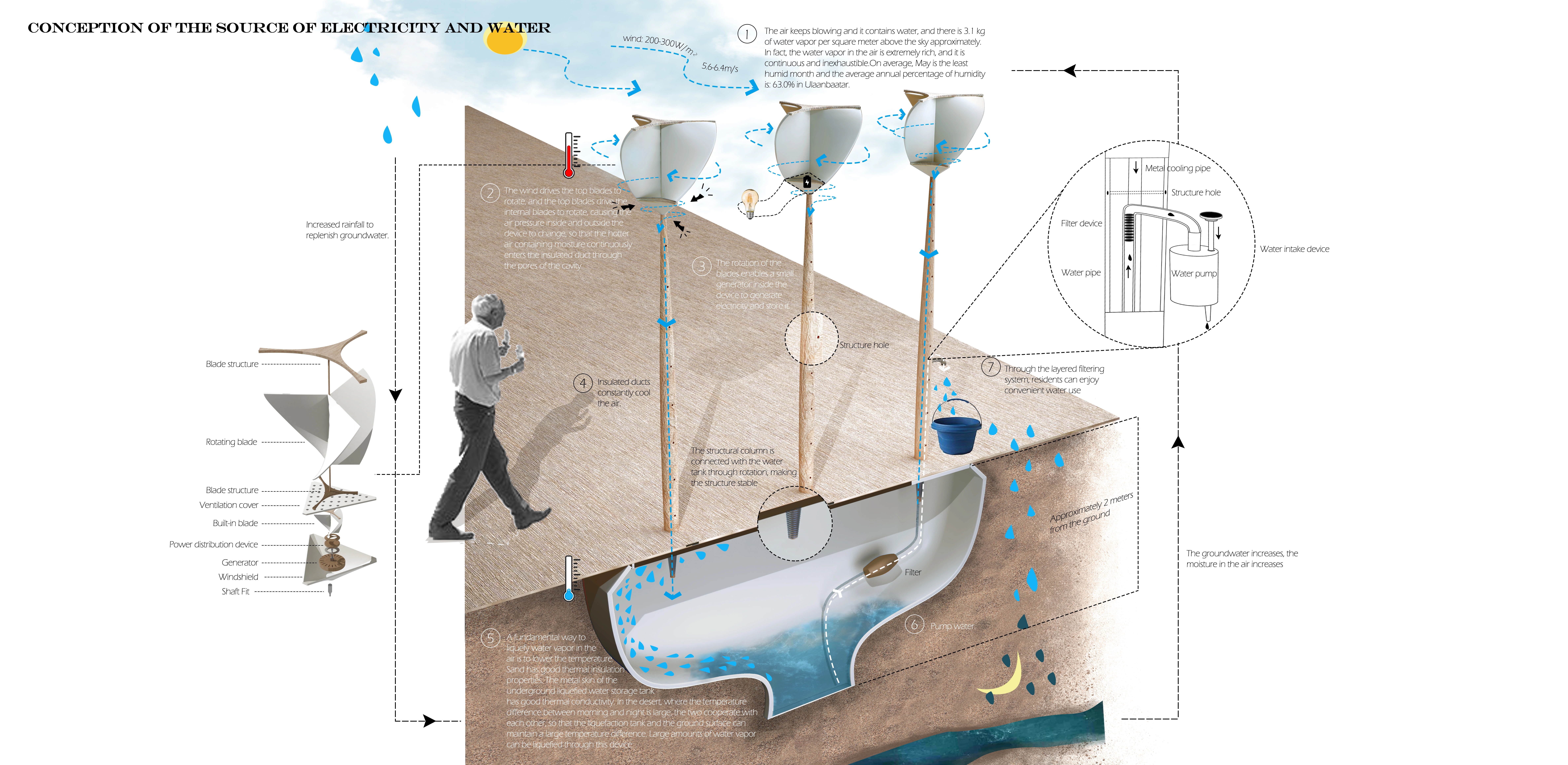 Three personalized sand control methods: The first type: personalization of water and electricity Ulaanbaatar's excellent wind energy resources are used to generate electricity, the airflow generated by the rotation of the blades is drawn into the equipment, and the gaseous water in the air is liquefied into liquid water by using the temperature difference. Naturally, sand has excellent thermal insulation properties, combined with the excellent thermal conductivity of metals, so that the inner wall of the underground water storage equipment maintains a large temperature difference with the ground for a long time, and the flowing air can be continuously liquefied into water droplets. In summer, it is a concentrated period of water storage, and in winter, the underground can also maintain a higher temperature, and the water does not need to freeze. Electricity generated by wind energy can reduce household demand for coal and improve air quality. The water produced by the equipment can reduce the consumption of groundwater and slow down the desertification process from the root cause.