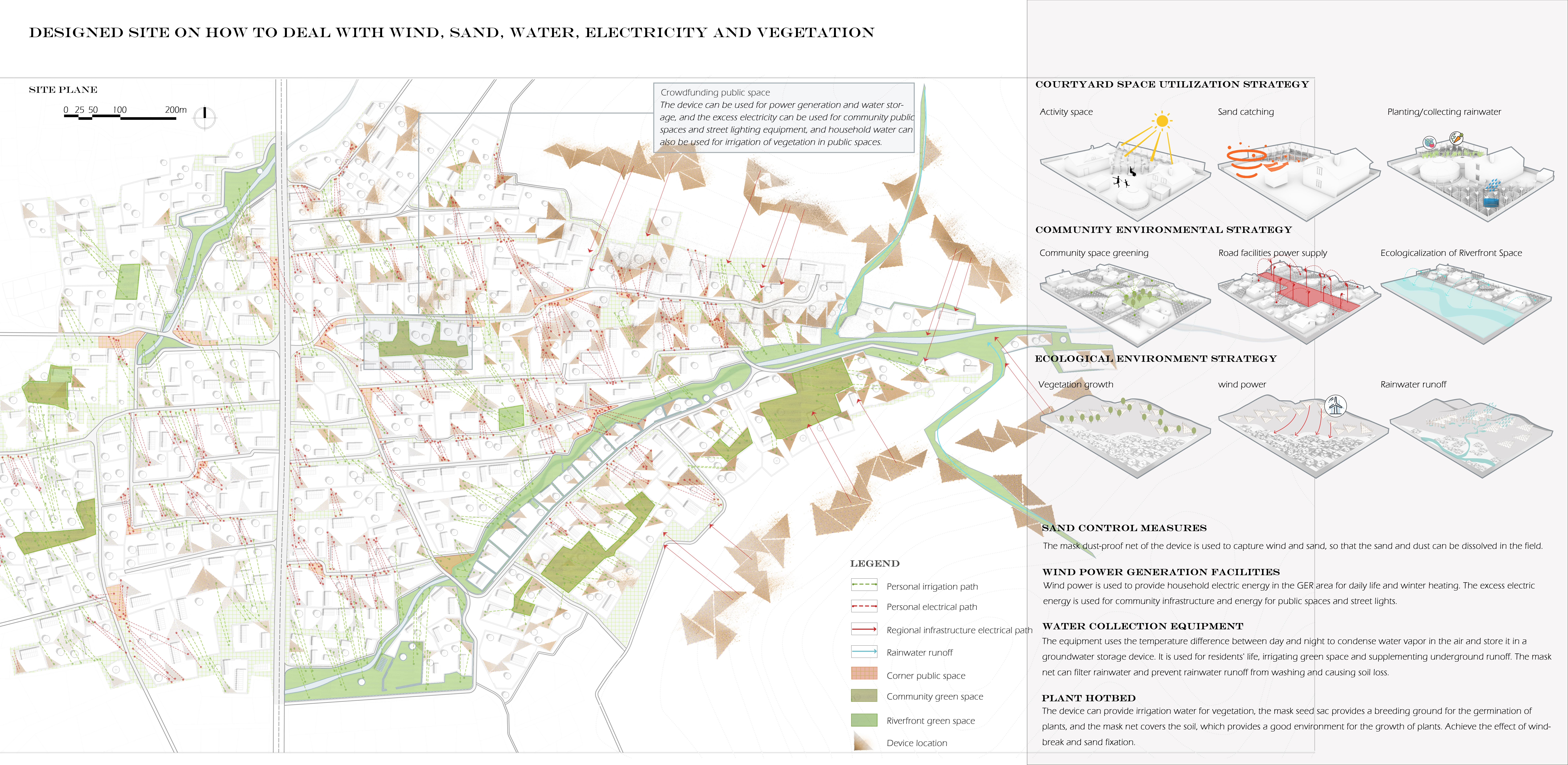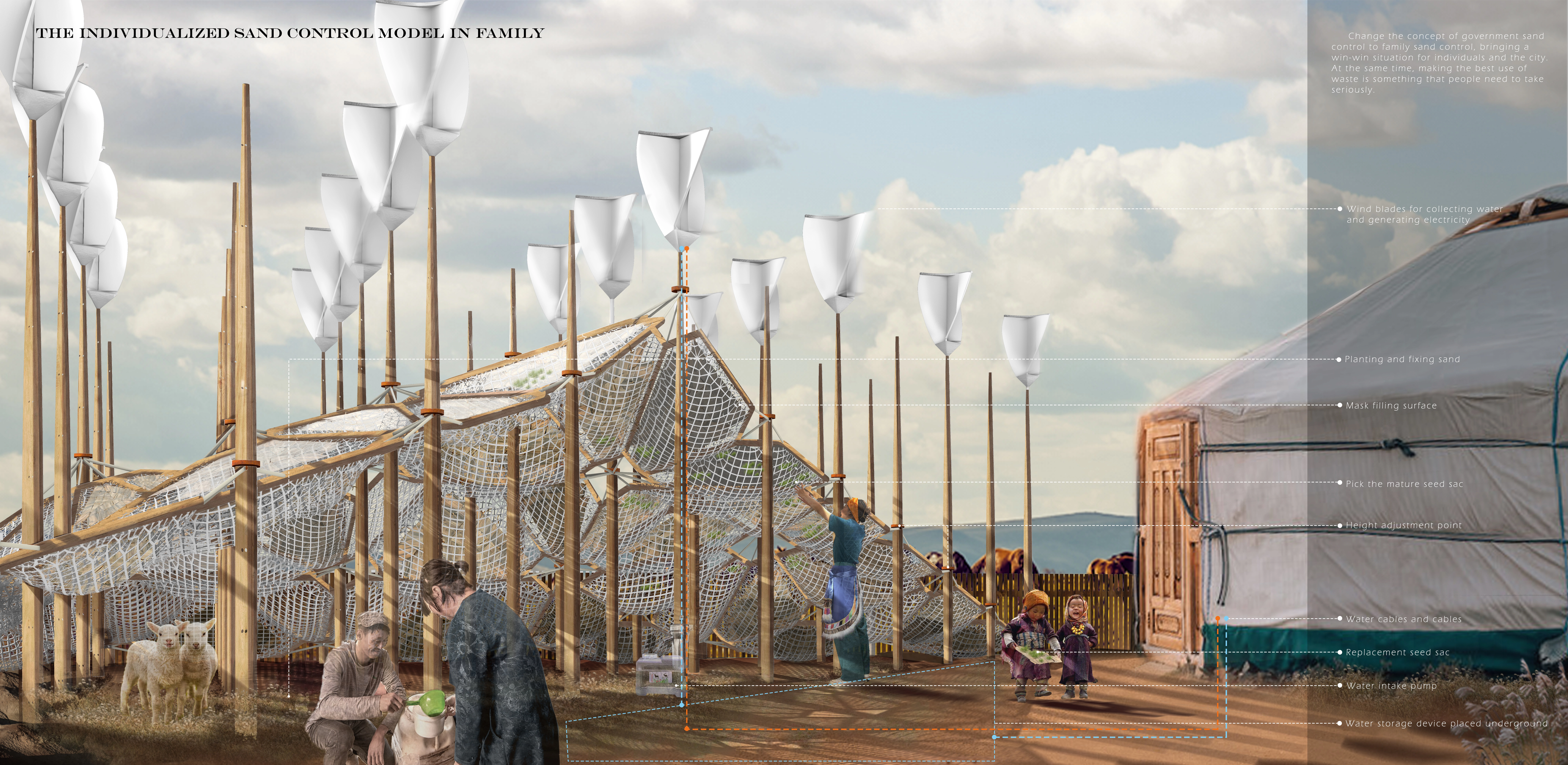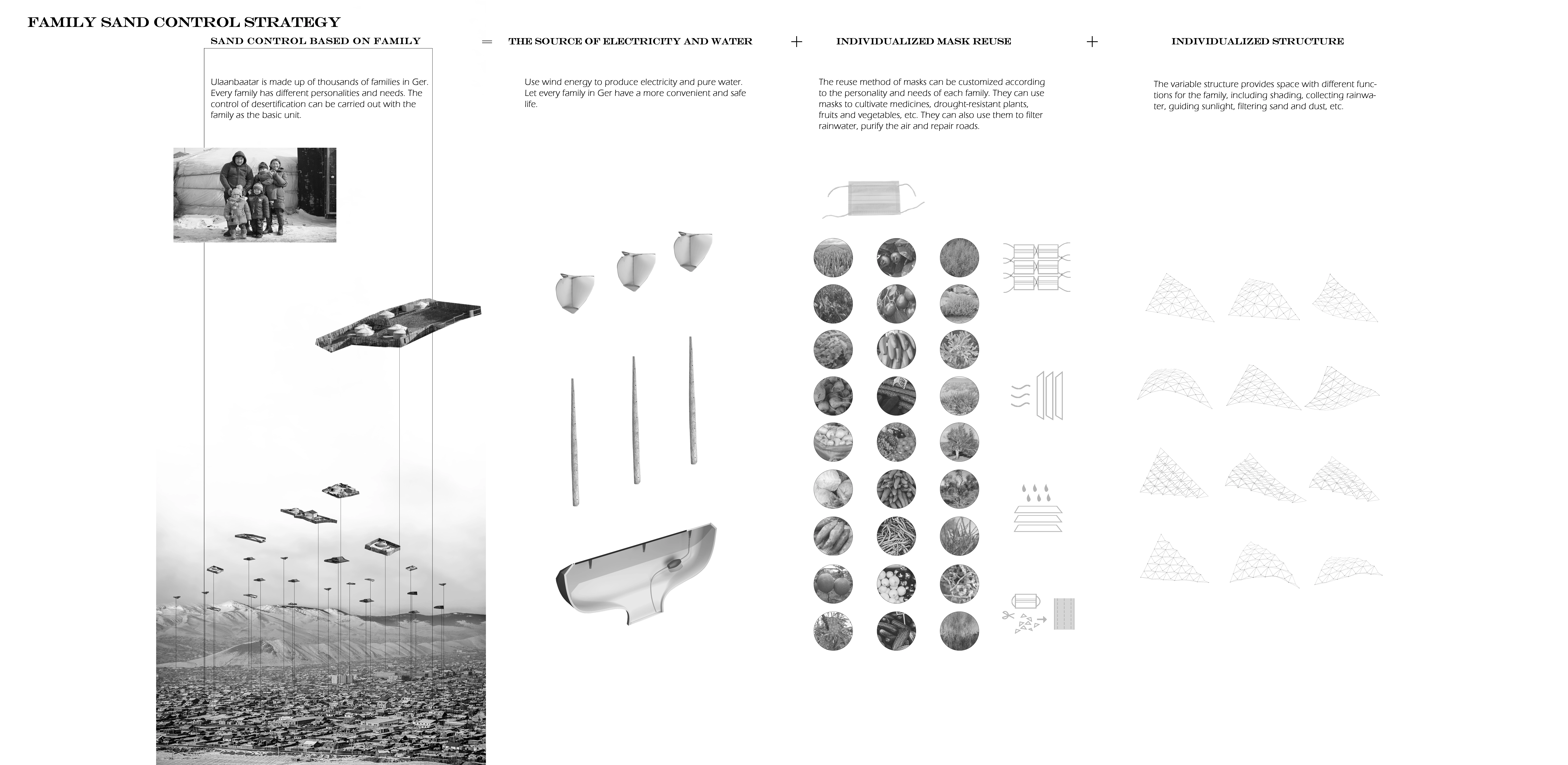 Our design location is Ger in Ulaanbaatar. A large number of herders gathered around Ulaanbaatar, which intensified the desertification of the city and caused socio-economic, health and environmental problems. In 2019, the COVID-19 epidemic raged, and a large number of discarded masks caused serious pollution. We explore ways to apply discarded masks to desertification control. The three parts of personalized water and electricity supply, personalized mask reuse, and personalized change structure constitute the family sand control plan. It is hoped that through this design, Mongolia’s “government control of desertification” will be transformed into “family control of desertification”. At the same time, by tapping the performance of masks, we call on the society to make full use of items instead of blindly discarding them.