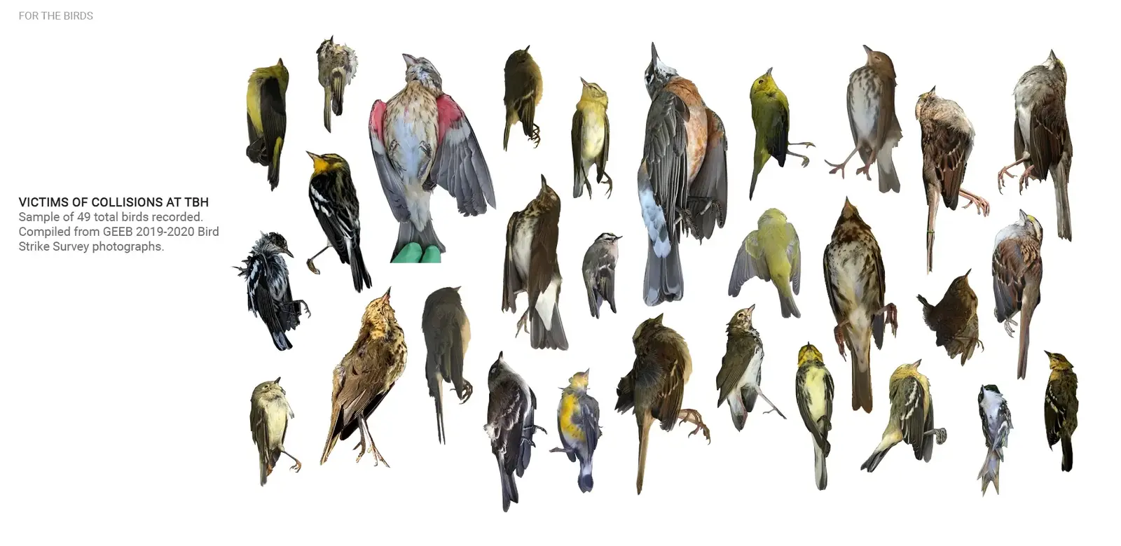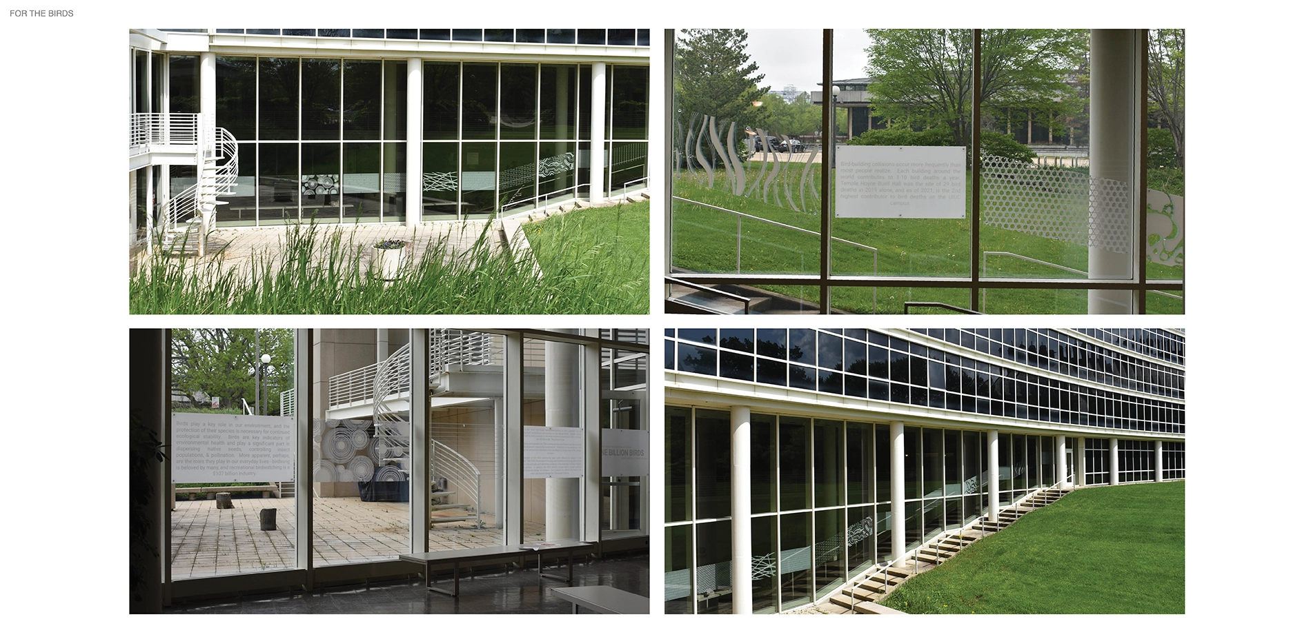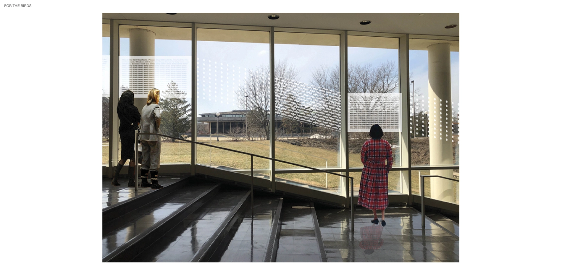 For The Birds is the culmination of a year-long independent study exploring the relationship between buildings, landscape, and bird collisions. Approximately one billion birds die globally each year due to collisions with buildings a result of extensive glass facades, confusing interior and exterior lighting, and foliage that attracts them toward windows. Design has played a key role in this, as the human desire for aesthetics often takes precedence over the safety of local and migratory birds.
