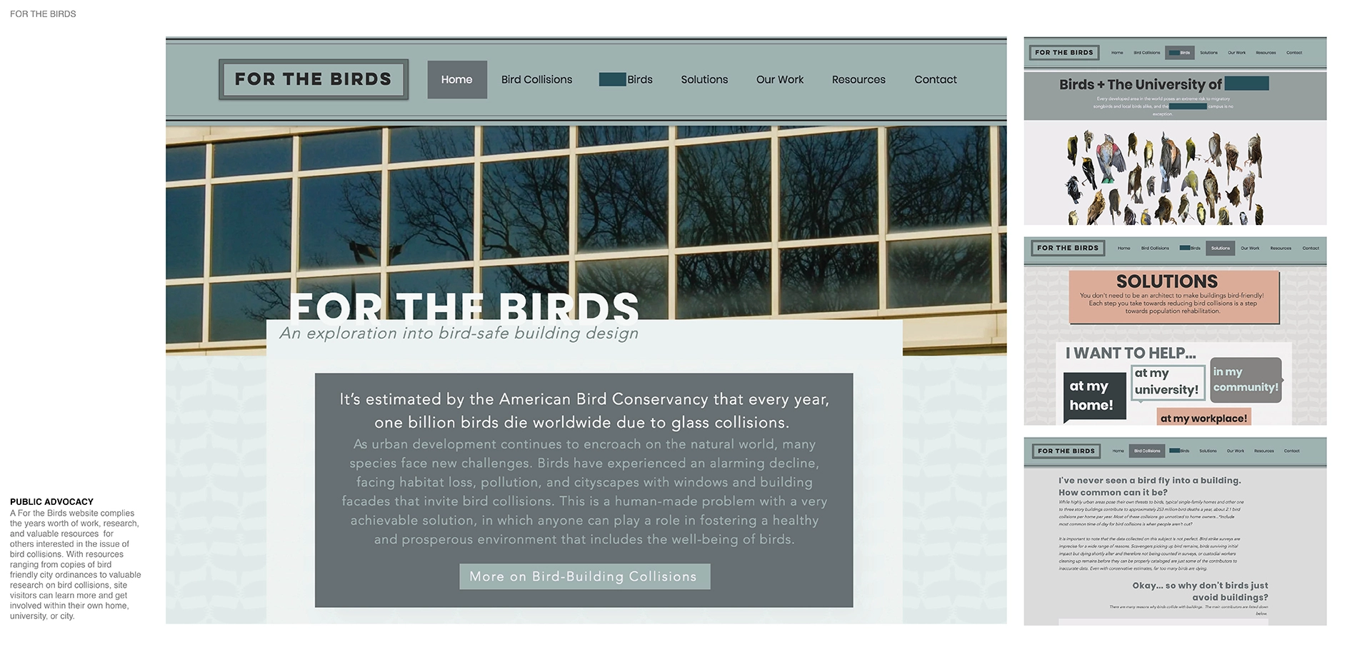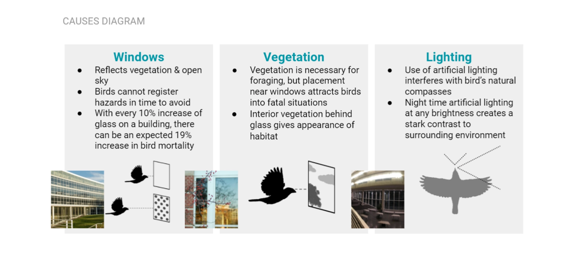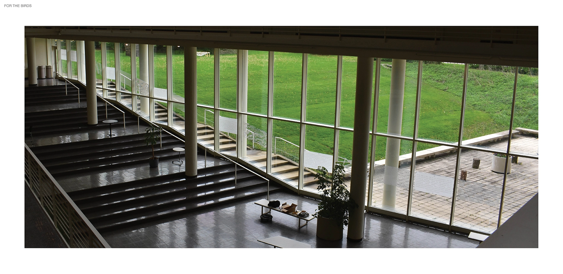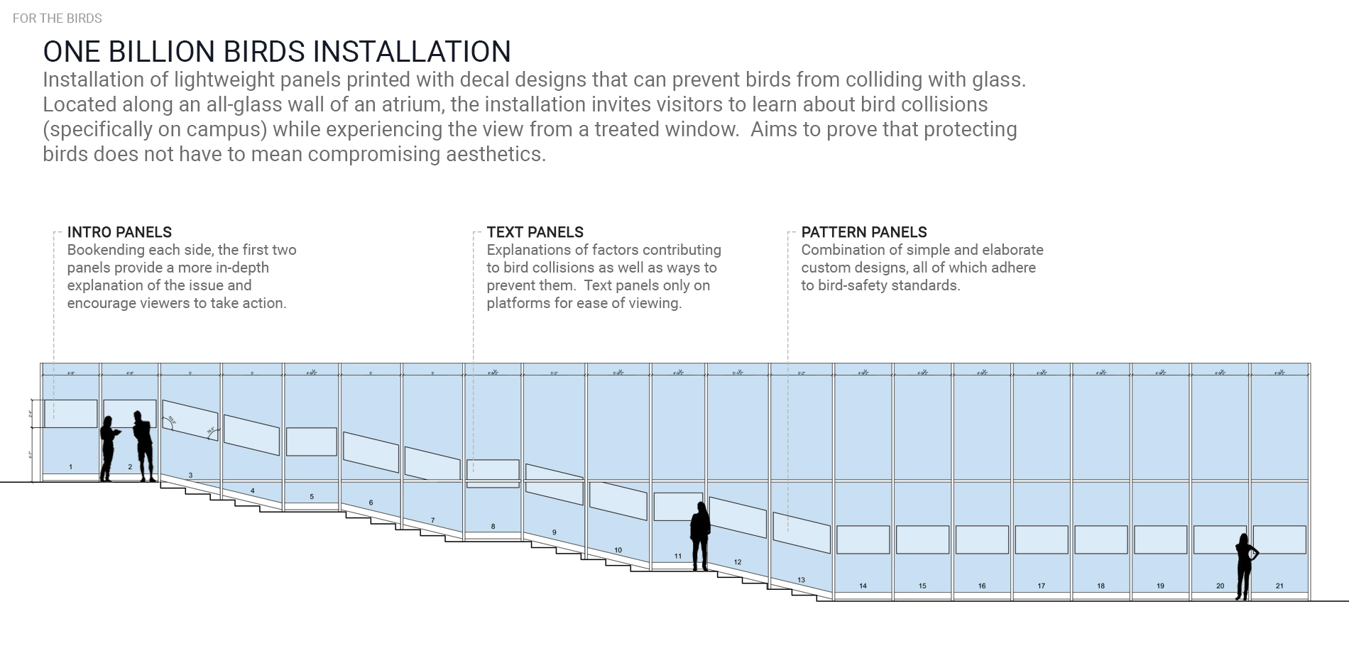 For The Birds is the culmination of a year-long independent study exploring the relationship between buildings, landscape, and bird collisions. Approximately one billion birds die globally each year due to collisions with buildings a result of extensive glass facades, confusing interior and exterior lighting, and foliage that attracts them toward windows. Design has played a key role in this, as the human desire for aesthetics often takes precedence over the safety of local and migratory birds.