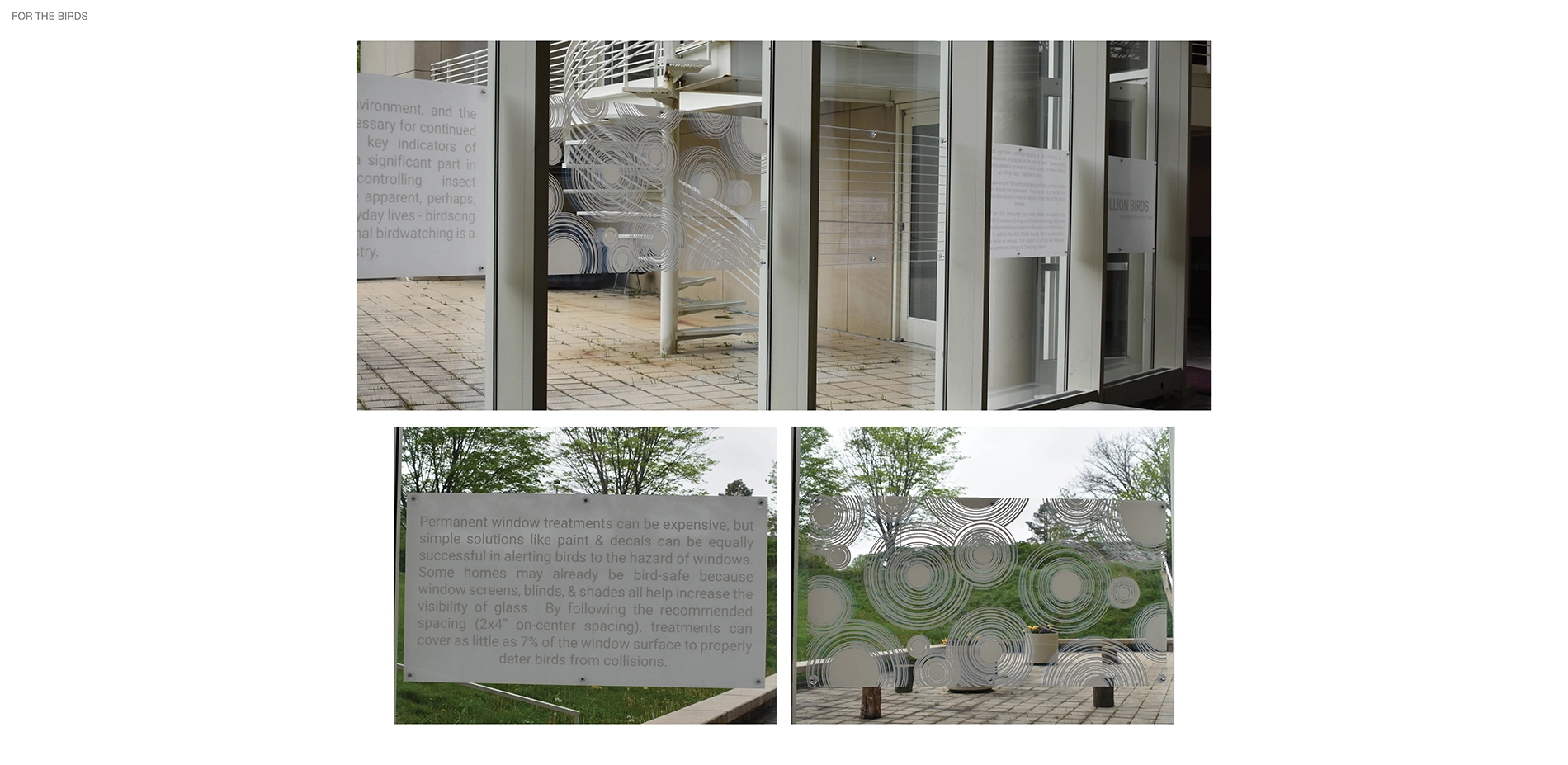 We met with the three department leads, our campus landscape architect, and the faculty director who all gave us permission to begin working on materials and installation. After researching and testing varying materials, UV-resistant acrylic, to prevent yellowing with age, applied to the atrium windows with threaded suction cups would be the base for our installation. Threaded suction cups provided a sturdy, removable solution that would leave no damage on the glass but also be able to remain in place. Three weeks were allowed for material testing to find the most economic and effective way to communicate what we had learned with department students in a striking manner. We knew showing decals and designs alone would not be enough to inspire new designers, so after every two patterns shown, an information panel details specifications on implementing bird safe design, key contributors, additional benefits, and other ways to get involved. This intervention is set to last through the fall semester of 2021, but we gained permission to leave it place as long as no one else creates a window intervention.