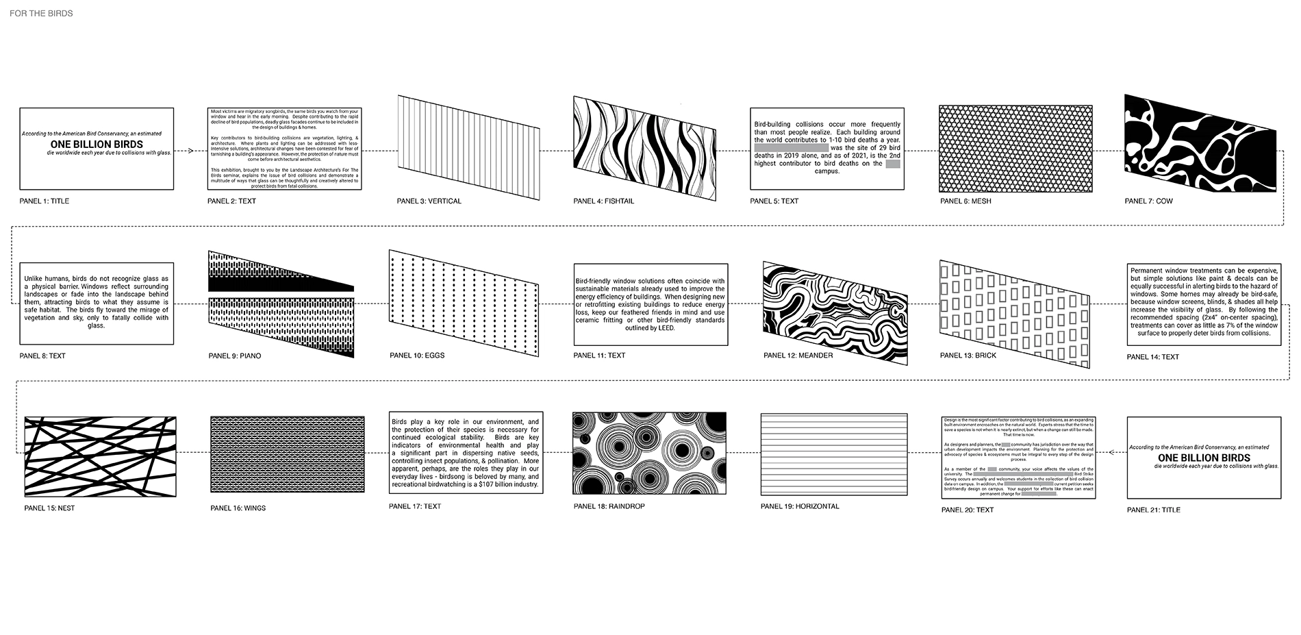 The data from the biology graduates was highly influential in our work, as it highlighted our department building as the second highest rated building for bird strikes. This also provided us with an ideal lab to test materials and solutions, as well as an opportunity for impactful outreach. Our original goal was an intervention for the entire west side of the building, however, it was out of scope and out of budget for our study. Instead, we created a plan for advocacy. The first move to bring awareness is to educate, and this was done with the help of a prominent ornithologist who came to speak at a department event. This went a great deal in laying the groundwork for our future phases as it brought the issue to the three department heads’ attention. We knew that more work needed to be done to create lasting outreach for future generations of urban planners, architects, and landscape architects as well as establishing a resource for designers to use as they move forward through the curriculum. Our team spent four weeks going through the design process where we decided that the best way to show the solution to designers was to show them the physical solution. Our intervention also had to be impermanent, yet lasting, as the building is a shared space between three departments. We proposed an installation consisting of acrylic panels that would have decals applied to them, affixed to the west wall windows through suction cups, to demonstrate that life saving patterns are not intrusive and could also enhance aesthetics. The installation would move down the steps of our department buildings atrium in a ribbon, detailing the prominence of bird deaths, their impact, how landscape architects, architects, and urban planners can contribute to reducing bird fatalities, how students can be involved on campus, and offers an invitation to students and faculty to an ongoing petition to change building codes on campus to account for bird safe design.