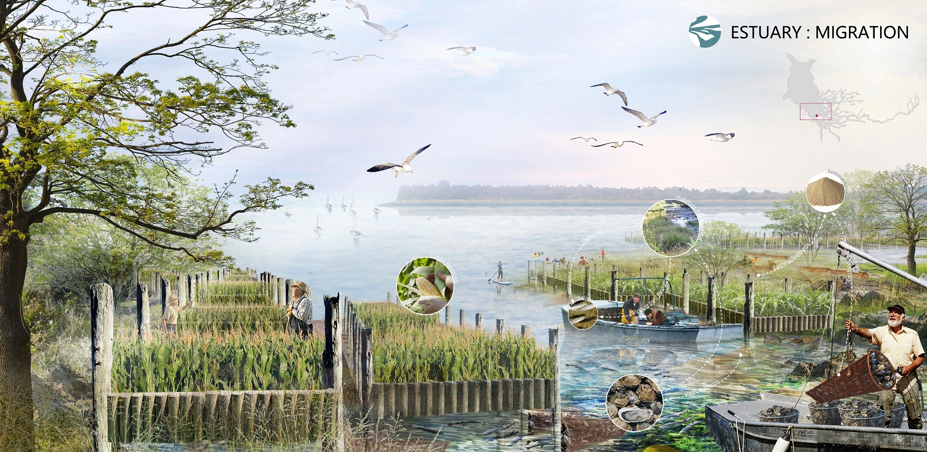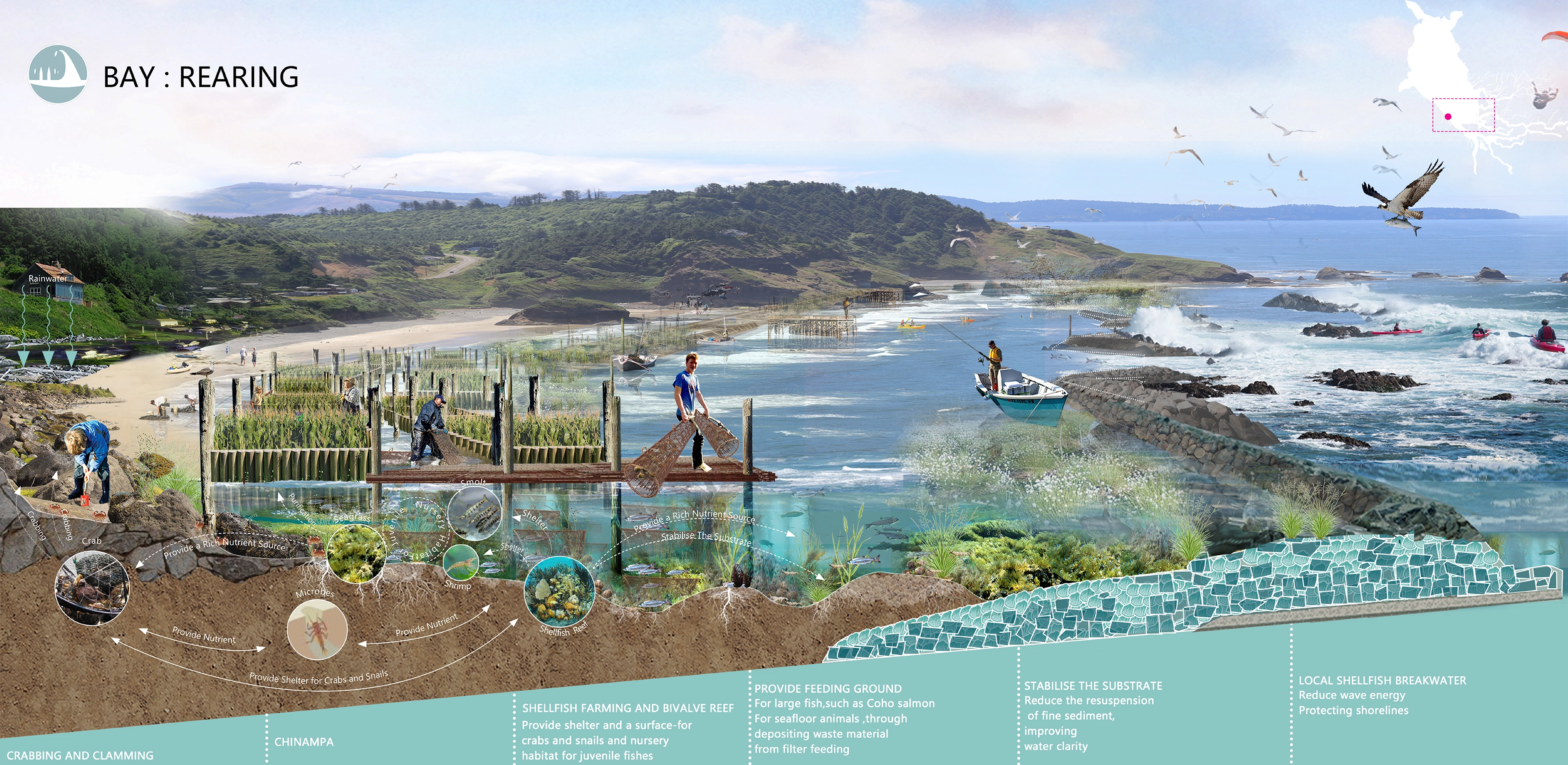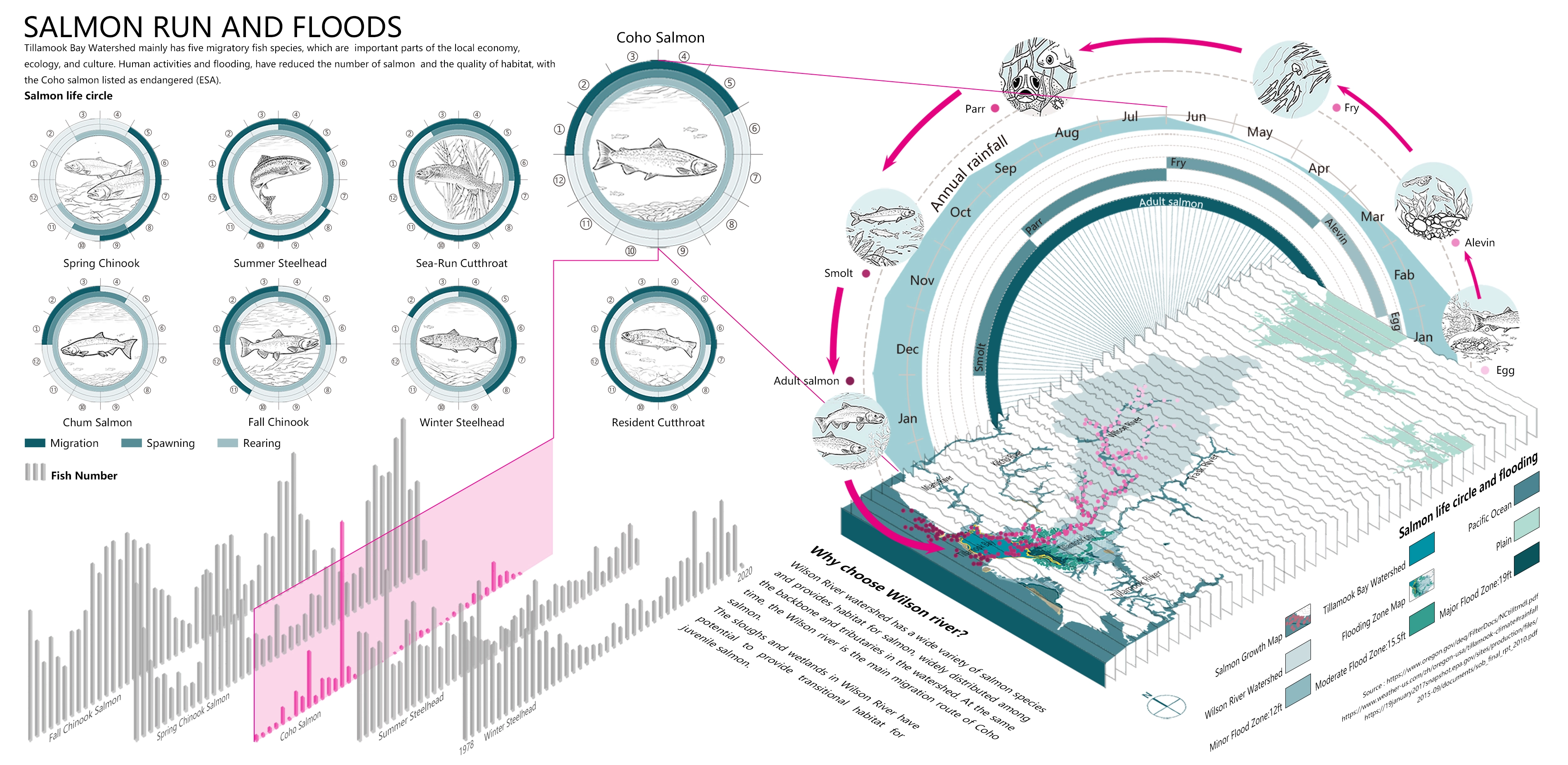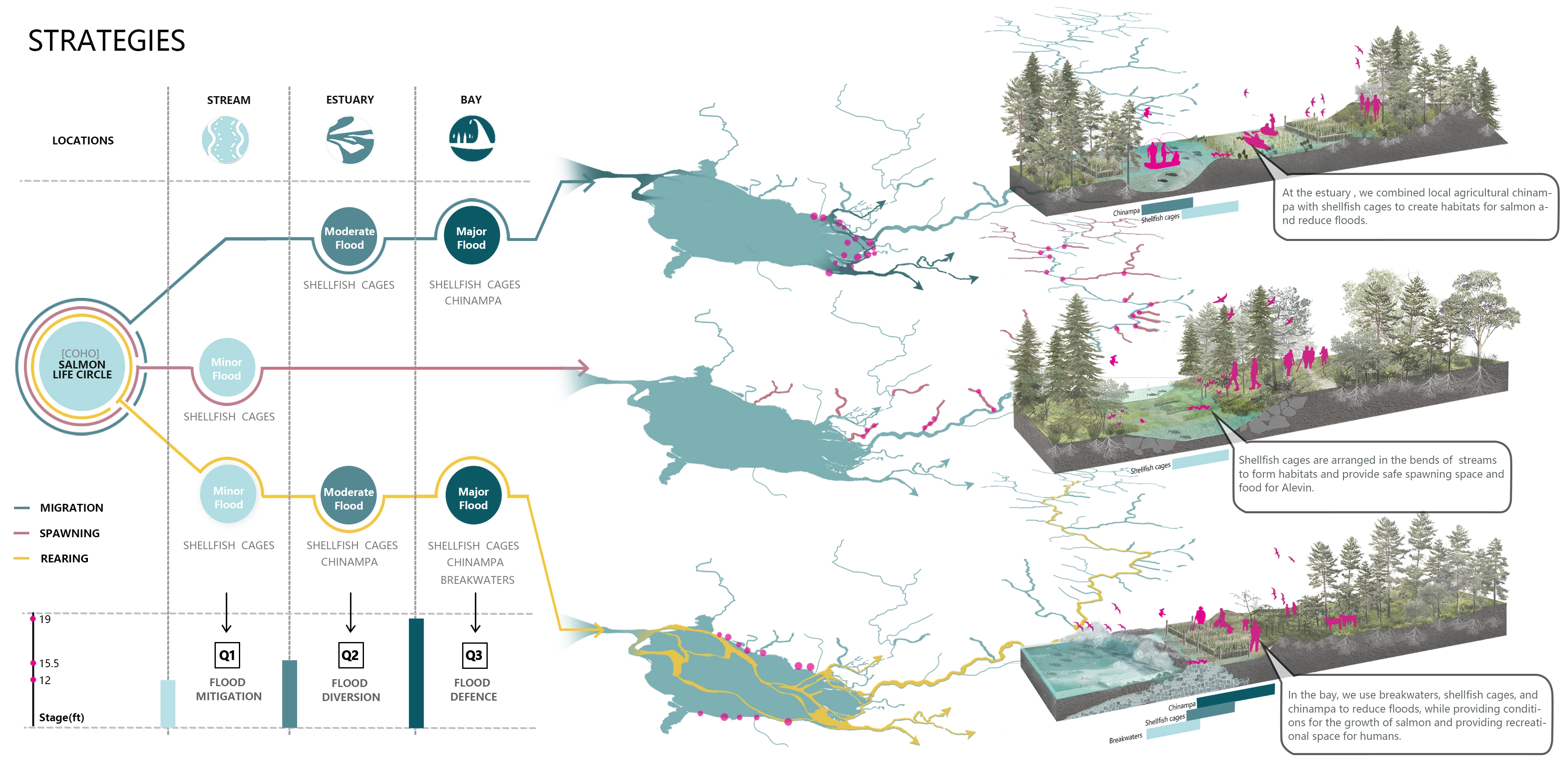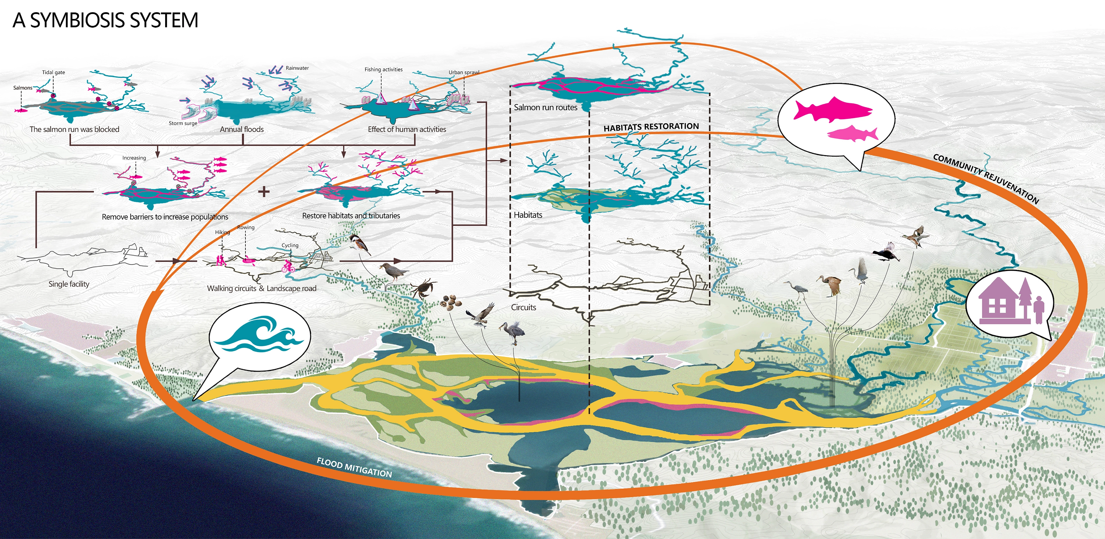 Instead of traditional prevention-led approaches in flooding management, this experimental project attempts to seek a symbiosis way of living with potential flooding and salmon habitat conservation. We hope to intervene in the environment of rivers, estuaries, and bays through three phases of the salmon run route: spawning, migration, and rearing, to re-establish "habitat connectivity" for salmon, to reconnects more historic habitat, reduces chronic flooding, improves the resilience of the area while recreating opportunities and stimulates the local economy.