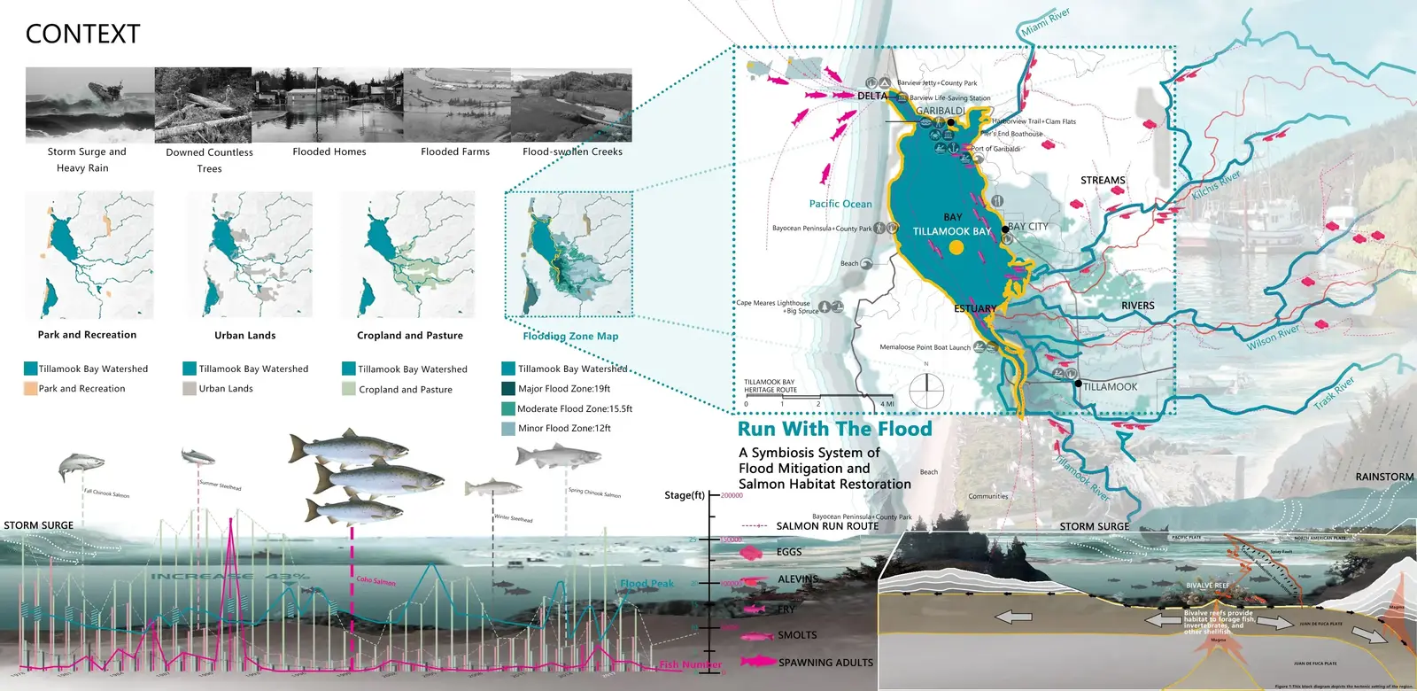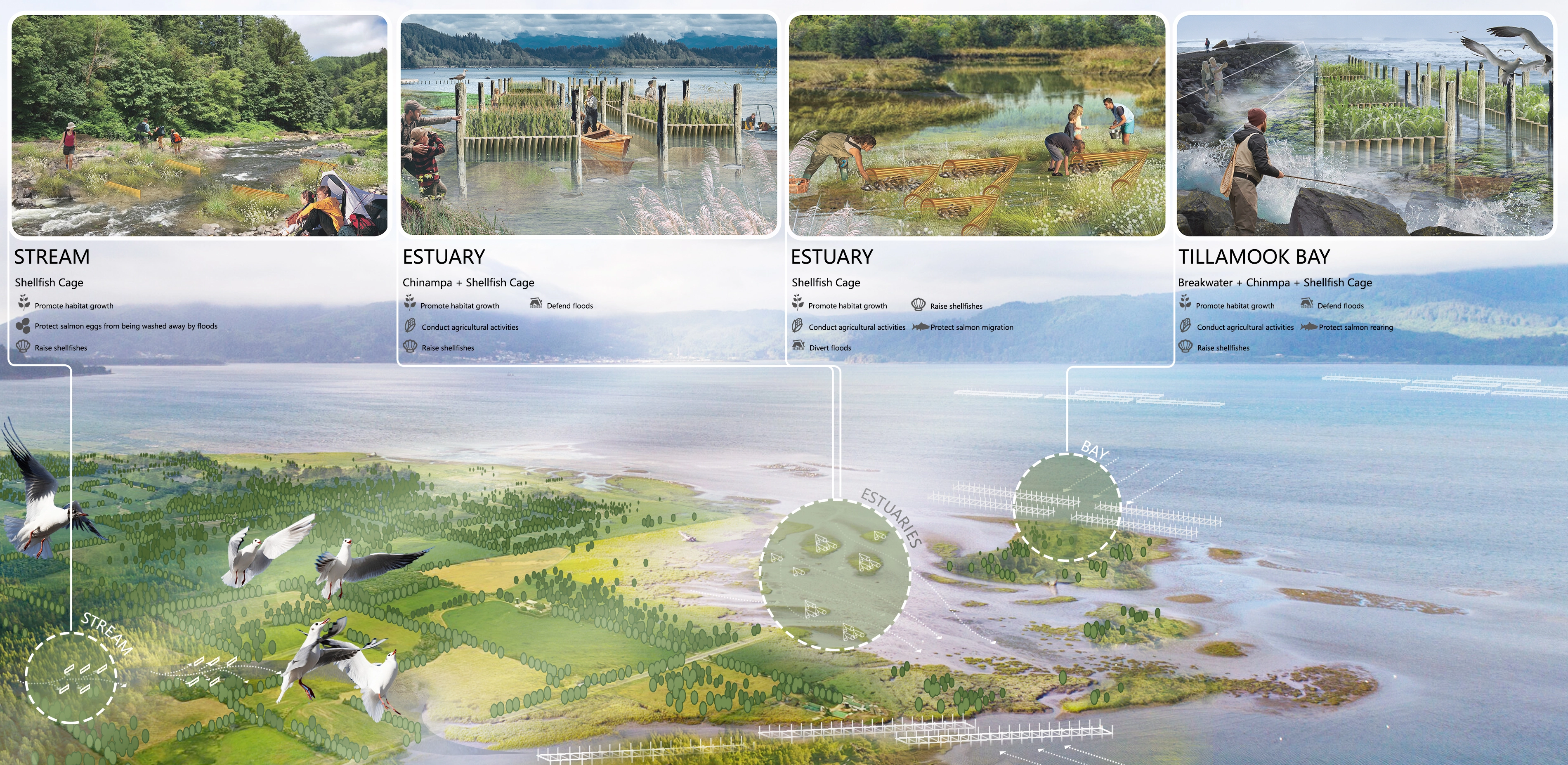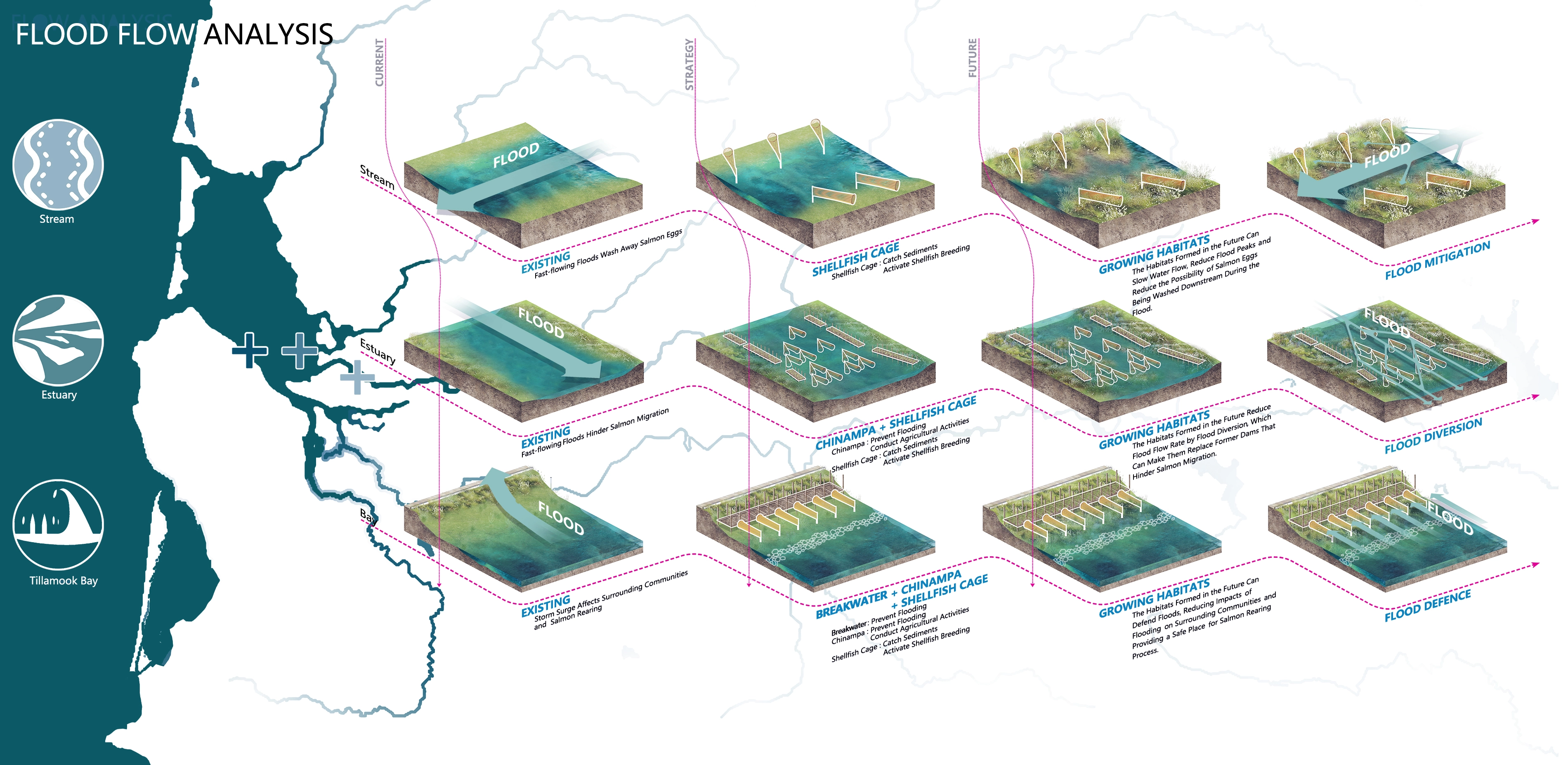 We hope to achieve flood reduction through habitat network establishment while integrating local activities to form a symbiotic system. To solving the long-plagued flood and salmon conflicts, Tillamook bay will eventually rebuild its "habitat connectivity" and reconnect more historic habitats. Our strategy promotes regional ecological resilience and reduces long-term flood problems while reinvigorating the local community and stimulating local economic development.