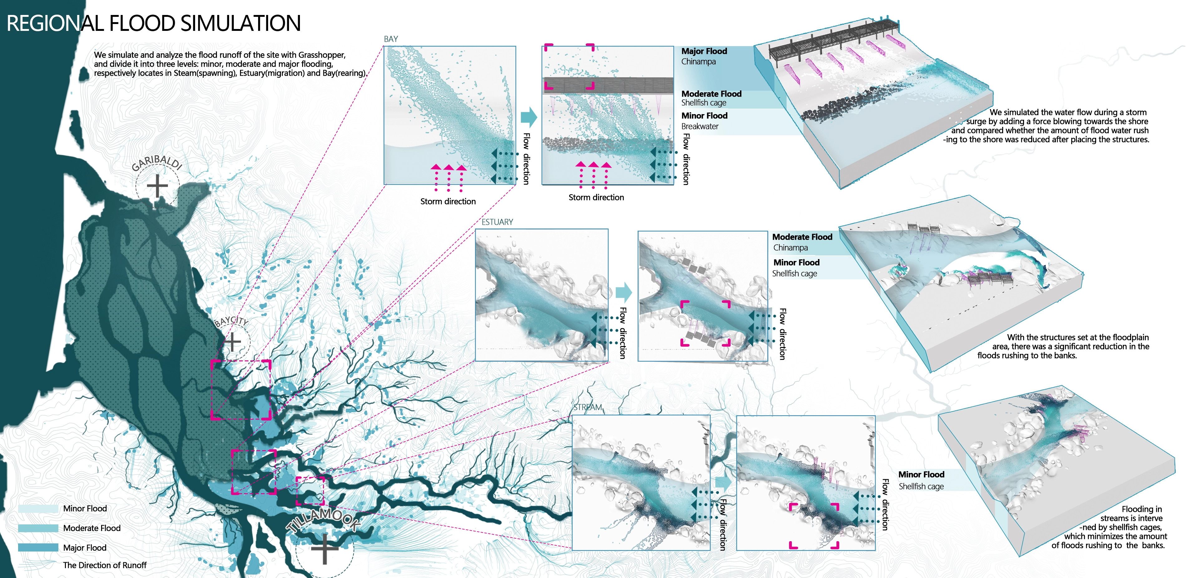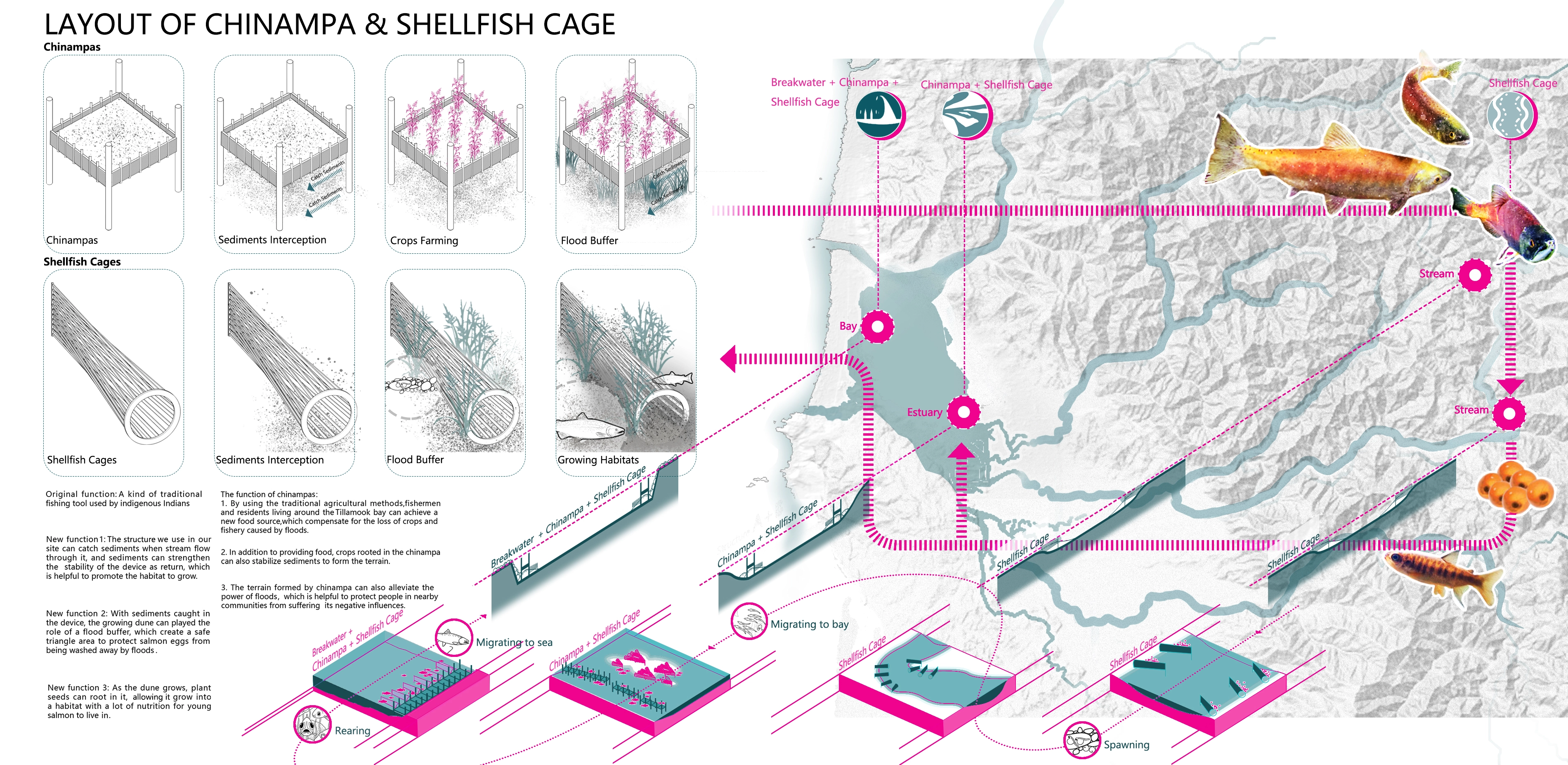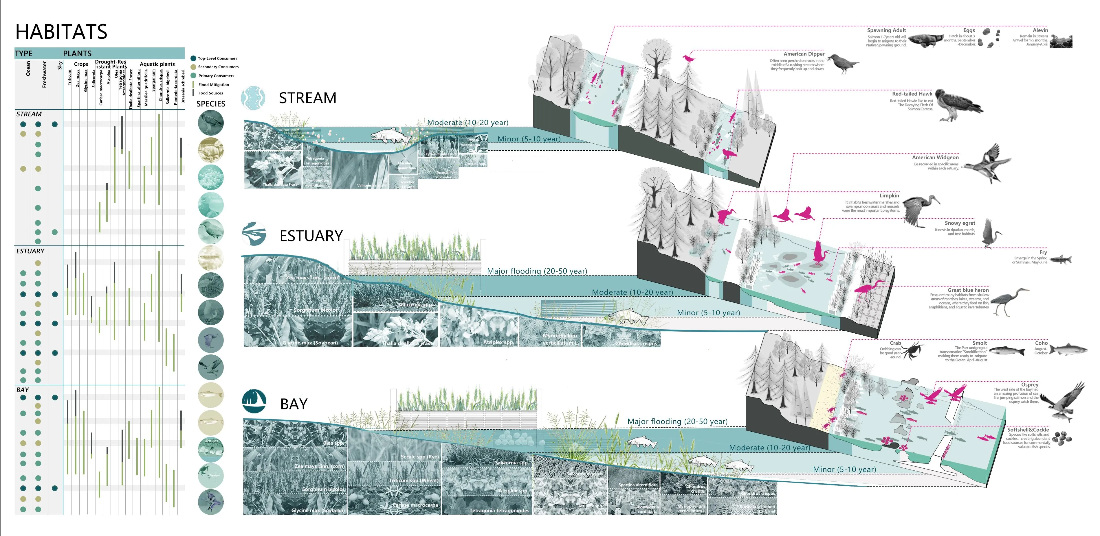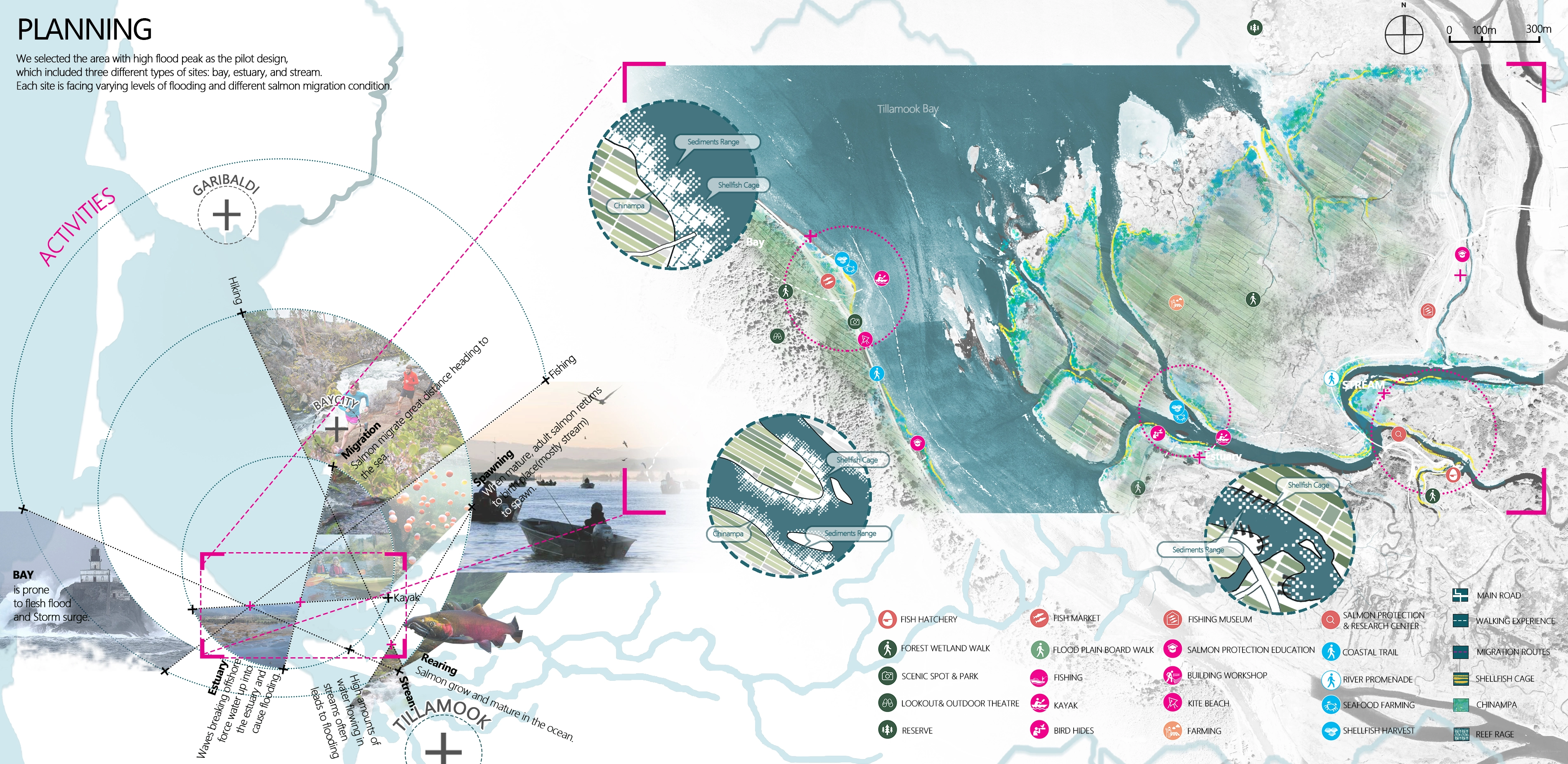 We hope to achieve flood reduction through habitat network establishment while integrating local activities to form a symbiotic system. To solving the long-plagued flood and salmon conflicts, Tillamook bay will eventually rebuild its "habitat connectivity" and reconnect more historic habitats. Our strategy promotes regional ecological resilience and reduces long-term flood problems while reinvigorating the local community and stimulating local economic development.
