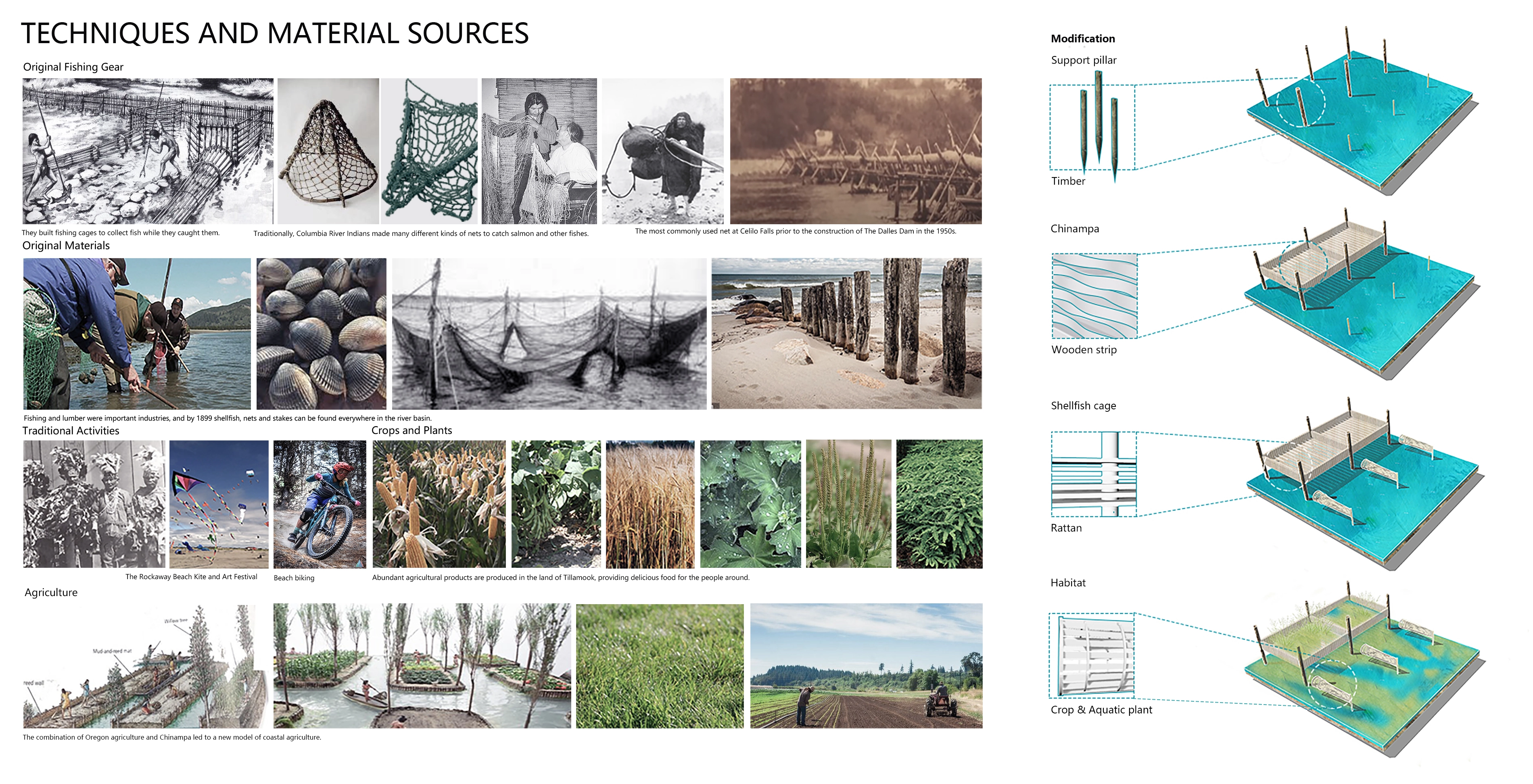 Culture and Community: The cultural and commercial value of salmon production is closely related to the lives of the local residents. Dig deep into the local farming history and the residents daily living habits of recreational activities, economic industries, as well as locally available materials and techniques, we found that the matured technology of local shellfish breeding and chinampa farming have good application prospects. After modification, to form useful structures for managing floods and create habits with local memory characteristics.
