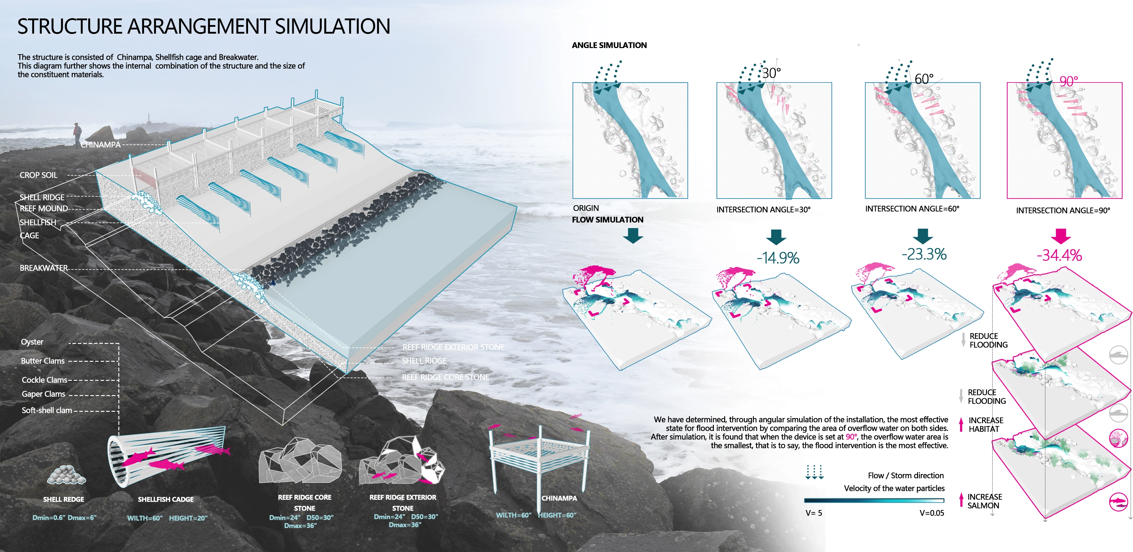 1)We arrange Chinampa, shellfish cage, and breakwater in the bay area to reduce the flood wave energy.