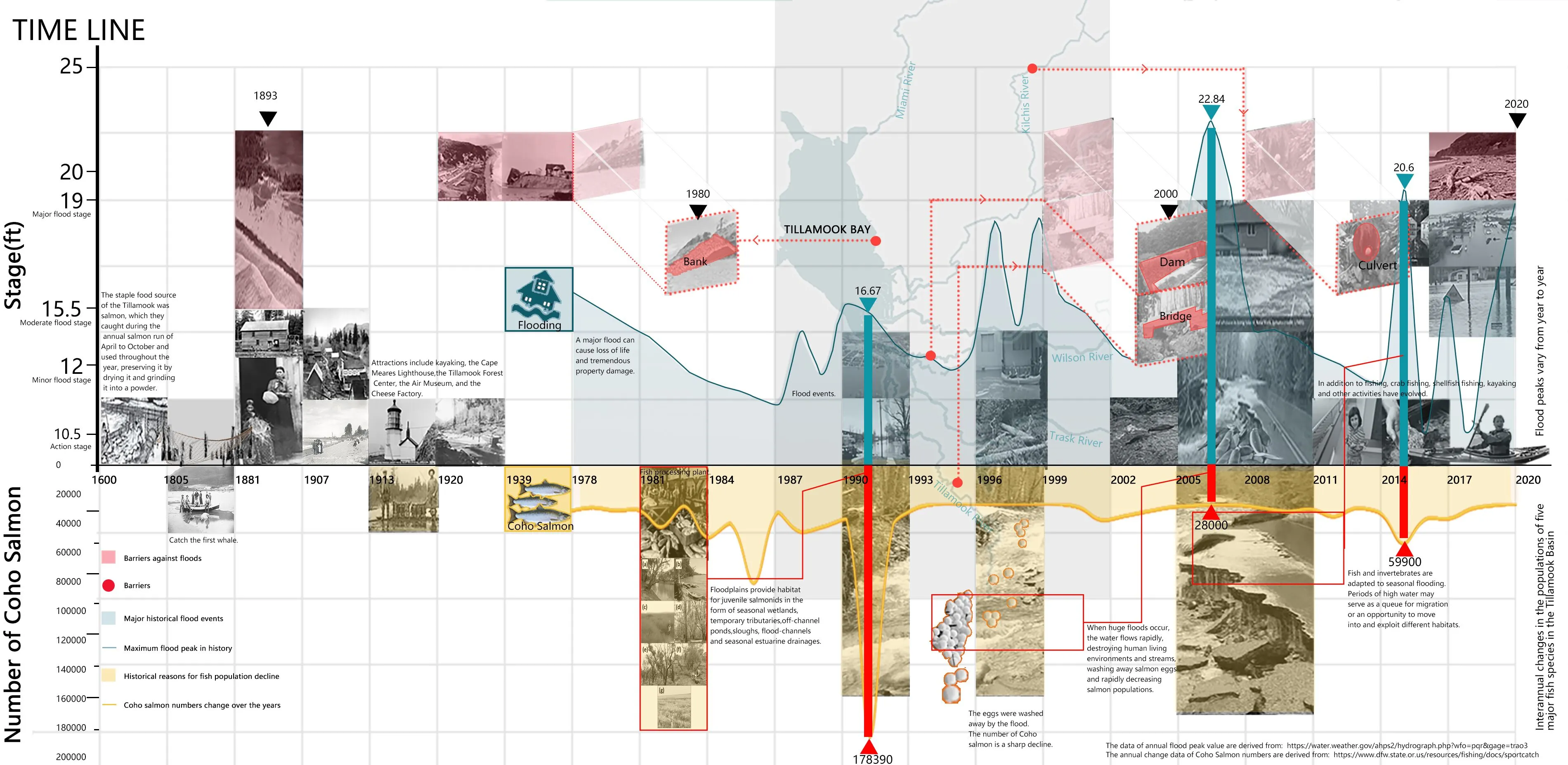 An analysis of historical data within the region suggests that the Tillamook people have a long history of fighting floods, such as building barriers (embankments, bridges, culverts, dams, etc.), however, these infrastructures hinder local fish migration. By stacking the peak flood levels with the salmon population changes, we found that: