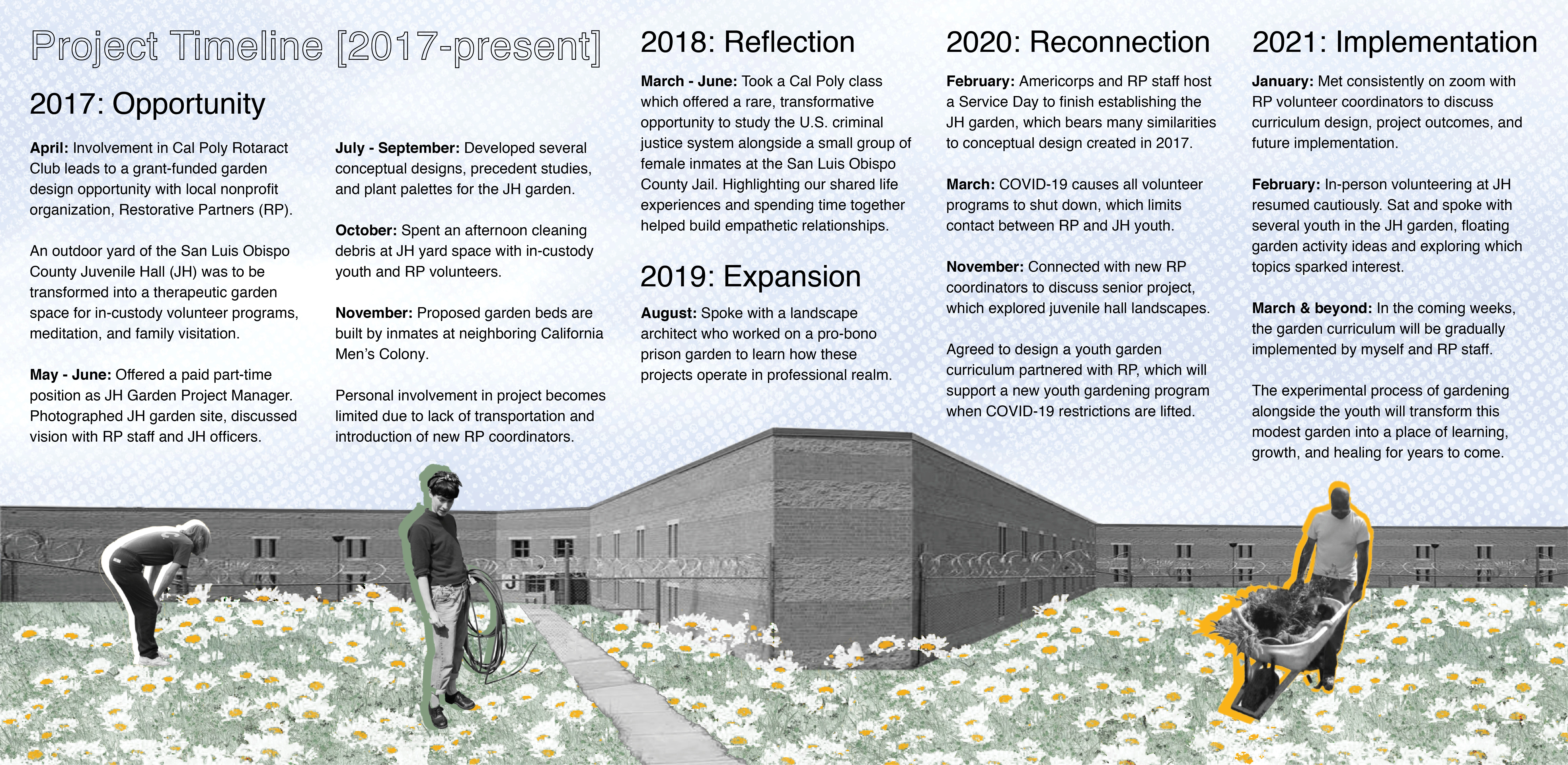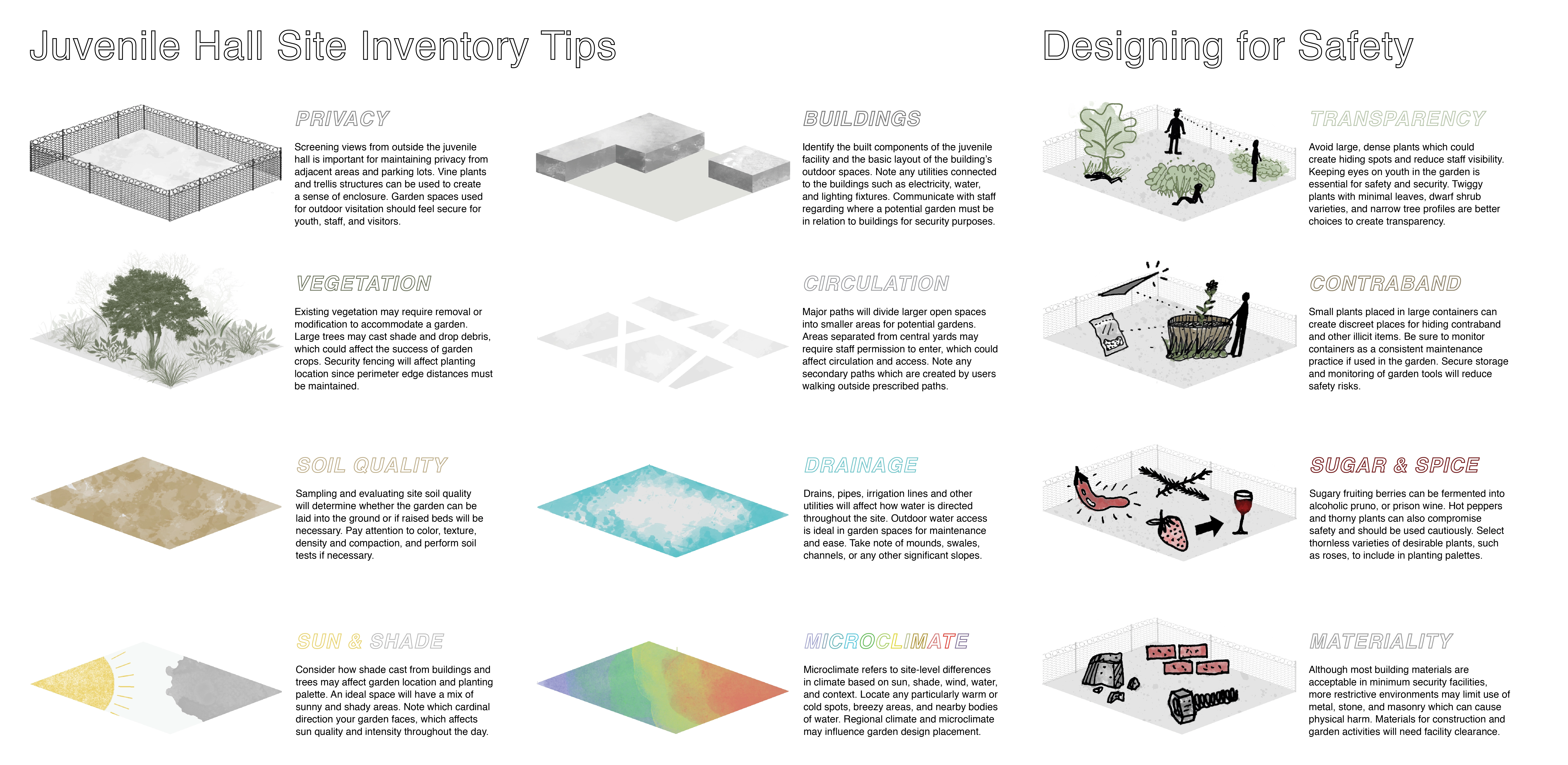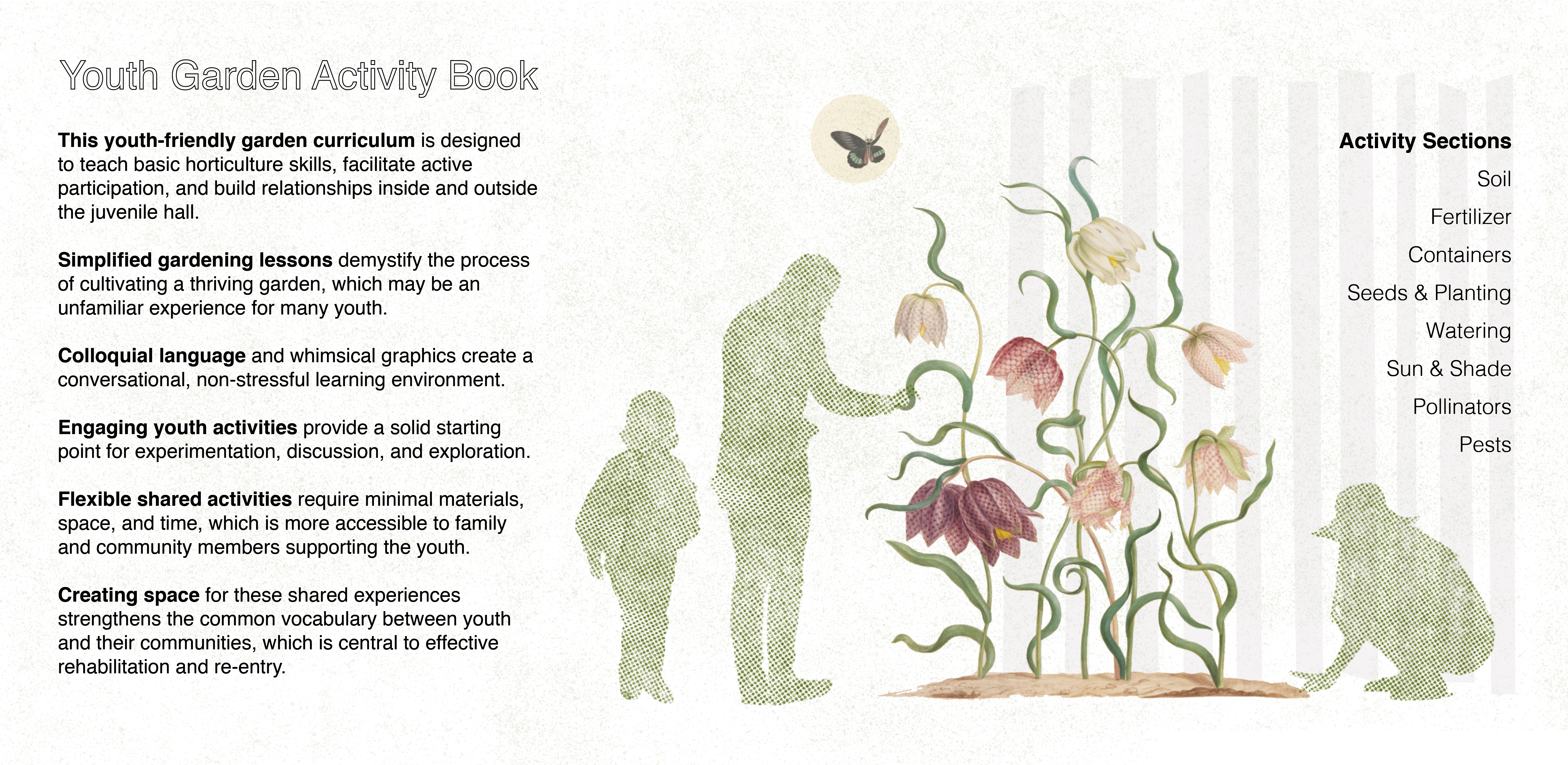 BACKGROUND A Garden Can Cultivate an Inmate is a synthesis of restorative justice research, garden design experience, direct community engagement, and coordination with a local non-profit organization. This project offers resources useful in establishing robust juvenile hall garden programs, which is a complex yet rewarding process. It informs readers on the current state of juvenile justice, provides landscape design recommendations based on first-hand experience, and offers an educational garden curriculum book suited for youth users under age 18. My direct experience with incarcerated people, correctional staff, and community activists has encouraged me to confidently implement this project while balancing stakeholder interests.