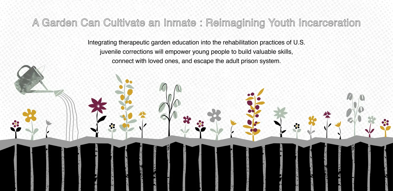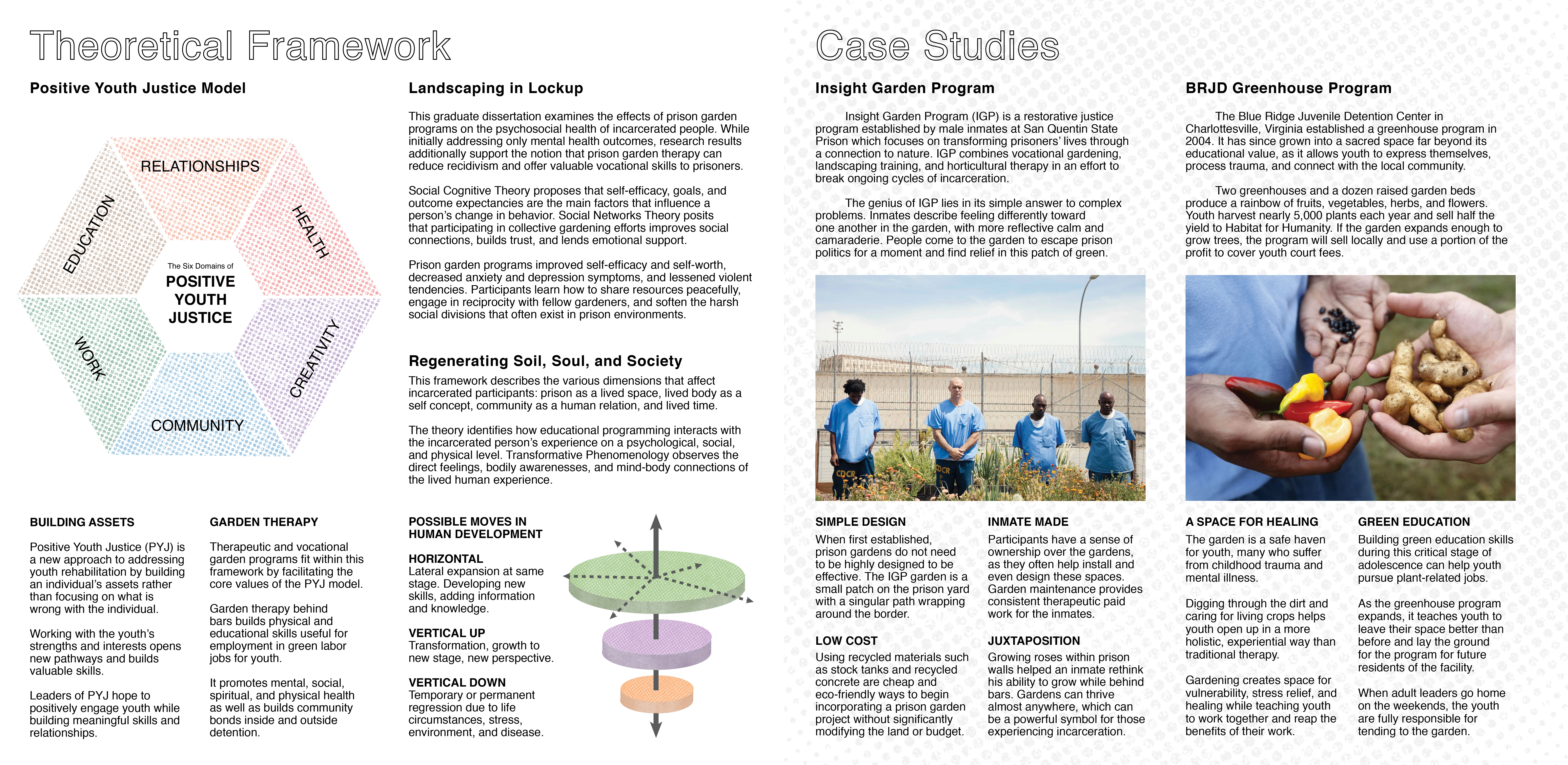 This research-based landscape architecture project proposes therapeutic gardening curriculum as a strategy for youth rehabilitation. While prison gardens certainly cannot solve all the problems associated with incarceration, they can significantly alleviate mental stress, build valuable skills, and help youth cope with life inside and outside prison.