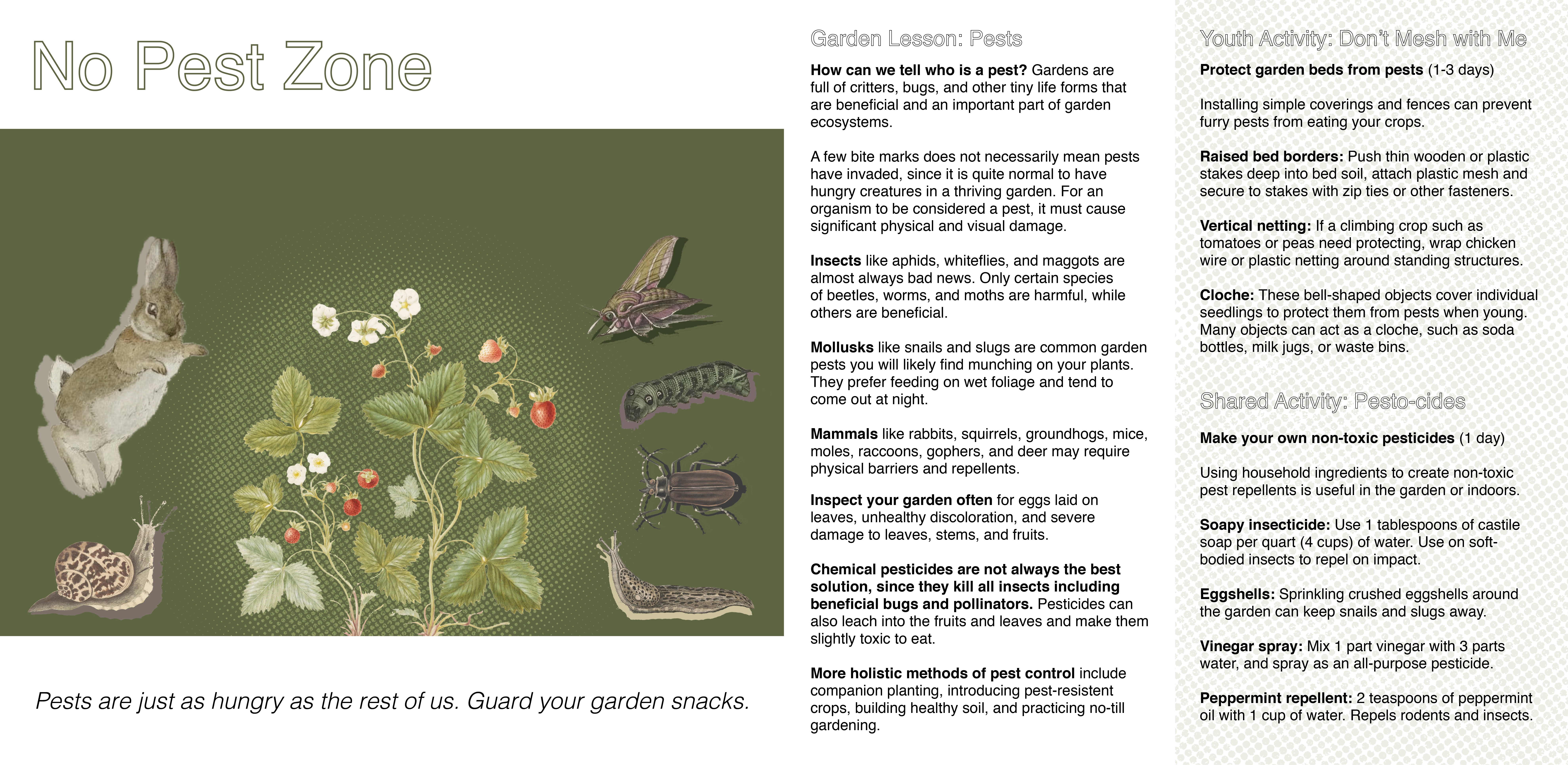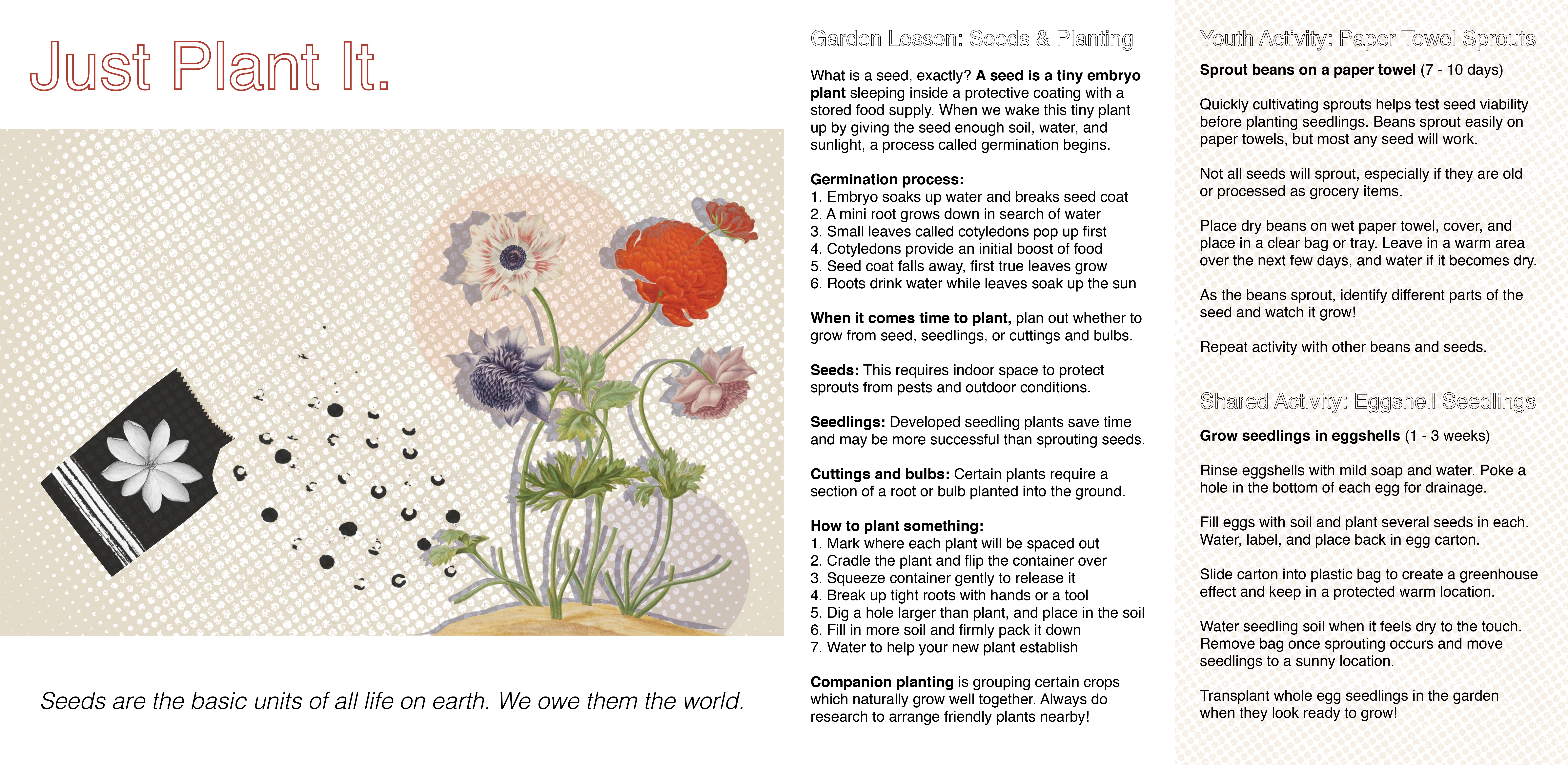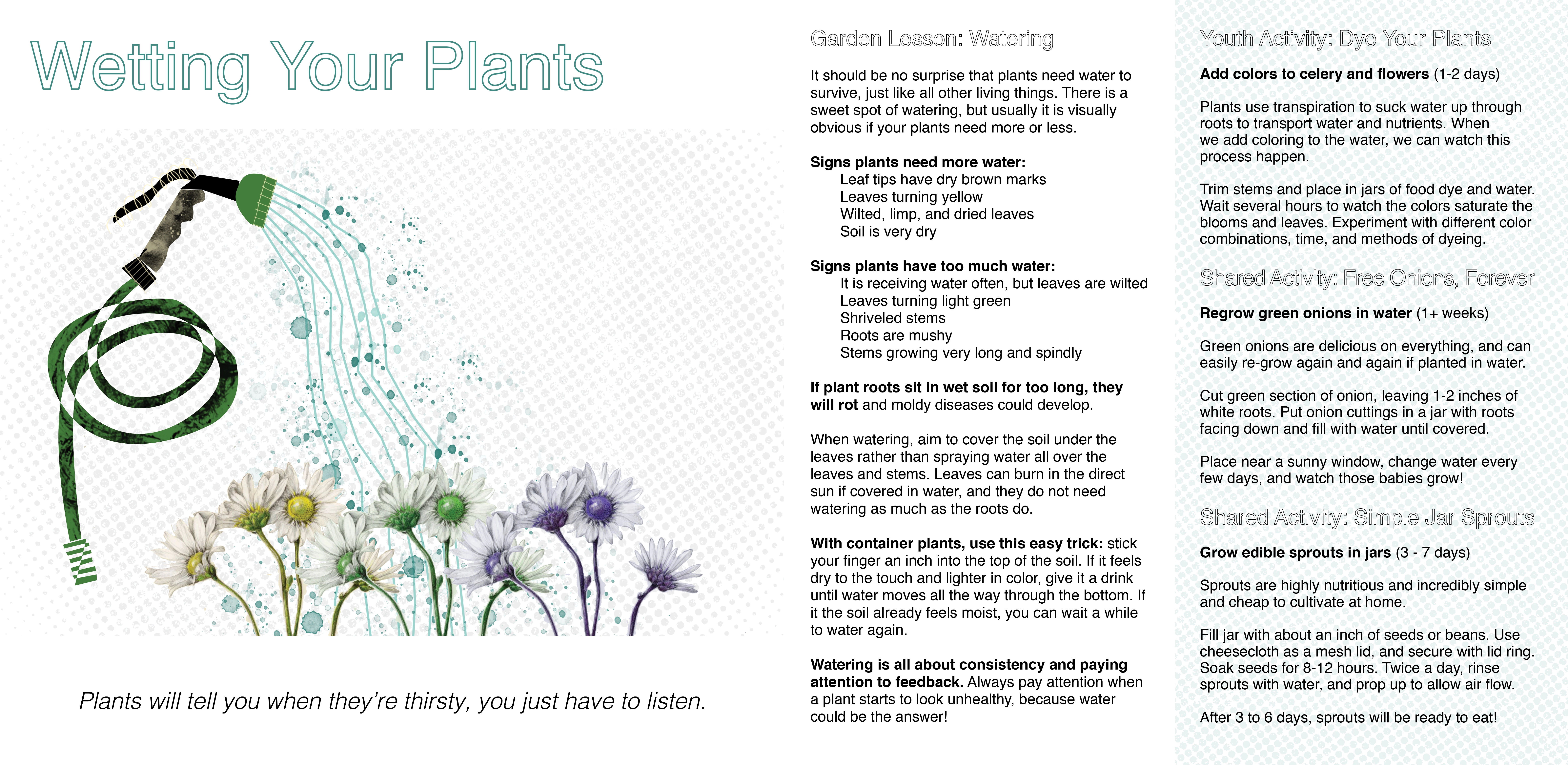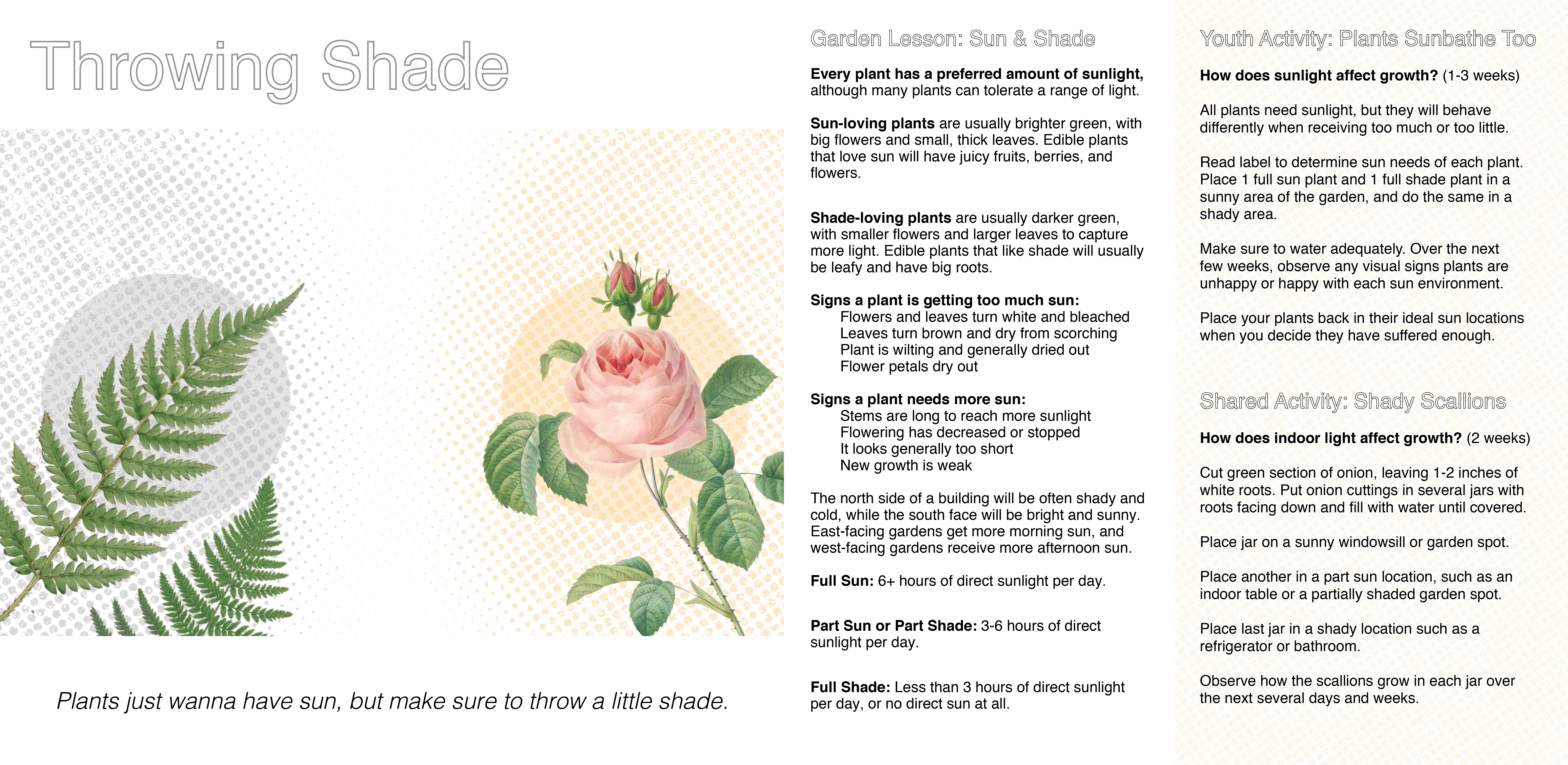 Bringing garden education and vibrant green space into juvenile detention honors the humanity of incarcerated youth and builds relationships through the shared experience of gardening. The youth garden curriculum book provides low-cost, engaging activities which teach the basic components of a healthy garden and its maintenance. Each curriculum section offers a garden lesson, a youth activity intended for juvenile hall gardens, and several shared activities which can also be easily completed by friends, family, and community members outside detention. Creating space for parallel experiences strengthens the common vocabulary between youth and their communities, which is central to effective rehabilitation and re-entry.