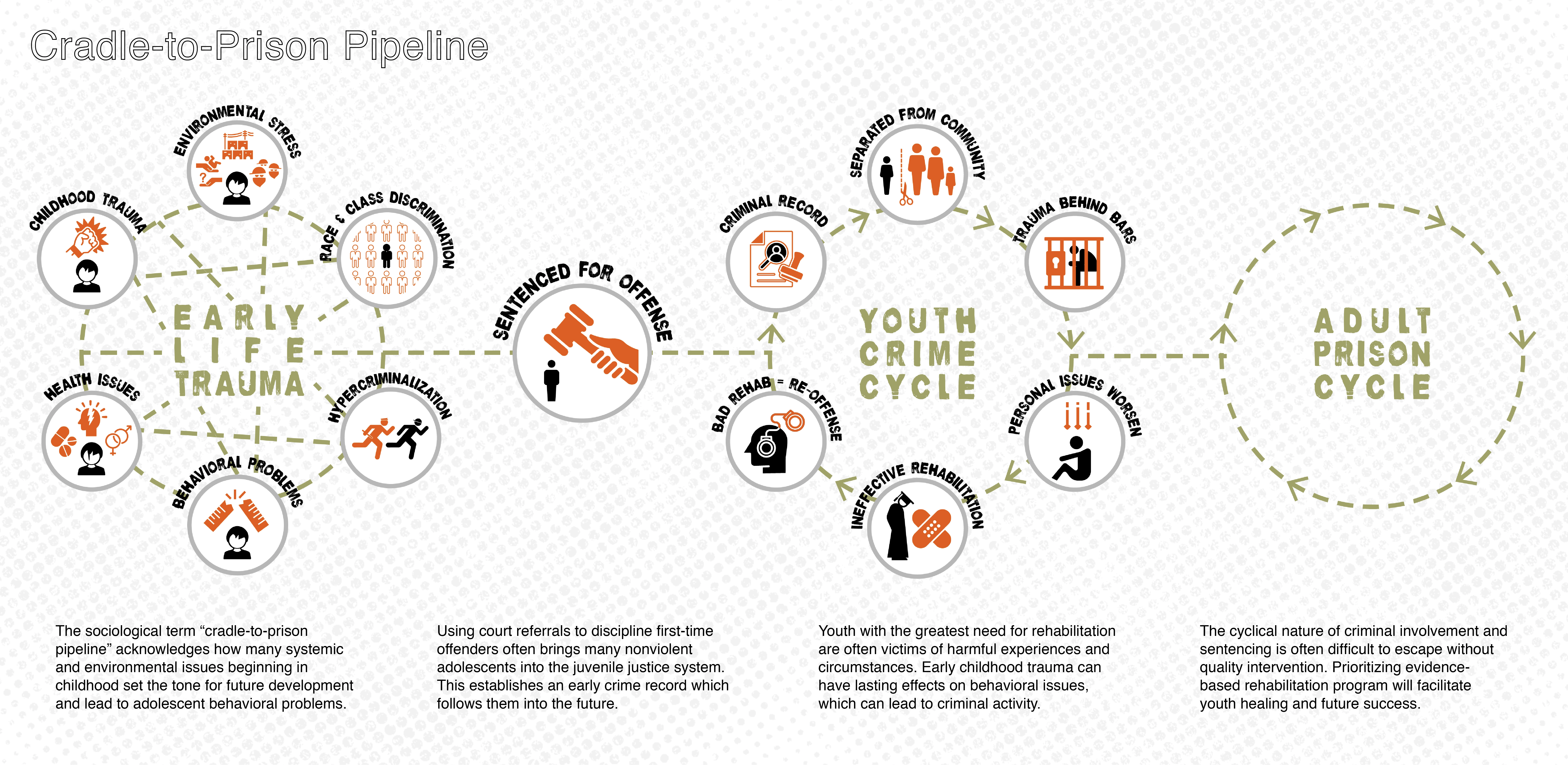 SOCIAL EQUITY, DIVERSITY, & INCLUSION Youth with the greatest need for rehabilitation and care are typically victims of several harmful childhood experiences which impede healthy development. Early childhood trauma can have long lasting effects and often contributes to the behavioral problems that bring youth into the system. Youth of color who deal with the pressures of poverty and abuse early in life are more vulnerable to the cradle-to-prison pipeline, which can be incredibly difficult to escape if they are only punished rather than rehabilitated. The vast majority of incarcerated youth are young black and brown men, who are disproportionately detained more than their white peers. Black, Native American, and Latino youth are overrepresented in California and the U.S. juvenile justice system as a whole.