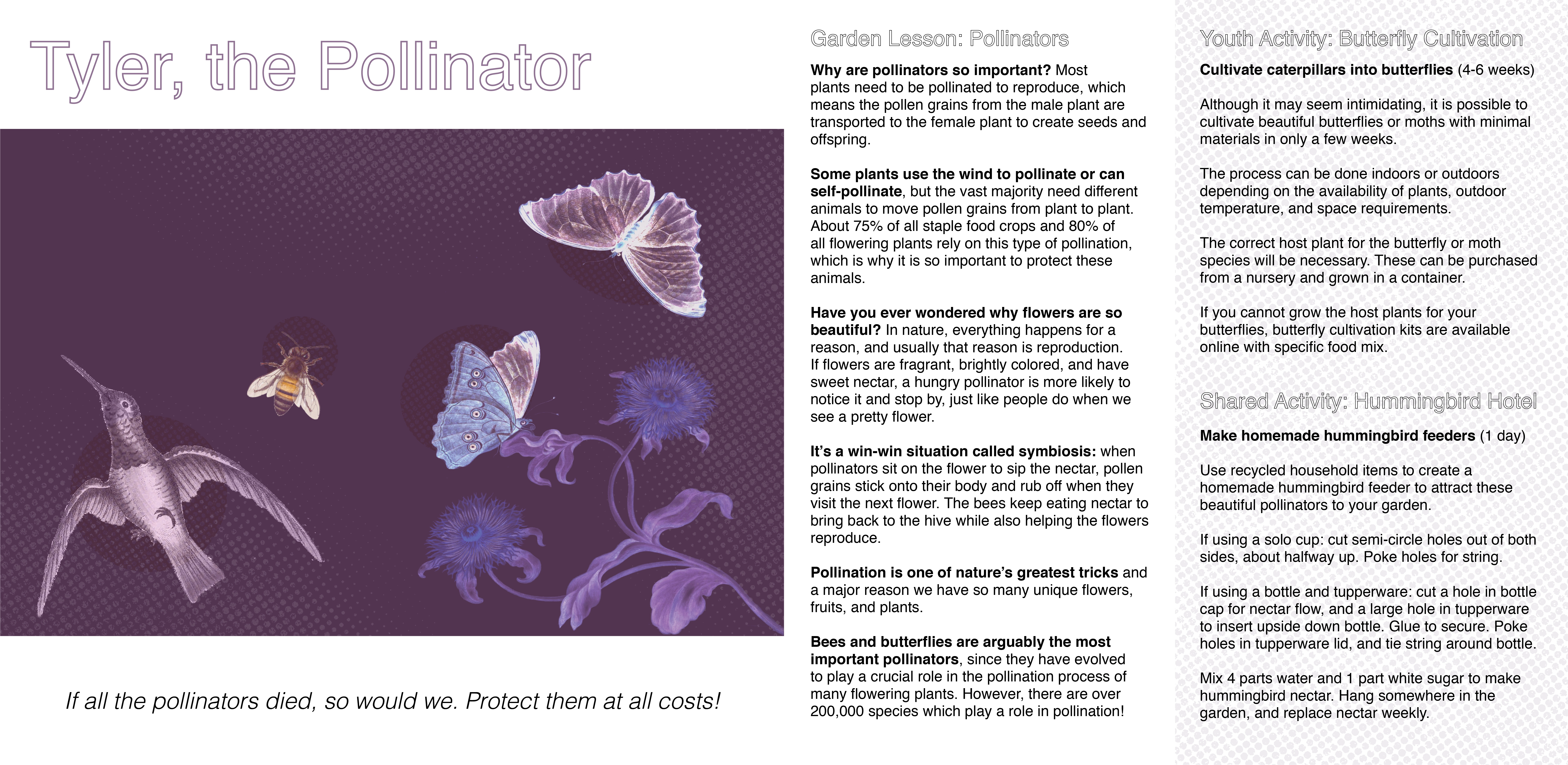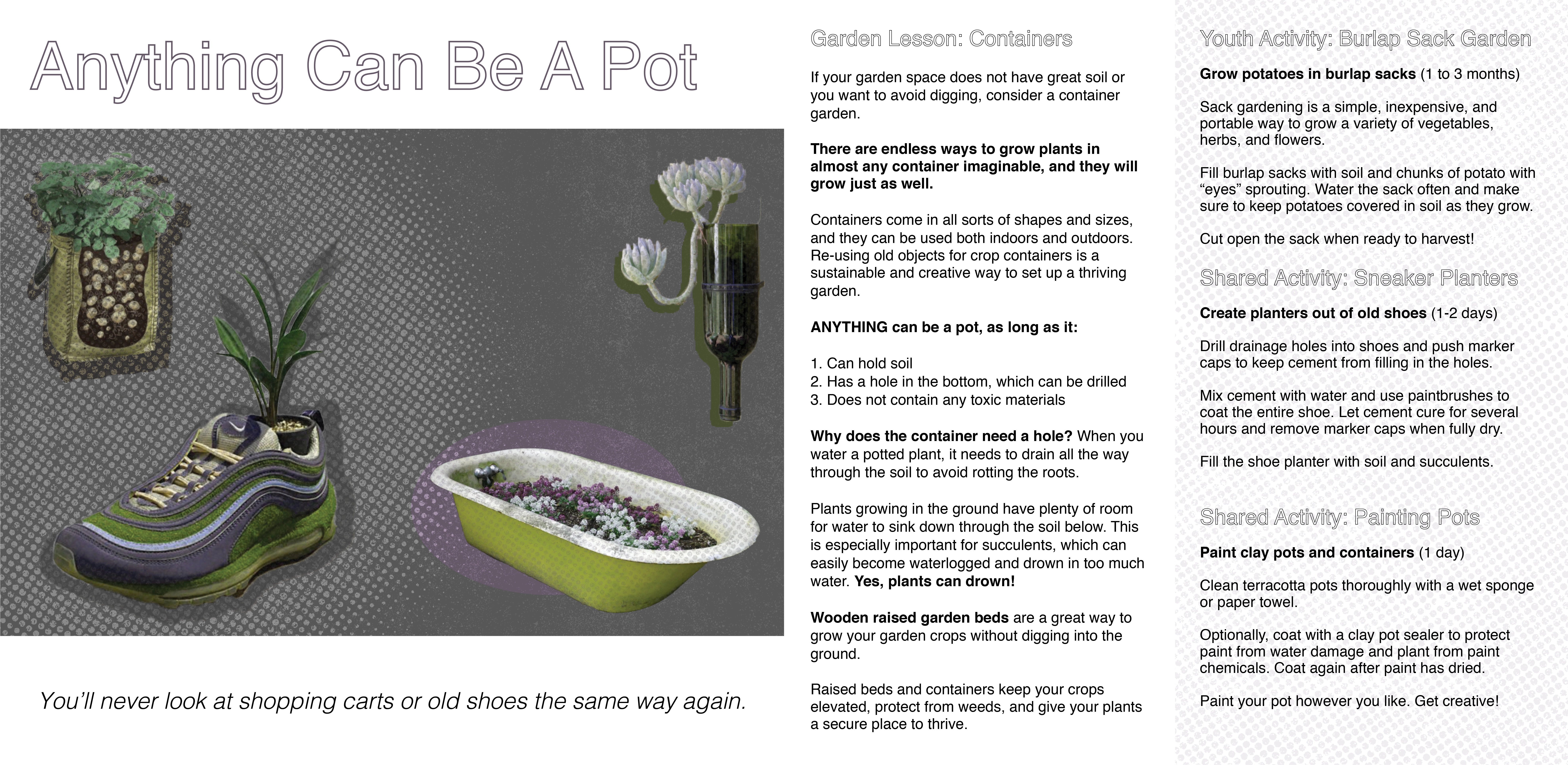 MISSION & GOALS Integrating therapeutic garden education into the rehabilitation practices of U.S. juvenile corrections will empower young people to build valuable skills, connect with loved ones, and escape the adult prison system. A Garden Can Cultivate an Inmate consists of three main sections: research, design, and curriculum. The research component of this project illustrates the current state of youth incarceration, analyzes relevant case studies, and aligns the project within a theoretical garden education framework. Proposing garden therapy as a highly effective, evidence-based rehabilitation strategy supports the future implementation of similar programs throughout the United States. The design recommendation section provides lessons for designing in carceral spaces, especially in the realm of youth safety and security. My experience designing for a juvenile detention hall and working with correctional staff informed the guidelines created in this section. Finally, the youth garden curriculum provides an easily printable booklet with teaching material and suggested activities. This book provides a solid starting place for youth, volunteers, staff, or anyone interested in participating in garden education for those with little to no knowledge of the subject.