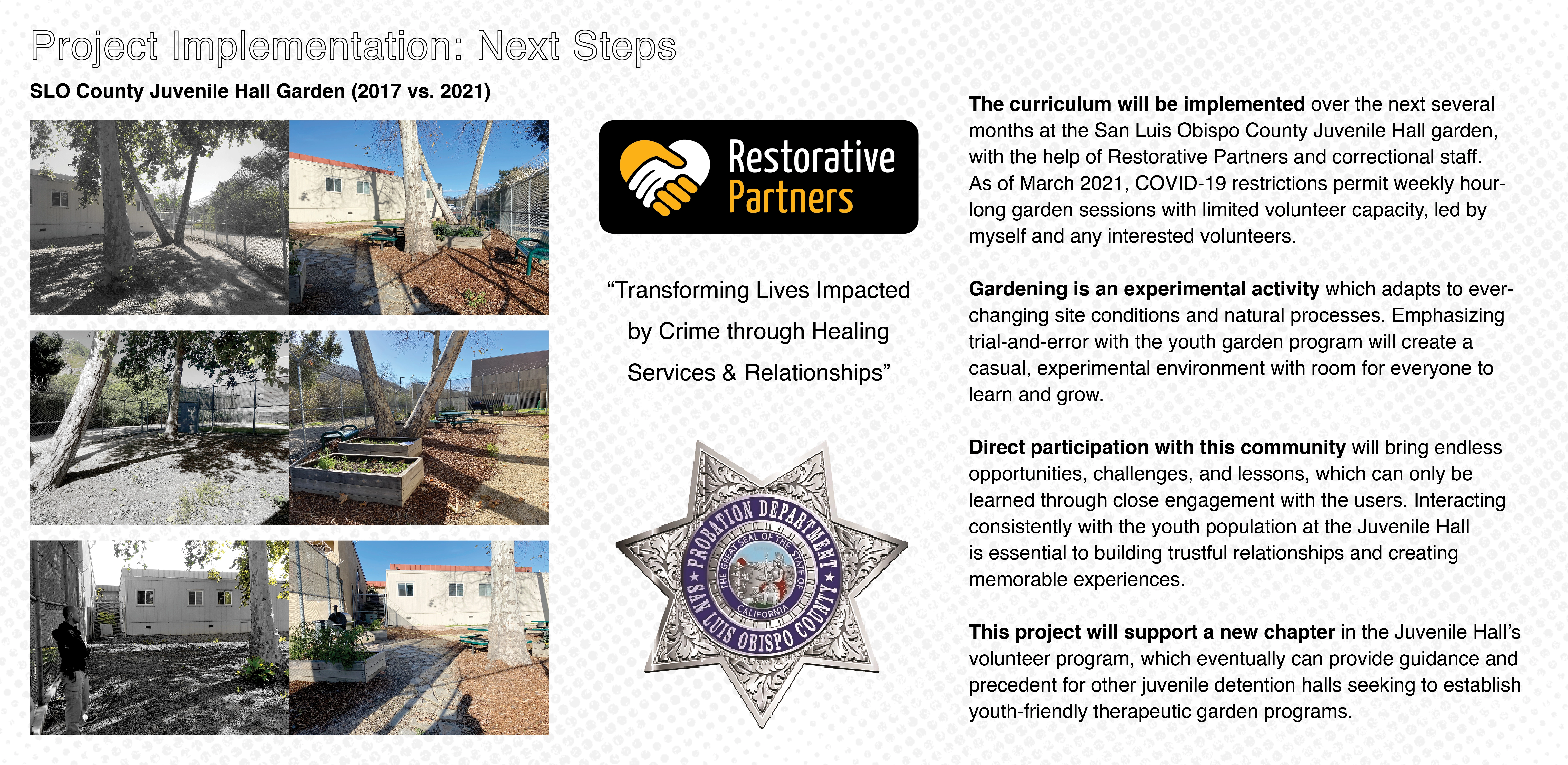 COLLABORATION WITH STAKEHOLDERS This project would not have been possible without the trusting relationships built with staff at Restorative Partners and cooperation with SLO Juvenile Hall correctional staff. From the earliest stages of conceptual design through the current state of the garden program, Restorative Partners staff have always valued empathy, creativity, and passion, which has made this project possible. Collaboration most often occurred between myself and the volunteer coordinators, with whom I virtually met biweekly over a 6-month period to discuss the progression of the project. Consistently discussing logistics, feasibility, and visions for the garden program provided momentum through the long months of COVID-19 lockdown, during which in-person volunteering was suspended.
