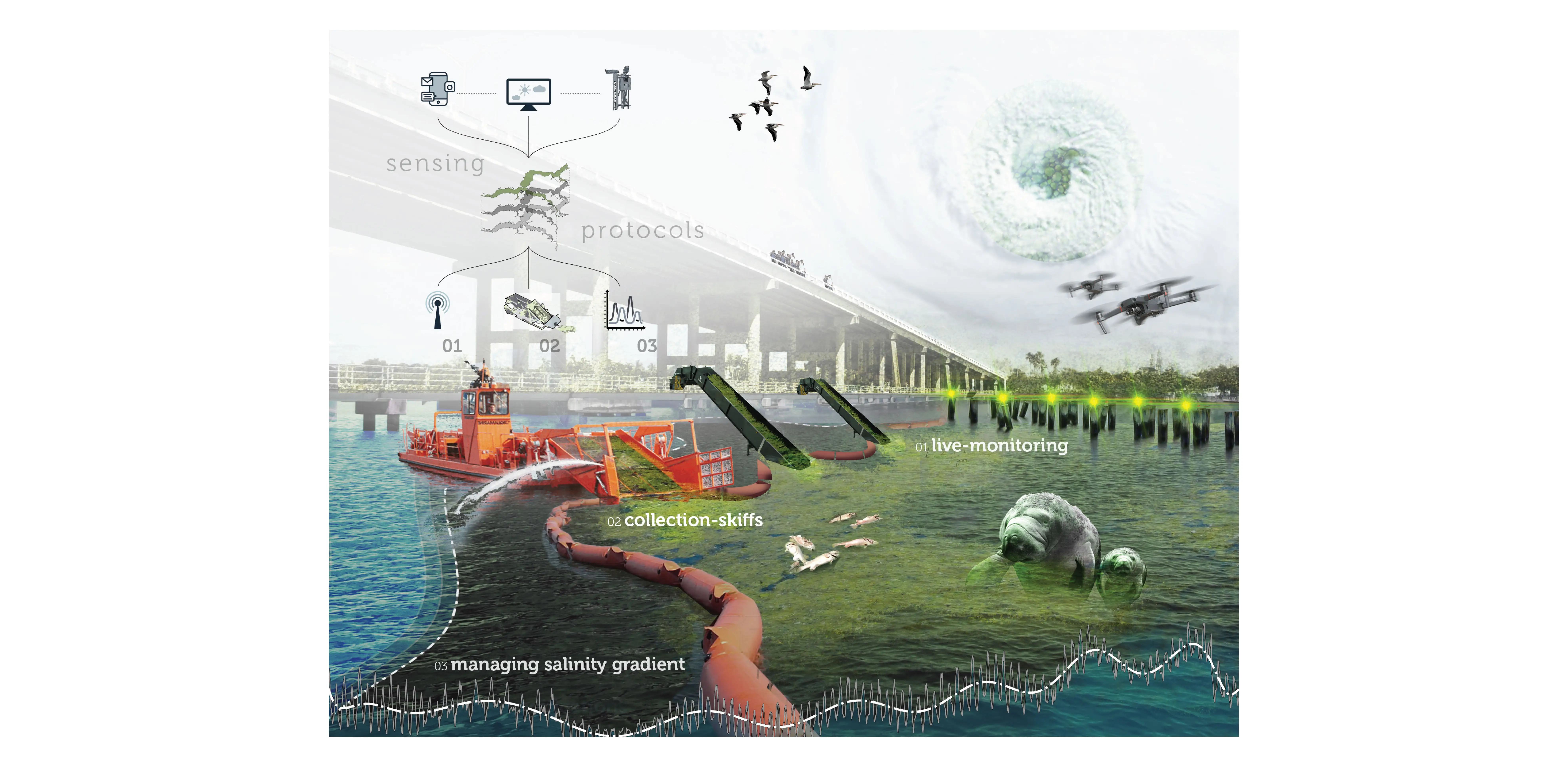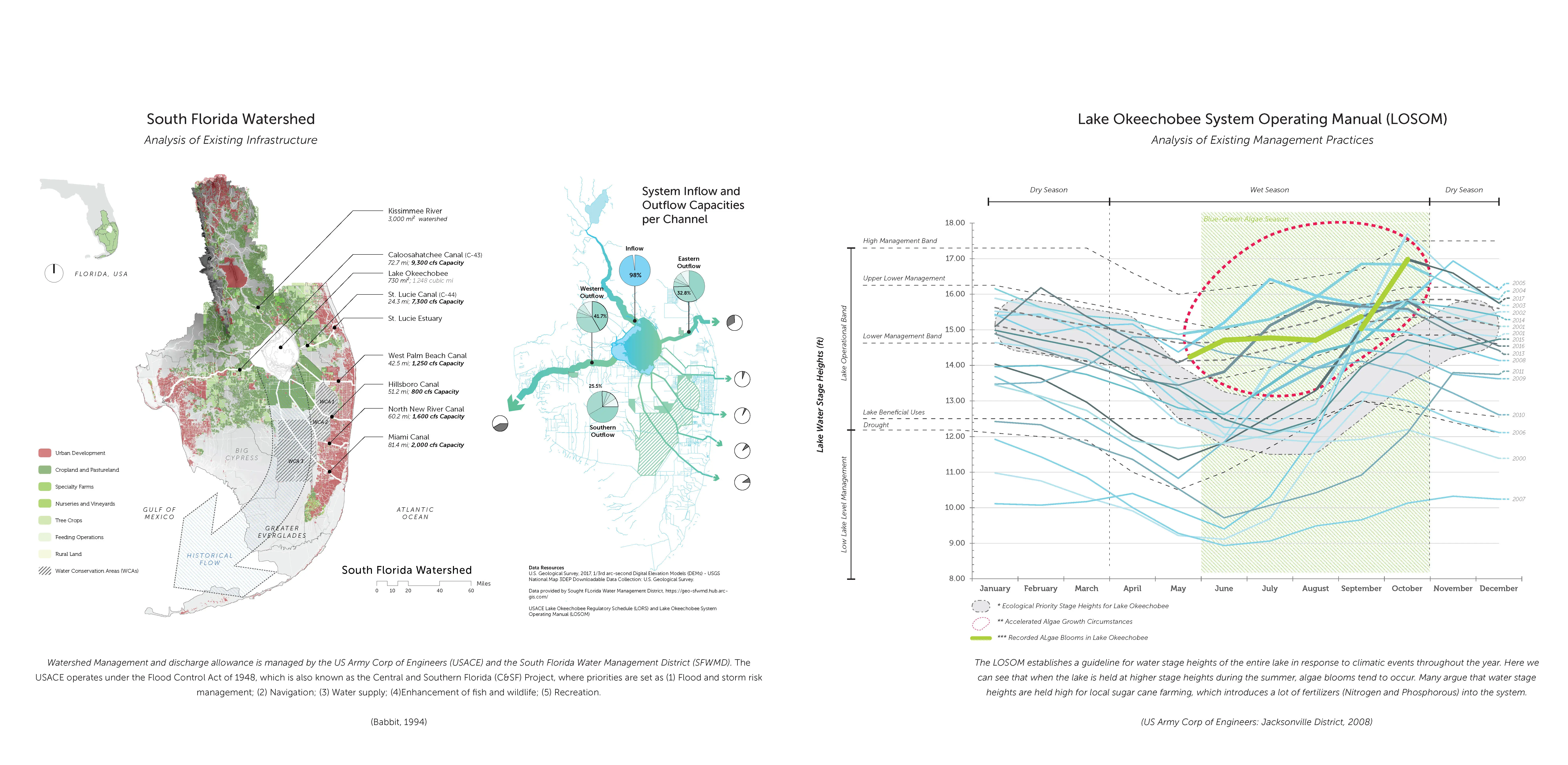 South Florida is a constructed landscape in which agencies like the US Army Corp of Engineers (USACE) and the South Florida Water Management District (SFWMD) control how water moves throughout the system. With this, USACE & SFWMD have a long list of infrastructural projects intended to recover the ongoing environmental impacts of harmful algae blooms. (Army Corp of Engineers, 2020) Informed by the Comprehensive Everglades Recovery Plan, these agencies will be working for a very long time, slowly implementing large infrastructural projects that provide minimal green infrastructure and may, subsequently, cause more long-term damage to local ecologies and natural resources. (Babbit, 2005)