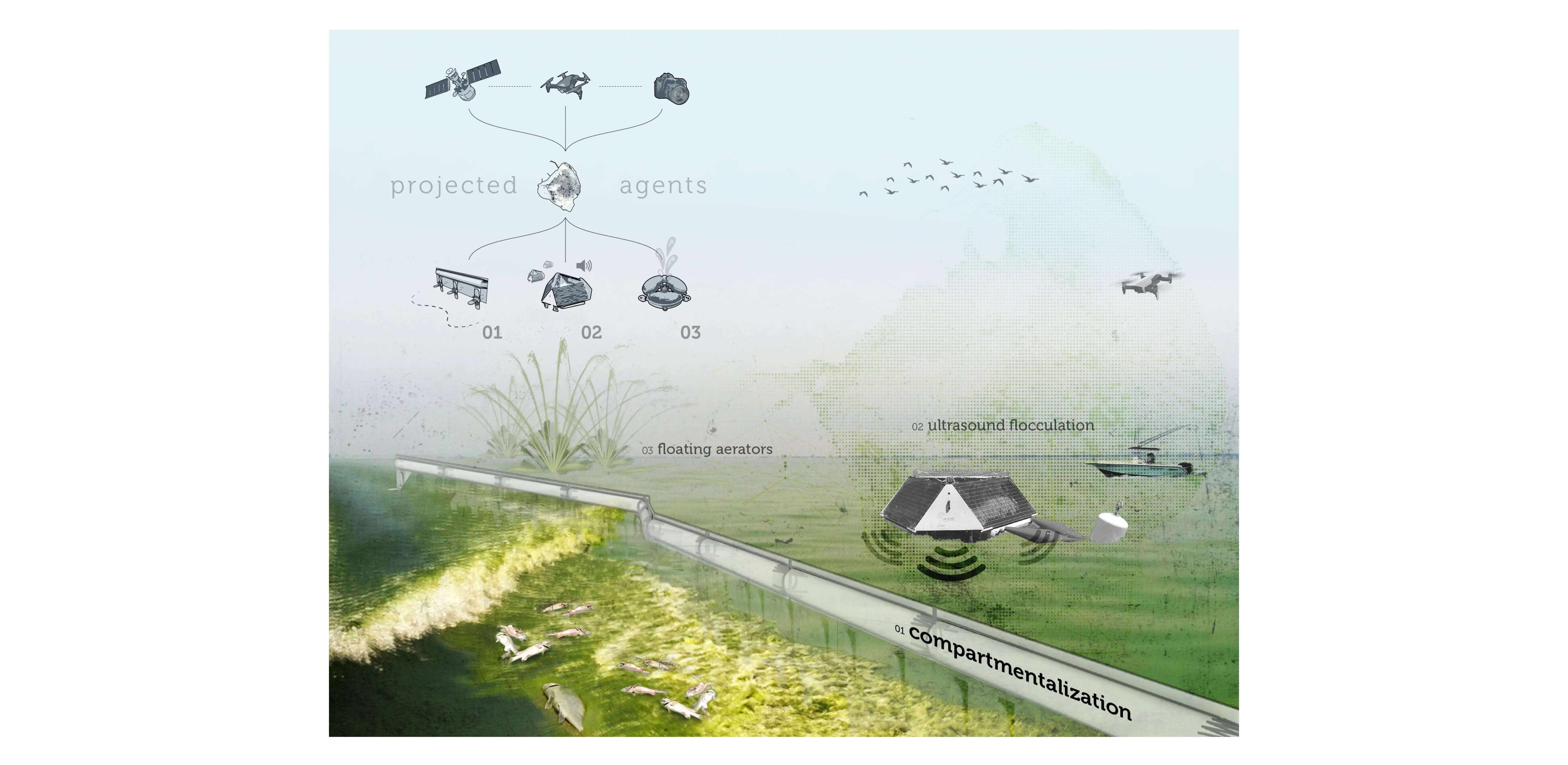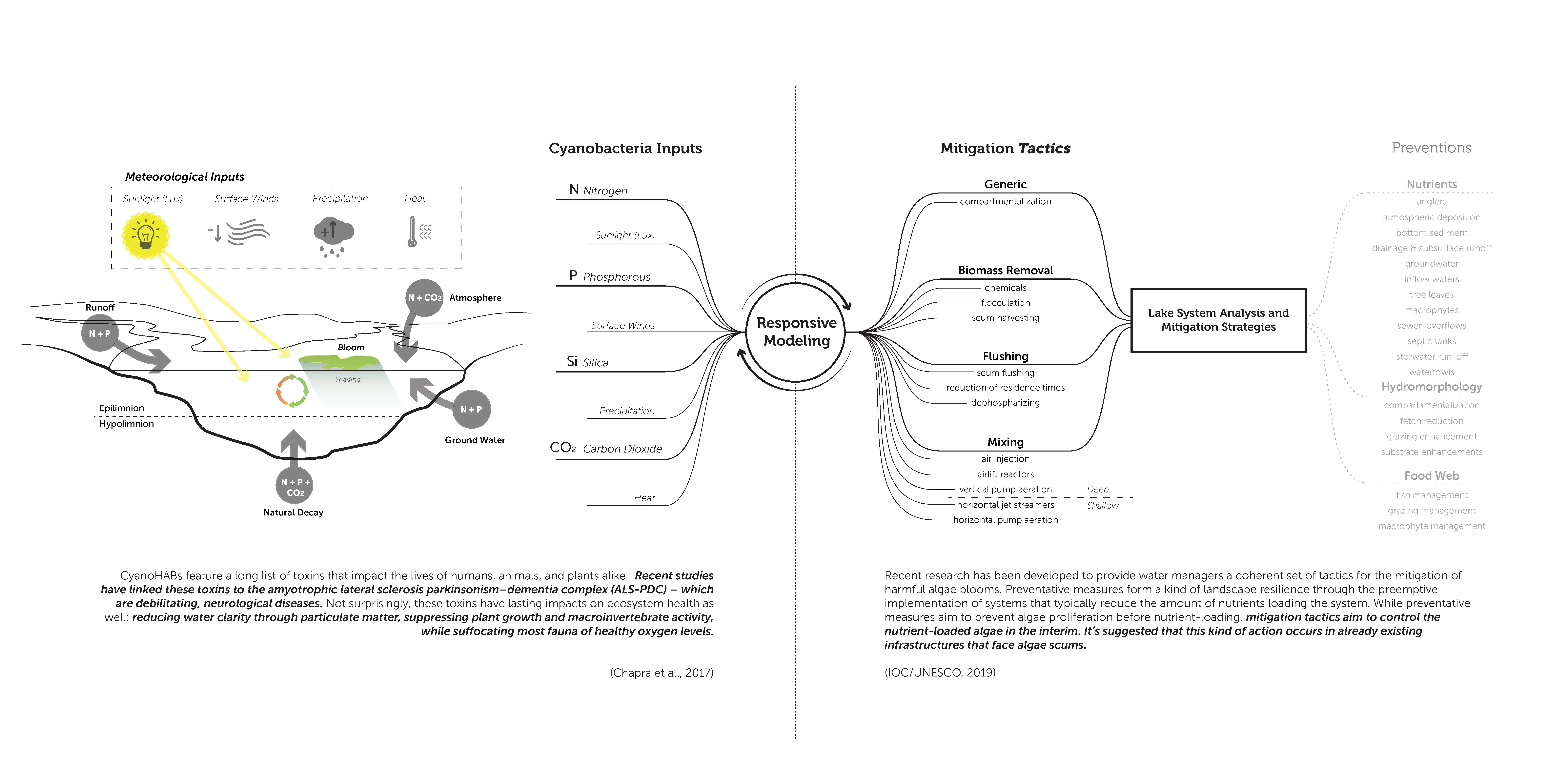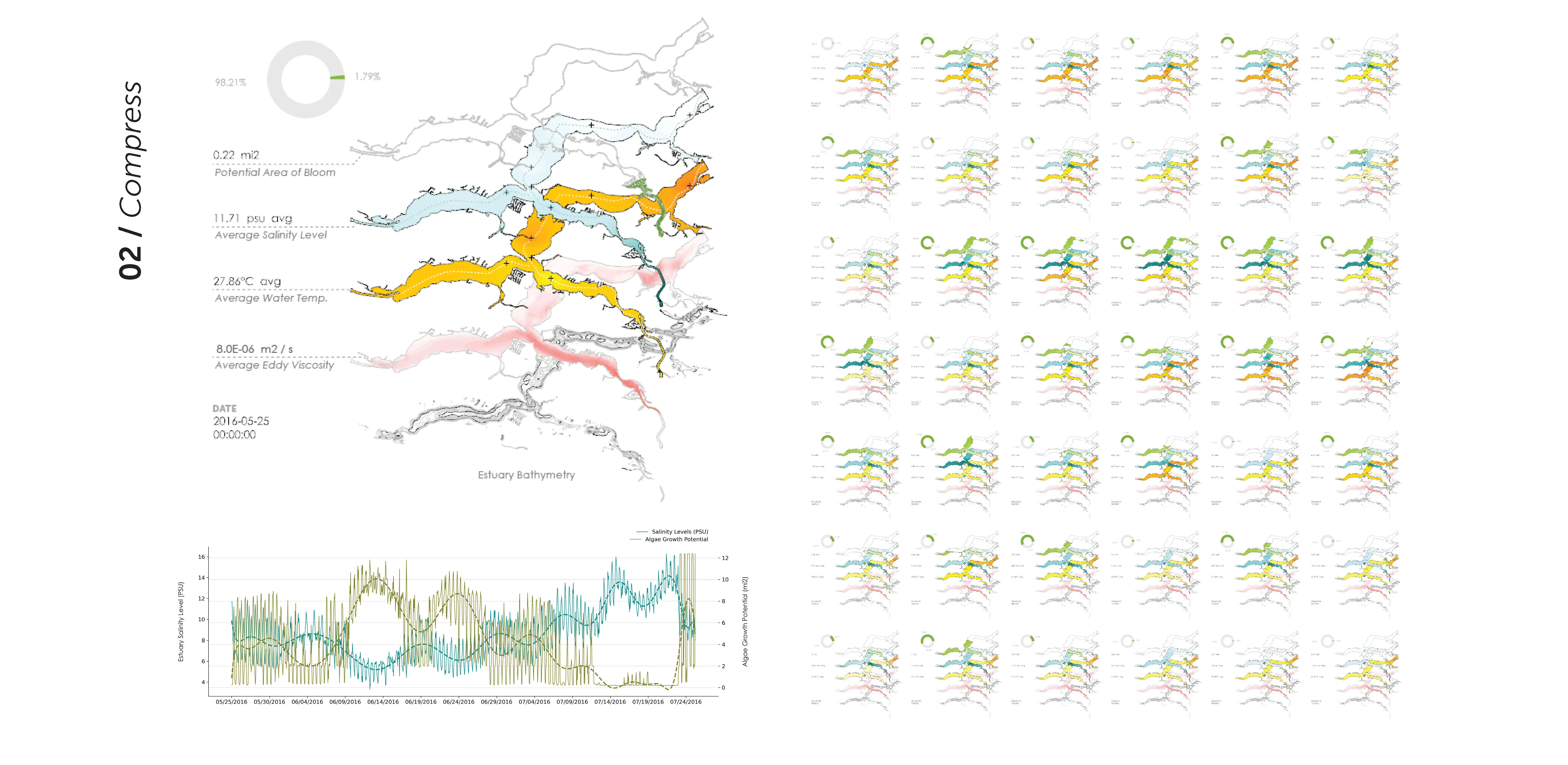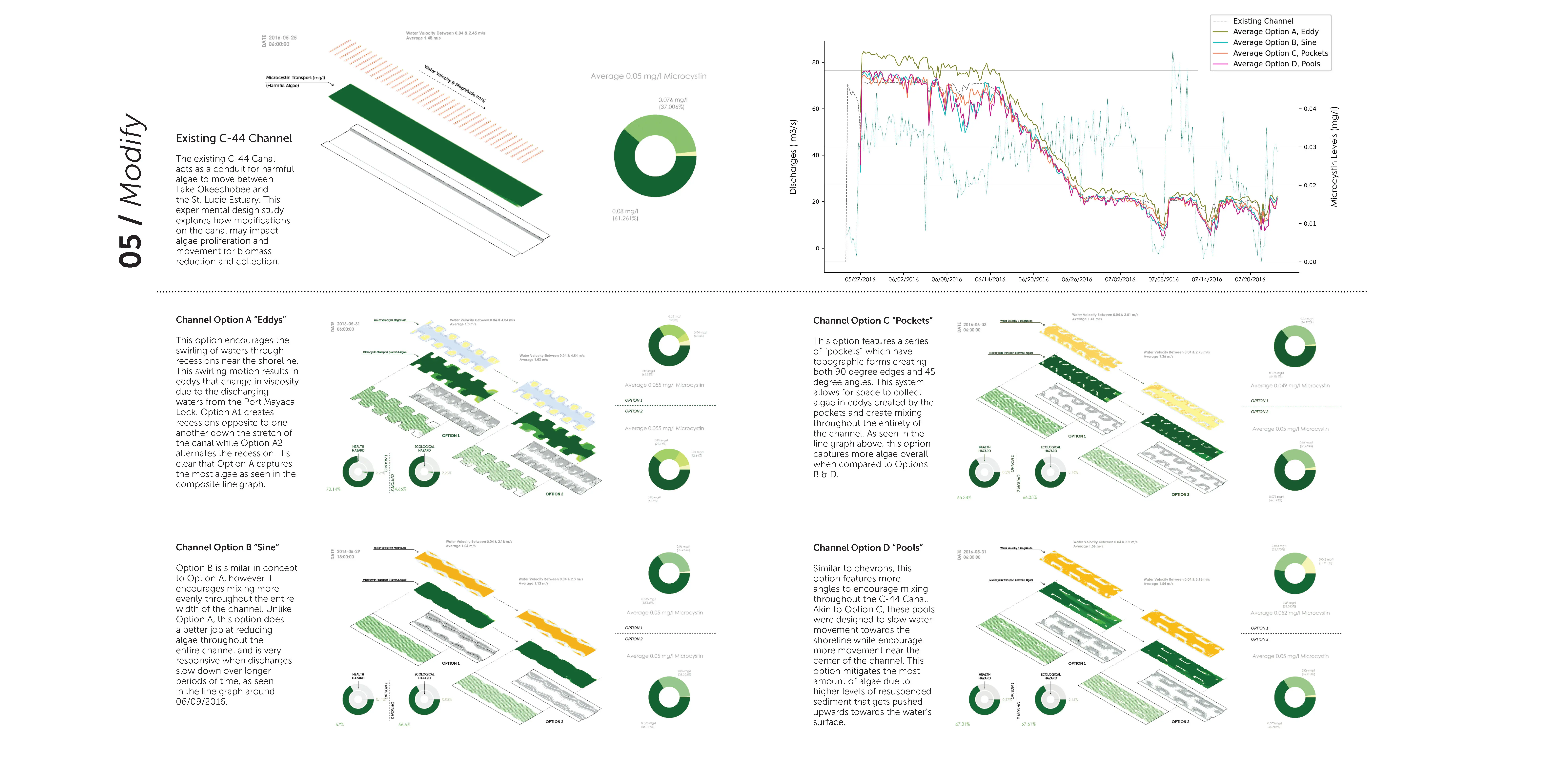 The responsive models explored throughout this project exemplify the alternative uses of large-scale infrastructure and modeling different management scenarios. Current trends in this landscape include monofunctional approaches towards solving the algae crisis, such as massive reservoirs for storing infested waters and curing said water with chemical algaecides. (USACE, 2012) This approach is, arguably, a formulaic scheme that leads to increased ecological disturbance that will not mitigate the rising trends in algae blooms and, simultaneously, kill off essential bacterioplankton communities. (Glaeser et al., 2014 & Lin et al., 2018)