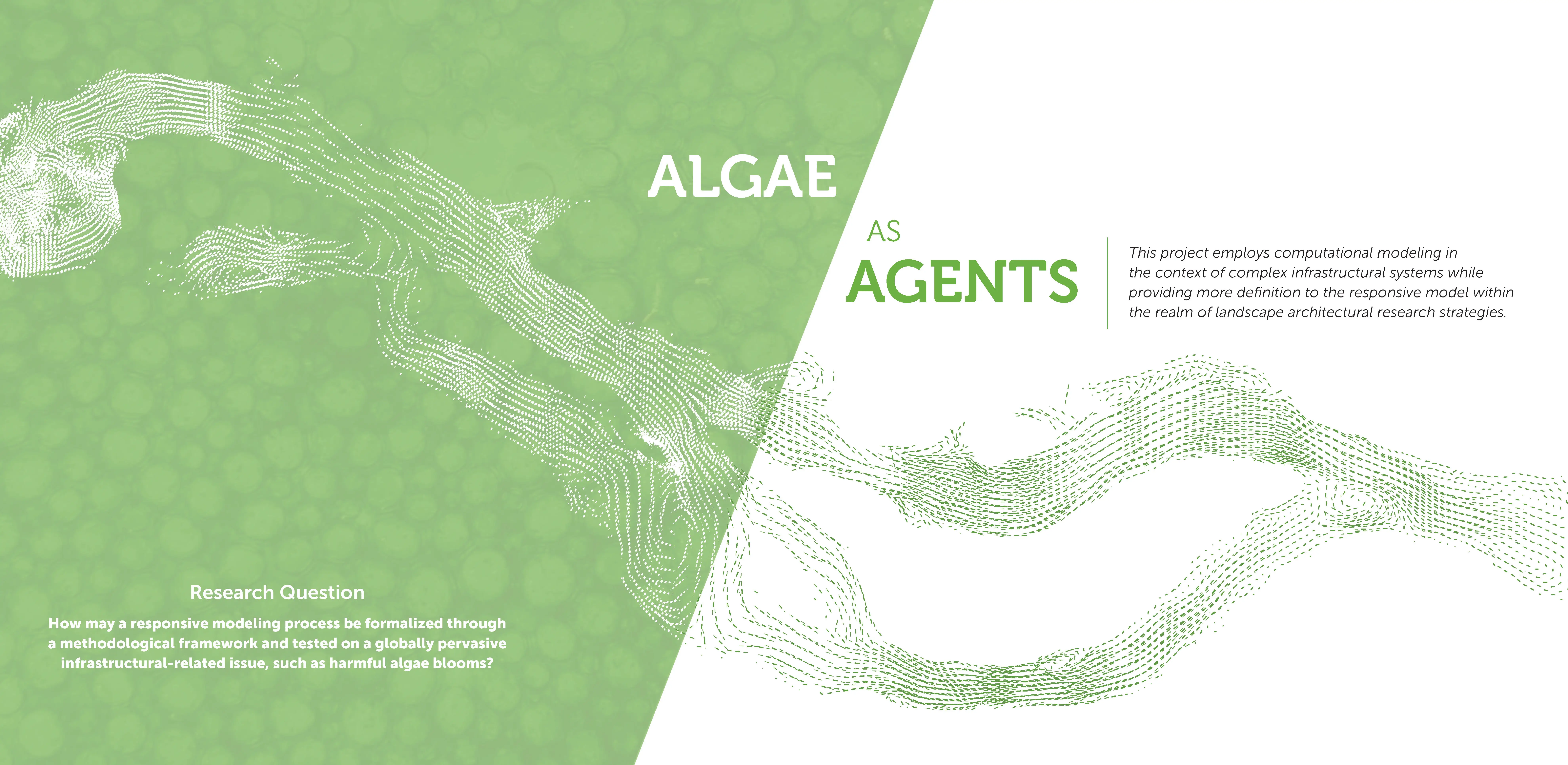 Healthy waterways and integrated water management systems are essential for a resilient future. Unfortunately, with a growing worldwide population, our waterways have seen rapid urbanization and subsequent anthropogenic impacts, including ecosystem degradation, over-extraction, and nutrient loading from various land uses. In places like the Everglades, where historical ecosystems and hydrological processes have become severed, we see how land use, habitat fragmentation, development, and coastal modification result in ecological devastation. As a means of understanding this landscape phenomenon, responsive modeling establishes a place to concurrently hinge between generating and testing hypotheses while incorporating the expanding agency of computational modeling and live data streams. Inspired by the ideas of process discourse, this project investigates the harmful recurrence of algae blooms in South Florida waterways through responsive modeling. Algae as Agents aims to define the responsive model as a research method via case study investigation and analysis; subsequently, responsive modeling practices and concepts have the potential to be translated from these case studies into the context of South Florida via projective research-through-design methodologies.