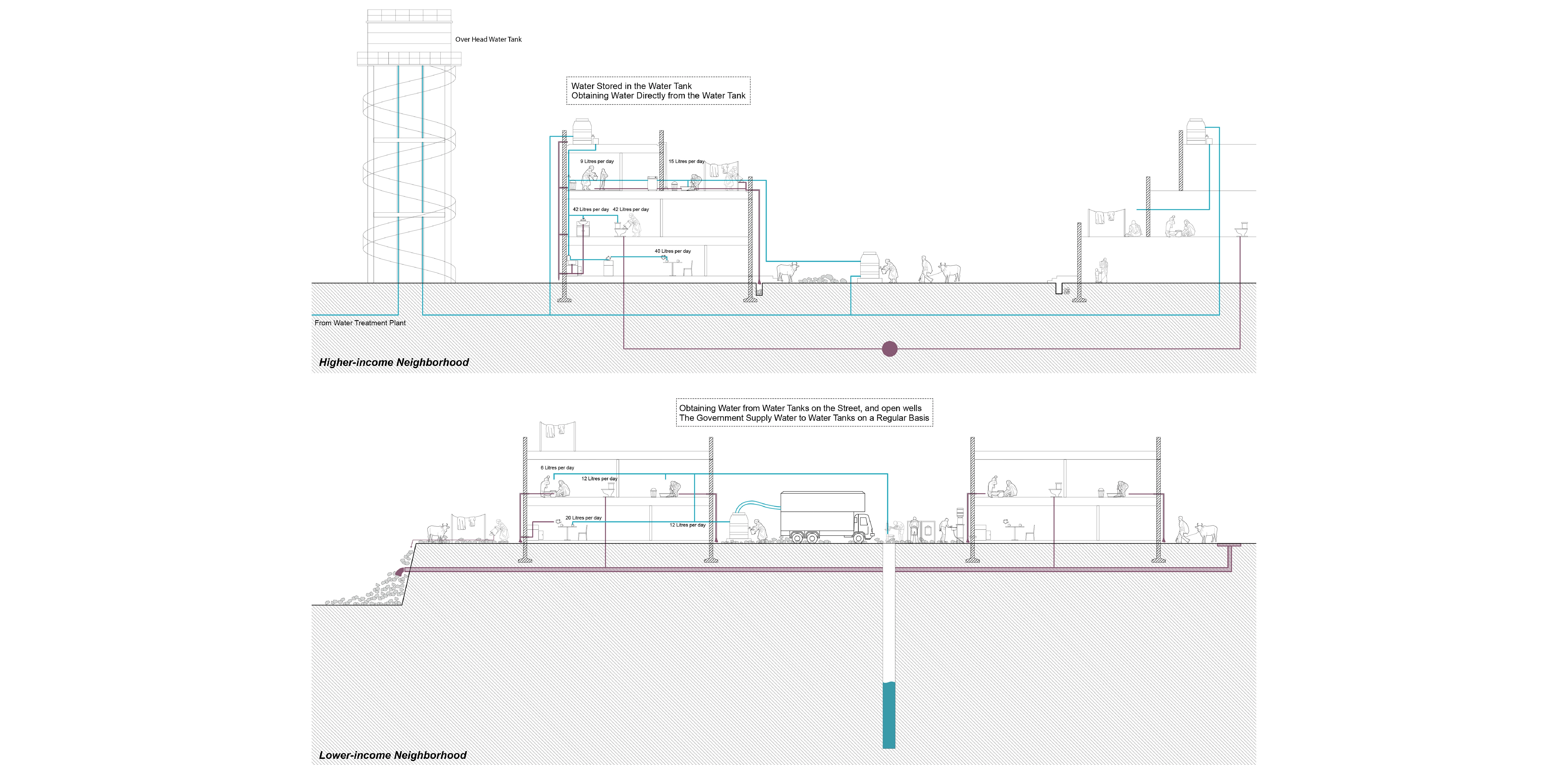 Middle-income families usually have water tanks on the roof that obtain water from the city and those water tanks provide families with water directly. They may or may not be connected to the sewage system.