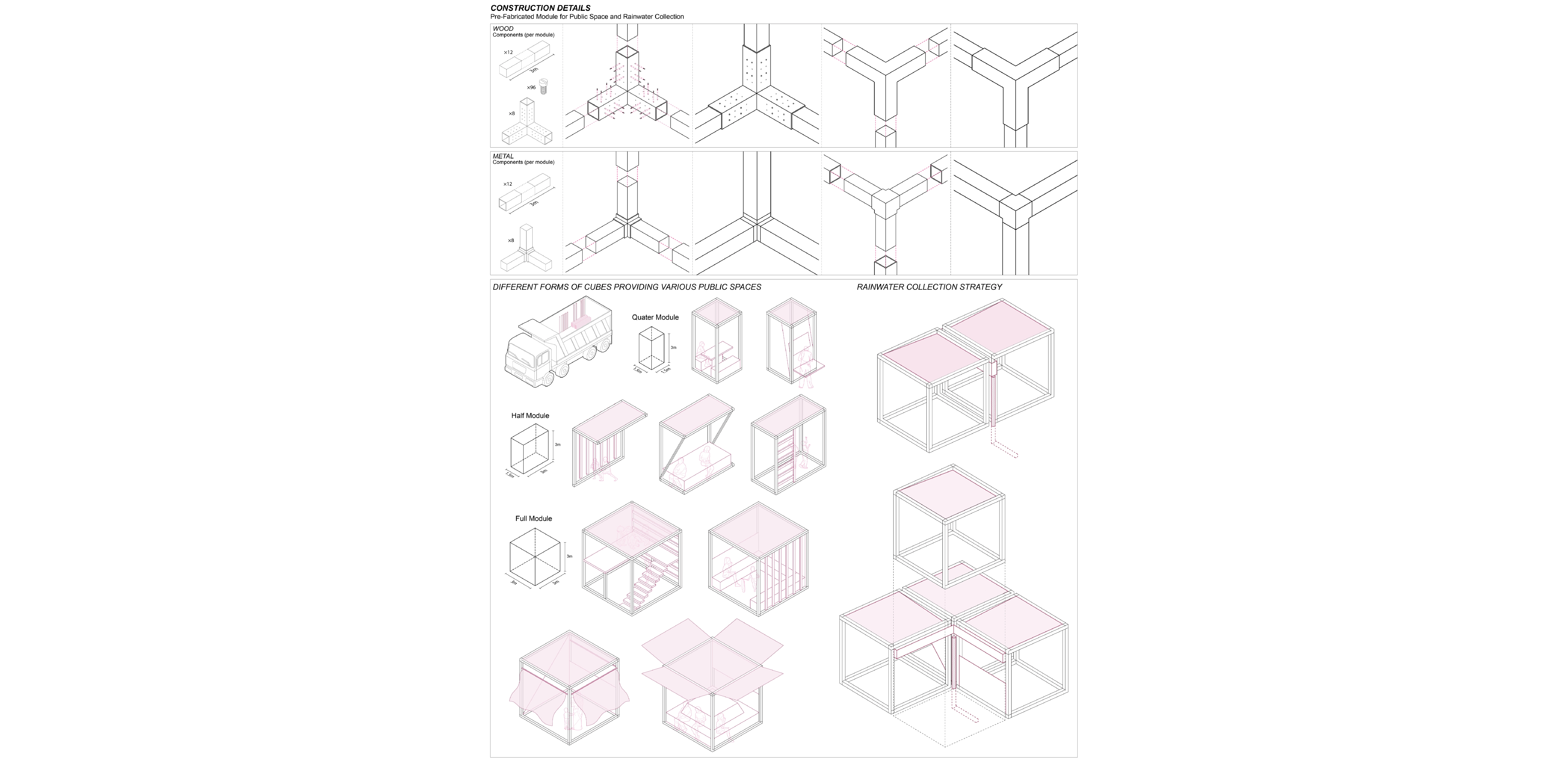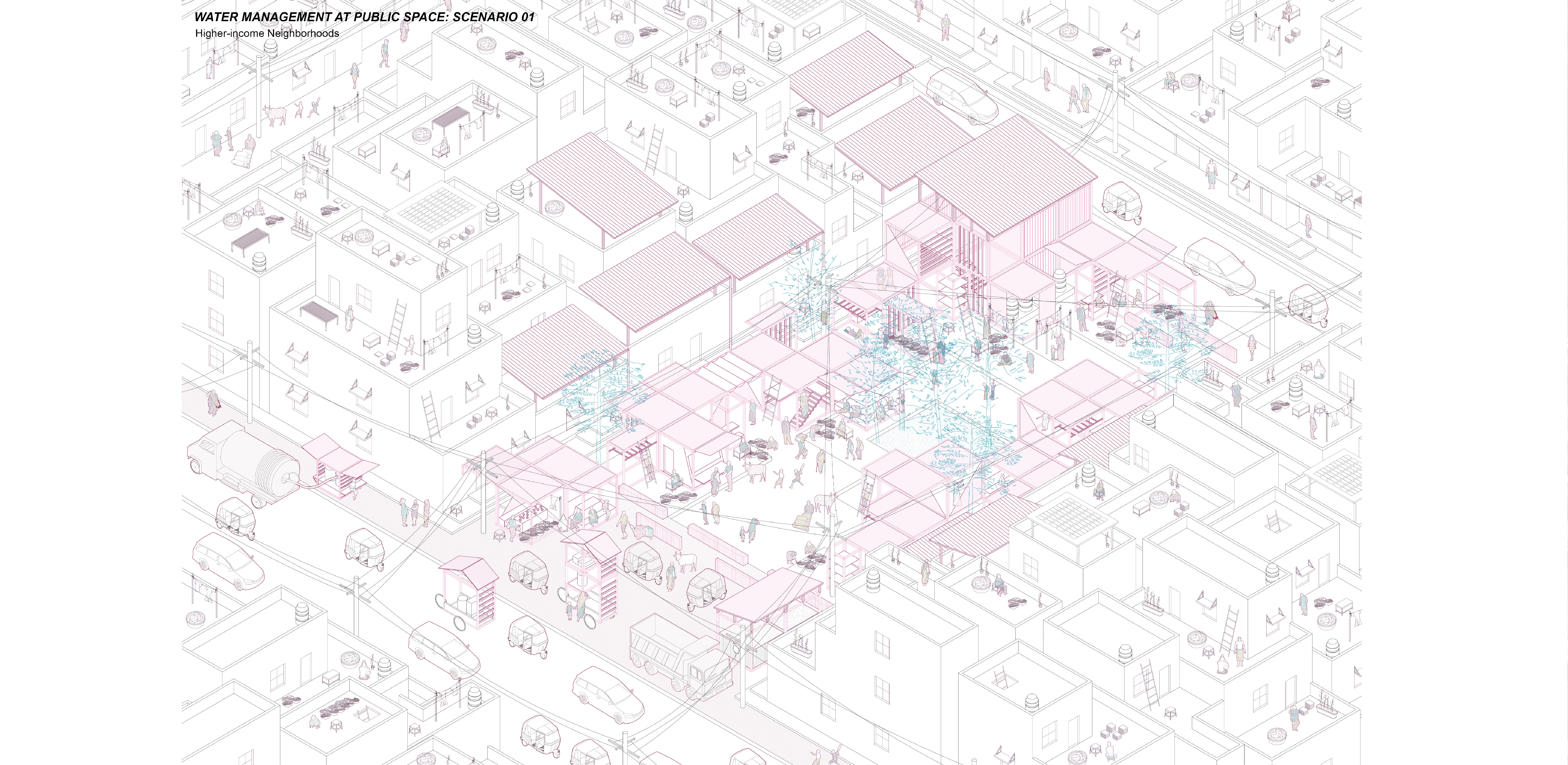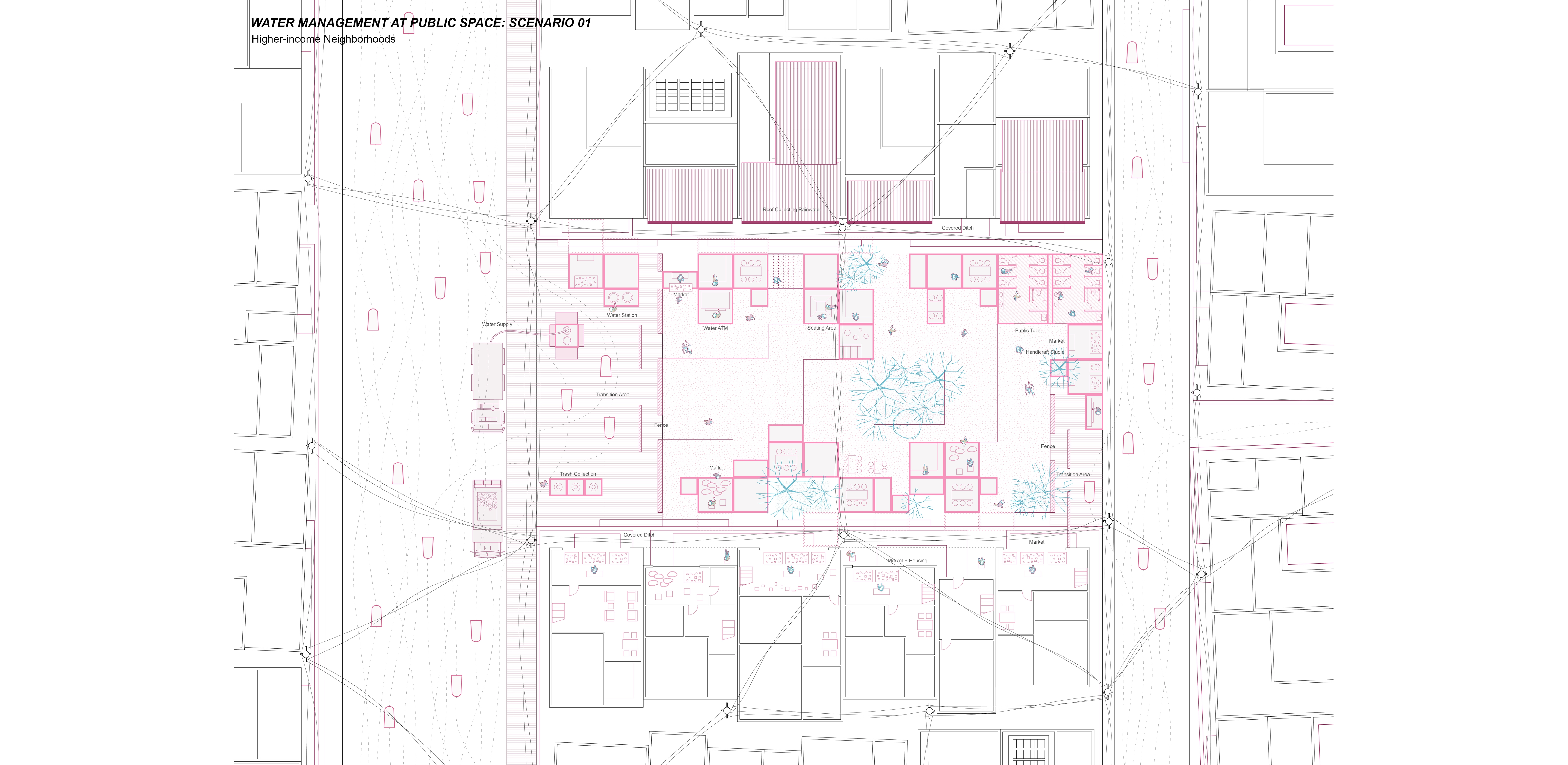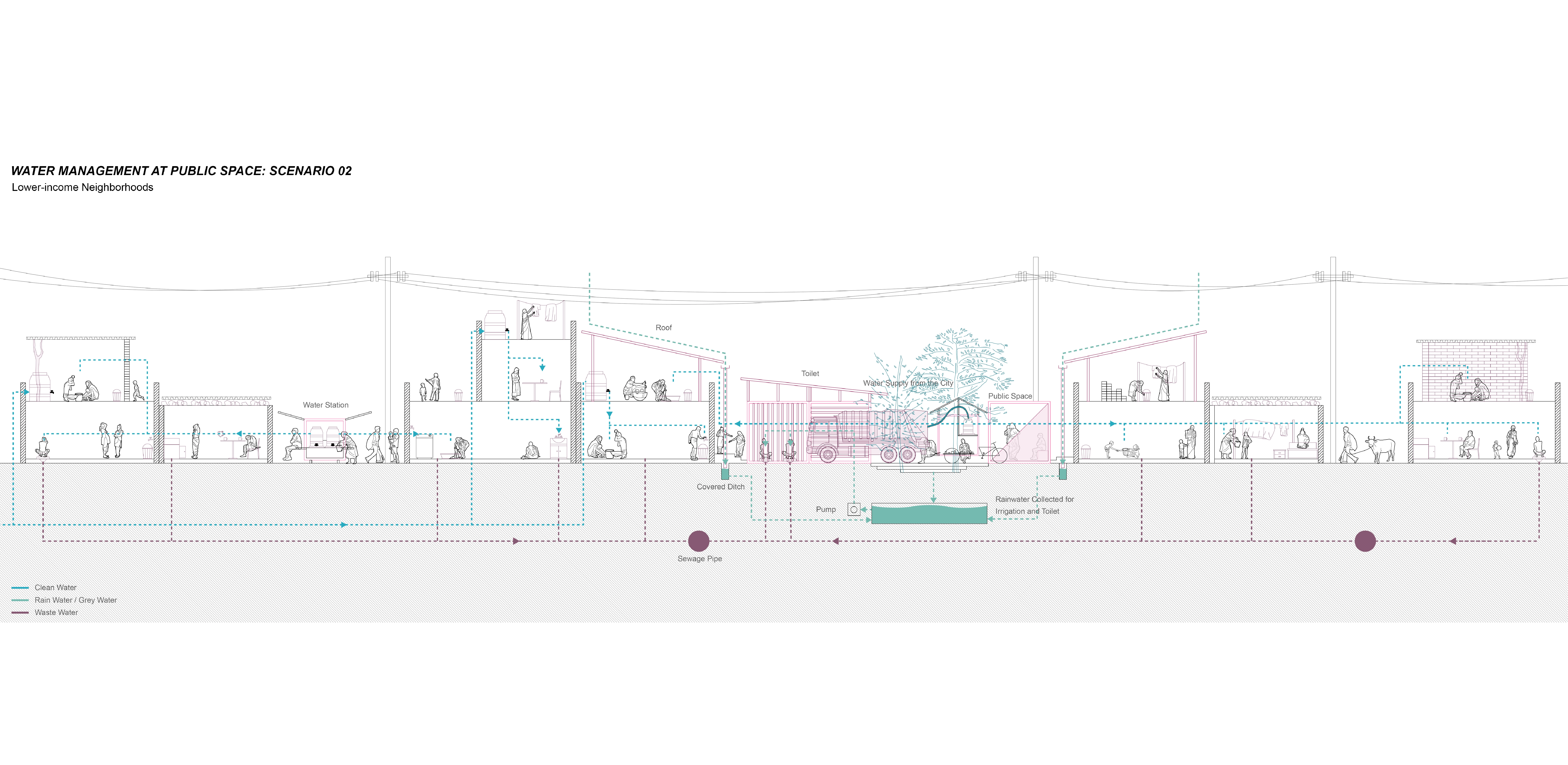 Then, a series of strategies for water management including improving current structures and building new structures are proposed, and these strategies could become a set of toolkits and prototypes that could be applied to multiple places. The whole water lifecycle - fresh water, domestic water use, waste water, and rainwater – are all considered. Prefabricated, light modular structures are inexpensive and easy to be installed at open spaces, and their dimensions are flexible according to different types of public spaces accommodating commercial and recreational activities. Potential programs of public spaces include shading area, market, handicraft studio, water supply station, water purifying station and public toilet, integrating daily activities with water use and sanitation management.