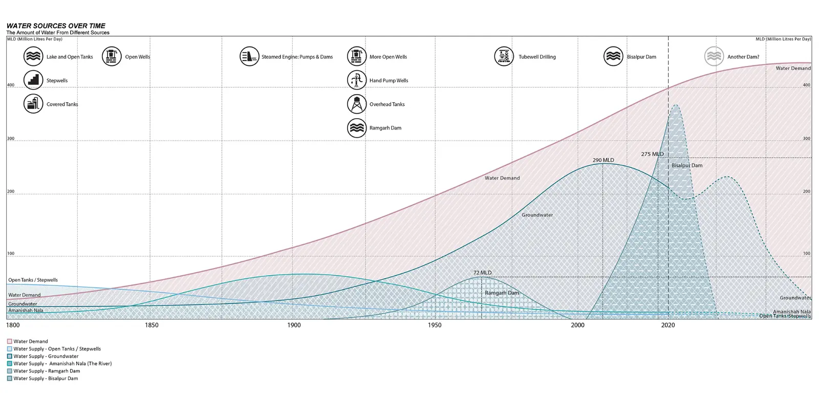 People in Jaipur have been struggling with water scarcity during dry seasons and inundation during monsoon seasons throughout history due to the semi-arid climate and improper water uses. Since the early 20th century, local water sources including waterbodies and wells have started becoming no longer accessible due to the excessive extraction. After exhausting the Ramgarh Dam 30km away from the city in 1990, Jaipur is currently heavily relying on the Bisalpur Dam, 150km away from the city. However, there are 20% of total water demands which still cannot be met, and it is projected that the city will lose this water source in less than 20 years. Additionally, the city is confronting flood issues as well; improper and informal drainage system and sewage system result in the city being filled with a mixture of rainwater, wastewater and trash during monsoon seasons.