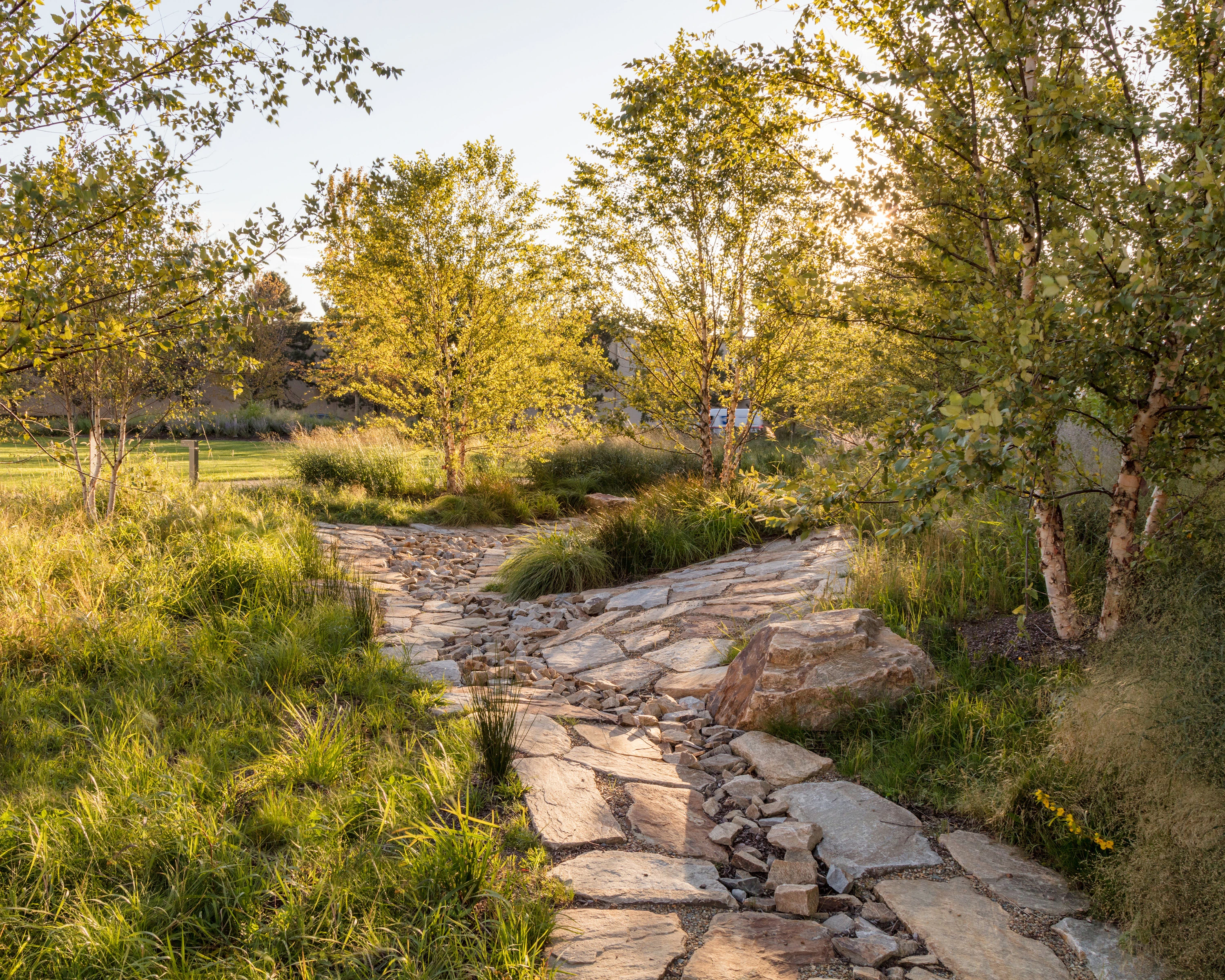MassGeneral Brigham is the largest employer, hospital network, and physician’s organization in Massachusetts. The organization sought to consolidate its administrative operations into one location to better serve its subscribers and create a cohesive campus built on wellness and cooperation. The goal for the landscape architect was to provide a series of outdoor spaces that would scale with a new 850,000-SF building, and fuse the landscape with the transit and development influences that would continue to draw new residents and visitors to the district. The campus is located in Assembly Row, a 45-acre mixed-use transit-oriented development in Somerville, MA redeveloped by Federal Realty Investment Trust. Prior to redevelopment, the site was a Ford Motor Company assembly plant and one of the region’s strongest industrial employment centers. After the failure of Ford’s Edsel Division and the construction of nearby highways, the area fell into disrepair and saw little activity until the City of Somerville’s push for urban renewal. The client found the site attractive because it provided an array of amenities for its employees to live, work, and play. To the north, the site is adjacent to the high density, mixed-use residential complex of Assembly Square. To the east, the campus is adjacent to the Assembly Row T station and a shared use path to Boston, both encouraging commuters to use public transit or bipedal transportation. The campus’s direct connection to the train station allows the campus to act as an urban portal for visitors to flow through. Despite its highly programmed adjacencies, the site had many physical challenges. Its proximity to the Mystic River, the Boston Harbor, and the Amelia Earhart Dam subjected it to risks of sea level rise and strong onshore winds. The Northern Expressway and nearby train tracks generated significant amounts of noise pollution. Since the site was originally purposed for industrial use, the landscape architect also had to address existing brownfield conditions. These site challenges pushed sustainability and resiliency to the forefront of the landscape architect’s design priorities. The design team spent months studying NOAA data of the area’s tidal changes and sea level rise projections. In partnership with an environmental consultant, the team conducted noise, sun, and wind studies to inform the design. Significant soil and ground improvements had to be made, including the removal of 3.5 feet of contaminated soil off-site. To prevent fresh soil from settling, piles were drilled 60 to 80 feet into the bedrock and filled with compacted gravel. The entire site was then capped with fresh soil to appropriate elevations that would provide resiliency to the building from the potentials of sea level rise. The landscape architect addressed other site challenges by creatively incorporating functional and sustainable green infrastructure into the open spaces. The stormwater management system features a rain garden, detention ponds, and a large bioswale that overflows into a dry creek. Altogether, the stormwater infrastructure captures 100% of stormwater on-site. The thoughtfully conceived planting design places trees and plants in critical areas to mitigate wind and noise. A linear grove of trees located at the building’s entryway portal combat 17 mph winds from a funnel wind effect. Groves of trees line the site’s open perimeters to reduce nearby street and transit noise. Overall, the design created over 1.8 acres of permeable surface and added 333 trees that sequester approximately 40,000 pounds of carbon annually. The landscape architect made a conscious effort to design these sustainable elements attractively. The sustainable hardware features are visible in the design to enhance the overall aesthetic and character of the site, as well as encourage everyday guest interaction. The rain garden, outfitted with native coastal plants, prominently intersects the formal courtyard and the connecting path between the building and parking structure. The bioswale and dry creek are created with local New England stone, and its design transitions from a structured trough that mimics the revetment stone of the nearby Mystic River into a natural, winding creek shaded by River Birch. The large detention basins blend into the 2.5-acre event lawn and complement the space’s varying elevations. Even the custom benches are made from reclaimed wood, salvaged from the client’s Charlestown site and restored to expose their natural grain. Signage around the site accompany these sustainable features and educate guests on each element’s contribution to sustainability. The client’s commitment to sustainability was not only environmental, but also social. Much of the site’s open space and even the building’s conference center is open and free for public use. The ground floor of the building’s northern edge features retail space that parallels the Assembly Square development. To bring this public-private campus to life, the landscape architect performed a range of programming and spatial studies to develop the appropriate private, semi-private, and public amenities. The design had to consider to two very different guest experiences: the 4,500 employees who use the site daily and the visitors who pass through or live nearby. The design solution achieves this by contextualizing each space with the appropriate privacy level and its intended use. Private and semi-private courtyards are work-enabled spaces designed formally on an architectural grid to promote inside-outside connections with the building. In contrast, the streetscape, open event lawn, and fitness trail are outward facing, porous, and informal, designed to encourage visitors to wander and stay outdoors. The sinuous fitness trail loops around the lawn and guides guests on a journey through groves of Maple, Gingko and Redwood. The event lawn hosts company and community events throughout the yea
