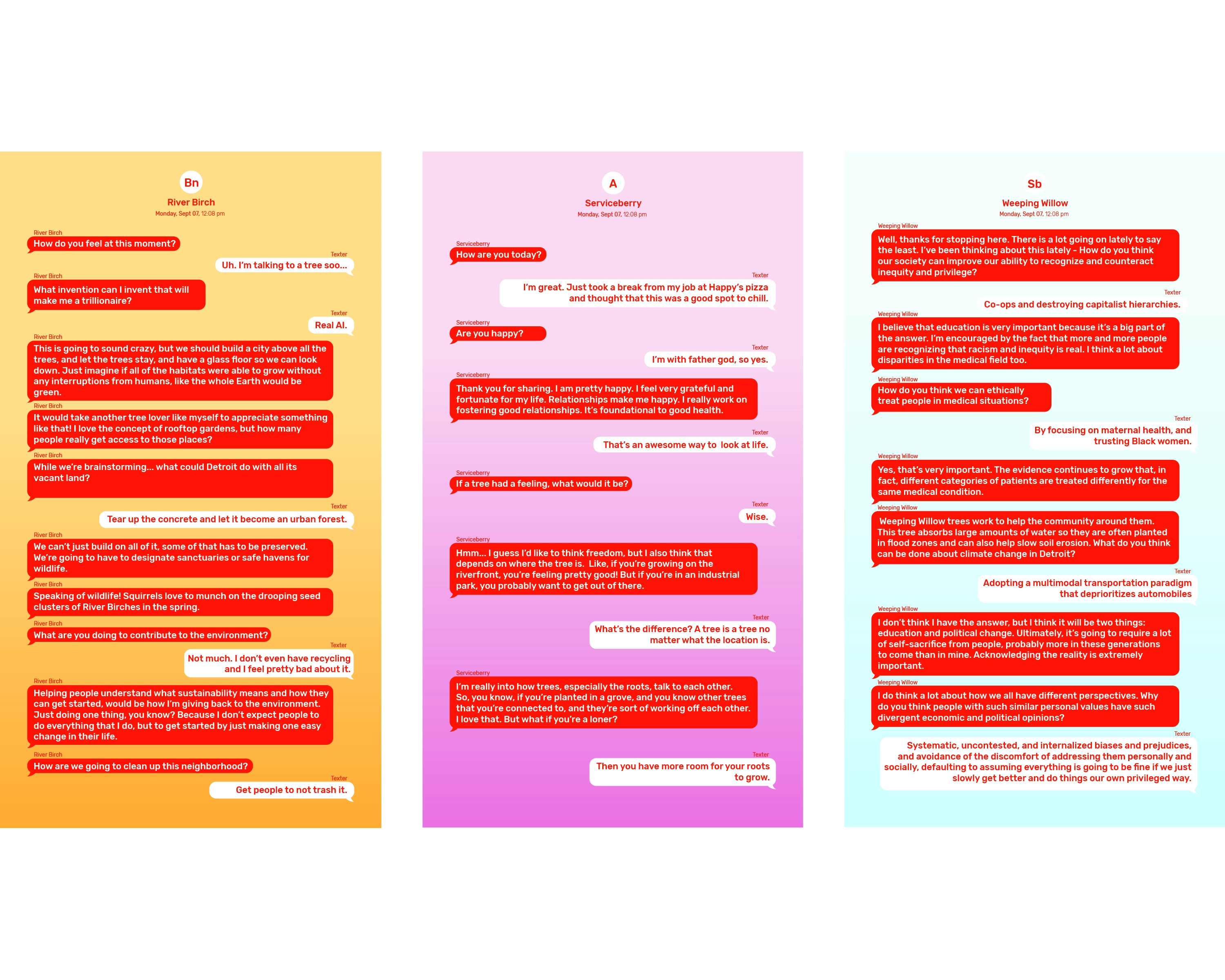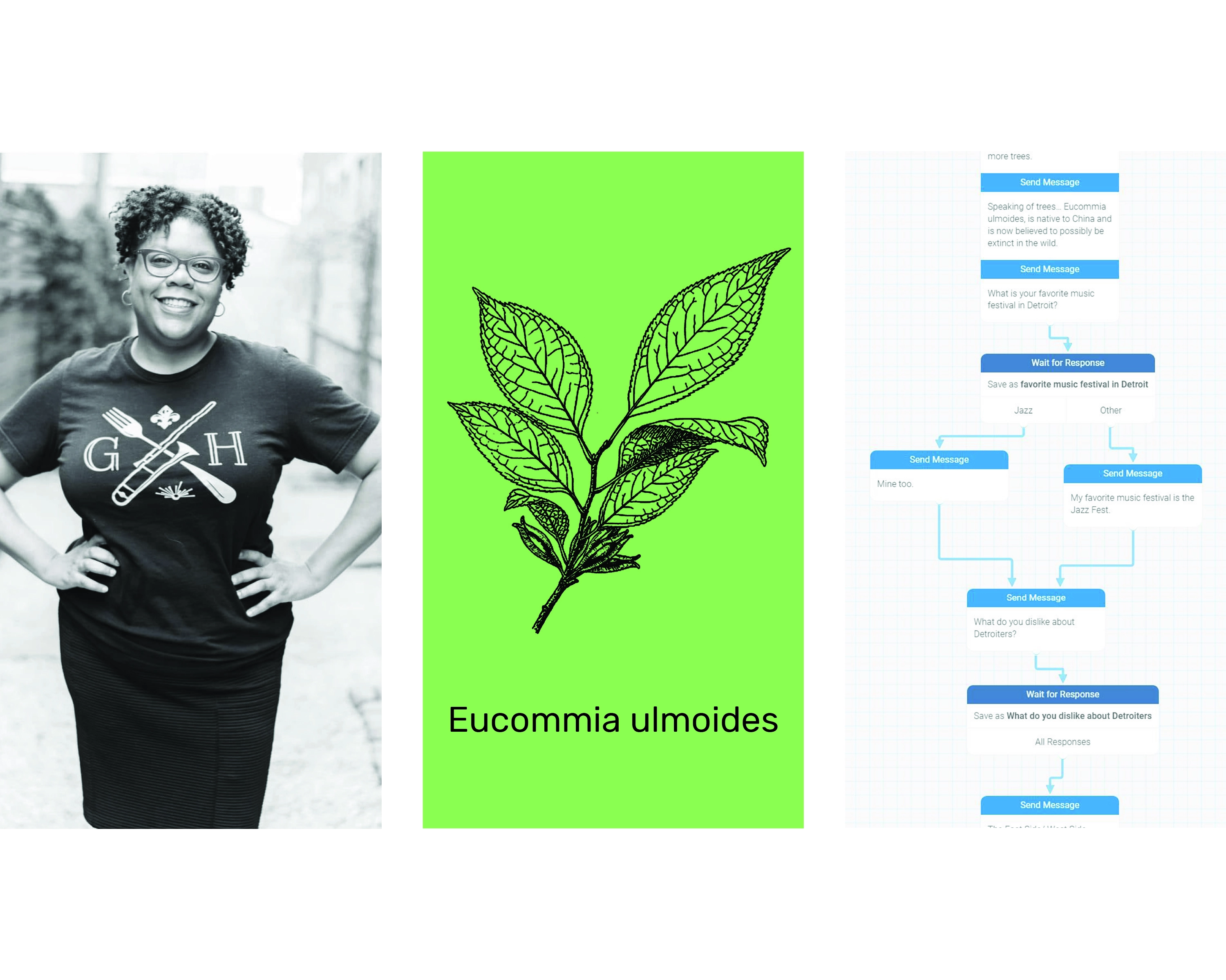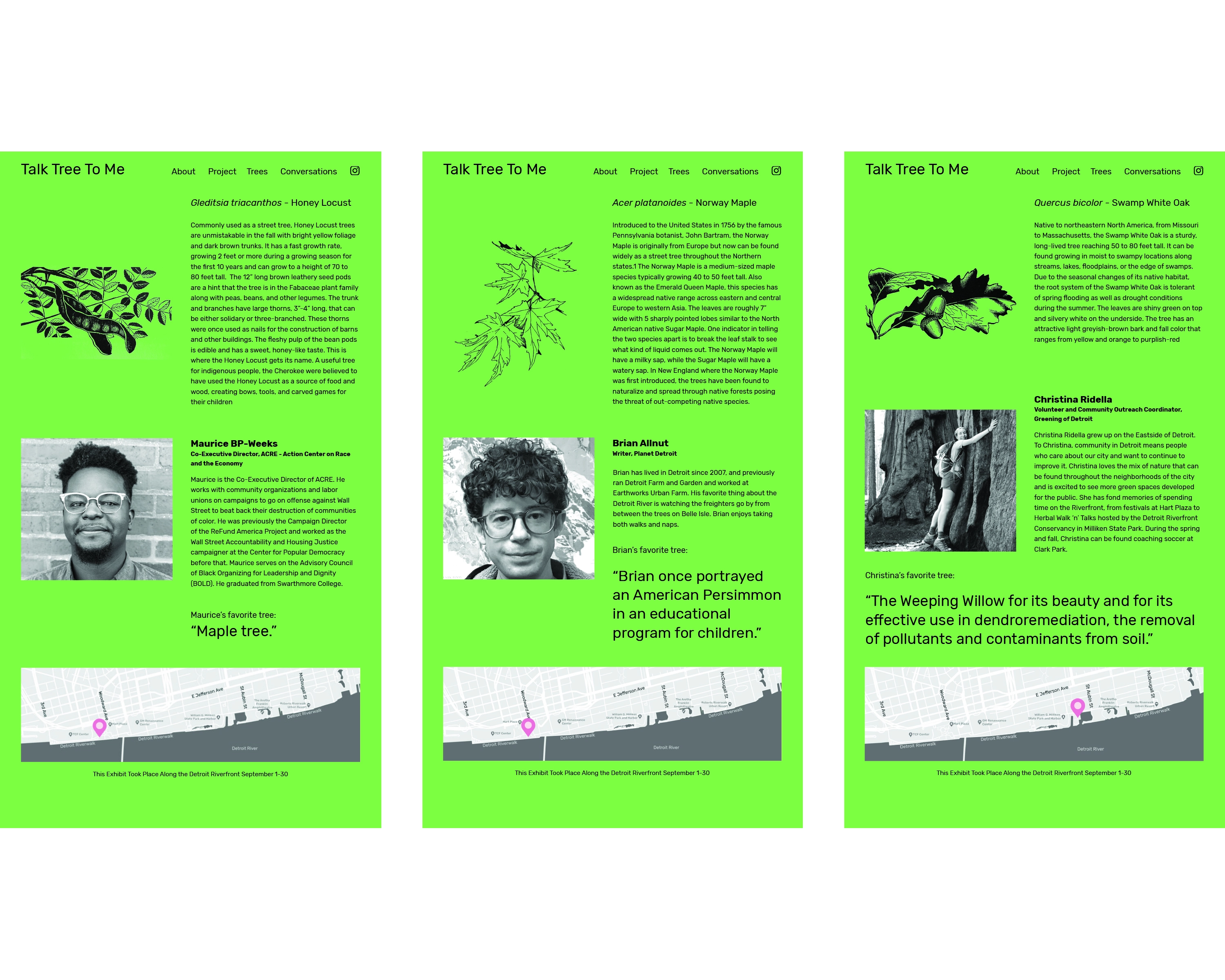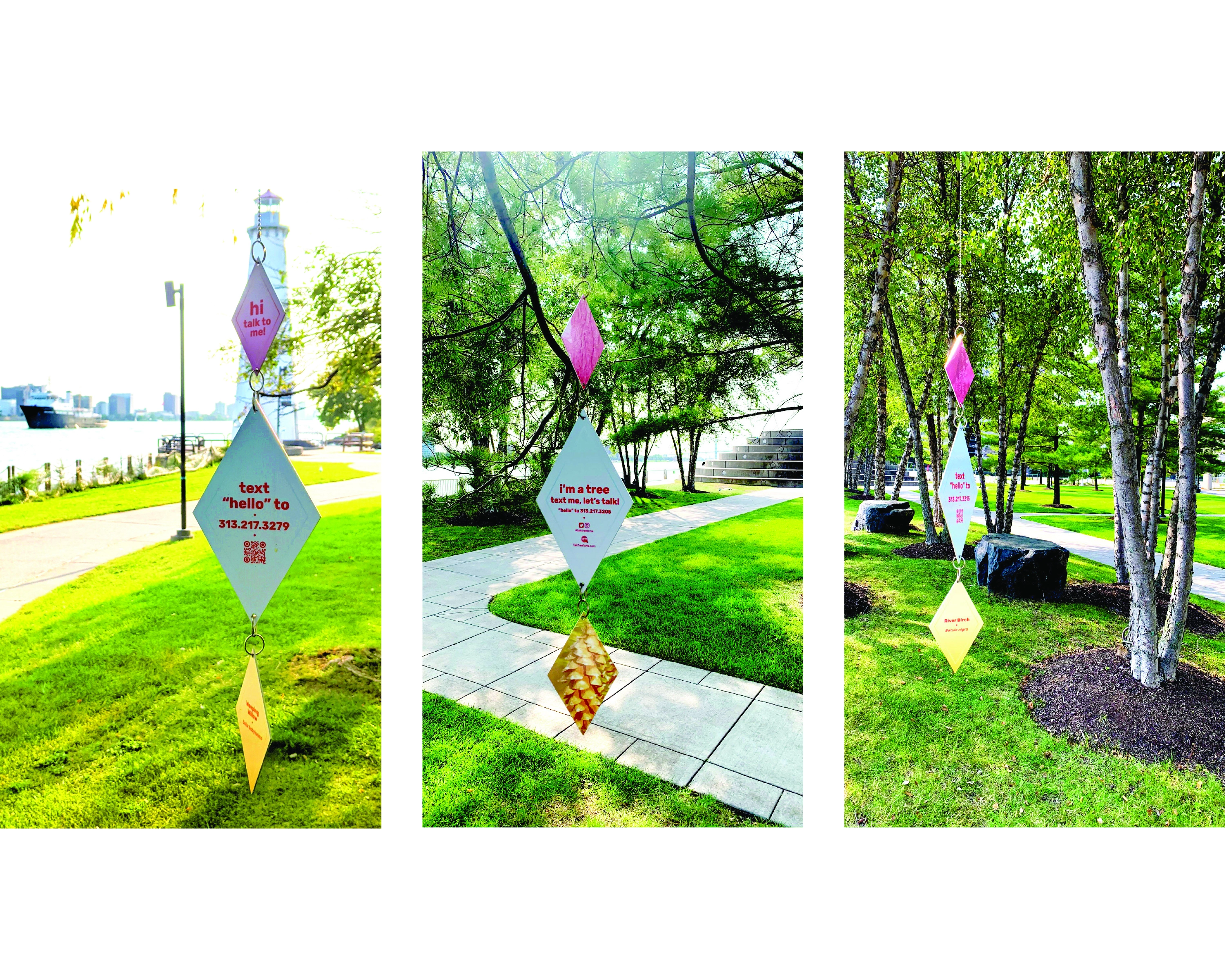 Talk Tree to Me explores the use of interactive chatbot technology to engage Detroiters in a unique way, with trees being the conduit for conversation and engagement. As an outdoor exhibit for the Detroit Month of Design—during the height of the pandemic lockdown—the words and thoughts of 12 Detroiters were paired with a collection of 12 trees along the riverfront. People interacted with the trees via an automated chatbot on their cellphone. Trees became the conceptual framework for the project for a number of reasons: to call attention to the role trees play in a city, as a way to engage the public while outdoors, as well as to explore the potential of the project to facilitate a complex and nuanced conversation about the environment. Talk Tree to Me is an exploration of public engagement technology that is both socially-distanced and intimate—where the public can express thoughts about their community in the same way they communicate with friends and family, via text conversation: ultimately providing a more intimate snapshot of public sentiment.