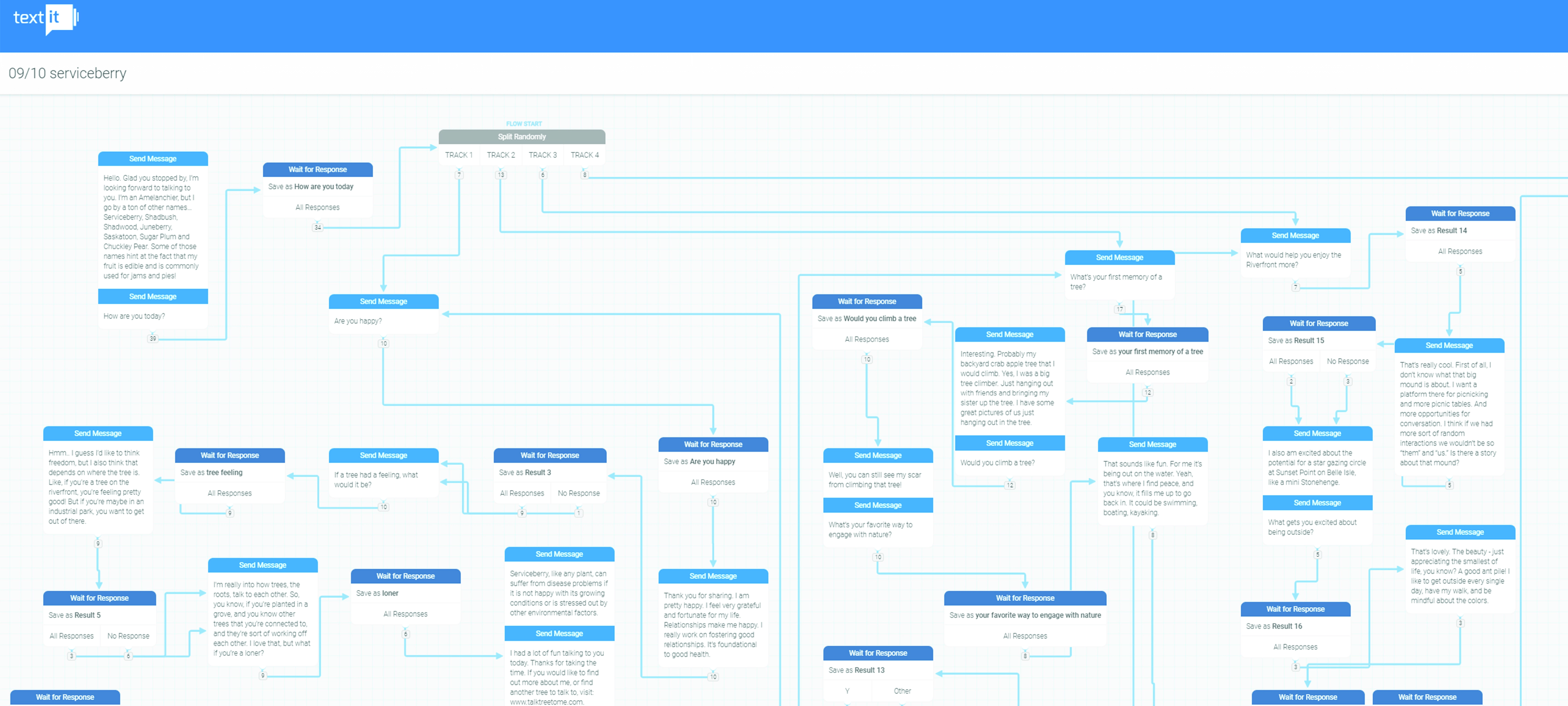 Project Brief: Talk Tree to Me is an interactive design project that was installed for the Detroit Month of Design—a month-long design festival taking place during the height of the pandemic in September of 2020. The project is a collaboration by Spackman Mossop Michaels (SMM)—a landscape architecture and urban design firm in Detroit and New Orleans—and its partners Detroit Riverfront Conservancy and Sierra Club Michigan Chapter. The project is part urban eco-scavenger hunt and part interactive exhibit. Detroit residents explored the Detroit Riverfront throughout the month and interacted via text message with a collection of 12 trees, each a different species common to Detroit, that had been programmed via an automated chatbot technology with the real-life thoughts and questions of local Detroiters. Concept: Urban trees make a city livable. They create shade, capture carbon to combat climate change, and clean the water. They prevent flooding, provide bird and wildlife habitat, and produce oxygen for us to breathe. They alleviate stress, improve health outcomes, and create economic growth. They are places of memory, community gathering spaces, and symbols of cohesive social life. Urban trees are a nuisance. They grow and crack driveways and sidewalks, drop leaves and limbs onto roofs and into gutters, fall and destroy houses. They clog city infrastructure, block city streets, and break electrical power lines. They cause friction between residents and the city over maintenance, arguments between neighbors over property damage, and are symbols of hopelessness and loss when left standing dead for decades. The relationship between communities and trees is complex. Beyond these “tangible” issues of value and cost, trees are tied to larger cultural narratives about identity, race, wealth, and justice. At the city level, trees are intricately woven into ideas of political autonomy, power, control, and care. Even neighbor to neighbor, trees are often seen as symbols of class, character, and politics. Talk Tree to Me was created to facilitate a conversation about trees in Detroit, using trees themselves as the vehicle of conversation. It does not hope to answer these far-ranging questions in a definitive way. Rather, the goal is to open a space for conversation and simultaneously encourage people to stop and pay attention to the trees in their city. While experiencing the early stages of a global pandemic in 2020, Talk Tree to Me—as an entirely outdoor and technology-based project—facilitated an opportunity for Detroiters to interact with one another and create meaningful conversations in a safe way. Interaction: Spackman Mossop Michaels (SMM) invited 12 Detroiters from diverse backgrounds, ranging from age 10 to over 60, to become the voices and personalities for 12 trees of different species found along the Detroit Riverfront. Through a series of 30-minute interviews, participants formulated the questions and set the topics their respective tree would discuss with the public via text message. Once the trees and interviewees were paired, a conversation dialogue was designed from the interview transcripts to create a dynamic conversation for each tree. The prompts and questions each tree asked are derived directly from the interviews. For example, the prompt from the tree—a Dawn Redwood in this instance—was taken directly from the interview with Detroit resident Rayshaun Landrum: Dawn Redwood: It’s strange, when I travel sometimes, I think about how you can be in such different places at the beginning of the day and the end. It makes you think, is this all even real? How do you know if this is all real what we experience every day? Texter23: Good question. Very matrix! Dawn Redwood: Oh, I like that perspective. I think it is the things you can see and touch that make things feel real. While the conversations generally revolve around the theme of trees, the space was opened for a wide-ranging conversation. Not every question, or response, from the tree is about trees. Sometimes the conversations focused on what it means to live in Detroit, or simply favorite things to do. The trees became the conduit for a conversation between Detroiters about trees, but also about what it means to live in Detroit. River Birch: While we’re brainstorming… what could Detroit do with all the vacant land? Texter24: Tear up the concrete and let it become a urban forest River Birch: We can't just build on all of it, some of that has to be preserved. We're going to have to designate sanctuaries or safe havens for wildlife. River Birch: What are you doing to contribute to the environment? Texter24: Not much. I don't even have recycling and I feel pretty bad about it Included in these conversations are interesting facts about the particular tree species. These “Tree Facts” shed light on both positively and negatively viewed attributes and impacts on the community around them to initiate a more dynamic and candid conversation. Ginkgo: TREE FACT: Ginkgo trees are deciduous, and the leaves turn a beautiful bright yellow in fall. Ginkgos also have separate male and female trees. The fruit of the female trees is very stinky! Ginkgo: Are you willing to climb a tree? Texter18: One of my favorite past times as a kid Process: SMM programmed each of the tree dialogues through a chatbot program called TextIt. The conversation provides automatic responses from the tree based on user interaction as well as alternative paths for the conversation to flow based on how the texter chooses to answer. This variability allows a texter to have multiple unique conversations with a given tree. To engage the Detroit community, SMM created the website, www.talktreetome.com, to convey the project’s purpose, location, participant bios and instructions on how to interact with the trees. It also became the platform for sharing the results at the close of the month-long interactive period, so that the thoughts and insights f