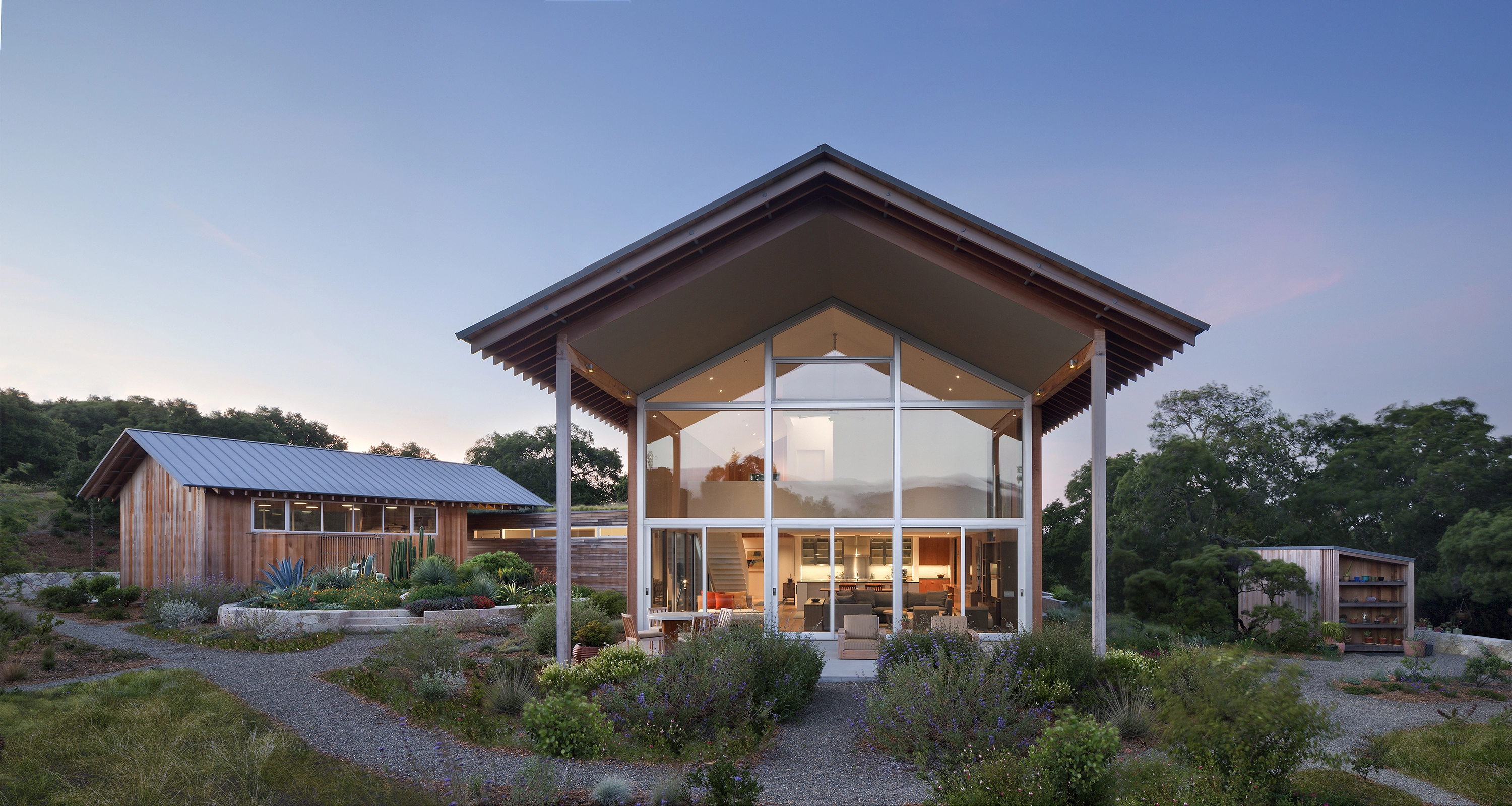 This hillside property evokes the natural character of an adjoining 90-acre oak woodland regional preserve. Eschewing fencing and lawn, the highly-textured design uses native plantings throughout a contemporary compound of interlinked residence and studios. The horticulturist-owner envisioned a landscape that welcomed wildlife, provided habitat and offered an opportunity to experiment with the diversity of regional plantings. Rainwater harvesting, permeable surfaces, drought-tolerant plants and a greywater irrigation system enforce the goal of conserving resources, resulting in landscape irrigation that uses only 33% of its county-mandated allotment. An insulating roof garden of native grasses and wildflowers blends the shed-style architecture to the site. Reflecting the client's artistic interests, a sculptural planting bed of rough-hewn stone frames their extensive succulent collection in the central courtyard. Thoughtful siting preserved a manzanita grove, safeguarded existing oaks, and framed wide views from both winding paths and interior spaces. This property now seamlessly blends with its majestic surroundings at both ground and roof levels, respecting and extending the qualities of the neighboring nature preserve and its pristine California landscape.