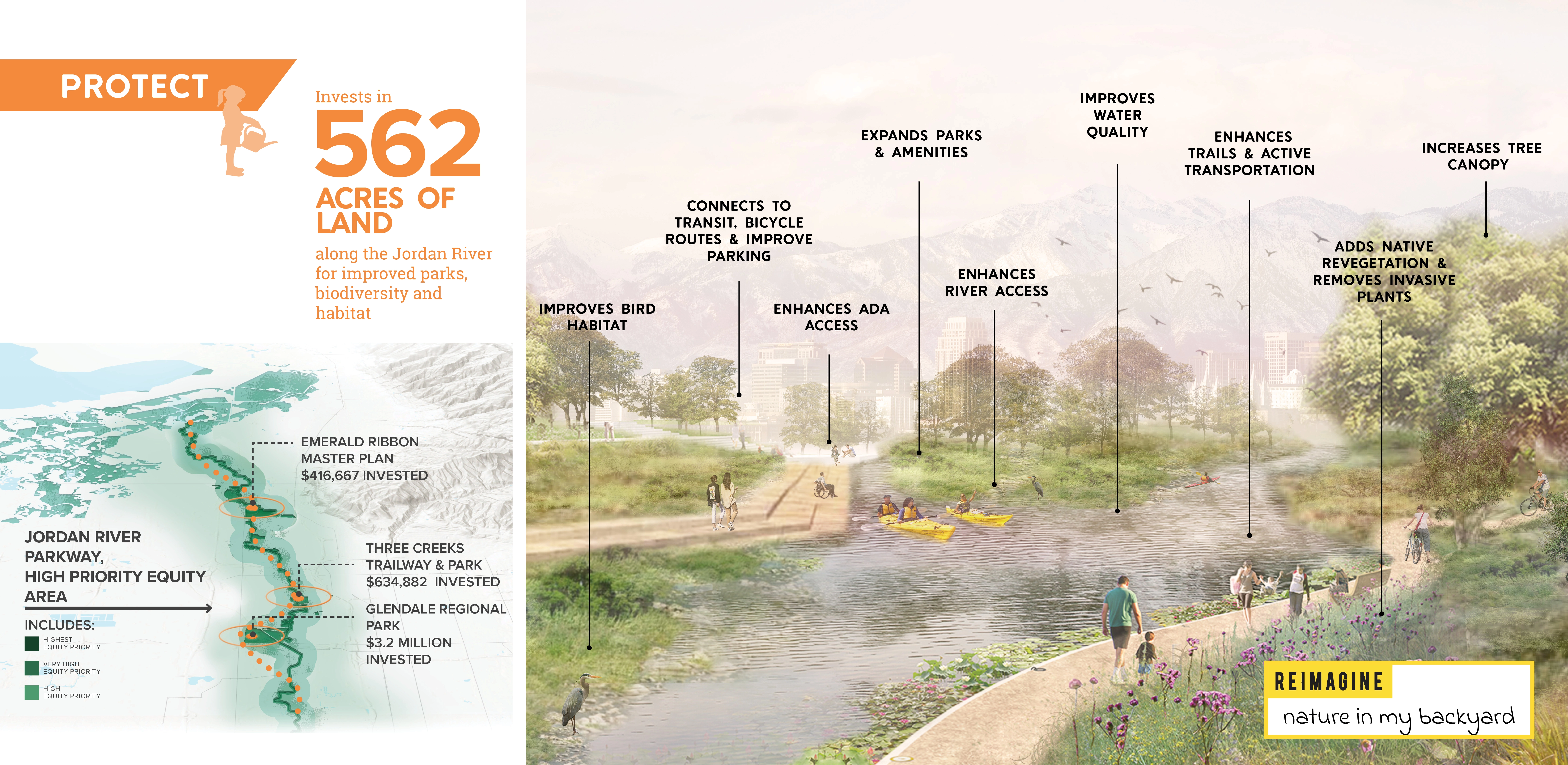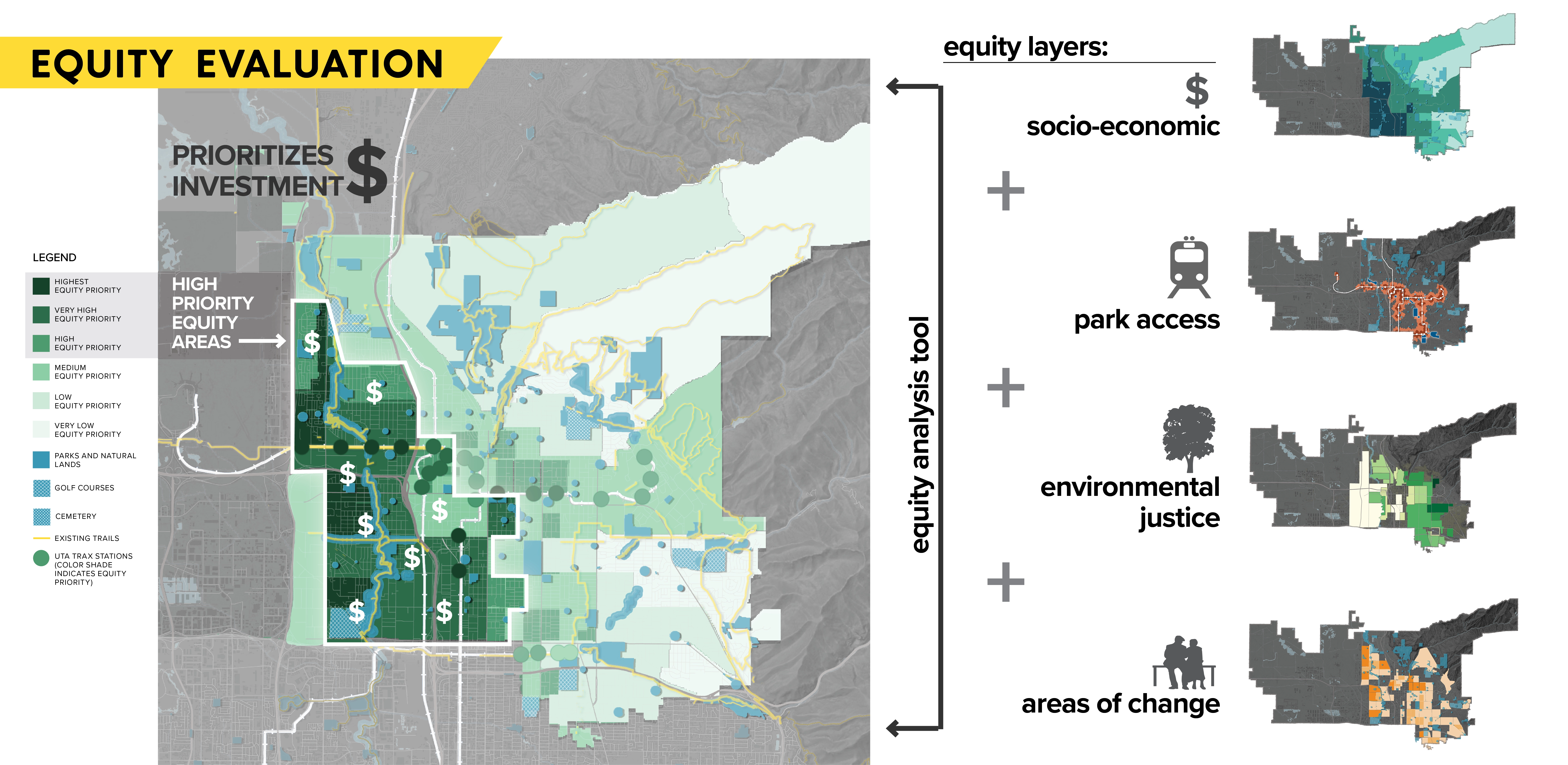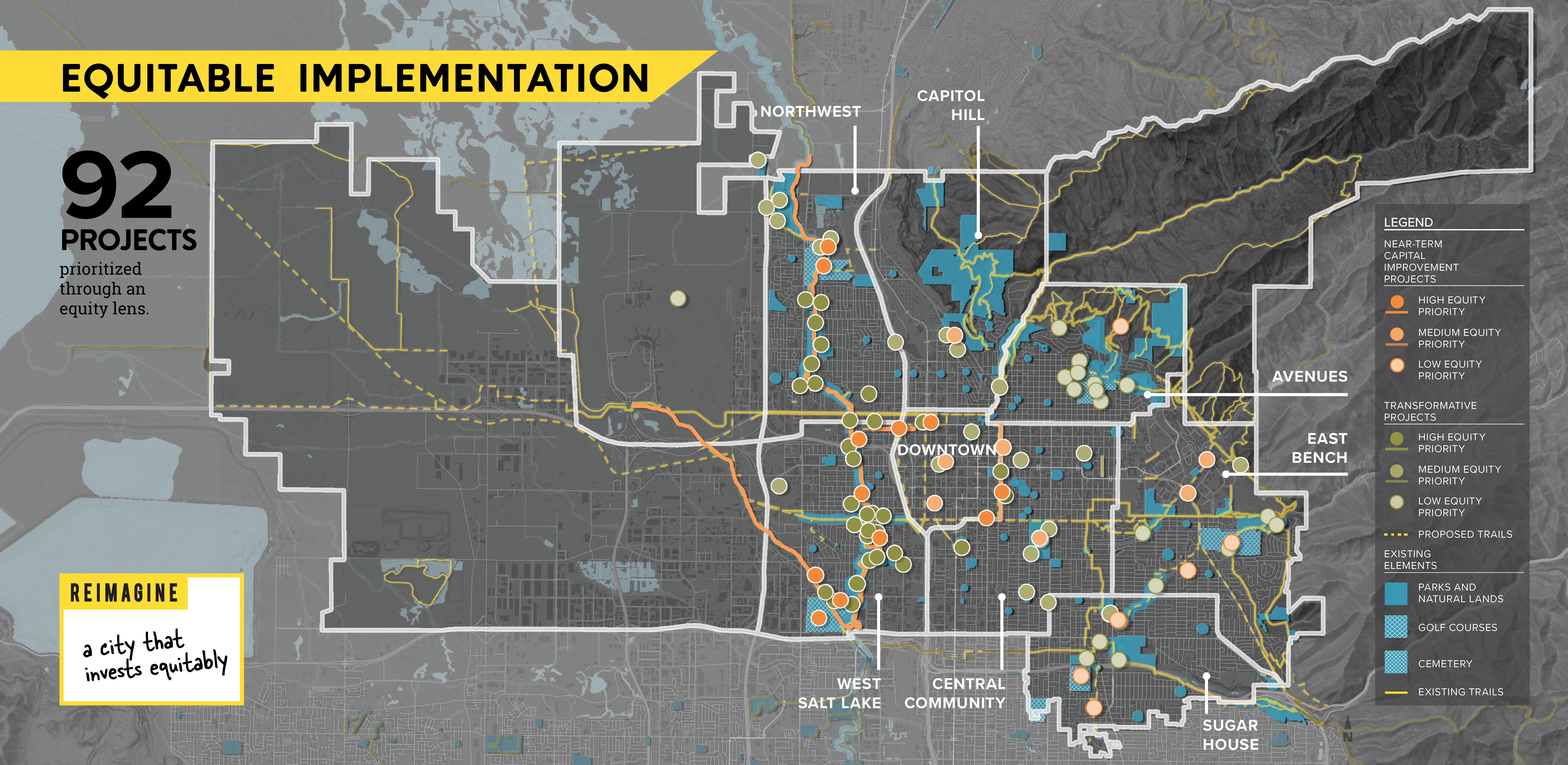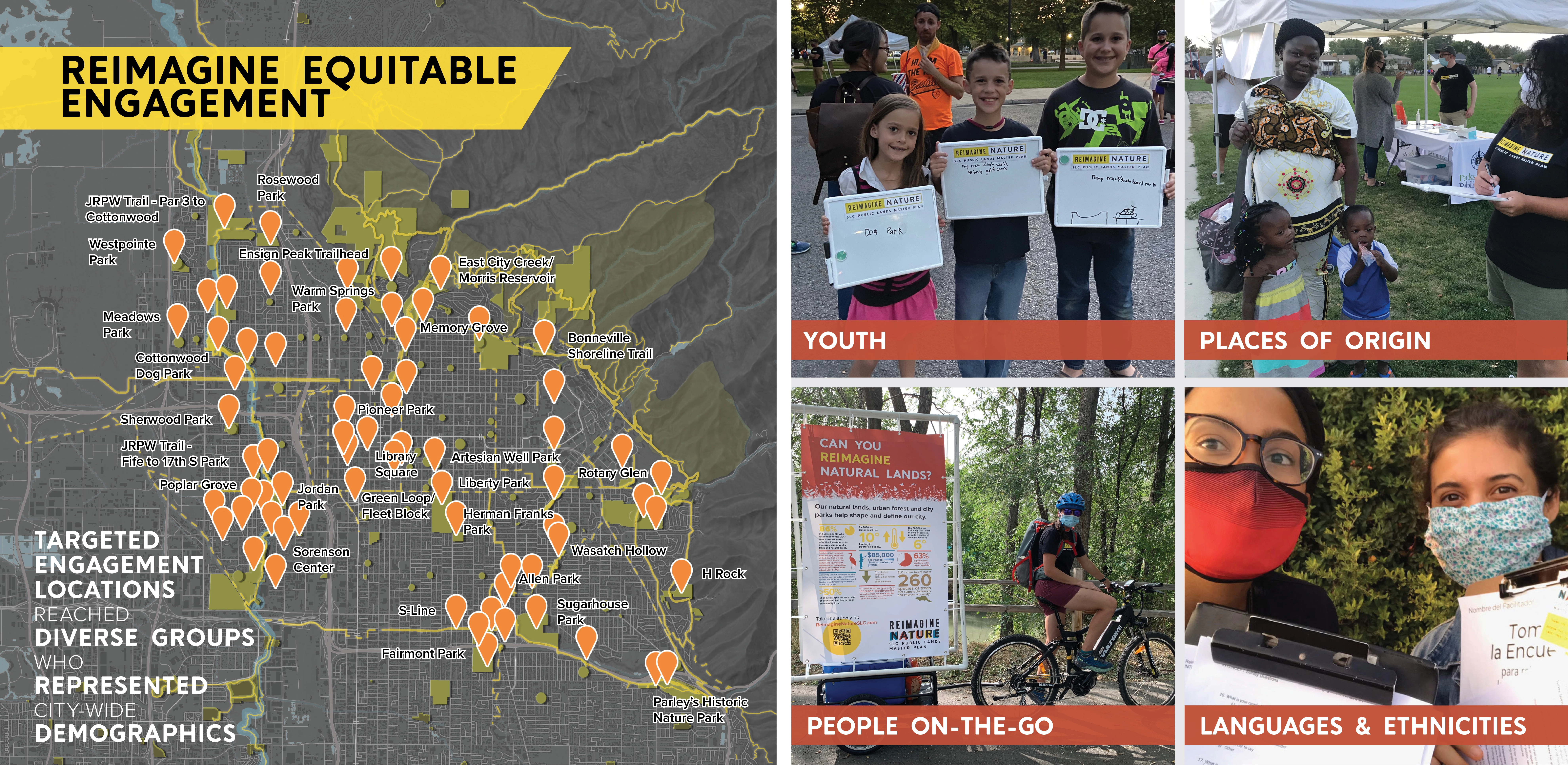 EXPANSIVE INFLUENCE Salt Lake City initiated the planning process just as the pandemic began and these public spaces became more essential refuges than ever. This timing coincided with civic protests centered around racial justice and police reform, addressing historic inequalities in City investments, disproportional impacts of poor air quality and climate change, and the growing crisis to house unsheltered populations. These topics have broad implications and could have been dismissed as outside the park department’s influence. Instead, the master plan expanded, championing collaborative solutions. This master plan directs the future of 125 properties that touch virtually every life of the 200,000 residents throughout this rapidly growing city, making it the most important plan in the past 30 years for Public Lands. Branded “Reimagine Nature,” this project inspired community members to explore how city-managed outdoor spaces can address current events centered around core values of equity, stewardship, and livability. USING SOCIAL AND ENVIORNMENTAL DATA FOR DECISION-MAKING Community-driven conversations coalesced into five themes for analysis that informed the creation of innovative planning tools: 1. Reimagine Environmental Health: How can Public Lands contribute to a more sustainable future? Performance of the urban forest and public lands system were analyzed under categories of human health, wildlife and ecology, and resilient landscapes. The analysis combined with community input identified the most urgent actions: strategic tree planting, increase vegetative species diversity, and adaptation for drought. 2. Reimage Inclusion: How can Public Lands reflect surrounding neighborhoods and create opportunities for exchange? A tool for assessing individual park quality and access was creating that included metrics for neighborhood expression and cultural place-making, public safety, and activity levels. University students, citizens and city staff completed audits scoring 22 parks evaluating equity in park design. The findings were enlightening and led to instituting new expectations for neighborhood parks, planning processes and toolkit for grass-roots led park design and activation events. 3. Reimagine Access: How can Public Lands connect people to each other and nature? Analysis identified gaps in connectivity and mobility considerations informing priorities for park and pathway improvements. Foothills and conserved natural lands are concentrated on the northeast part of the city, resulting in one-fourth of residences, mostly on the westside, located outside of walking distance. The plan emphasizes equitable investment creating nature-filled recreation opportunities on the westside accessible by foot and transit, within the parks and natural lands of the Jordan River Parkway. 4. Reimagine Protect: How can we ensure our Public Lands are sustained for future generations? Operations, staffing, and funding were assessed to anticipate what resources this plan’s implementation would need and build efficiency into addressing environmental threats. This evaluation showed that to maintain current levels by 2040 the annual operating budget will need to increase by $5 million and 24 additional staff will be needed. The findings helped support changes including hiring a staff member for volunteerism organization that has leveraged exponential community contributions. 5. Reimage Growth: What can Public Lands do to provide sufficient public space for future population growth when standards of acres per population are unrealistic? Salt Lake City would have to add park space equal to the size of Liberty Park (94 acres) to keep up with anticipated population growth, a real challenge in this built-out, high property cost and landlocked city. Strategies were created for better use of current land holdings - such as golf courses, right-of-way, and existing parks to do more for environmental performance, recreation, and social needs. These changes equate to the standard, ensuring these actions will result in avoiding overcrowding. RAISING ALL VOICES IN CHORUS Known as a “crossroads of the west” and a place of refugee resettlement, Salt Lake City has a diverse population with over 120 languages spoken and large Hispanic and Native American populations. Research showed disparate levels of activity in the outdoors by these populations. It was paramount to gather input to understand representative lived experiences and their needs, interests and access. However, in Salt Lake City, engagement in civic matters has long been dominated by singular socioeconomic groups. These challenges were overcome by the project team’s strategic and resourceful thinking, experimentation, and the will of 60 community partners and advocates including unique partnership with 85 university students that served as ambassadors. Despite challenges of a small project budget and the COVID-19 pandemic, this engagement campaign raised the bar for City planning efforts, exceeding a goal of involving 10 percent of all adults. Online and in-person activities combined reached a broader audience than taken individually. Participation demographics were monitored to inform where to pivot to gain representation from the diversity of the city. More critical than quantity, the quality of dialog in focus groups, collaborative workshops, place-making activities, roughly 2,000 individual survey comments, and intercept interview conversations provided a conduit for the community to craft the plan. How can one plan respond to many points of input and synthesize differing perspectives? The concluding engagement opportunity asked if the planning team had incorporated participation appropriately, if community voices were audible in the vision, goals, and projects. Overall, 87 percent of respondents were satisfied with the plan direction and provided hundreds of suggestions for adjustments that informed the final plan contents. While componen