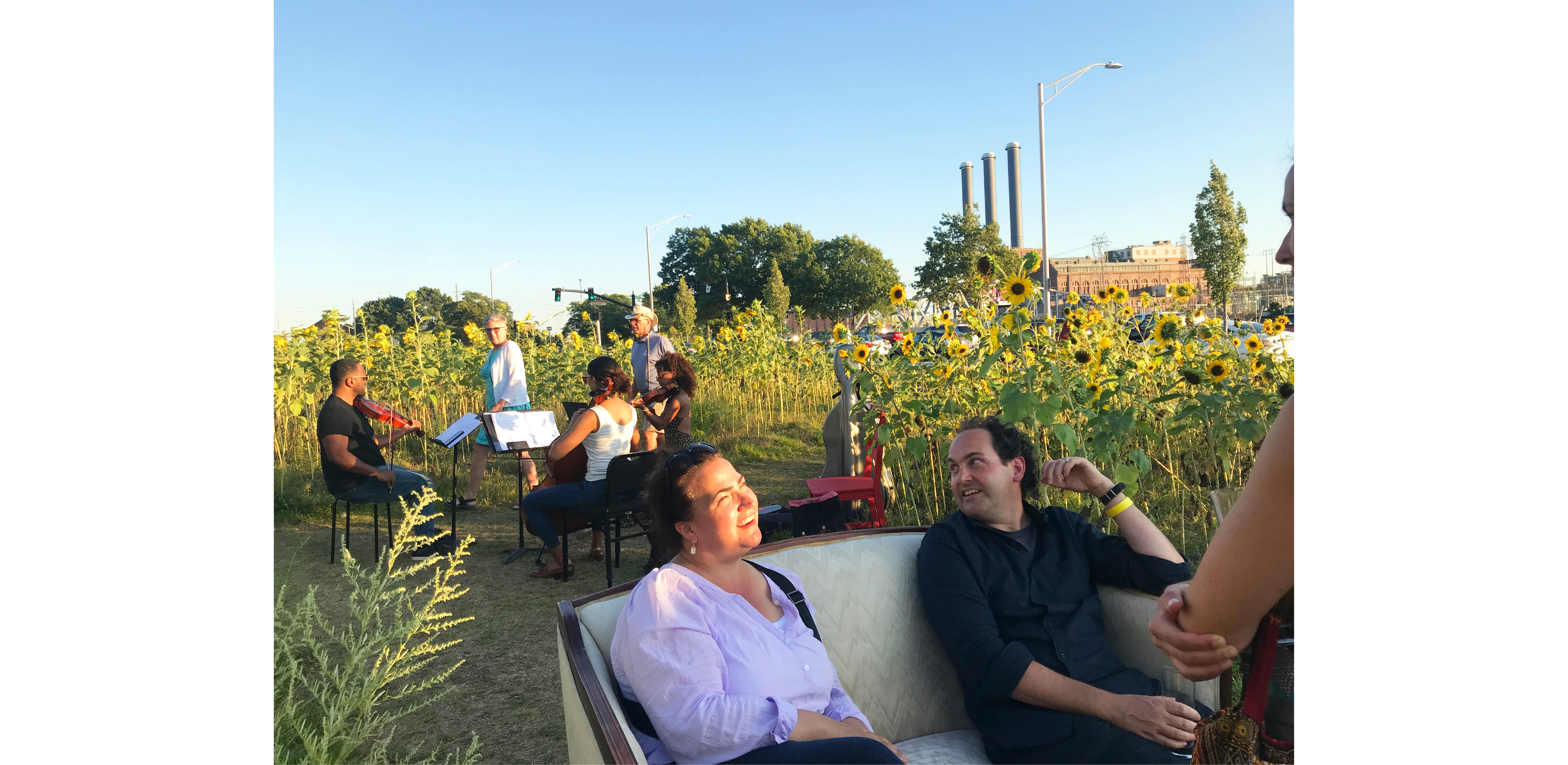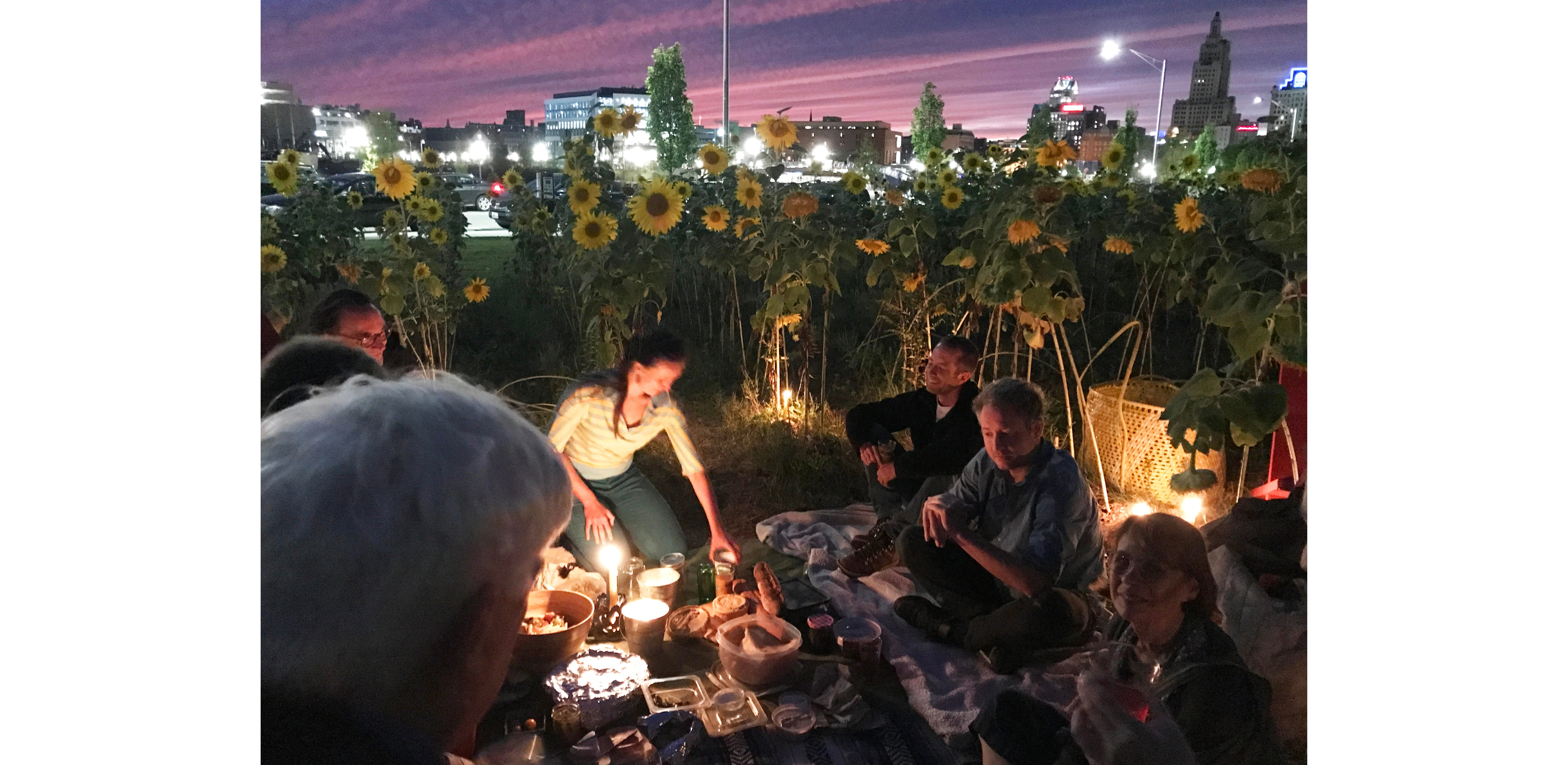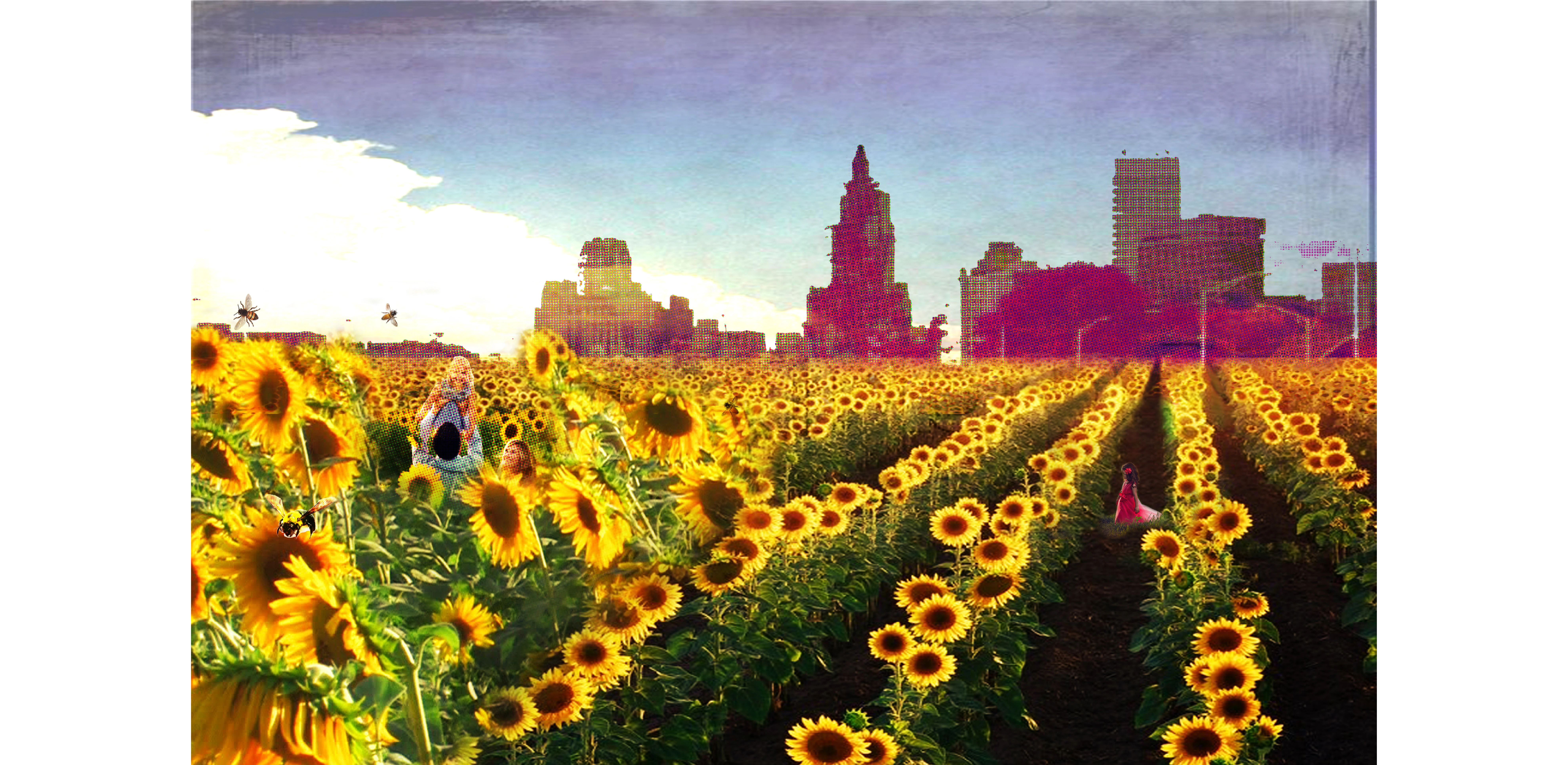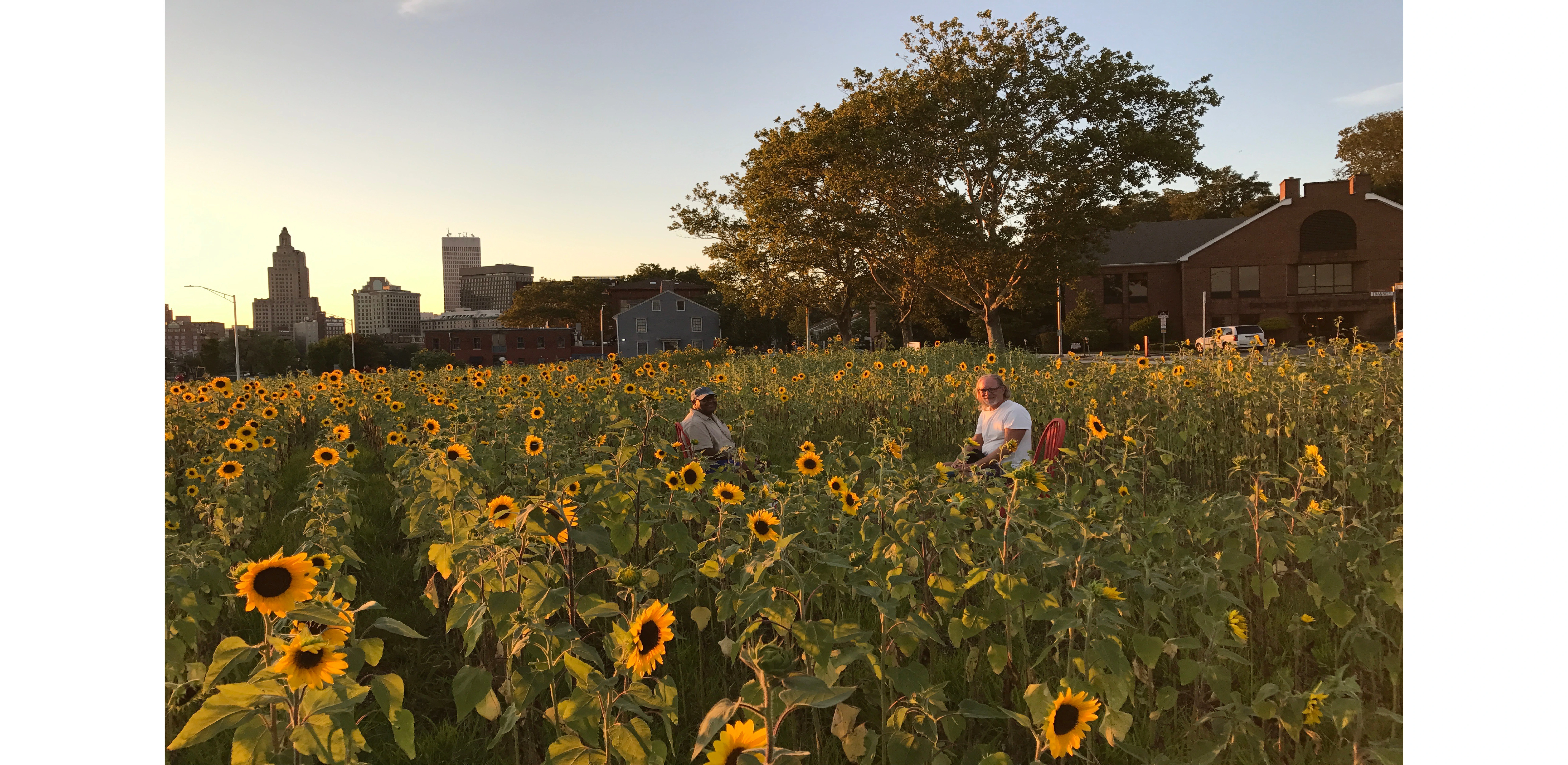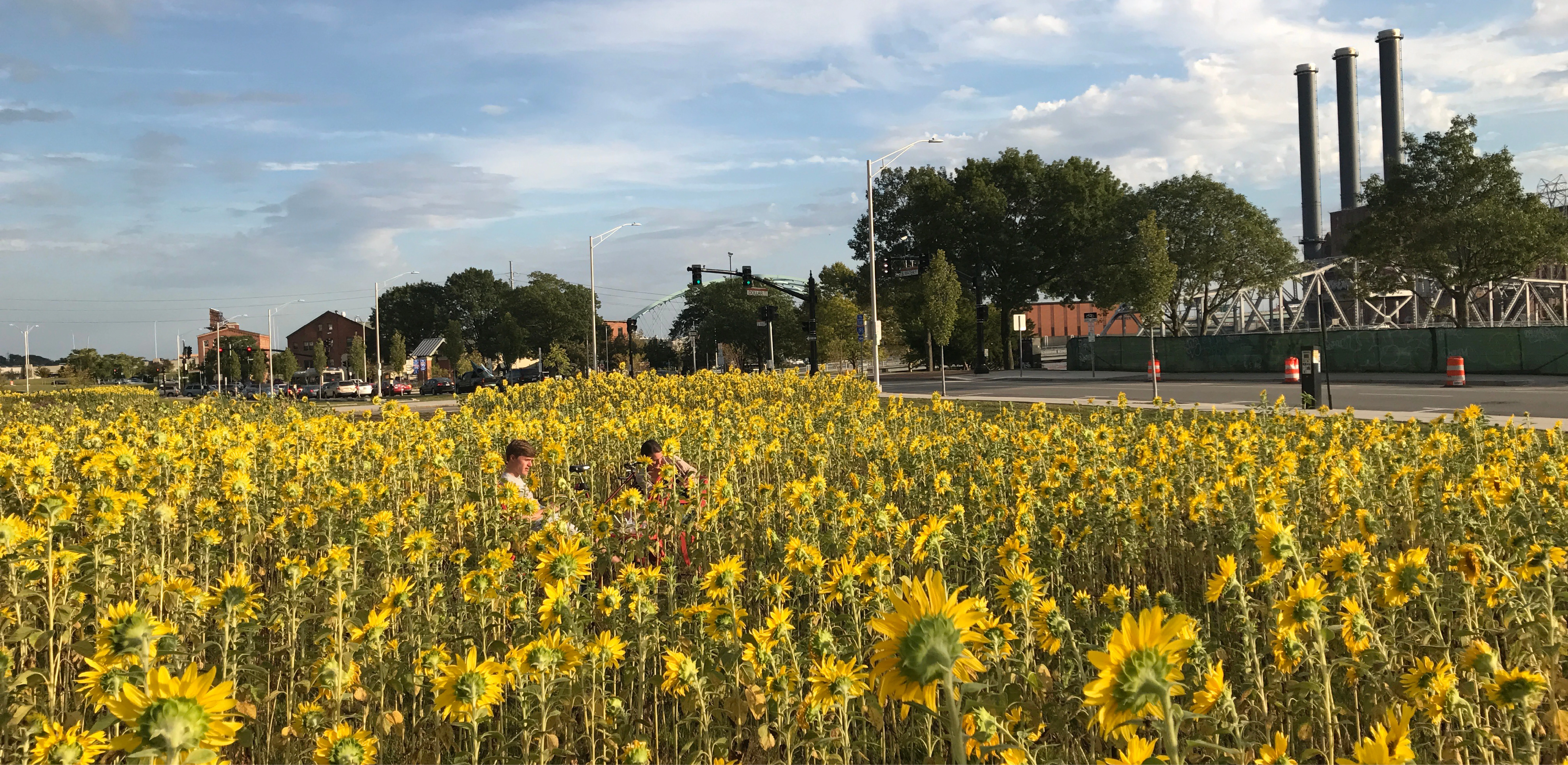 10,000 Suns is an annual summer-long botanical performance in which over 10,000 sunflower seeds are planted and nurtured over the summer months on a brownfield site that until recently was occupied by the now removed I-195 Highway which bisected the city of Providence. Using only a few bags of seeds and a diverse community of local volunteers this once vacant land is transformed each Summer into a bio-diverse and artfully activated public space.