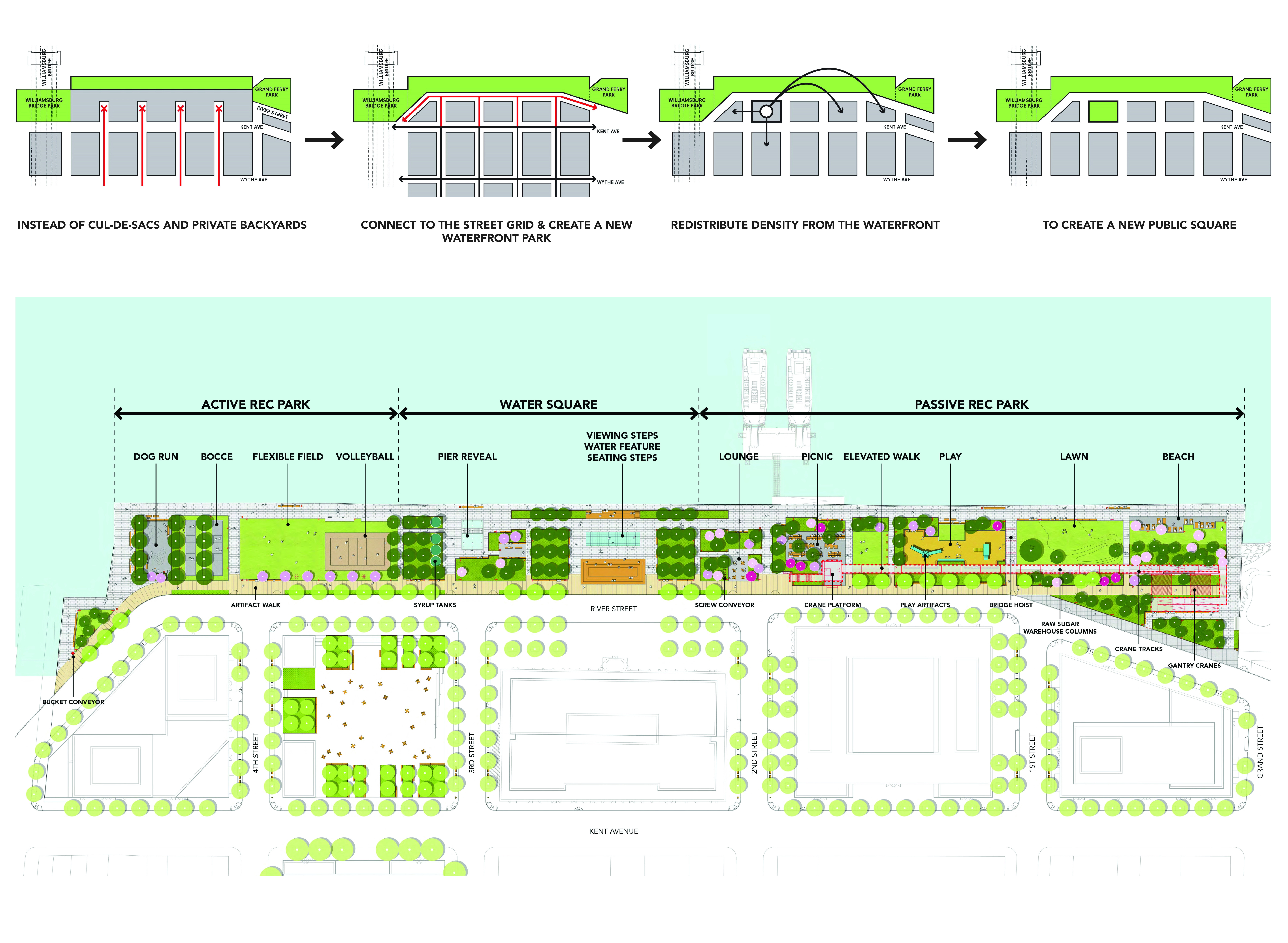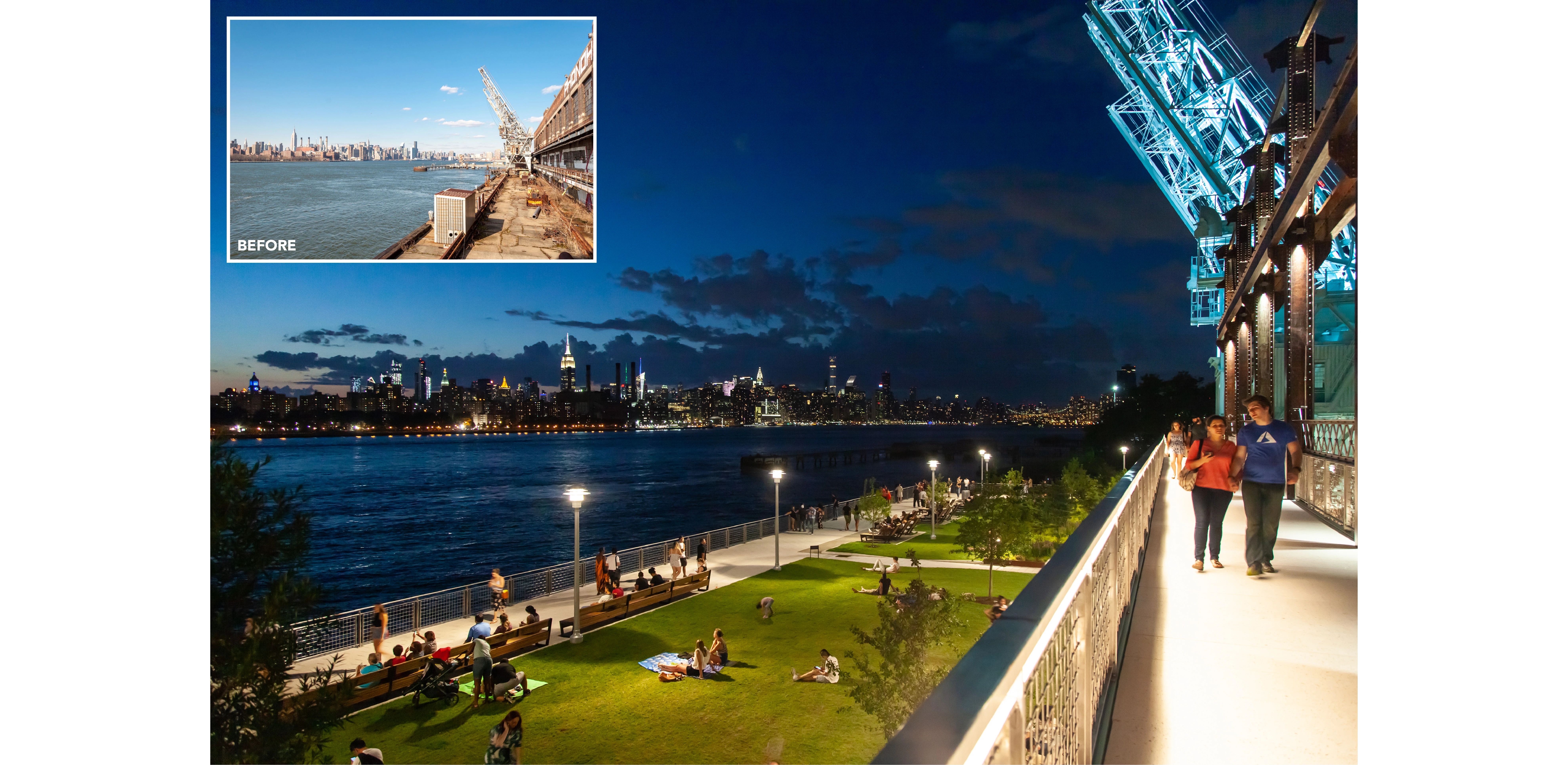 Industrial Legacy Domino Park is built on the former Domino Sugar Refinery, a site of incredible significance to the growth and development of the Williamsburg neighborhood and Brooklyn waterfront on the East River. It was once the largest and most productive sugar refinery in the world, producing up to 98% of the sugar consumed in the United States. Closing in 2004, the Refinery was the last major active industrial operation on Brooklyn’s once-bustling East River waterfront. Today, the park is a tribute to the story of this site and is dedicated to the diversity and resiliency of generations of Domino workers, their families, and their neighborhood. Domino Park was the first built portion of the 11-acre site’s transformation into an ambitious mixed-use development project, representing a commitment to deliver public space for the surrounding community. The park reconnects Williamsburg to the East River for the first time in 160 years and provides much-needed open space for local residents, while honoring its history as a working waterfront. Combining with upcoming Two Trees’ River Ring development, Domino Park creates an integral link for a fully connected waterfront of the future. The overall project includes adaptive reuse of the landmark Refinery building for creative office space and four new mixed-use residential buildings, including 700 units of affordable housing. Artifact Walk One of the primary park features is an interpretive and educational “Artifact Walk,” which integrates over 30 large-scale salvaged relics that showcase the inner workings of the sugar refining process. Restored artifacts include 80-foot-tall gantry cranes and a crane platform that once unloaded sugar; syrup tanks; bucket and screw conveyors; a hoist bridge; and 21 columns from the Raw Sugar Warehouse. A 2-block-long elevated walk reinvents the catwalk experience that was distinctive of the original factory complex and provides an up-close view of the artifacts, a unique perspective from above, and views of the Manhattan skyline. It is a nexus of old and new—a trace of the past and a new social balcony. As impressive and tactile pieces of history, the artifacts provoke a sense of wonder, discovery, and inquiry about the history of the site. Park Experience An important first move was the extension of River Street to reconnect the park back to the city grid and deepen a sense of publicness rather than a perception of a private front lawn for new development. The new street also significantly improves connections between the upland and the waterfront, eliminating the need for stairs and ramps and increasing the park’s accessibility. Domino Park offers a range of activities that appeal to a diverse user group, with spaces for visitors and locals alike to come together. Active uses are clustered in the south near the Williamsburg Bridge, where there is more noise and urban context, including a dog run, bocce courts, a flexible playing field, and volleyball court. The Refinery building, with its distinctive smokestack, represents the physical and spiritual heart of the redevelopment, with features that awaken a strong connection to water. A large tiered seating feature serves as a gathering place and vantage point to view a playful interactive water feature, one which transforms into an open plaza for public gatherings when the water is turned off. The Fog Bridge spans an open cut to the river below, revealing historic timber piles and allowing visitors to see the waves and hear the sound of the tides. A set of misters surrounding the bridge emit a gentle cloud of fog that envelops passersby in the shoreline’s wind patterns, creating a dramatic entryway to the massive Syrup Tanks. The northern part of the park is defined by the emblematic Gantry Cranes and Elevated Walk with a focus on more passive and family-oriented uses. An inventive playground designed by artist Mark Reigelman creates a fun journey through the site’s history for children. Tacocina offers a laid-back setting for tacos, beer, and cocktails enjoyed next to a large rolling lawn that provides a relaxing place to hang out and watch the sunset. The park’s materials are inspired by the tough, industrial character of the Williamsburg waterfront including weathered, galvanized, and stainless steel, concrete, and reclaimed wood from the factory itself. A custom furniture palette constructed from reclaimed pine and powder-coated steel includes a mix of tables, lounge chairs, and benches. Original metal finishes and patinas were preserved where possible. New steel was painted a turquoise “Domino blue” to match a color found throughout the original Refinery, along with relics that needed a new finish, such as the gantry cranes and mooring bollards. Resiliency The project started days after Hurricane Sandy and was greatly influenced by that event and subsequent discussions in NYC regarding resiliency. One of the first decisions was to set the buildings back beyond the required distance and raise the platform to be above predicted post-Sandy FEMA flood elevations. This resulted in a more generous park while protecting the buildings and infrastructure. 43% of the park is vegetated with nearly 175 new trees and a hardy native understory that reduce stormwater runoff and function as an absorbent sponge and first line of defense for the neighborhood. The park is one of the first projects to be certified under WEDG (Waterfront Edge Design Guidelines), an incentive-based ratings system to make waterfronts more resilient, environmentally healthy, accessible, and equitable for all. The park’s landscape is managed 100% organically, and plant material and debris from the park is composted and redistributed back into the plant beds. Building Community A robust grassroots community outreach effort complemented the official rezoning process, including large public forums as well as numerous small meetings with respected community groups and lea