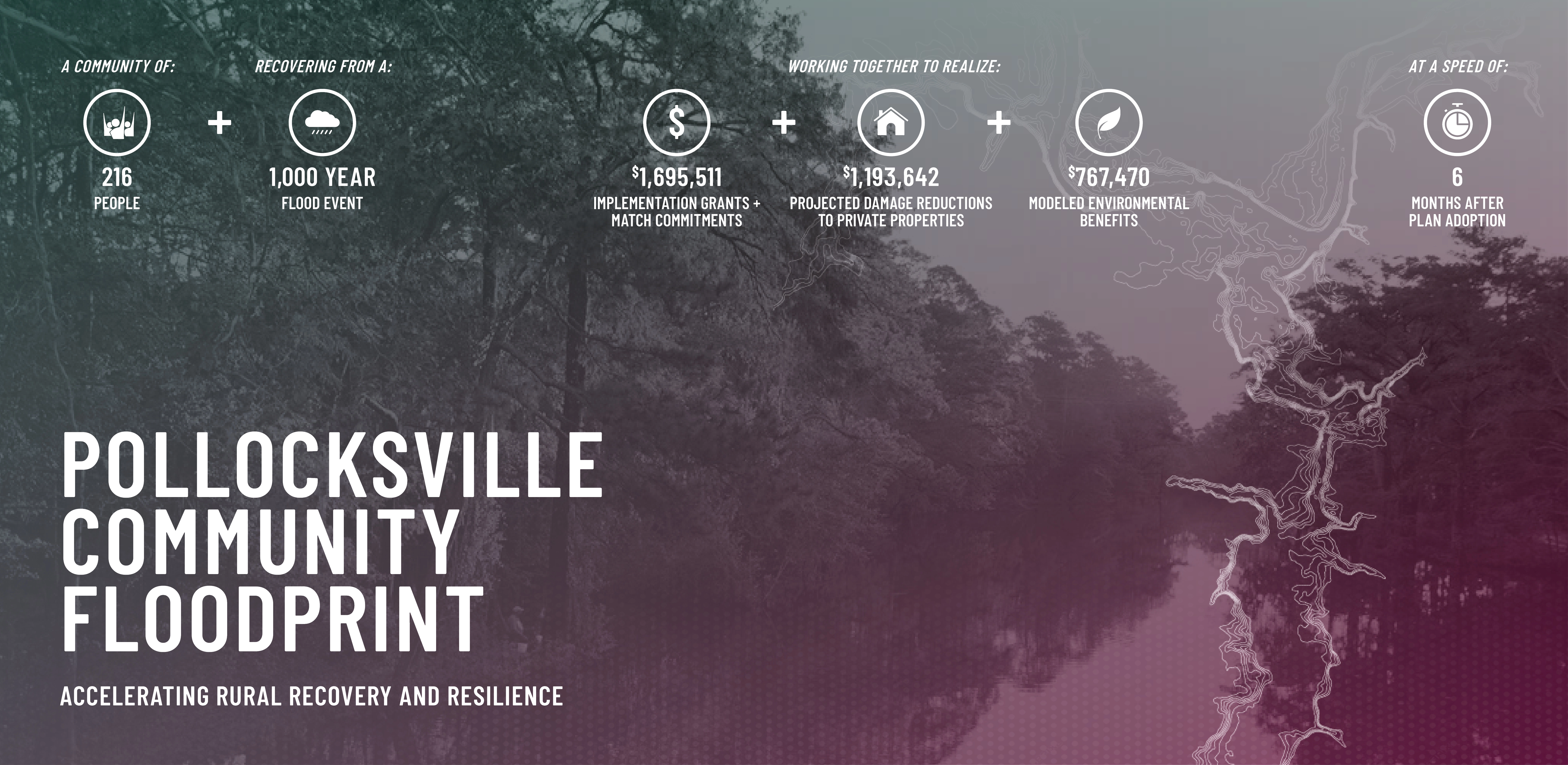 Pollocksville, North Carolina (population 216) is in the midst of a multi-year recovery process resulting from Hurricane Florence (2018). The rainfall generated by Florence was equivalent to a 1,000-year storm event, causing $17B in damages in North Carolina. In Pollocksville, the storm's flooding impacts far exceeded the 500-year floodplain, inundating dozens of homes and nearly two-thirds of the town’s commercial properties. The Pollocksville Community Floodprint bolstered local recovery efforts through an integrated portfolio of projects that were co-produced with the community via participatory processes and rigorous analysis. Outcomes are assisting local leaders make Pollocksville more resilient to future shocks. The project was rooted in place-based approaches to community planning and development, hazard mitigation, and climate adaptation. The plan recognizes the financial realities, multi-generational social networks, personal place attachments, and bespoke micro-migration strategies that must be considered in the recovery processes of low-wealth rural areas. The resulting town-adopted document illustrates processes that both respond to Pollocksville’s efforts to build back better and provide transferable lessons to other under-resourced communities that are disproportionately impacted by environmental threats.